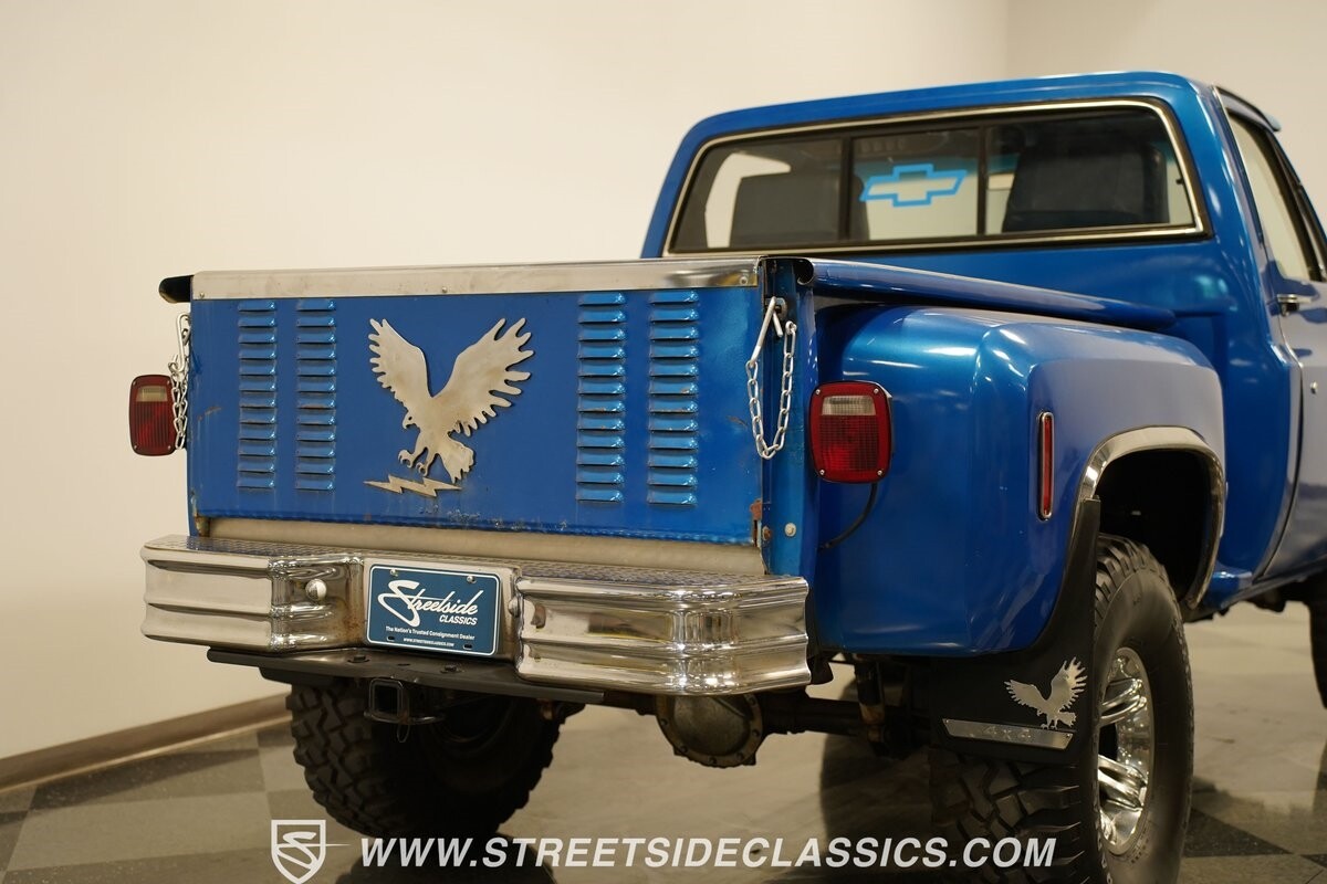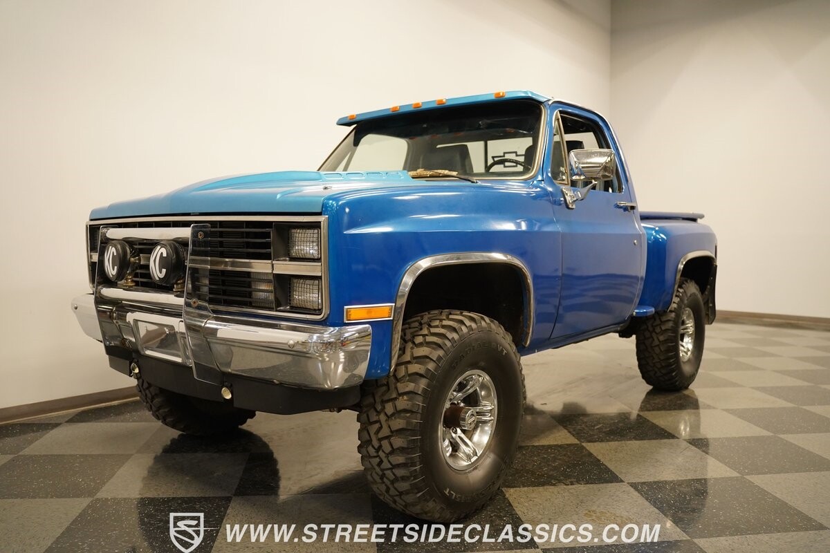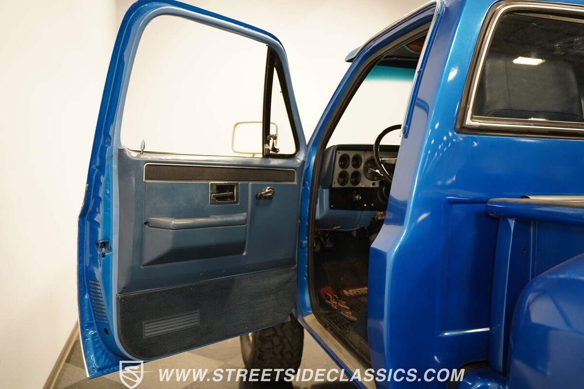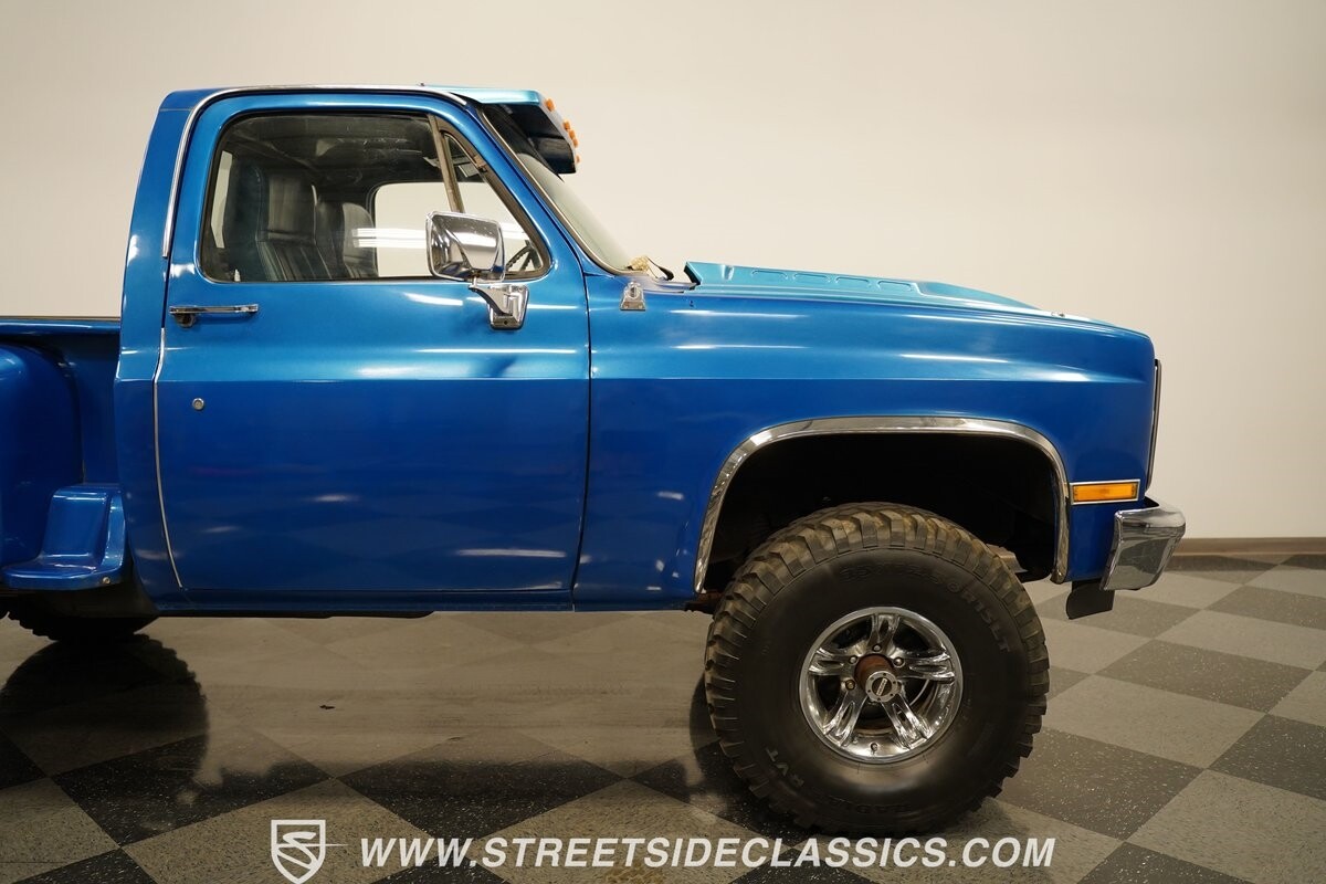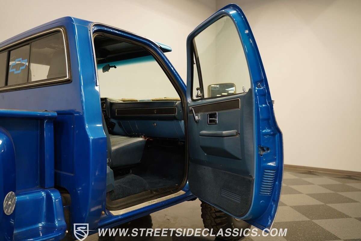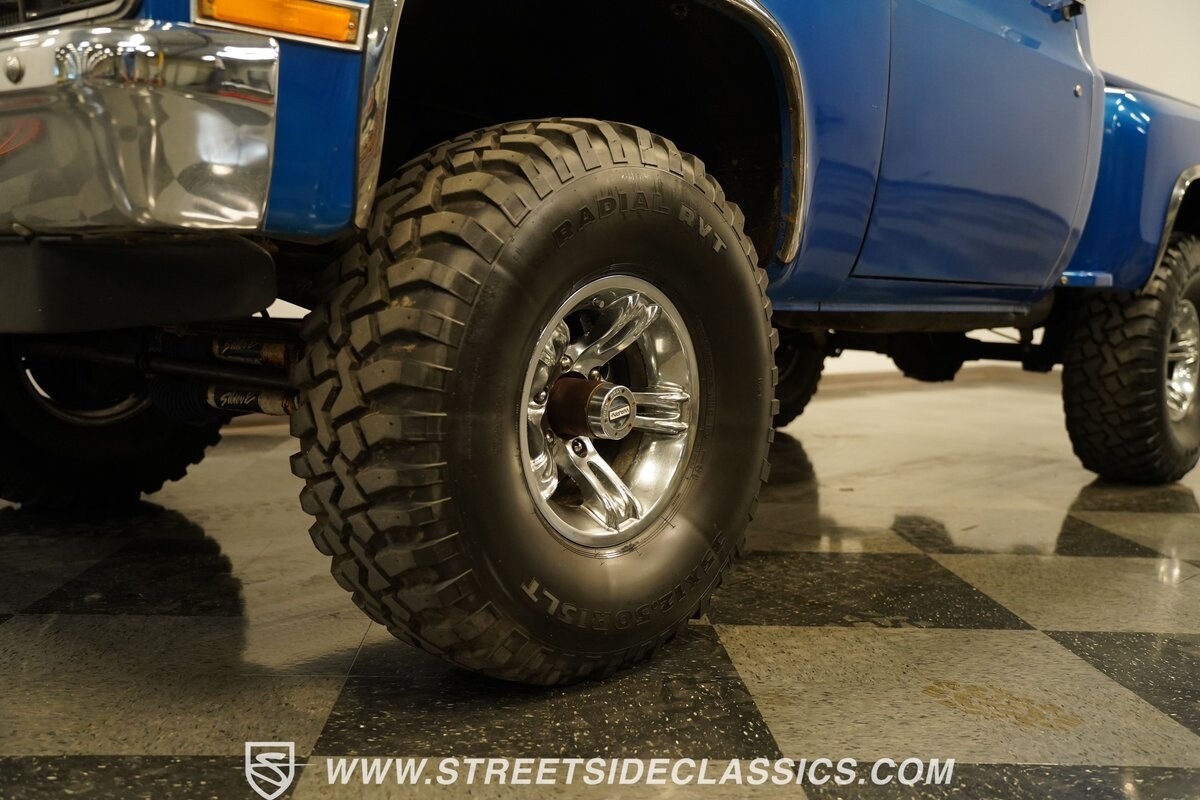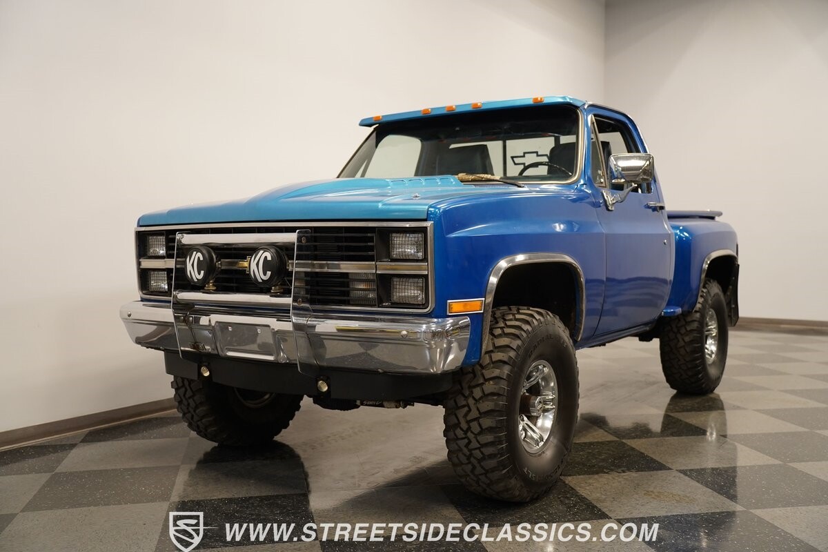 This 1984 Chevrolet K10 Supercharged 4x4 Stepside is a blue metallic beast ready to dominate both street and trail. Sporting a 4-inch lift, this Chevy towers over traffic on massive 35/12.5R15 Wild Country radial RVT tires wrapped around 15-inch chrome aftermarket alloys. The aggressive stance is complemented by a custom cowl hood inspired by early C2 Corvette big block designs, setting this K10 apart from the pack. A push bar with KC lights guards the front, while a louvered tailgate with an eagle emblem adds a custom touch to the rear. The stepside bed features a traditional wood floor, a nod to classic truck craftsmanship.