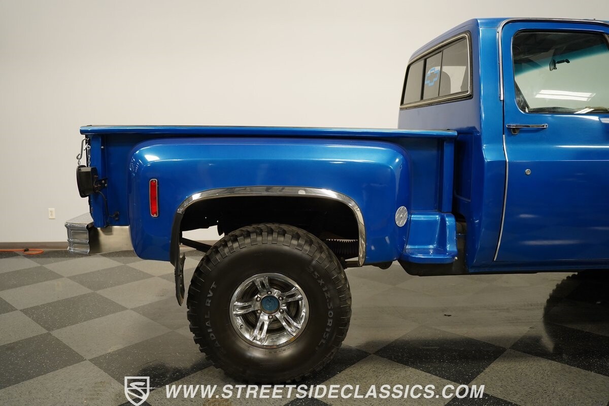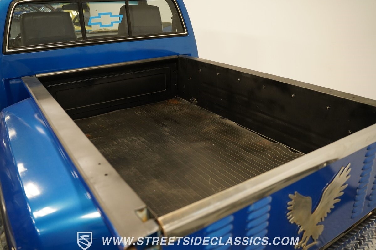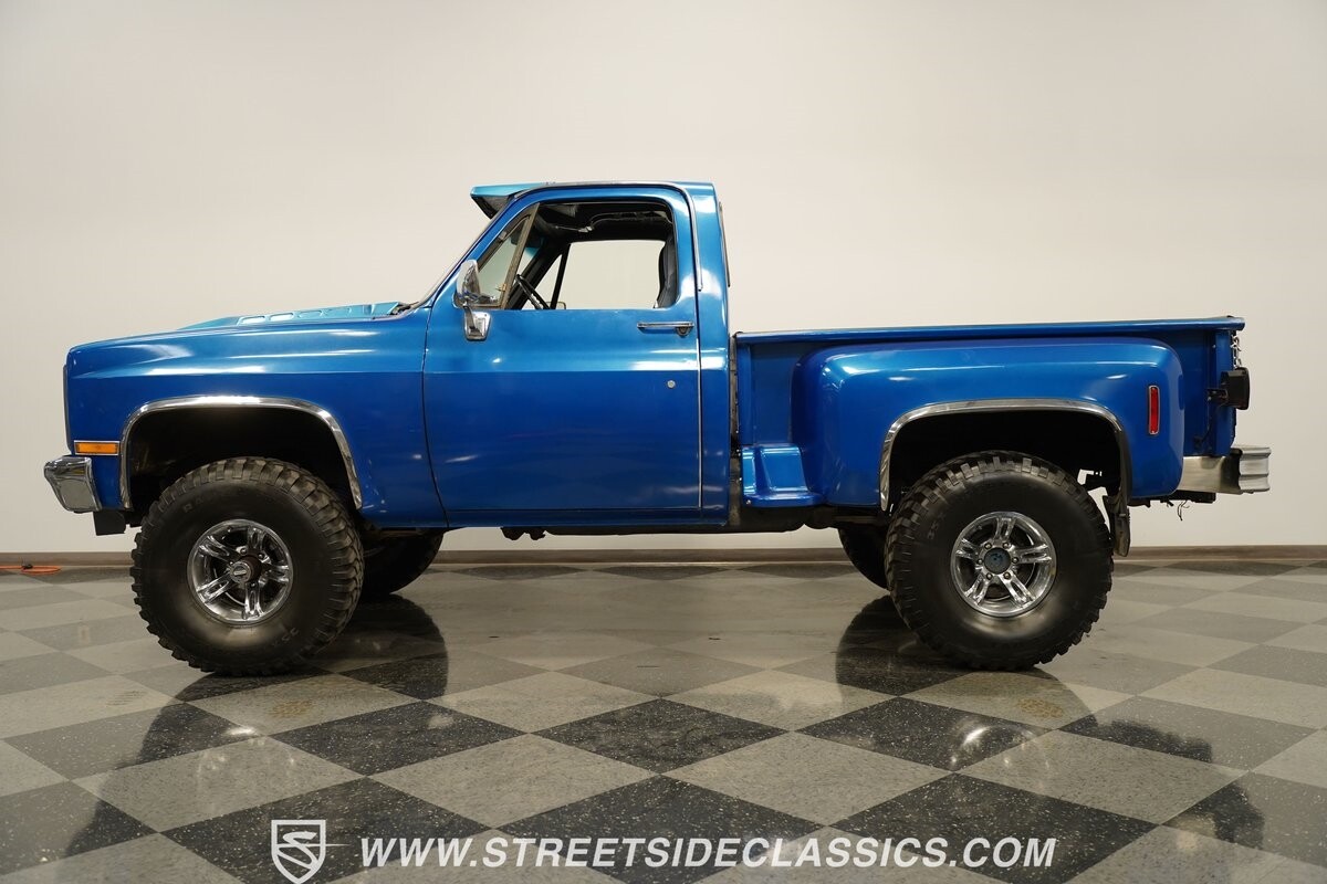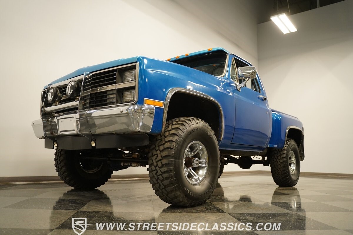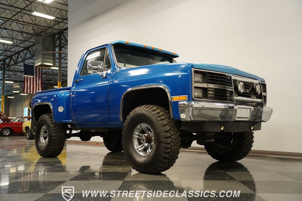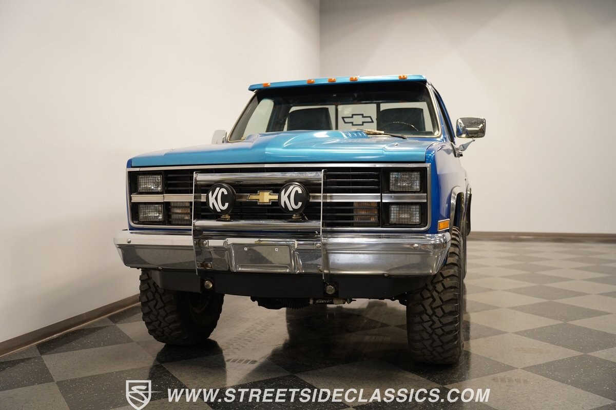 This 1984 Chevrolet K10 Supercharged 4x4 Stepside is a blue metallic beast ready to dominate both street and trail. Sporting a 4-inch lift, this Chevy towers over traffic on massive 35/12.5R15 Wild Country radial RVT tires wrapped around 15-inch chrome aftermarket alloys. The aggressive stance is complemented by a custom cowl hood inspired by early C2 Corvette big block designs, setting this K10 apart from the pack. A push bar with KC lights guards the front, while a louvered tailgate with an eagle emblem adds a custom touch to the rear. The stepside bed features a traditional wood floor, a nod to classic truck craftsmanship.