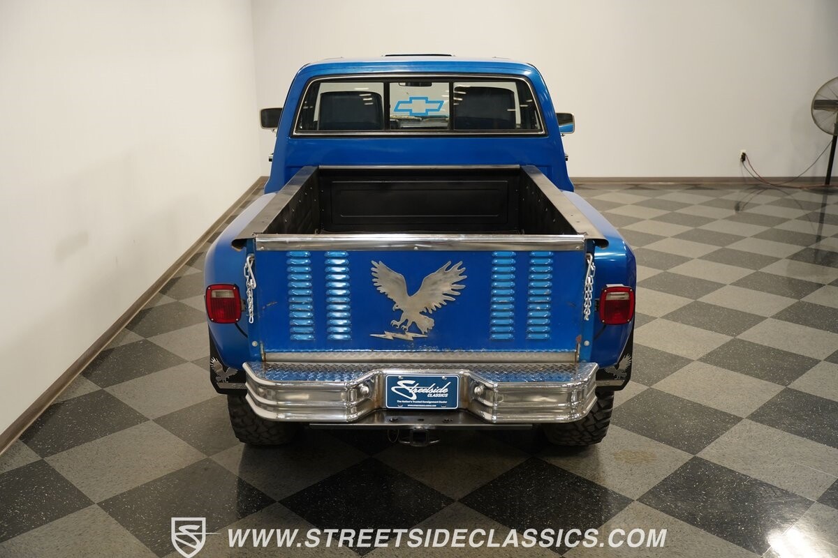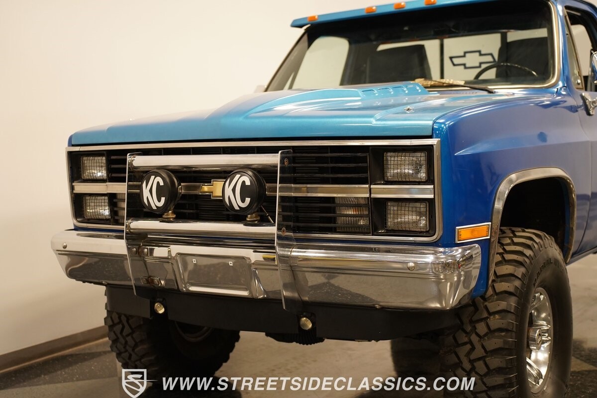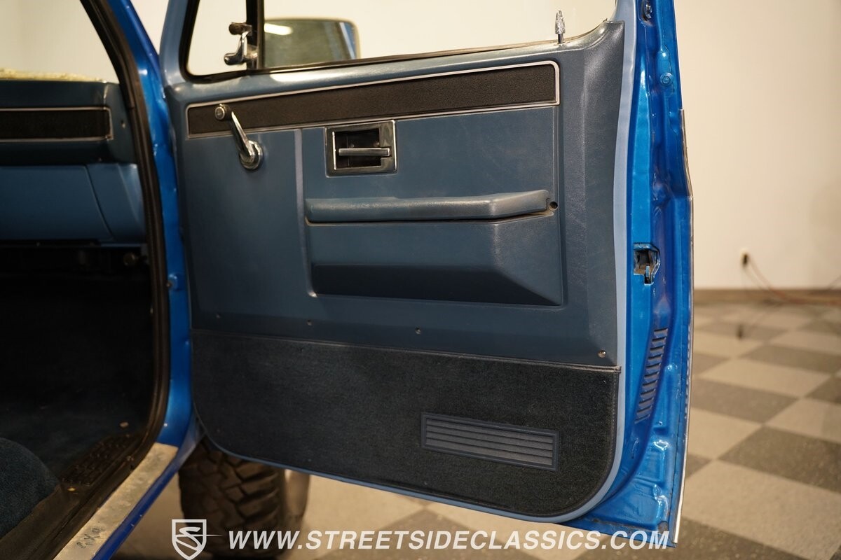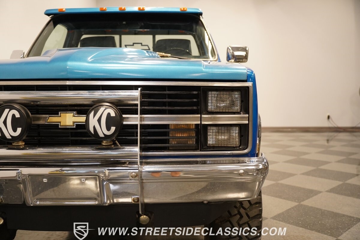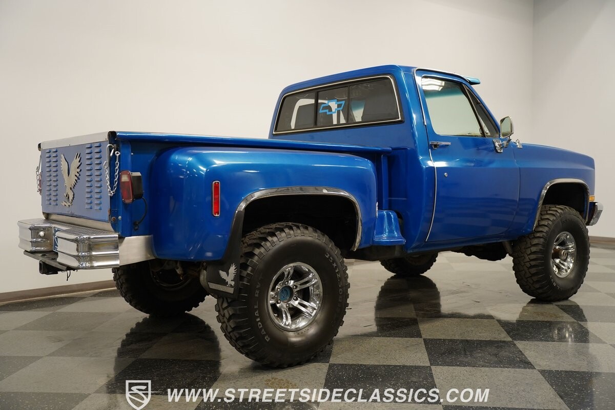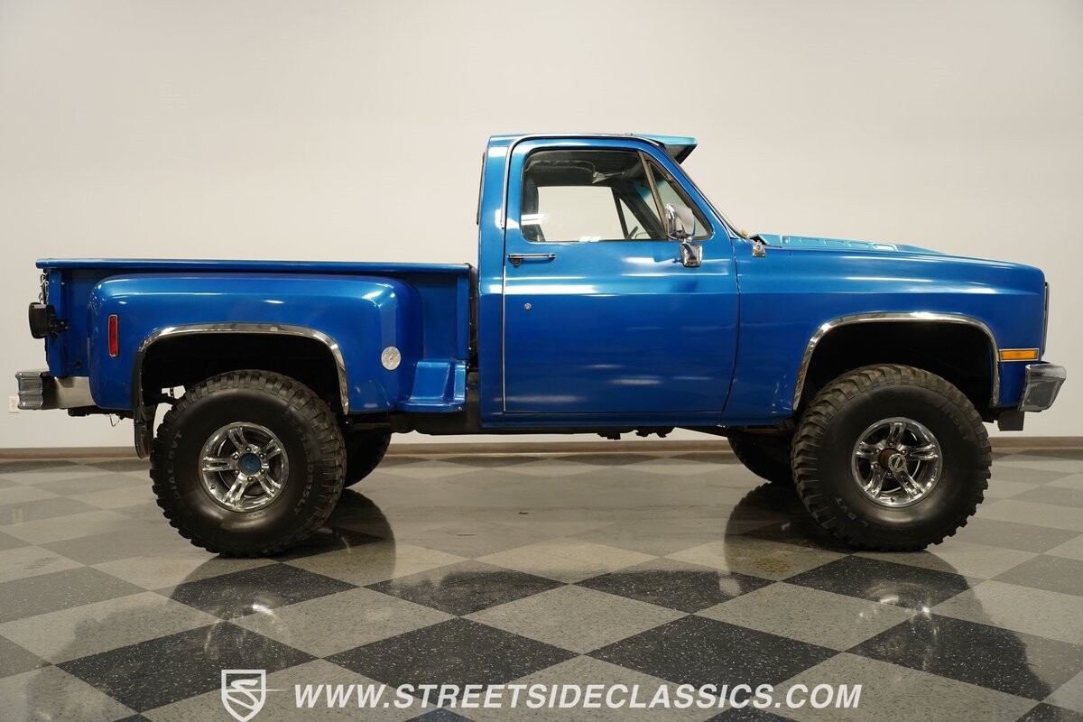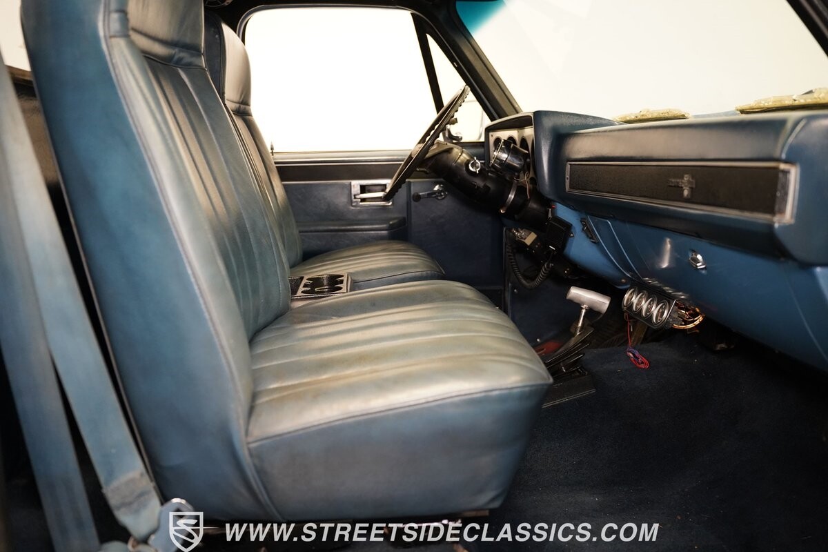 This 1984 Chevrolet K10 Supercharged 4x4 Stepside is a blue metallic beast ready to dominate both street and trail. Sporting a 4-inch lift, this Chevy towers over traffic on massive 35/12.5R15 Wild Country radial RVT tires wrapped around 15-inch chrome aftermarket alloys. The aggressive stance is complemented by a custom cowl hood inspired by early C2 Corvette big block designs, setting this K10 apart from the pack. A push bar with KC lights guards the front, while a louvered tailgate with an eagle emblem adds a custom touch to the rear. The stepside bed features a traditional wood floor, a nod to classic truck craftsmanship.