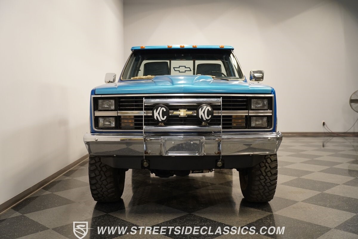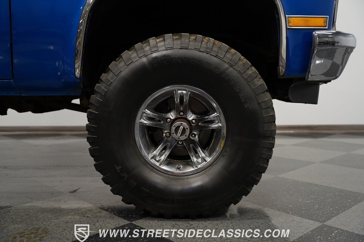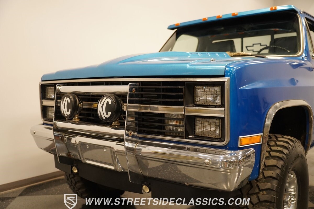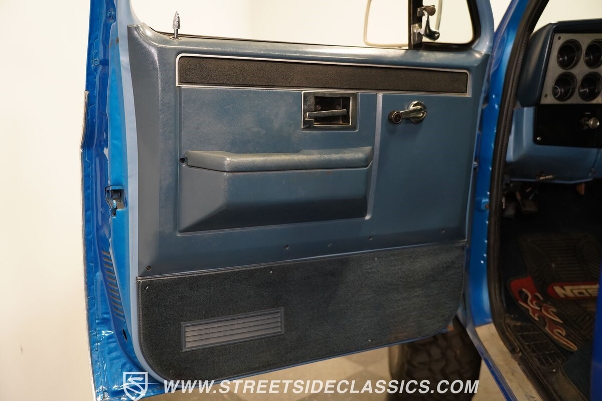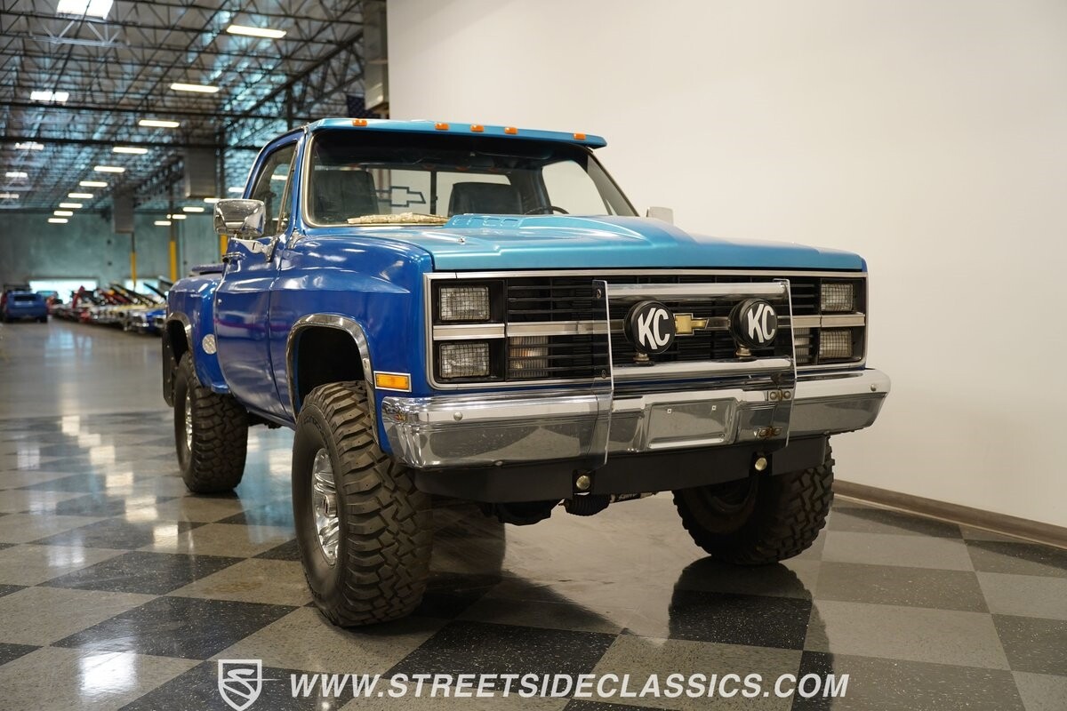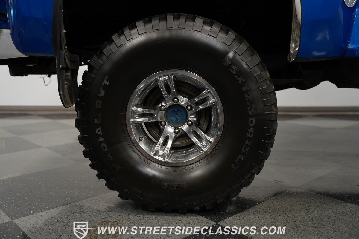 This 1984 Chevrolet K10 Supercharged 4x4 Stepside is a blue metallic beast ready to dominate both street and trail. Sporting a 4-inch lift, this Chevy towers over traffic on massive 35/12.5R15 Wild Country radial RVT tires wrapped around 15-inch chrome aftermarket alloys. The aggressive stance is complemented by a custom cowl hood inspired by early C2 Corvette big block designs, setting this K10 apart from the pack. A push bar with KC lights guards the front, while a louvered tailgate with an eagle emblem adds a custom touch to the rear. The stepside bed features a traditional wood floor, a nod to classic truck craftsmanship.