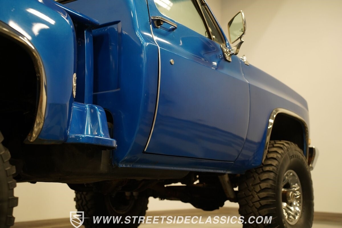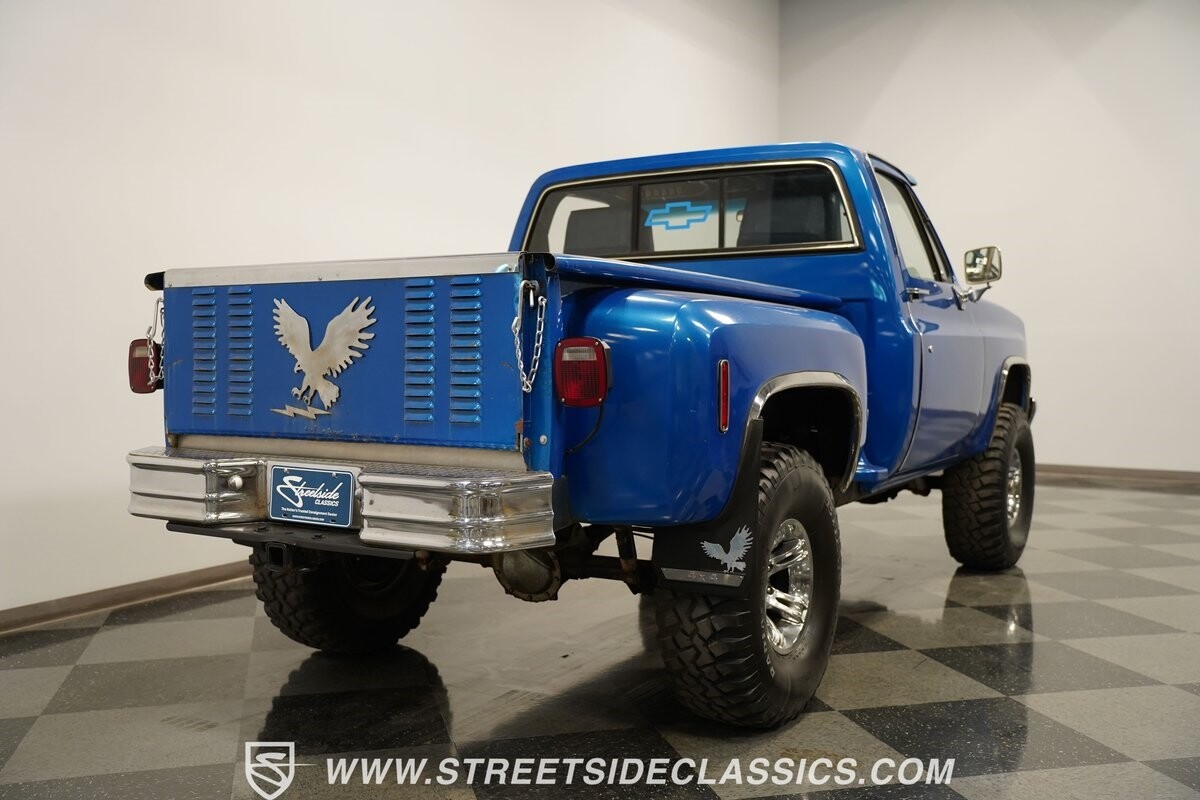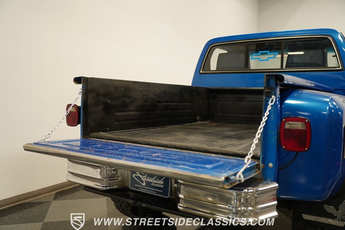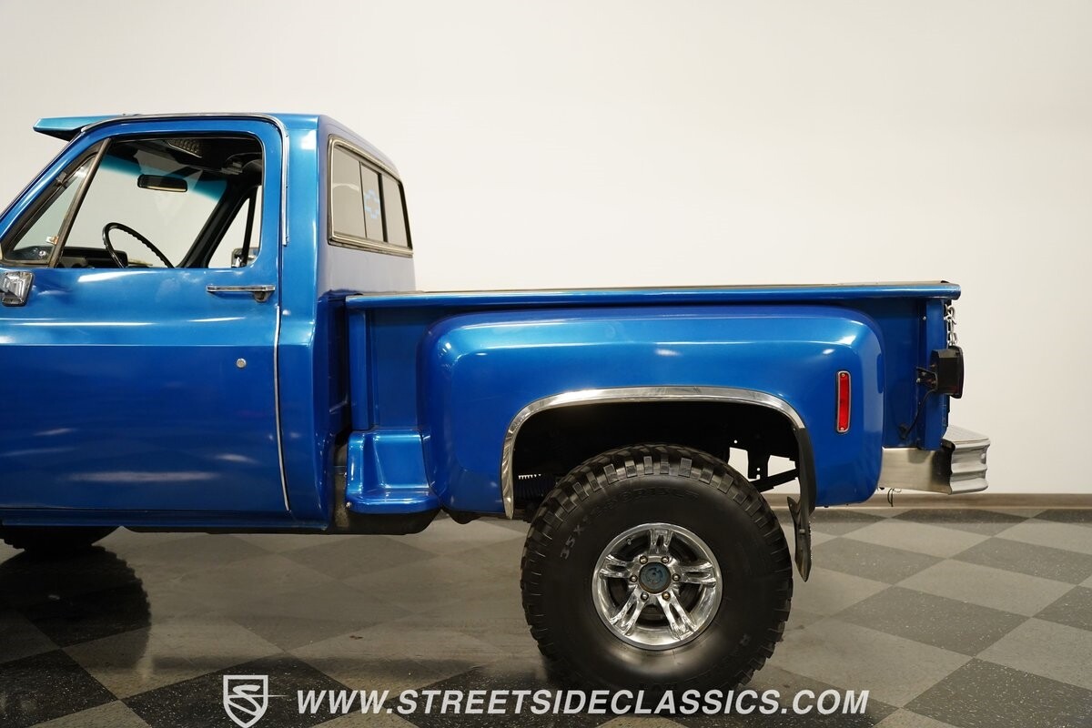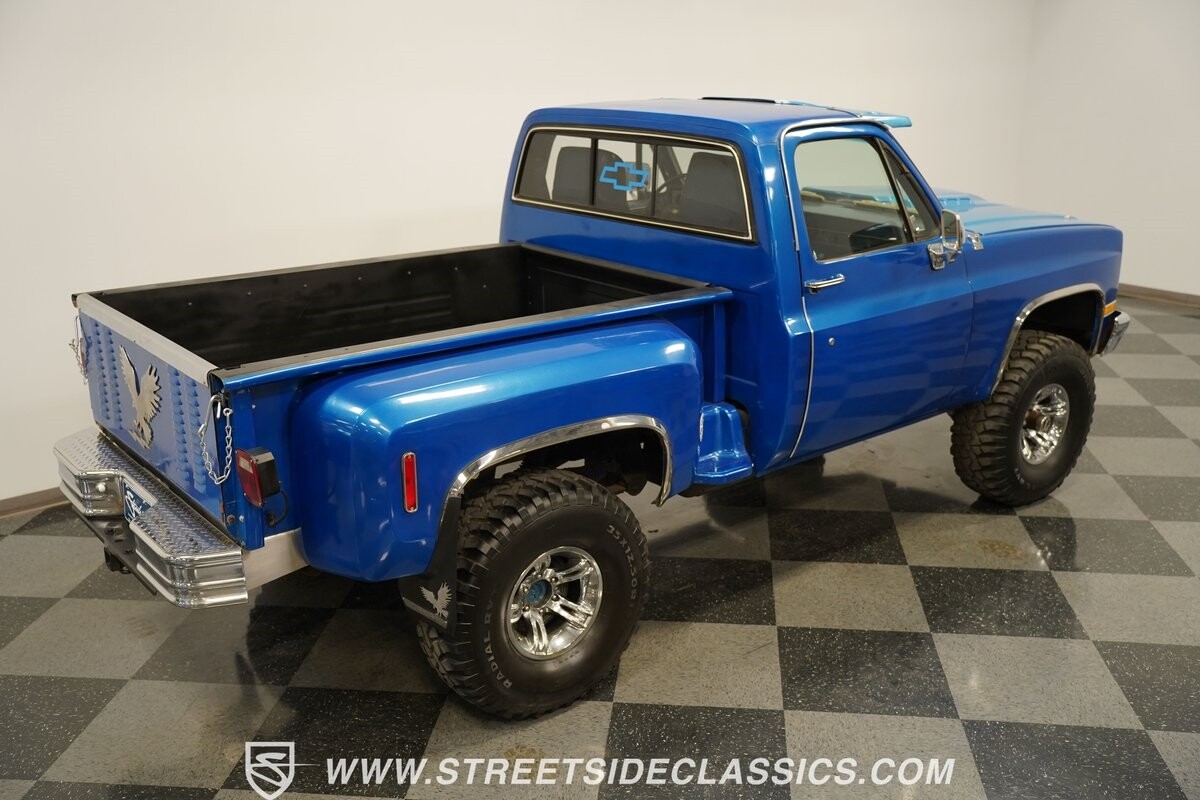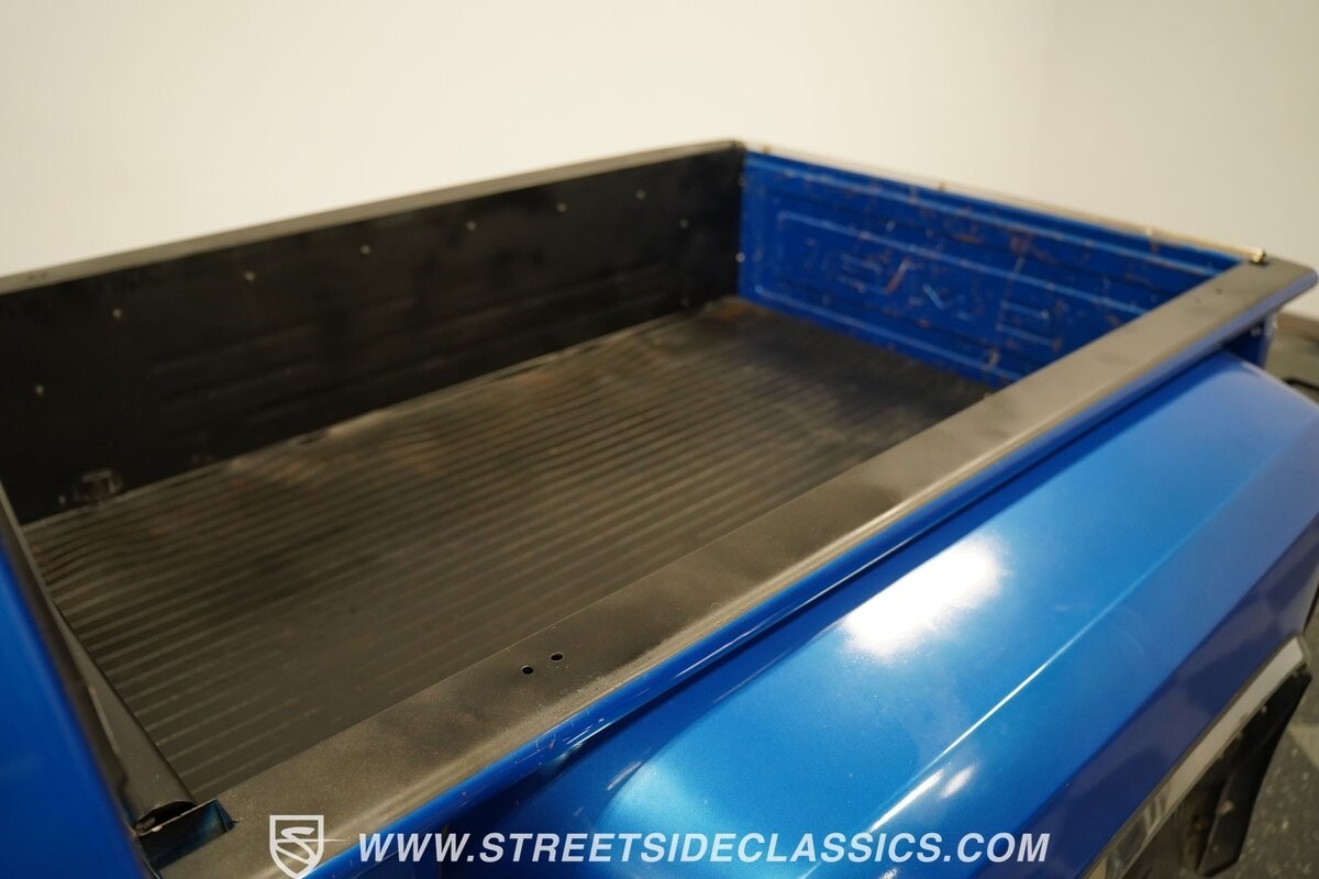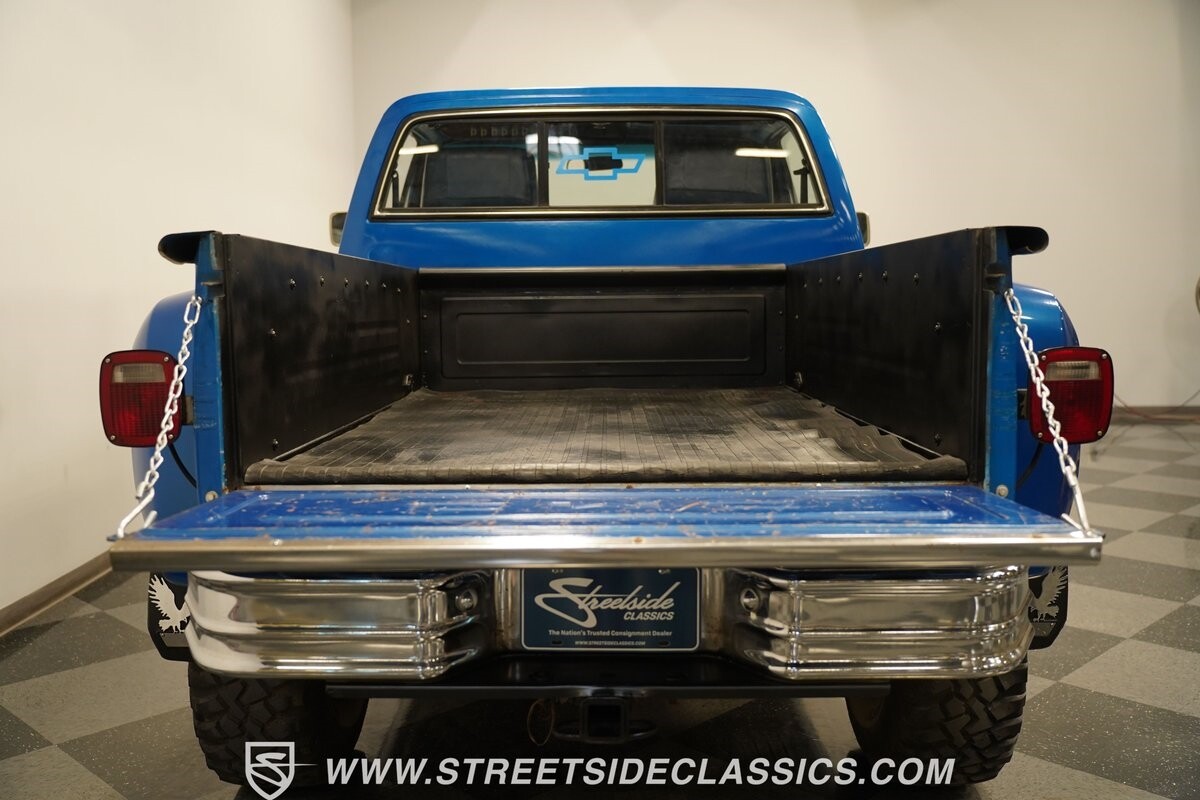 This 1984 Chevrolet K10 Supercharged 4x4 Stepside is a blue metallic beast ready to dominate both street and trail. Sporting a 4-inch lift, this Chevy towers over traffic on massive 35/12.5R15 Wild Country radial RVT tires wrapped around 15-inch chrome aftermarket alloys. The aggressive stance is complemented by a custom cowl hood inspired by early C2 Corvette big block designs, setting this K10 apart from the pack. A push bar with KC lights guards the front, while a louvered tailgate with an eagle emblem adds a custom touch to the rear. The stepside bed features a traditional wood floor, a nod to classic truck craftsmanship.