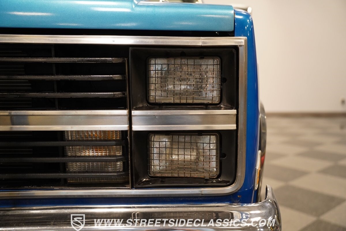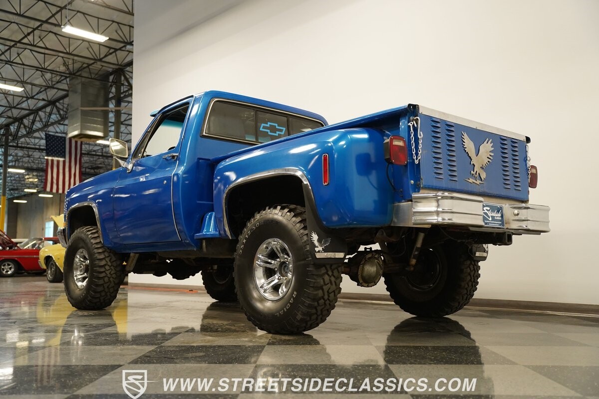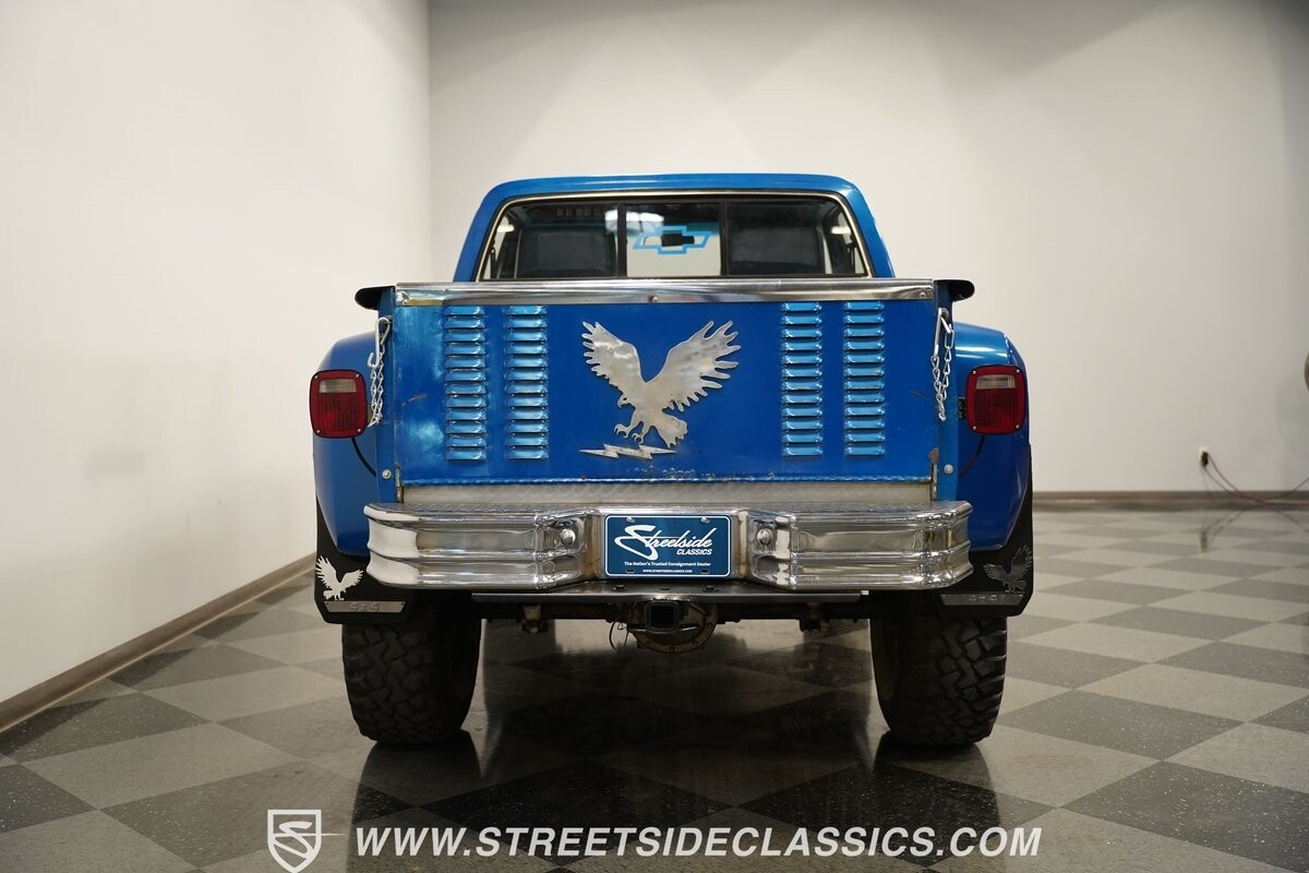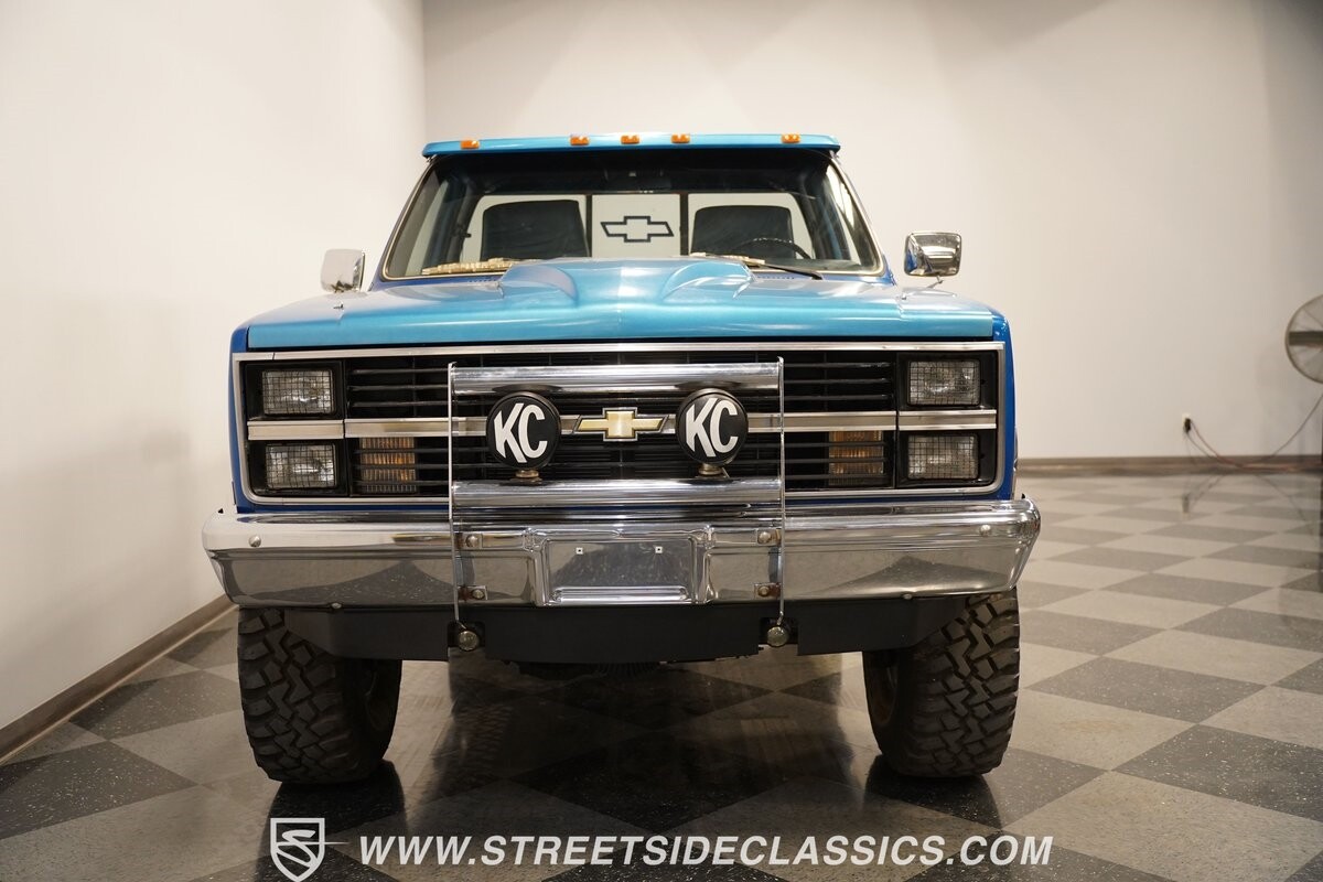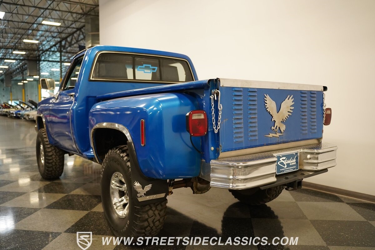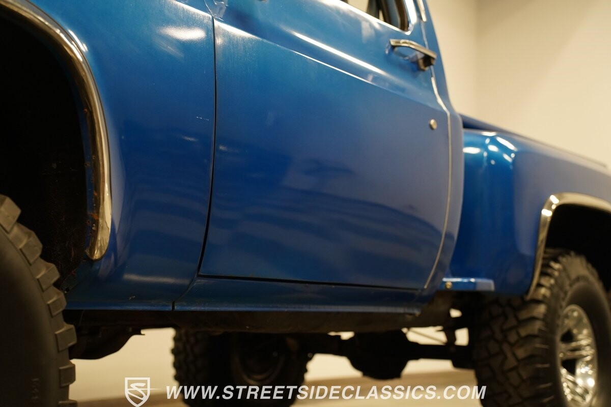 This 1984 Chevrolet K10 Supercharged 4x4 Stepside is a blue metallic beast ready to dominate both street and trail. Sporting a 4-inch lift, this Chevy towers over traffic on massive 35/12.5R15 Wild Country radial RVT tires wrapped around 15-inch chrome aftermarket alloys. The aggressive stance is complemented by a custom cowl hood inspired by early C2 Corvette big block designs, setting this K10 apart from the pack. A push bar with KC lights guards the front, while a louvered tailgate with an eagle emblem adds a custom touch to the rear. The stepside bed features a traditional wood floor, a nod to classic truck craftsmanship.