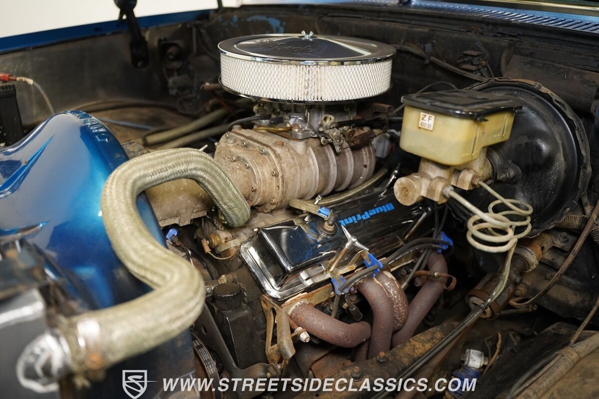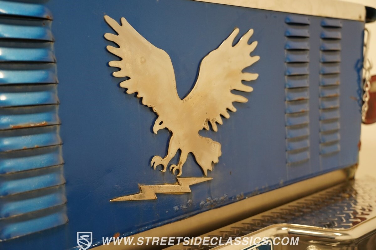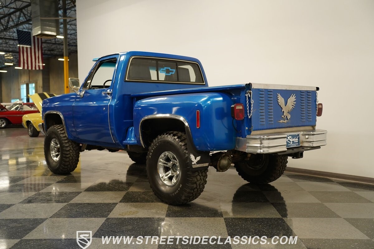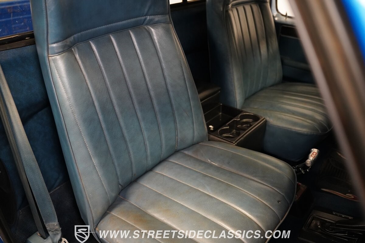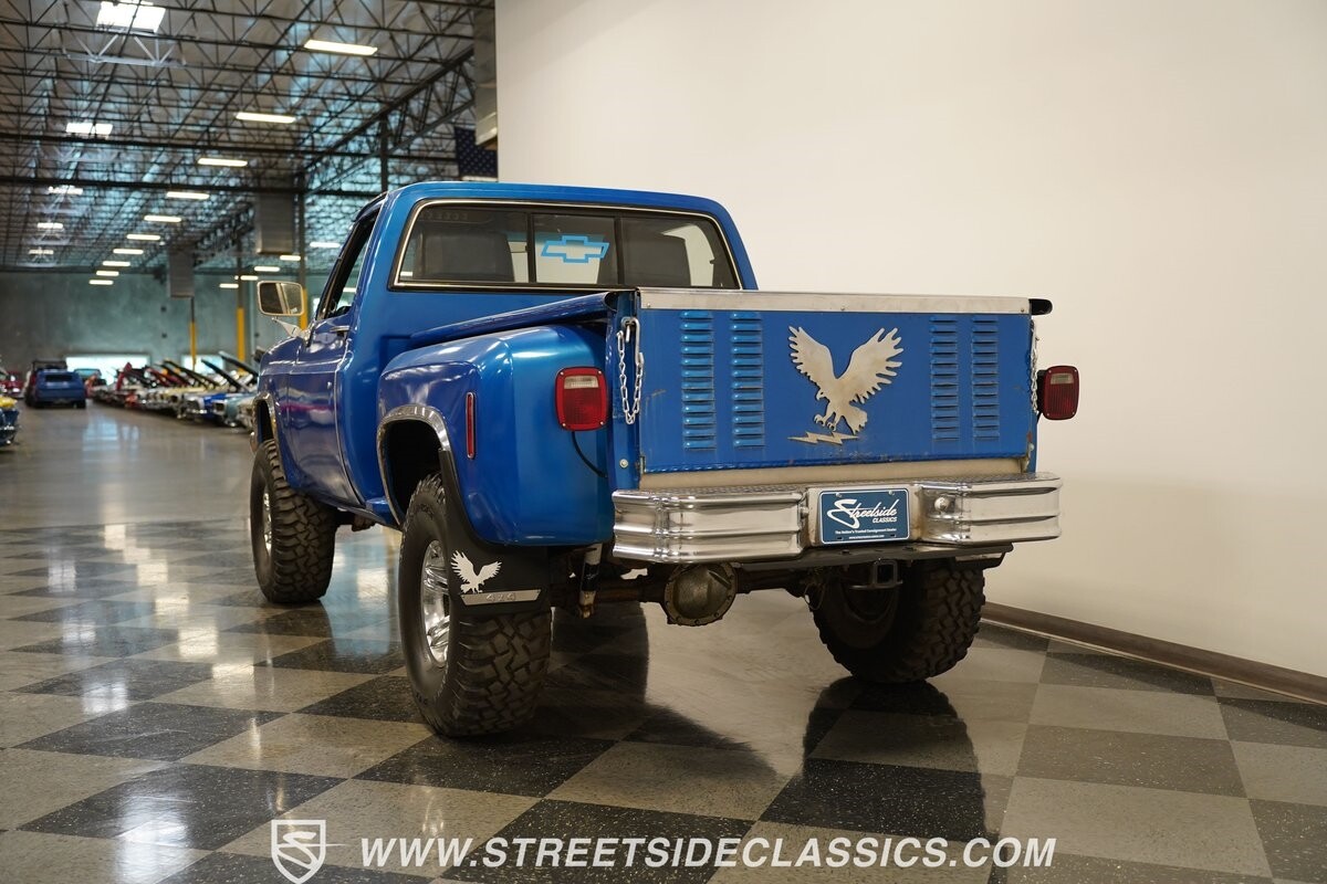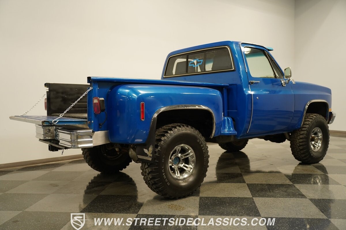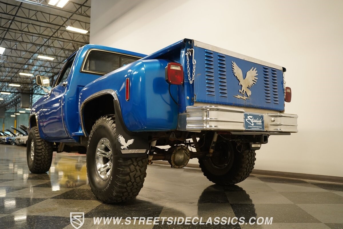 This 1984 Chevrolet K10 Supercharged 4x4 Stepside is a blue metallic beast ready to dominate both street and trail. Sporting a 4-inch lift, this Chevy towers over traffic on massive 35/12.5R15 Wild Country radial RVT tires wrapped around 15-inch chrome aftermarket alloys. The aggressive stance is complemented by a custom cowl hood inspired by early C2 Corvette big block designs, setting this K10 apart from the pack. A push bar with KC lights guards the front, while a louvered tailgate with an eagle emblem adds a custom touch to the rear. The stepside bed features a traditional wood floor, a nod to classic truck craftsmanship.
