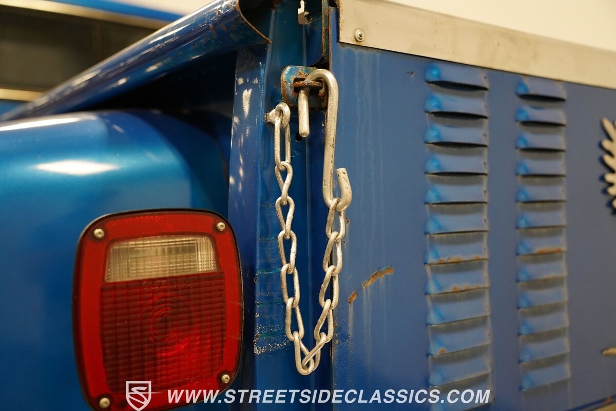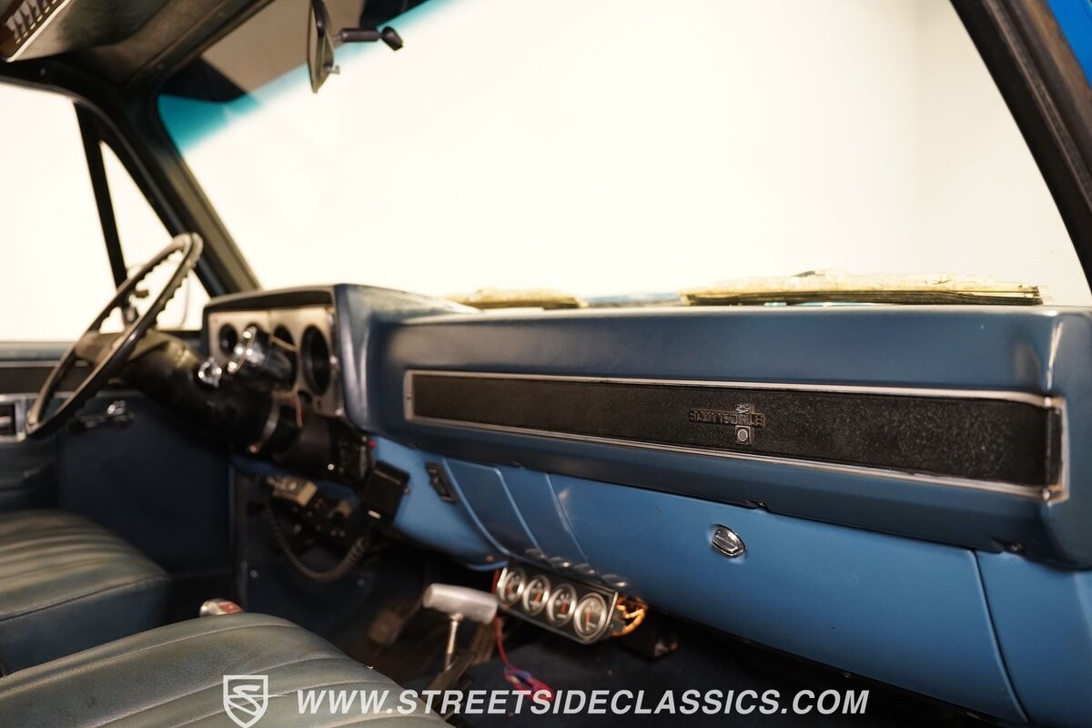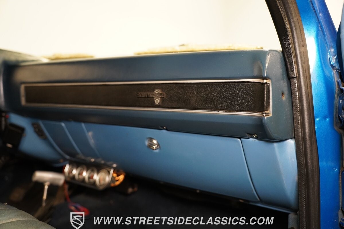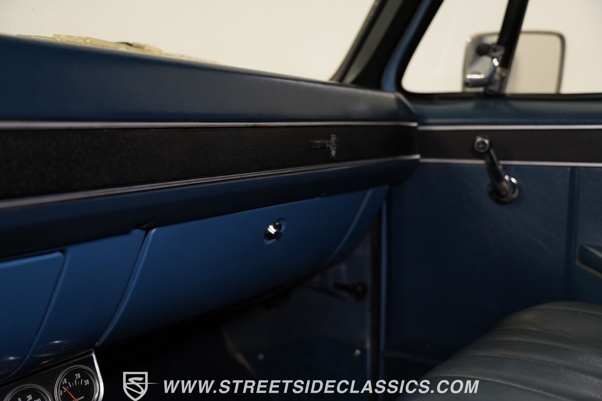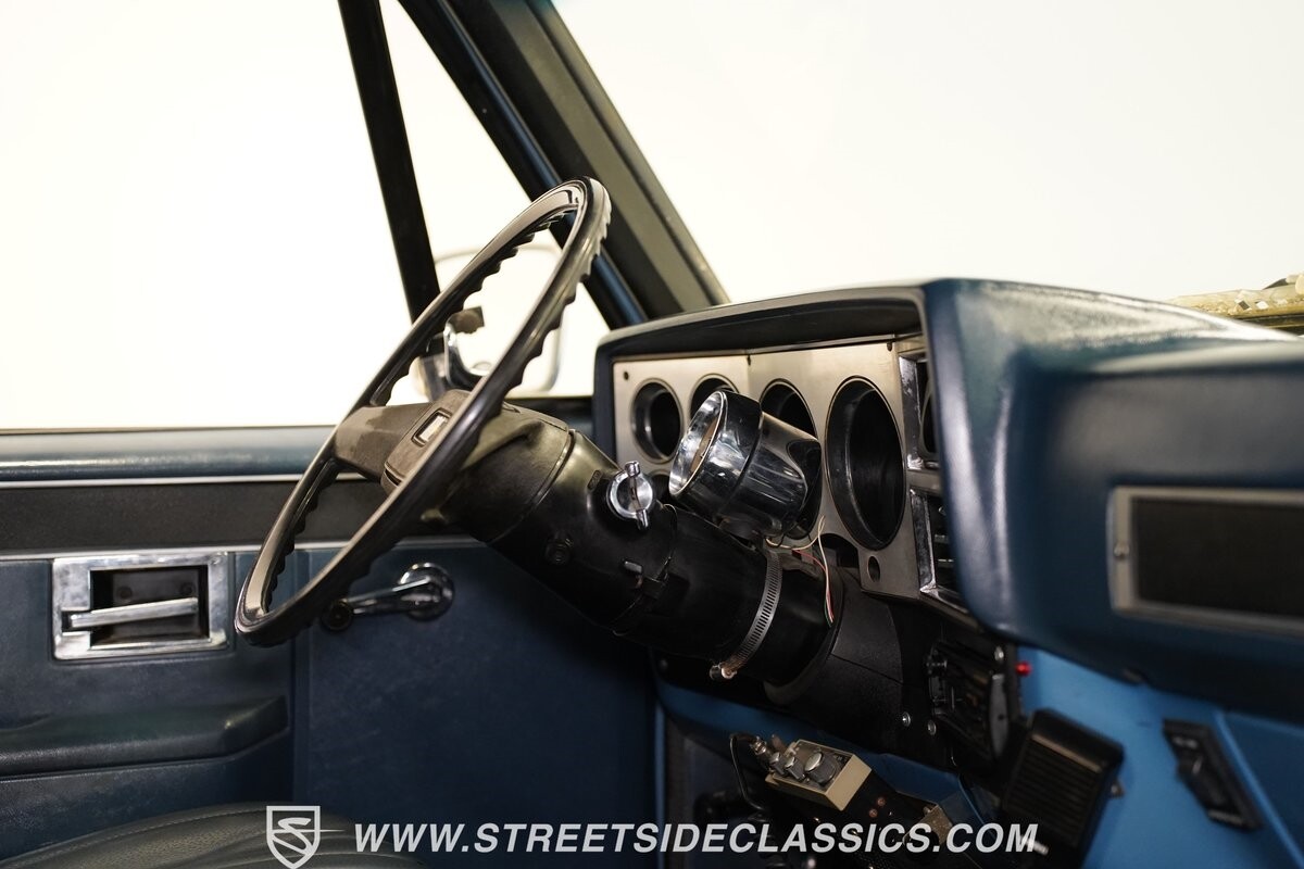 Inside, the K10's cabin is a time capsule of old-school custom truck cool. High-back bucket seats provide comfort for long hauls, while a B&M shifter offers precise control over the 3-speed automatic transmission. The dash houses both stock gauges and additional AutoMeter units for comprehensive vehicle monitoring. An angle meter on the dash aids in off-road navigation. Entertainment options abound with a JVC radio, CD player, and even a CB radio for that authentic trucker vibe. The custom overhead console with switches adds both functionality and style, reminiscent of iconic custom trucks from classic TV and movies.