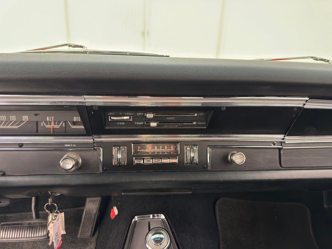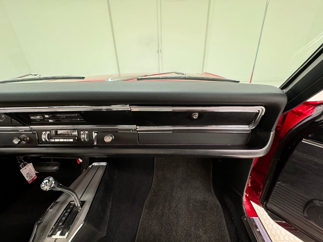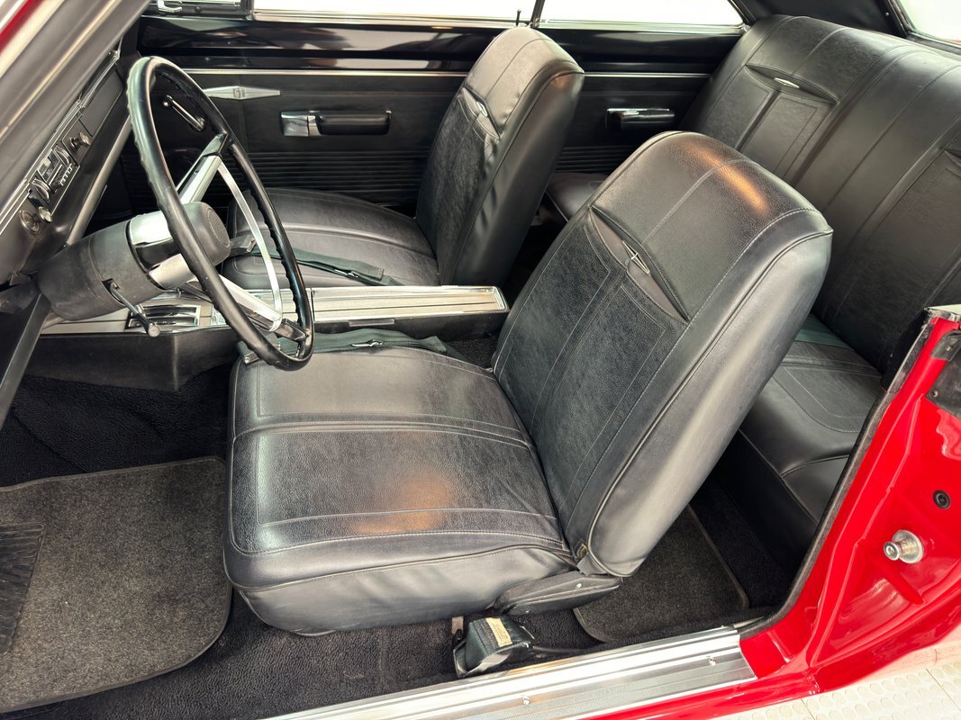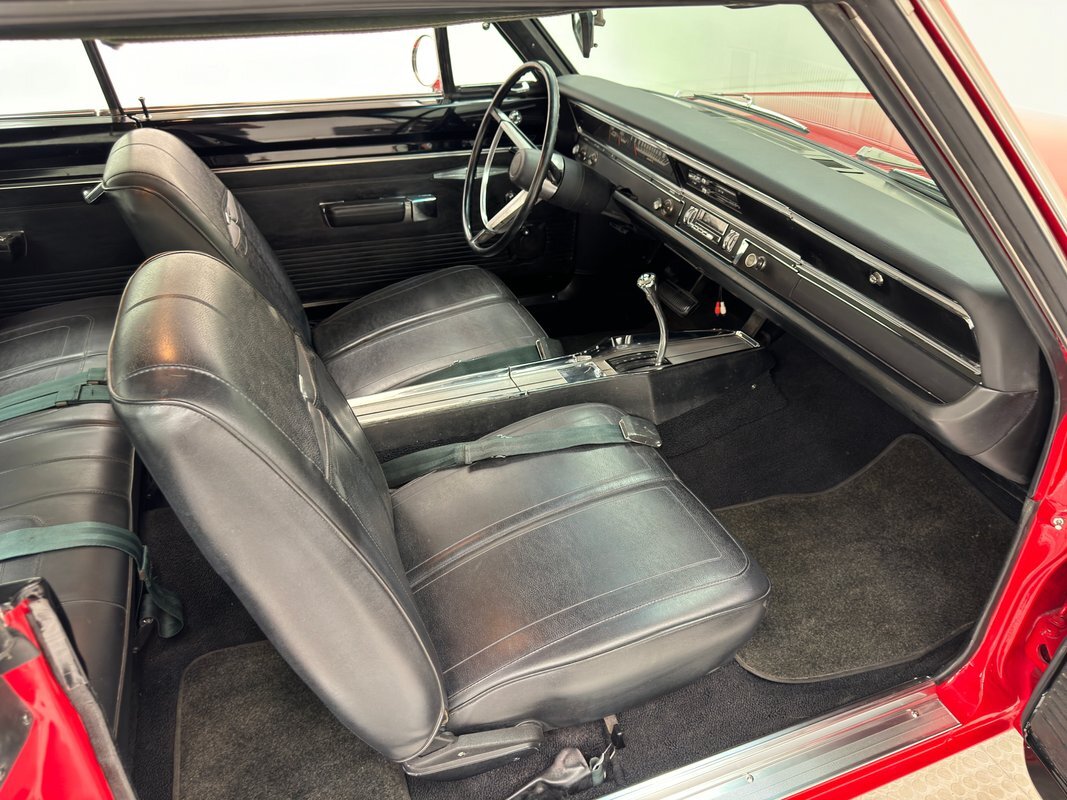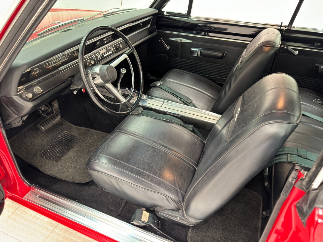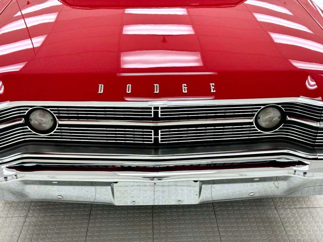 Two stage Bright Red paint covers this car which exhibits the trend of straight panels, right angles, perfectly vertical nose and tail. The grille is a contoured array of horizontal grates housing the marker lights and slightly protruding single headlights under a nicely chromed front bumper. Side markers are consistent with 1968 Mopars as small rimmed round lights, while the shoulder line above is arrow straight from nose to tail. The nicely proportioned car maintains a horizontal equilibrium between sections and the C-pillar veers from begin square by sloping dramatically to the flat trunk lid while housing a curved rear window. In back, the tail lights cant inward and a shiny aluminum panel covers the rear fascia and includes the Dodge name and accent lines in black, all looking very good. 15-inch Magnum 500 wheels live on the hubs with staggered size tires. Nothing on the profile breaks the clean lines but there is a Dodge fratzog down low and logo on the C-pilliar on the vinyl top that is in excellent condition. And the paint is amazing too and we were unable to find any exterior imperfections.