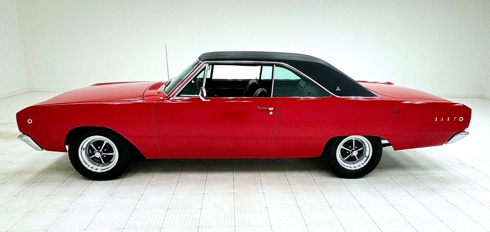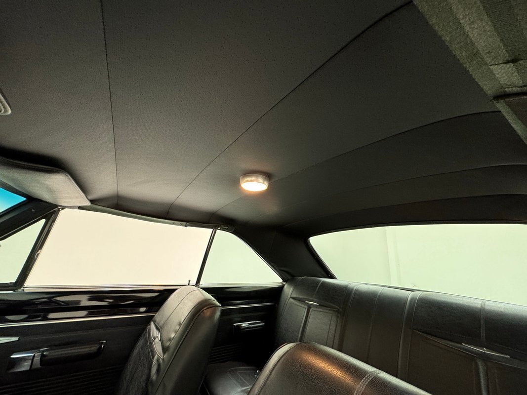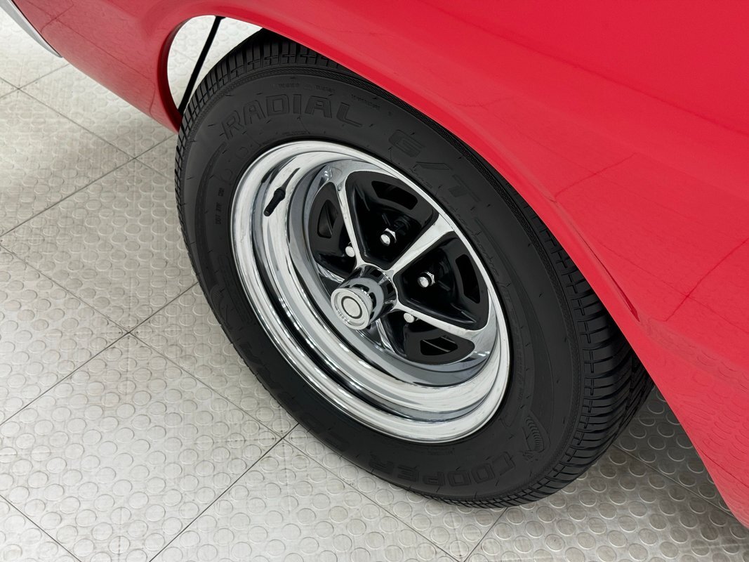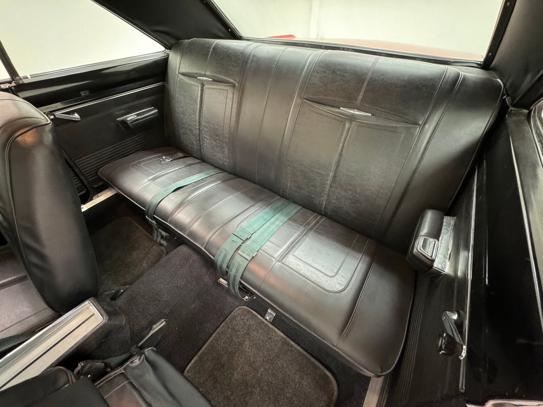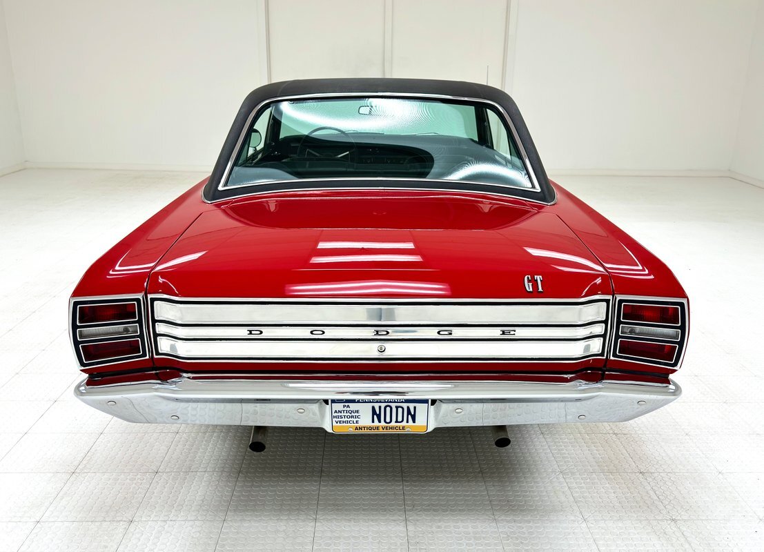 Two stage Bright Red paint covers this car which exhibits the trend of straight panels, right angles, perfectly vertical nose and tail. The grille is a contoured array of horizontal grates housing the marker lights and slightly protruding single headlights under a nicely chromed front bumper. Side markers are consistent with 1968 Mopars as small rimmed round lights, while the shoulder line above is arrow straight from nose to tail. The nicely proportioned car maintains a horizontal equilibrium between sections and the C-pillar veers from begin square by sloping dramatically to the flat trunk lid while housing a curved rear window. In back, the tail lights cant inward and a shiny aluminum panel covers the rear fascia and includes the Dodge name and accent lines in black, all looking very good. 15-inch Magnum 500 wheels live on the hubs with staggered size tires. Nothing on the profile breaks the clean lines but there is a Dodge fratzog down low and logo on the C-pilliar on the vinyl top that is in excellent condition. And the paint is amazing too and we were unable to find any exterior imperfections.