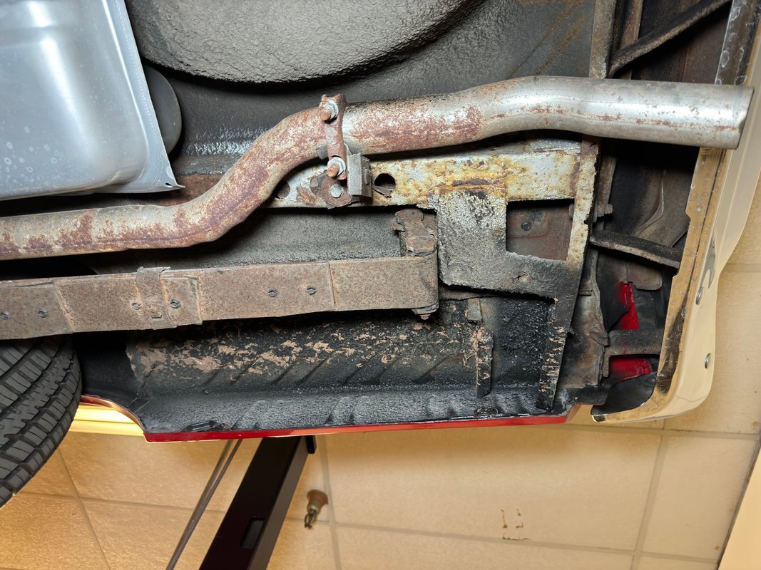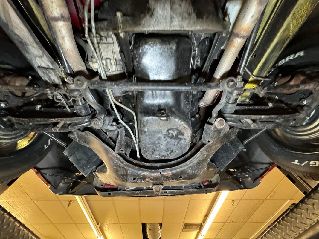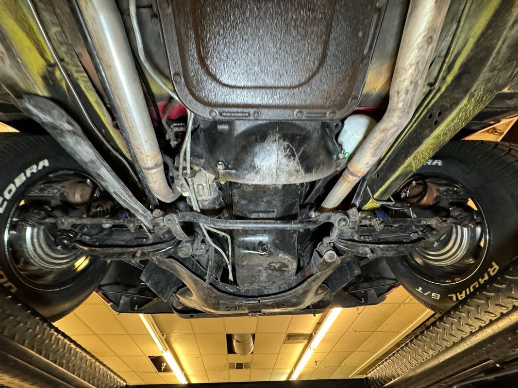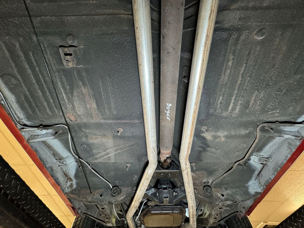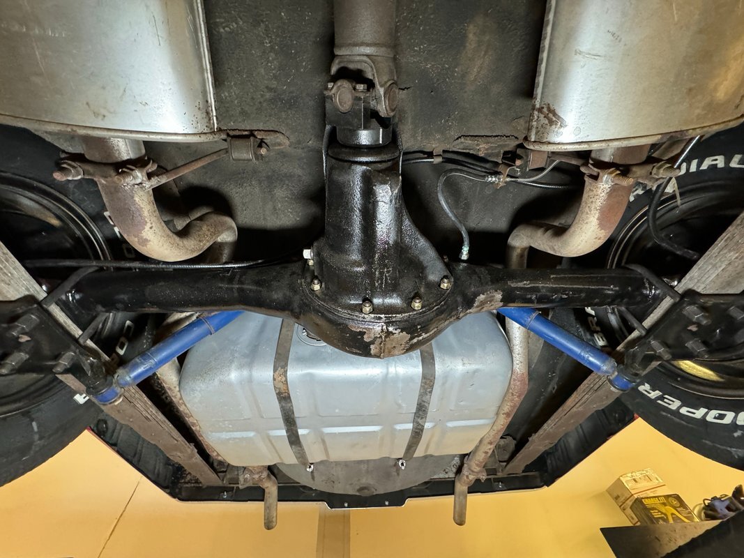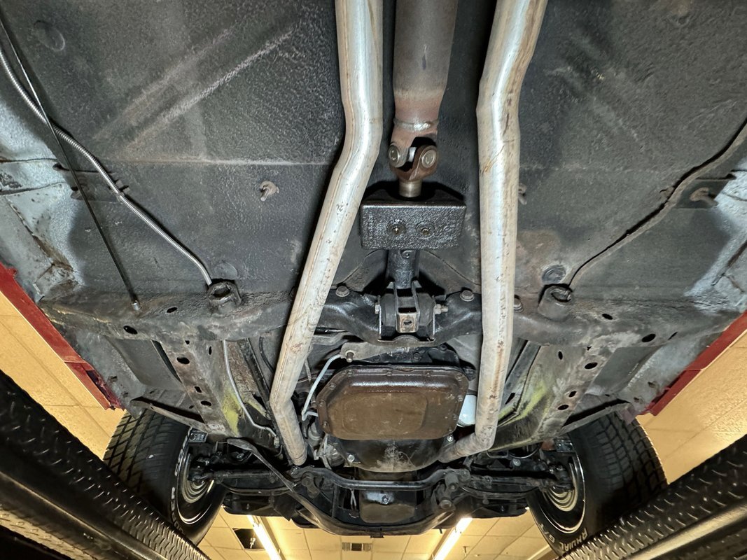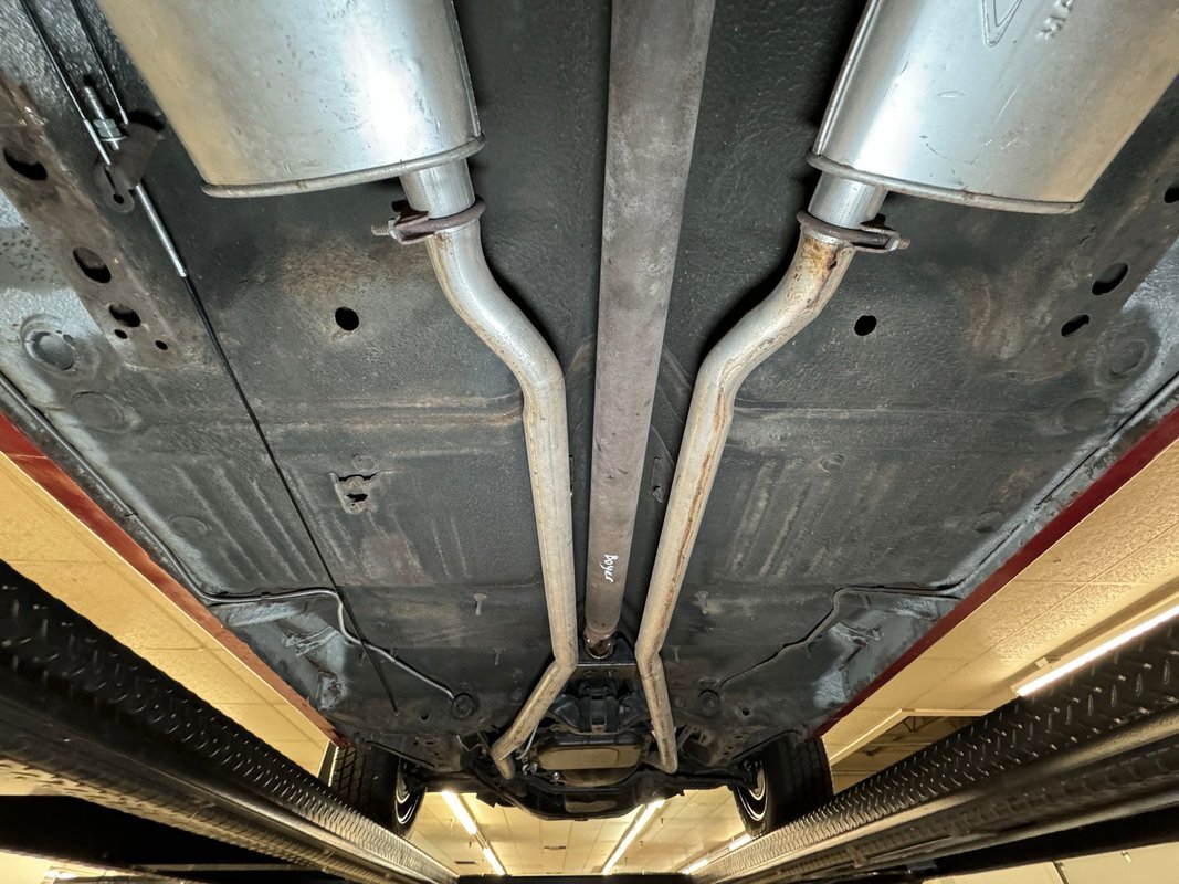 Wonderfully clean underneath with minimal surface rust, dry pans, and knuckles that are free of grease. The dual exhaust travels into Xlerator mufflers before exiting in the back. Torsion bar suspension is found up front with leaf springs in the back. No disappointments here, it's darn clean!