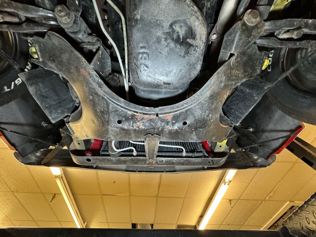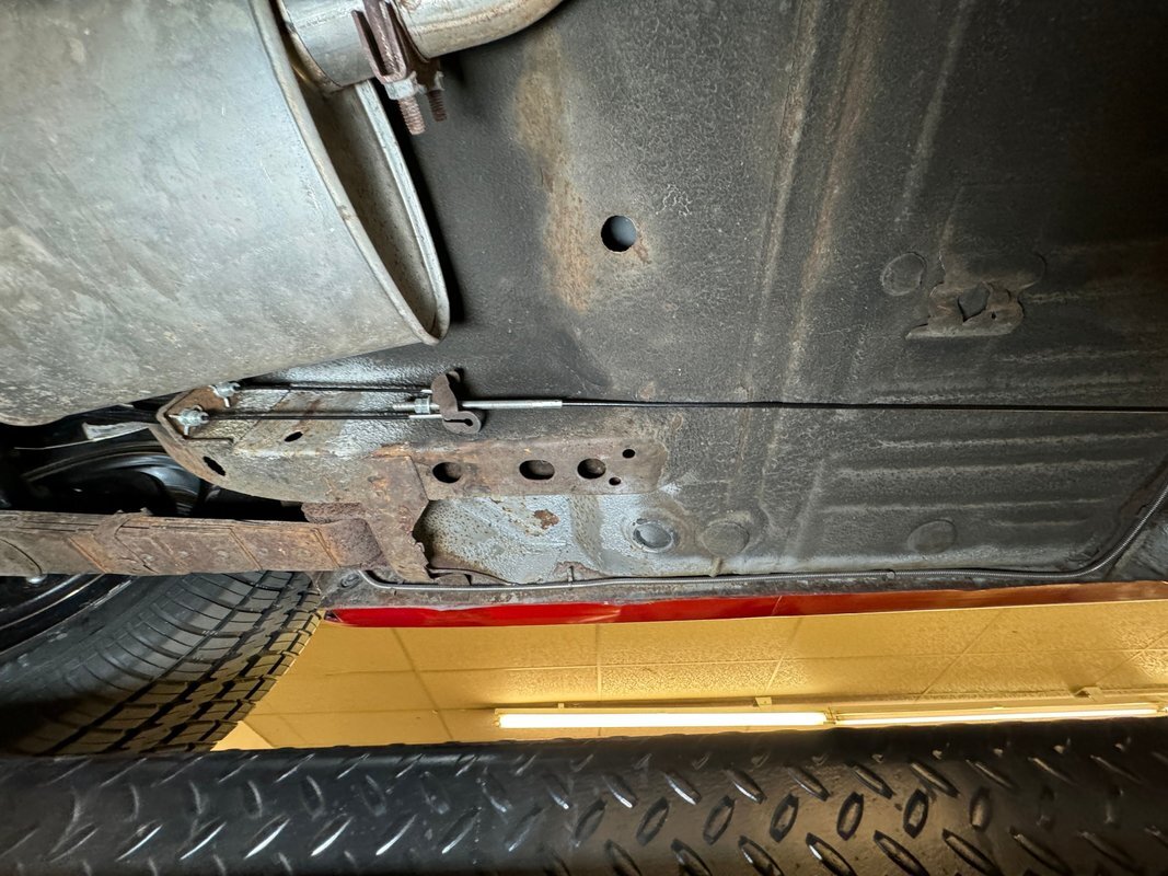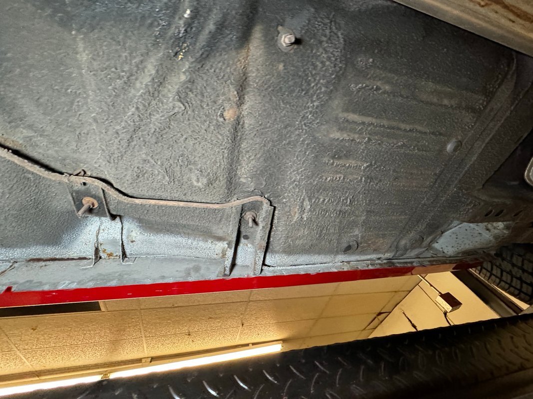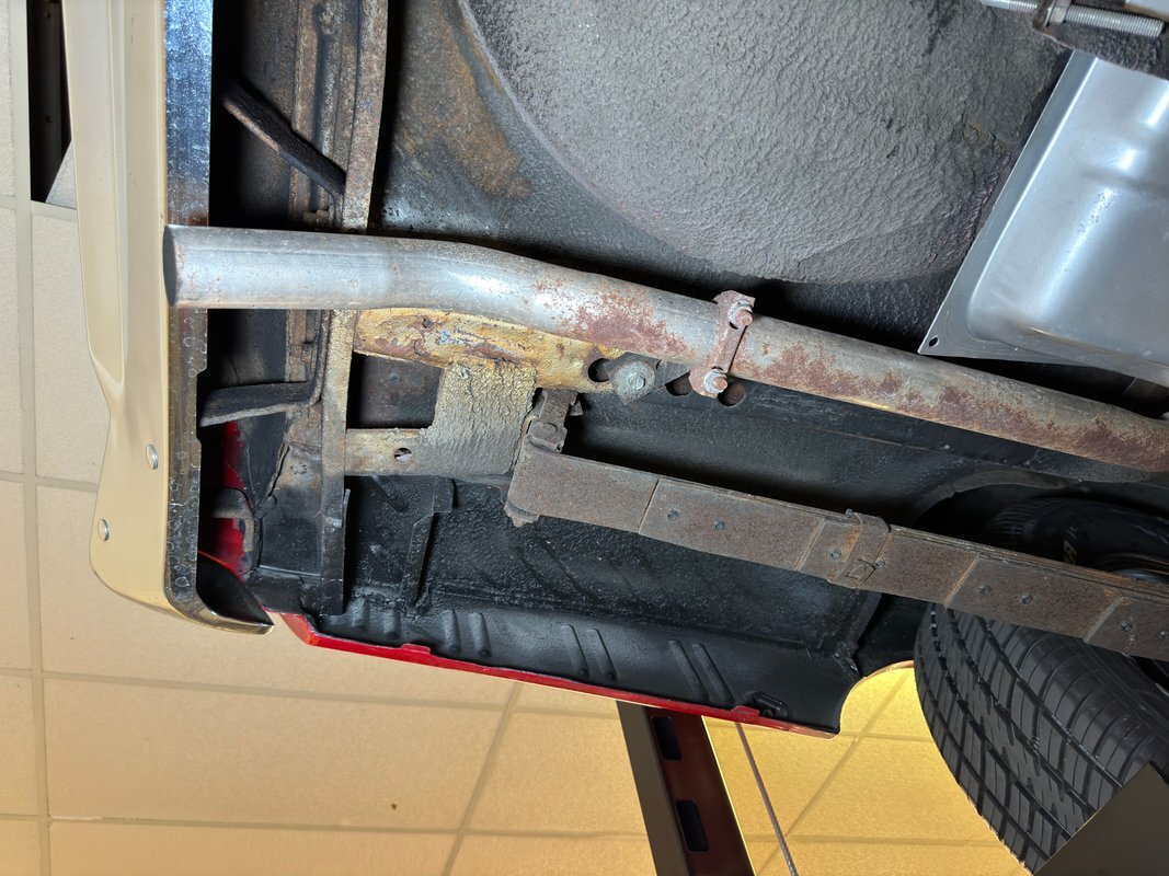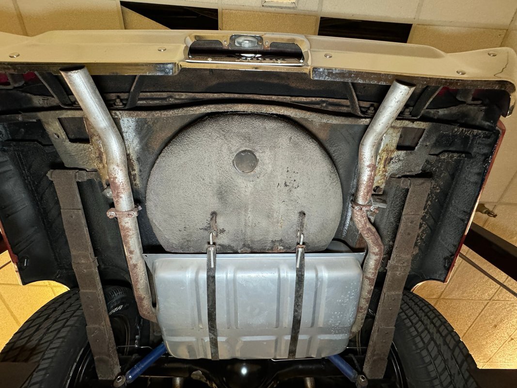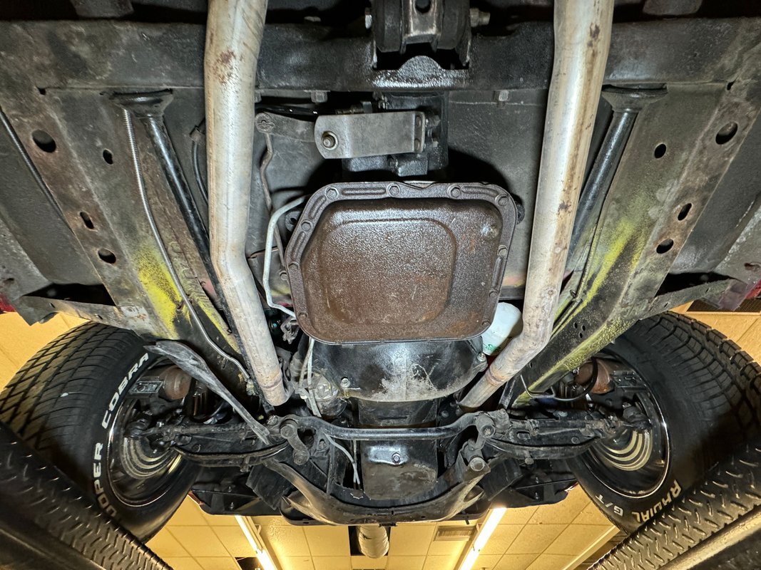 Wonderfully clean underneath with minimal surface rust, dry pans, and knuckles that are free of grease. The dual exhaust travels into Xlerator mufflers before exiting in the back. Torsion bar suspension is found up front with leaf springs in the back. No disappointments here, it's darn clean!