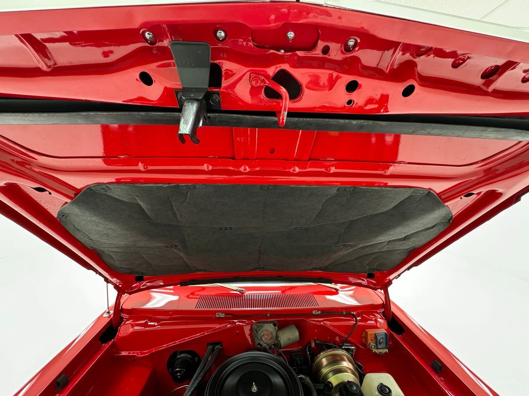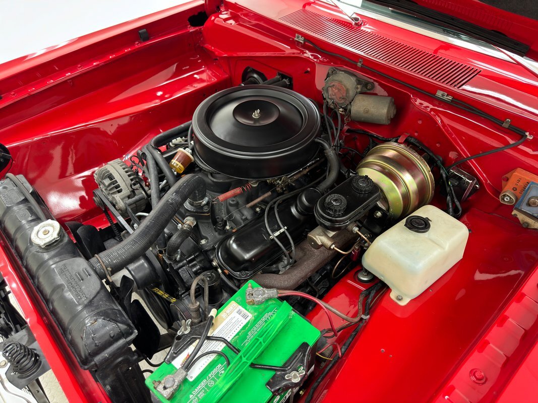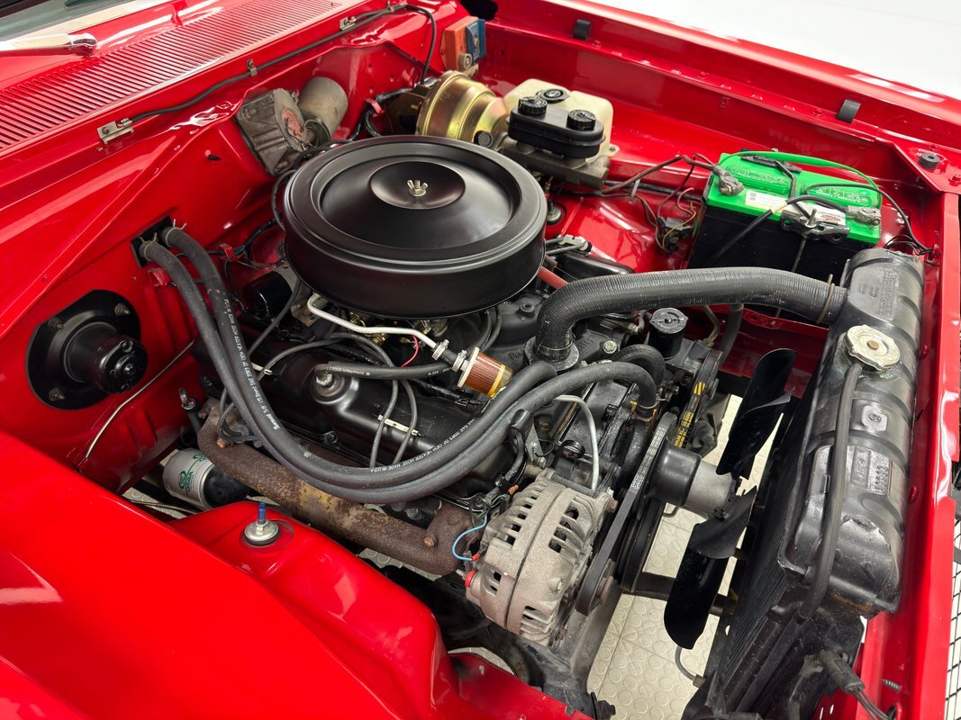Under the hood, a clean but not flashing 318ci V8, topped by the 4-barrel Edelbrock carburetor sitting on top of a Holley intake. 1973 offers up the A904 3-speed automatic transmission that sends power back to an 8 3/4 inch rear with 2.76 gears. The car is equipped with power brakes in the disc front, drum rear configuration. Like the rest of the paint, the red metal of the engine bay is spotless.