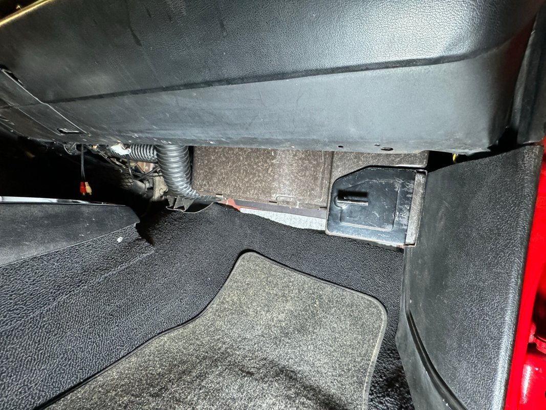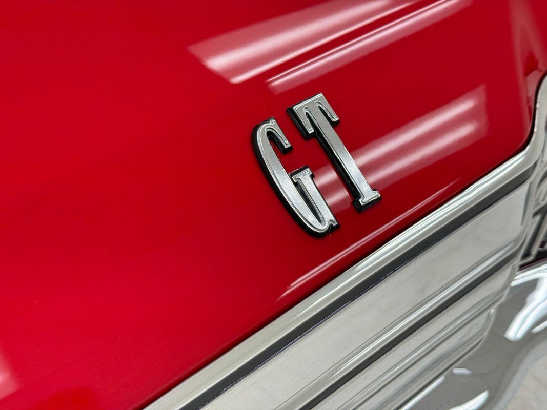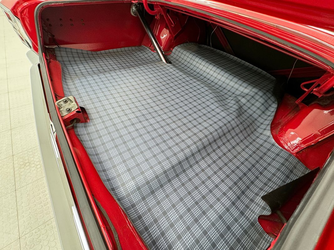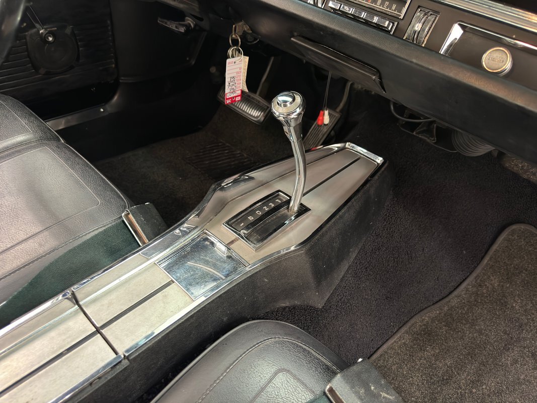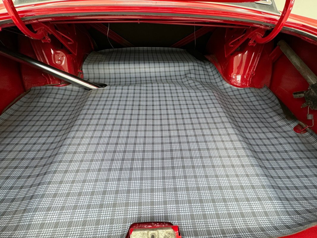Textured vinyl door cards flow from a black painted head and retain a GT emblem. Low back bucket seats with simple stitch patterns in black vinyl occupy the front and are in very good condition while the back bench looks unused...so much for marketing. The unique diamond shaped center console houses the metallic shifter and a long flat panel that serves as the storage bin lid. A black steering wheel heads the dash which retains its 60's style with horizontal gauges across a single plane and the center splits an upper and lower containing the vent/heat controls and AM radio is a nice original configuration. A slightly misaligned glove box door completes the frame of the dashboard trim and low pile black carpet covers the floor nicely mirrored by the black headliner above in great condition. The trunk is spotless, walled by shiny paint and covered by a plaid mat.