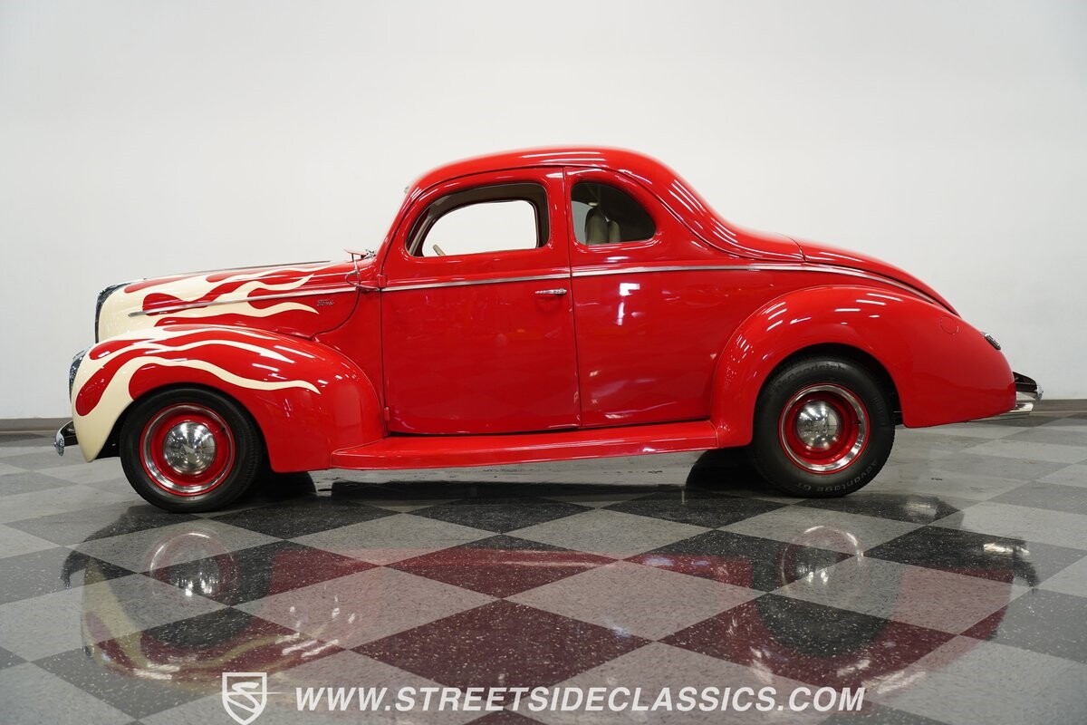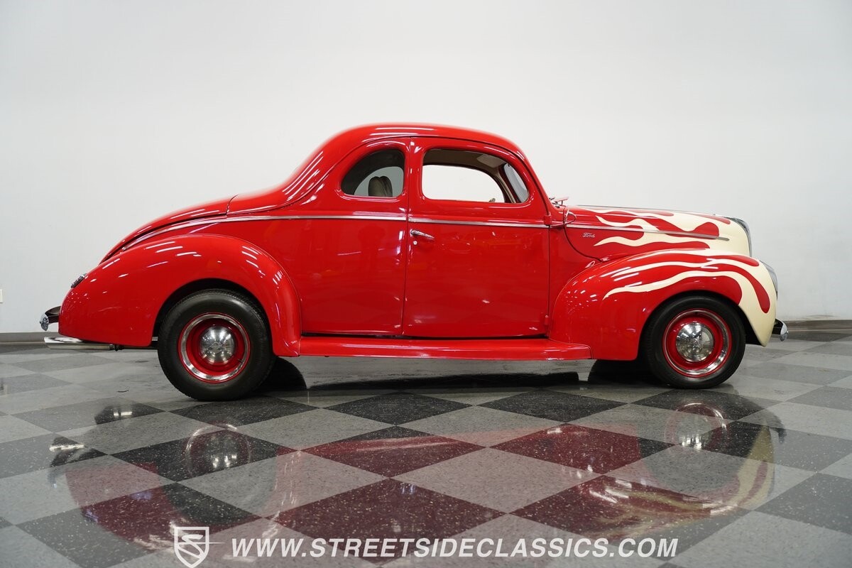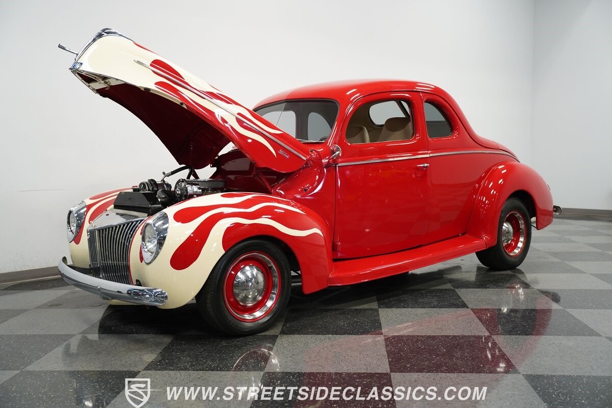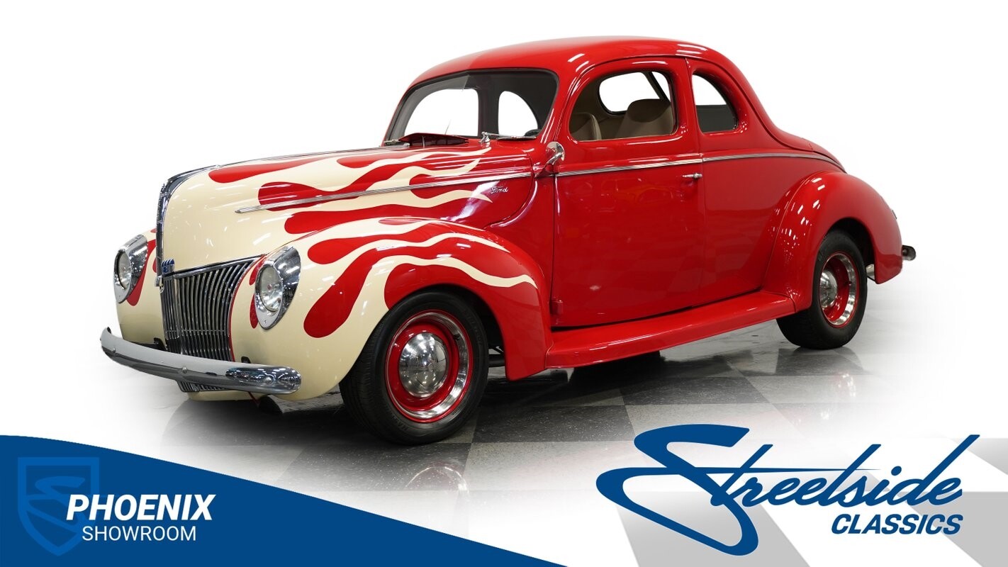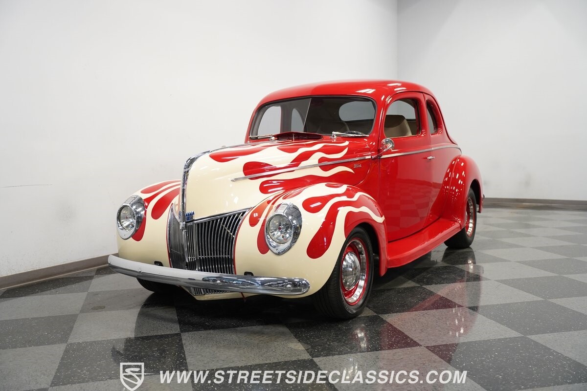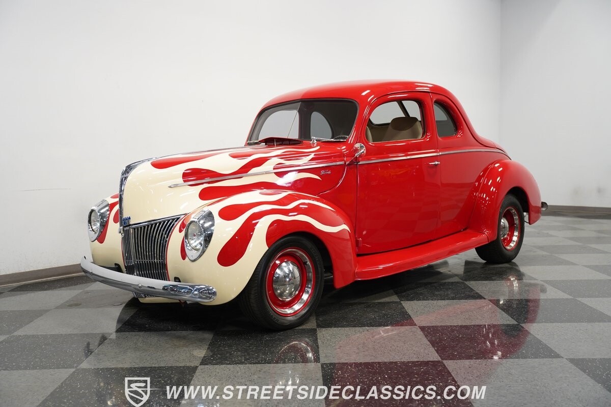 This 1940 Ford Coupe Streetrod is a blast from the past with a whole lot of attitude. That red paint gleams, with white flames dancing across the hood for an extra shot of excitement. It rolls on 15-inch red steel wheels with gleaming chrome caps, wrapped in classic 195/60R15 tires up front and wider 225/70R15s in the rear. This is an all-steel beauty, with smooth lines from the fenders all the way down the running boards. Chrome bumpers, dual mirrors, and those snazzy tri-bar headlights add just the right amount of shine. With power rack and pinion steering and a V-butt windshield, it's got classic hot rod looks with a touch of modern handling.