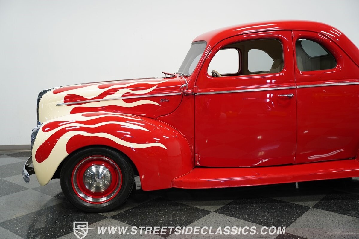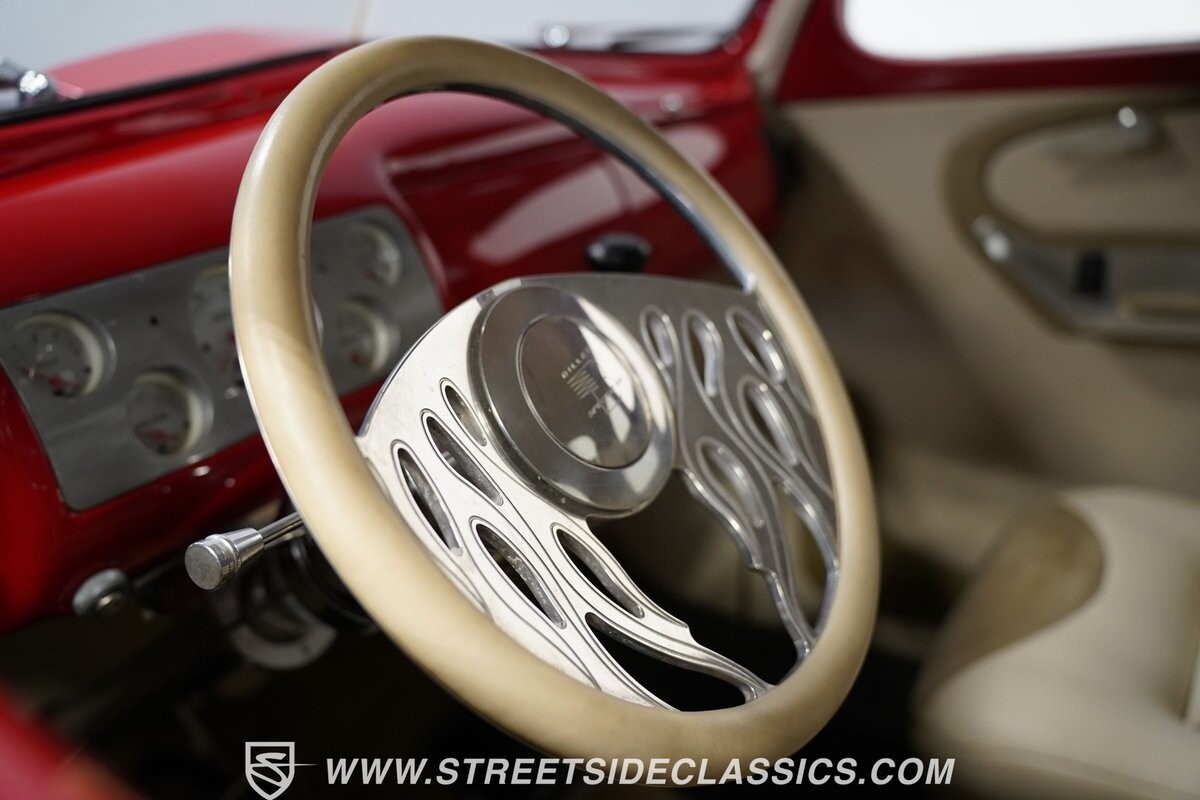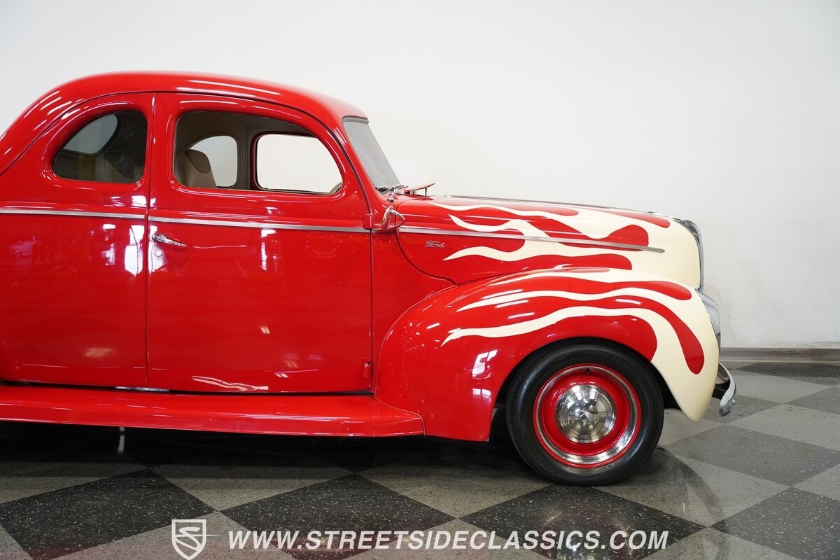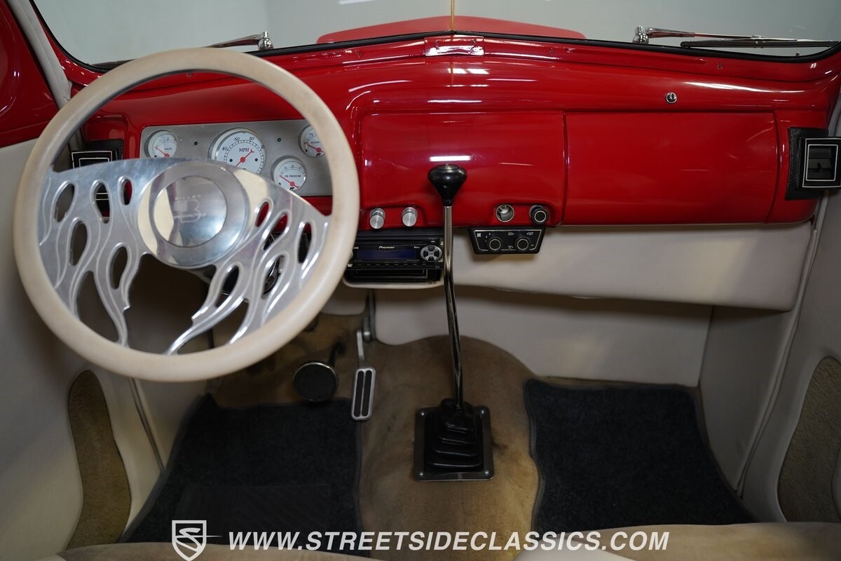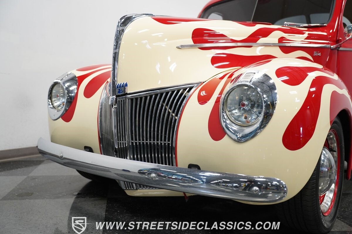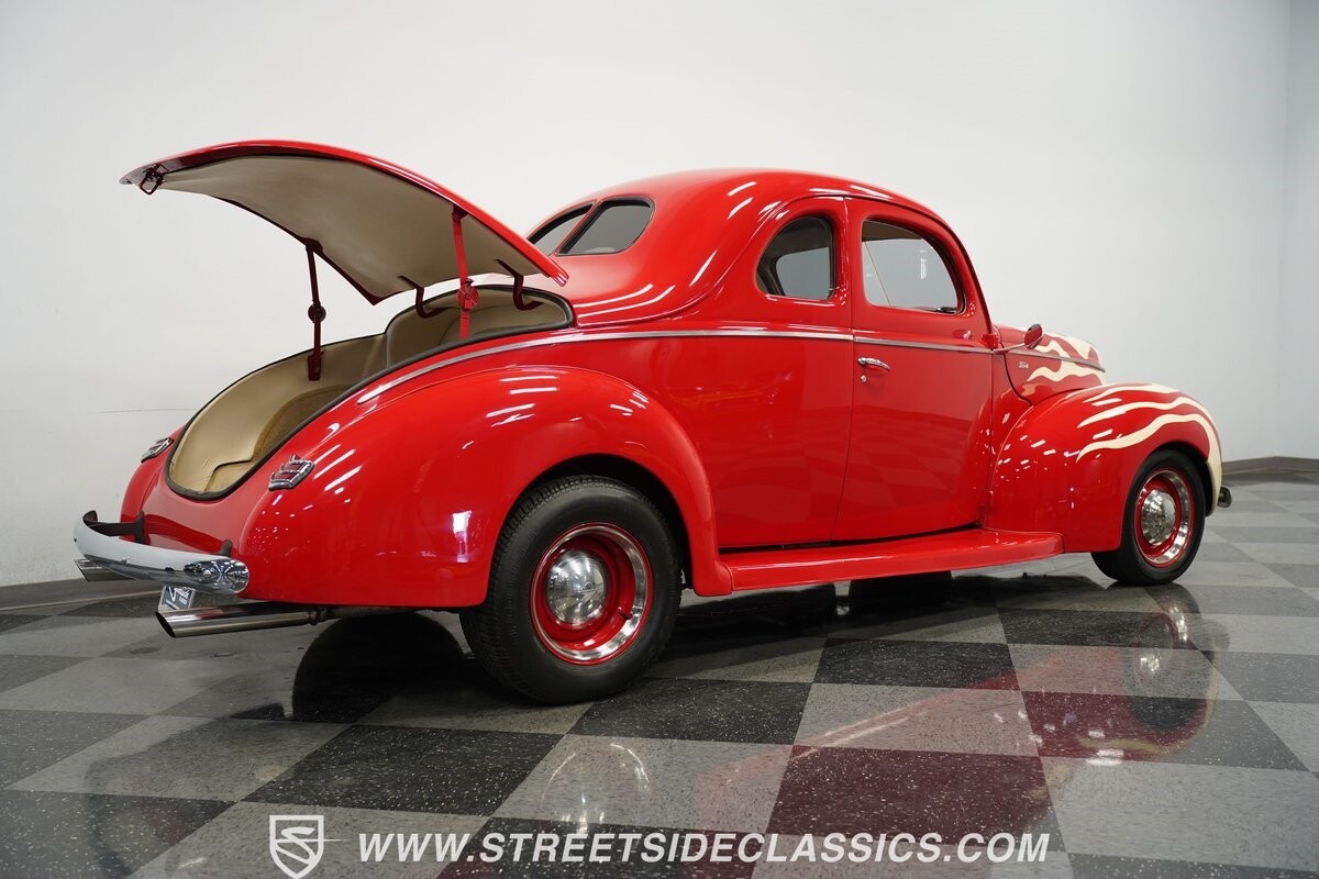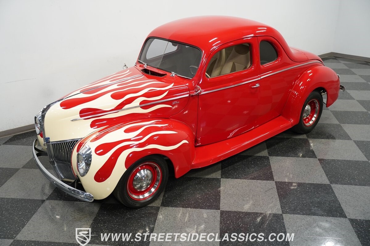 This 1940 Ford Coupe Streetrod is a blast from the past with a whole lot of attitude. That red paint gleams, with white flames dancing across the hood for an extra shot of excitement. It rolls on 15-inch red steel wheels with gleaming chrome caps, wrapped in classic 195/60R15 tires up front and wider 225/70R15s in the rear. This is an all-steel beauty, with smooth lines from the fenders all the way down the running boards. Chrome bumpers, dual mirrors, and those snazzy tri-bar headlights add just the right amount of shine. With power rack and pinion steering and a V-butt windshield, it's got classic hot rod looks with a touch of modern handling.
