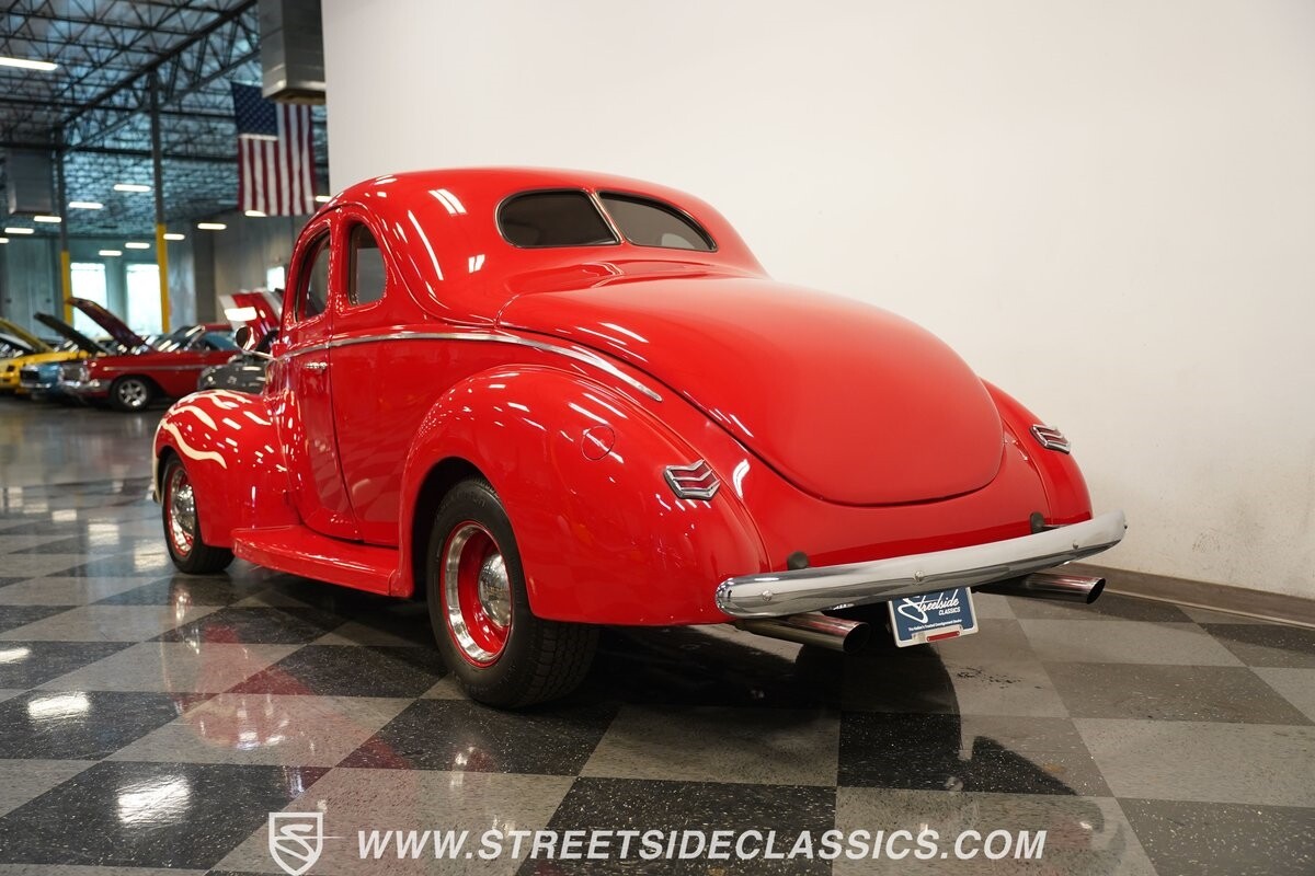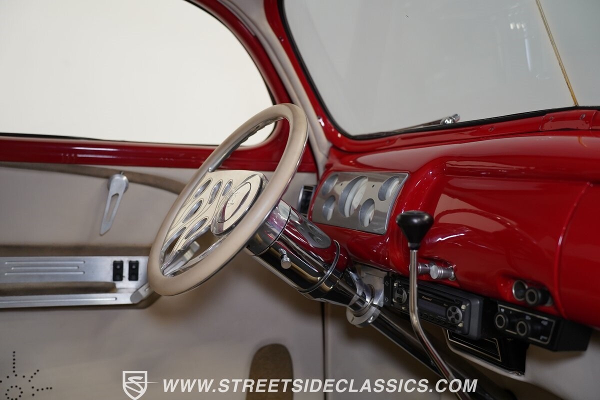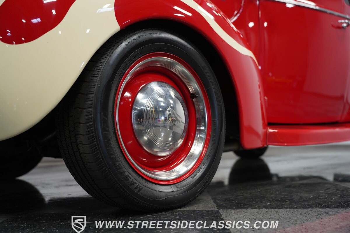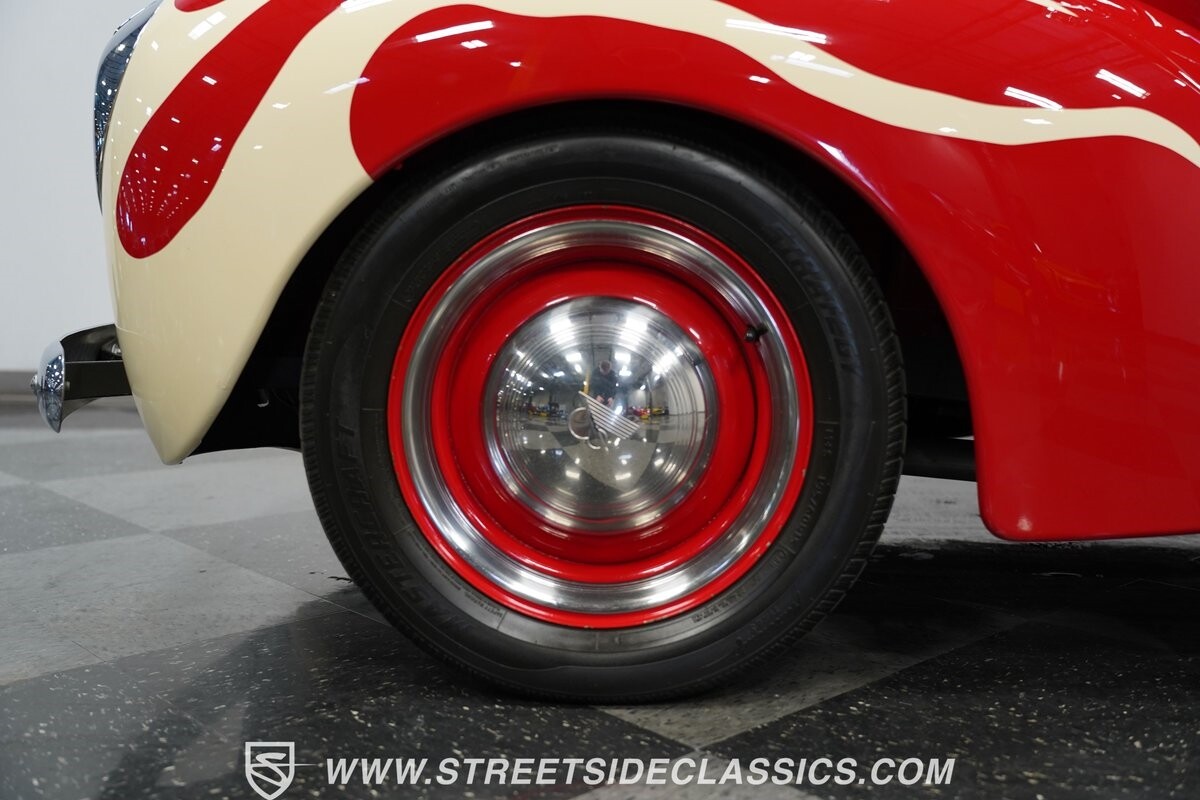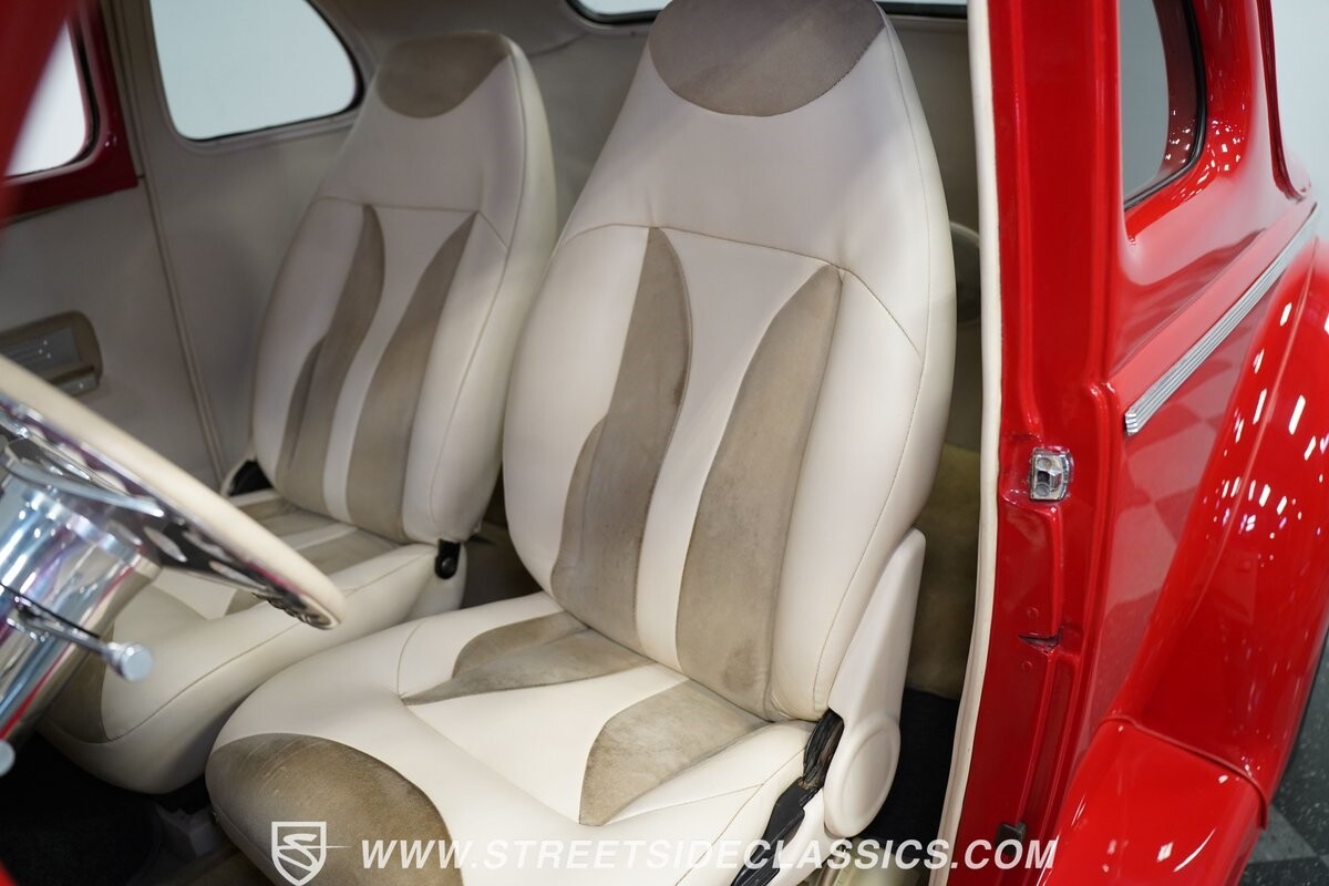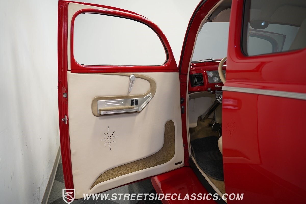 This 1940 Ford Coupe Streetrod is a blast from the past with a whole lot of attitude. That red paint gleams, with white flames dancing across the hood for an extra shot of excitement. It rolls on 15-inch red steel wheels with gleaming chrome caps, wrapped in classic 195/60R15 tires up front and wider 225/70R15s in the rear. This is an all-steel beauty, with smooth lines from the fenders all the way down the running boards. Chrome bumpers, dual mirrors, and those snazzy tri-bar headlights add just the right amount of shine. With power rack and pinion steering and a V-butt windshield, it's got classic hot rod looks with a touch of modern handling.