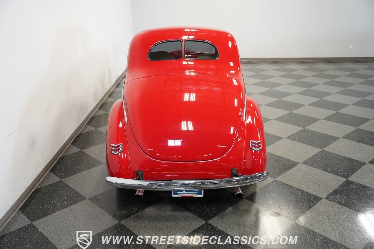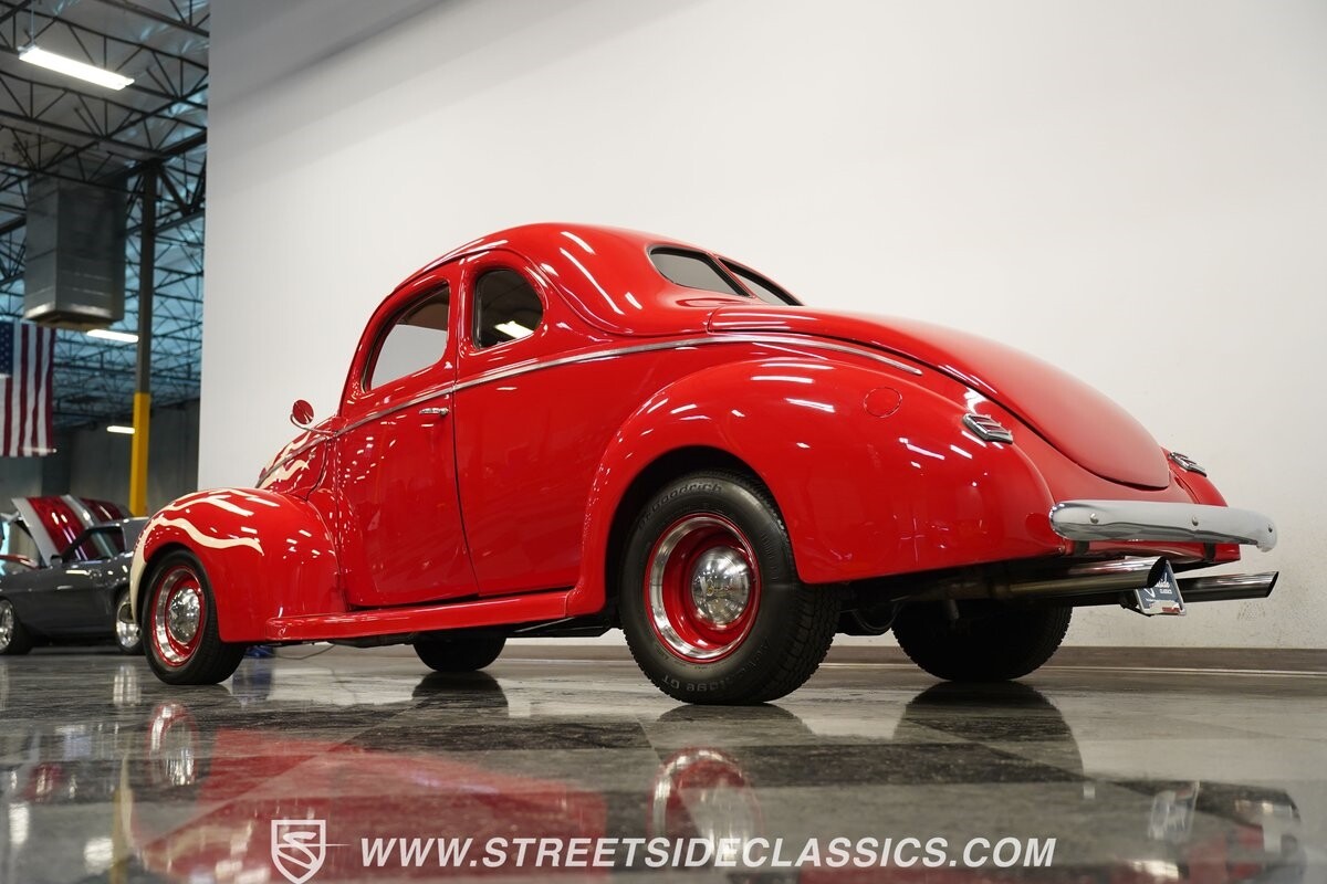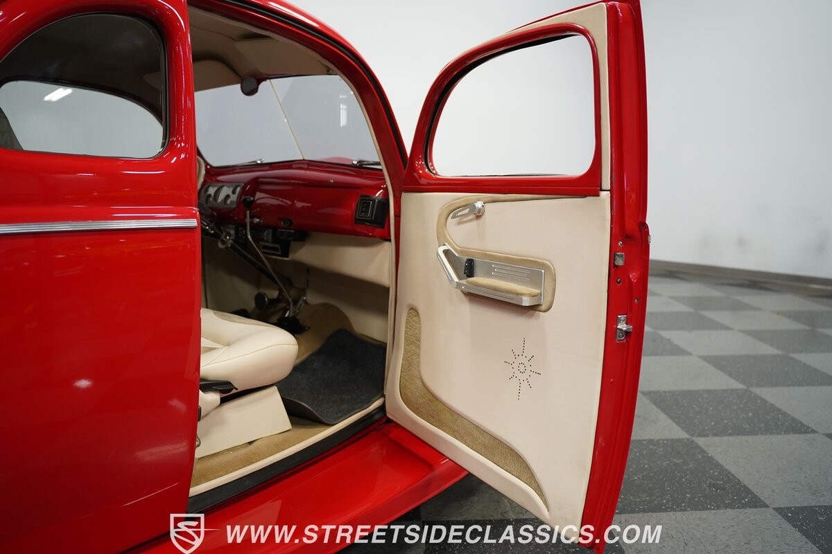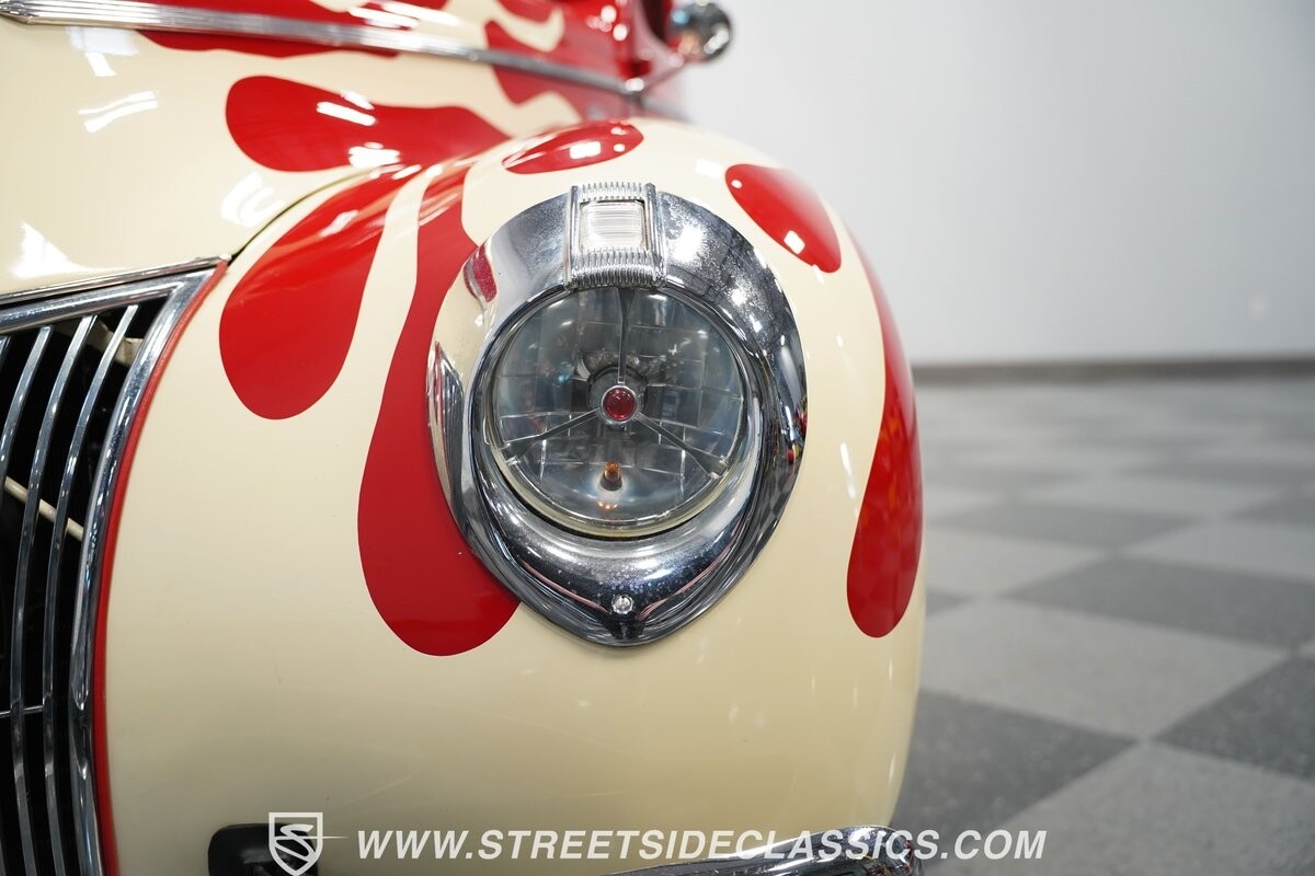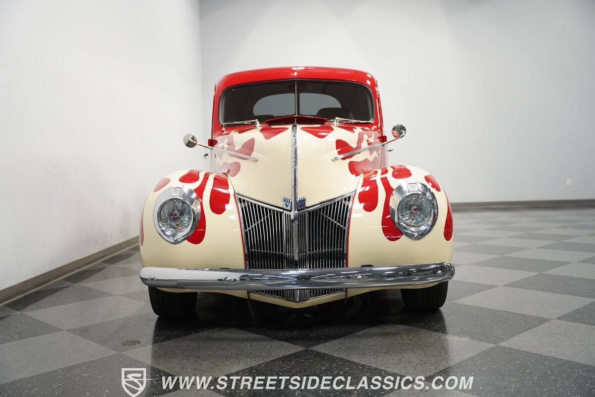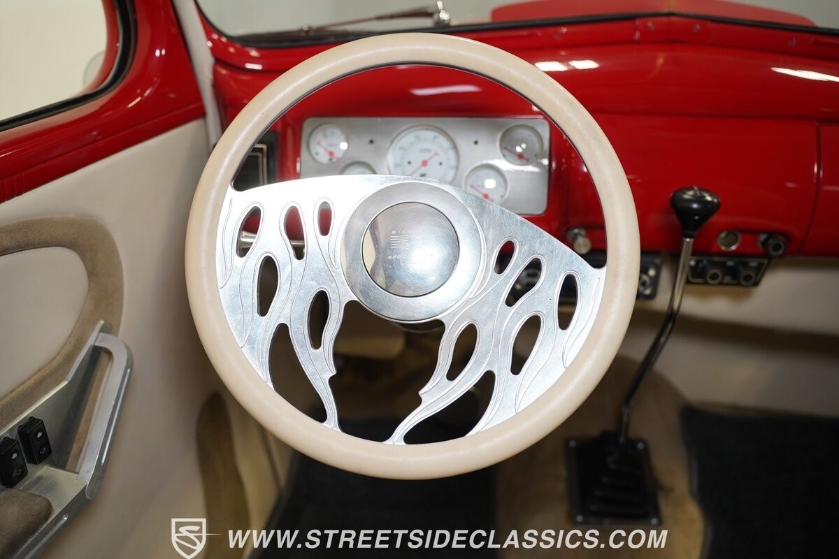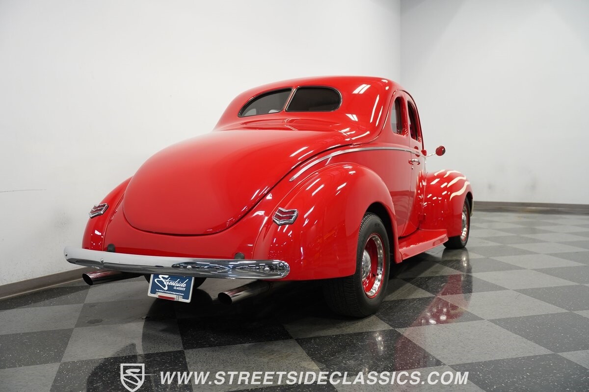 This 1940 Ford Coupe Streetrod is a blast from the past with a whole lot of attitude. That red paint gleams, with white flames dancing across the hood for an extra shot of excitement. It rolls on 15-inch red steel wheels with gleaming chrome caps, wrapped in classic 195/60R15 tires up front and wider 225/70R15s in the rear. This is an all-steel beauty, with smooth lines from the fenders all the way down the running boards. Chrome bumpers, dual mirrors, and those snazzy tri-bar headlights add just the right amount of shine. With power rack and pinion steering and a V-butt windshield, it's got classic hot rod looks with a touch of modern handling.