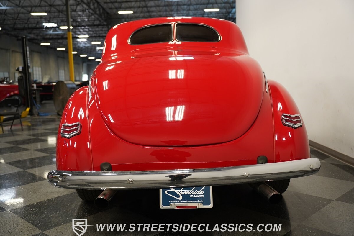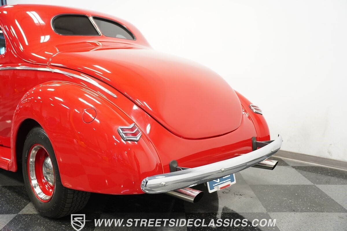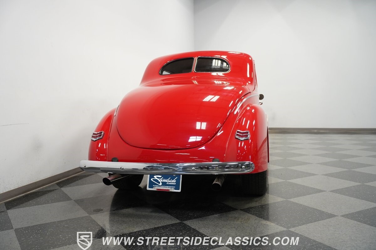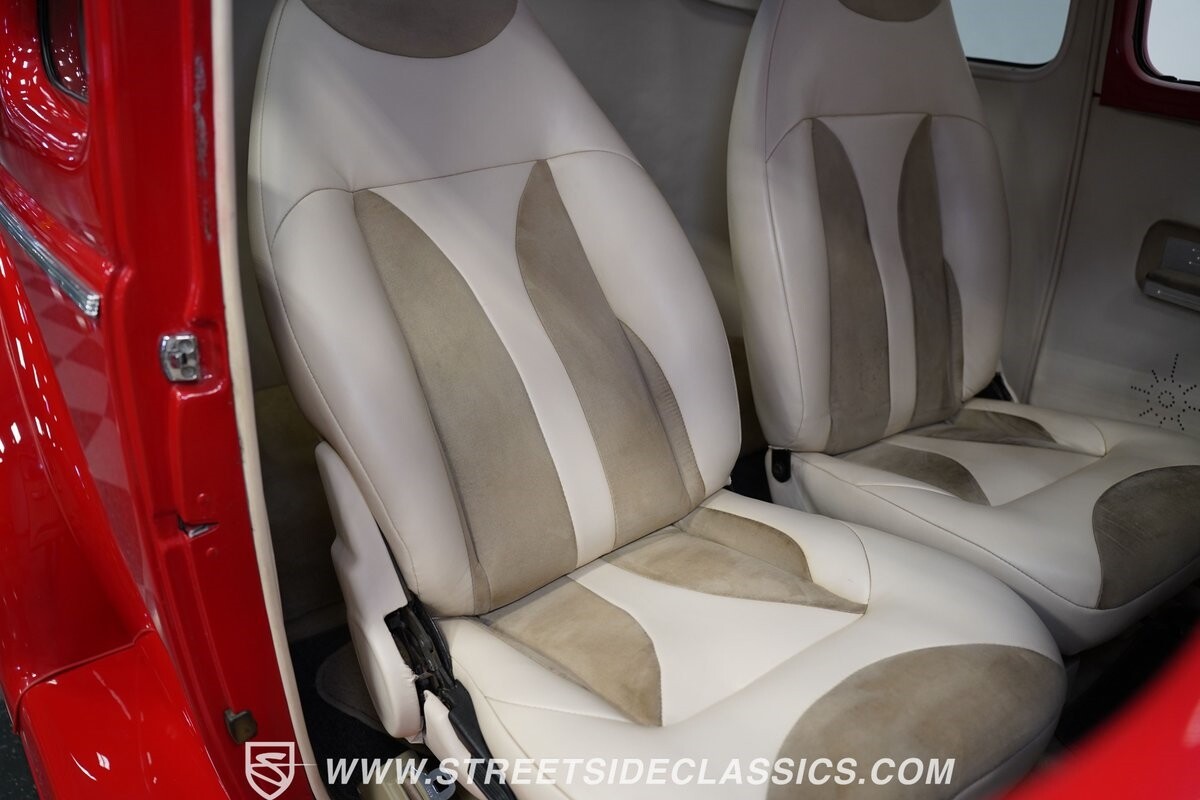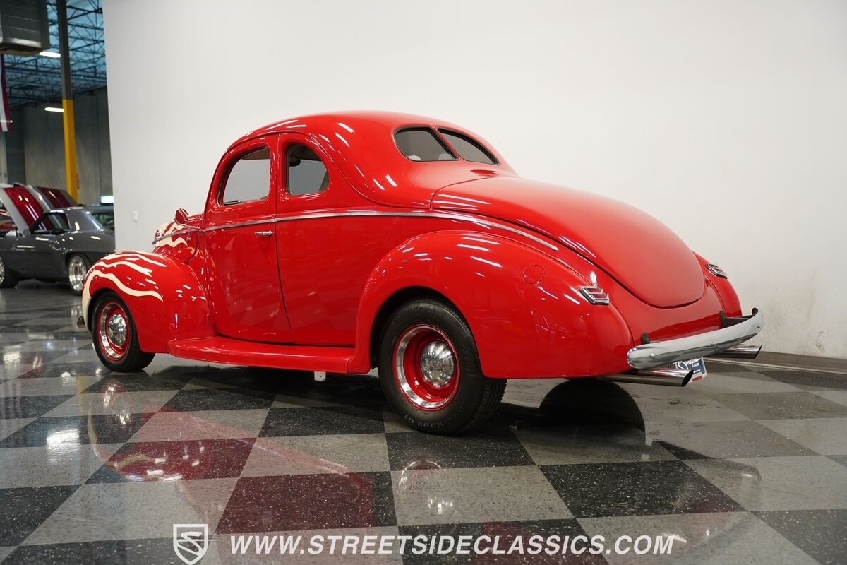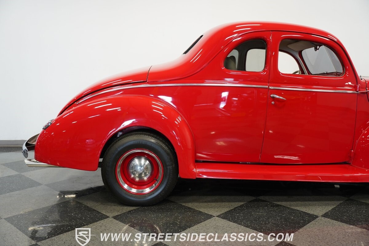 This 1940 Ford Coupe Streetrod is a blast from the past with a whole lot of attitude. That red paint gleams, with white flames dancing across the hood for an extra shot of excitement. It rolls on 15-inch red steel wheels with gleaming chrome caps, wrapped in classic 195/60R15 tires up front and wider 225/70R15s in the rear. This is an all-steel beauty, with smooth lines from the fenders all the way down the running boards. Chrome bumpers, dual mirrors, and those snazzy tri-bar headlights add just the right amount of shine. With power rack and pinion steering and a V-butt windshield, it's got classic hot rod looks with a touch of modern handling.