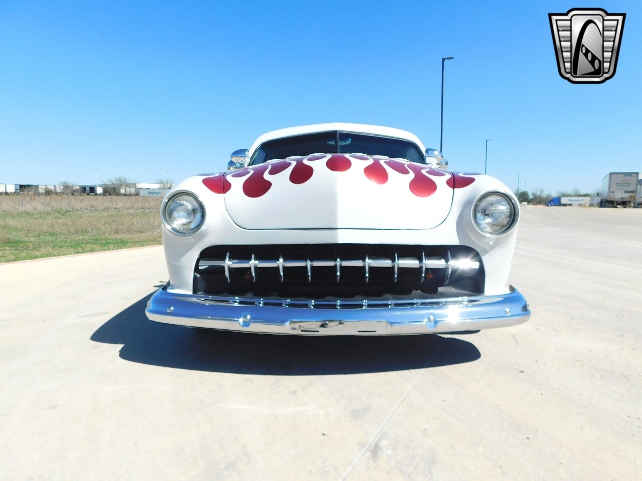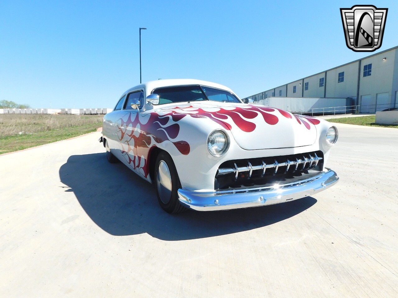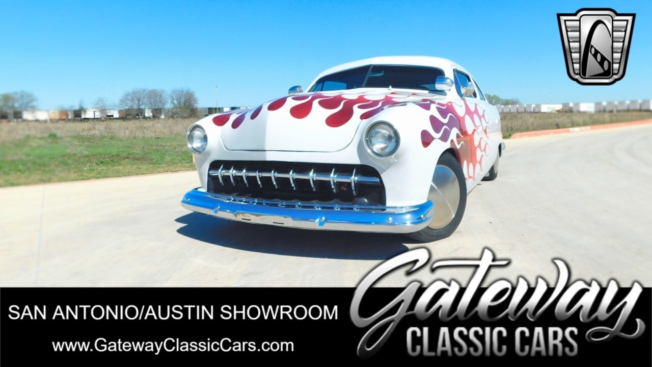 Gateway Classic Cars of San Antonio/Austin is excited to offer this highly custom & highly cool 1951 Ford Coupe! "Chopped, Dropped, Louvered, Frenched & Flamed" are just a few of the terms that come to mind when we start to try to describe this '51 Ford. Powered by a 327 CID V8 topped off with an Edelbrock aluminum intake & a "3 Dueces" Rochester carb set up with a Holley electric fuel pump, headers & a Lone Star beer can coil, this old school cruiser is ready to hit the road! A set of velour covered low back bucket seats set behind the classic Ford 2 spoke steering wheel & the gears are handled with the B&M ratchet shifter. The rubber is Uniroyal and you just can't miss the MoonEyes wheel covers! This is the epitome of what old school hot rodding has always been about..