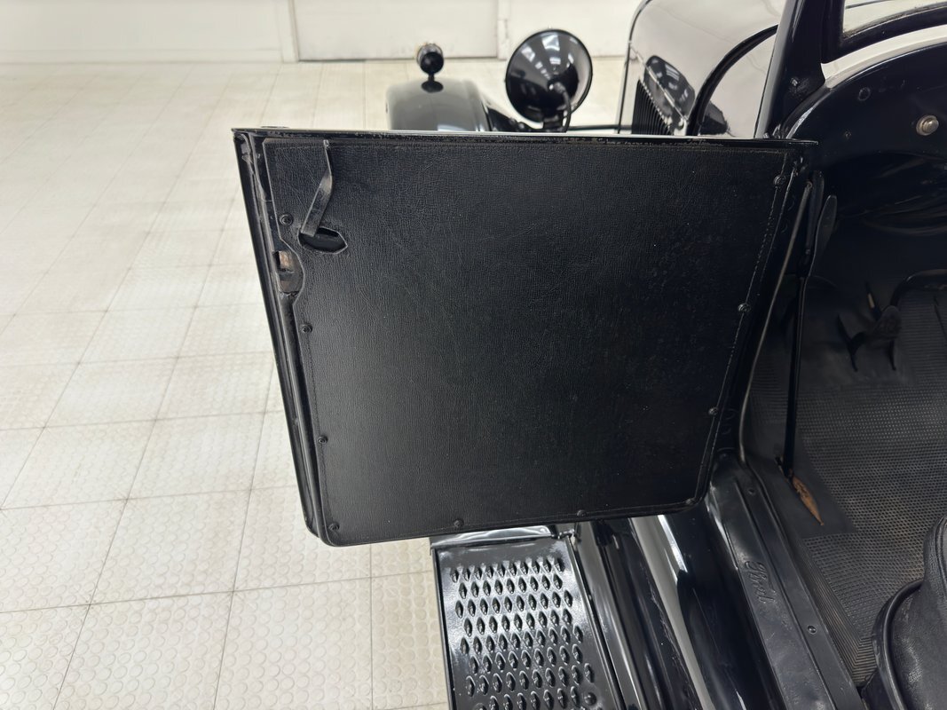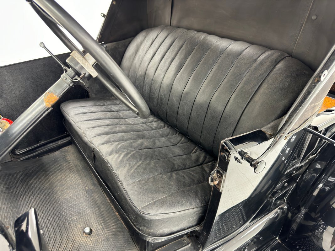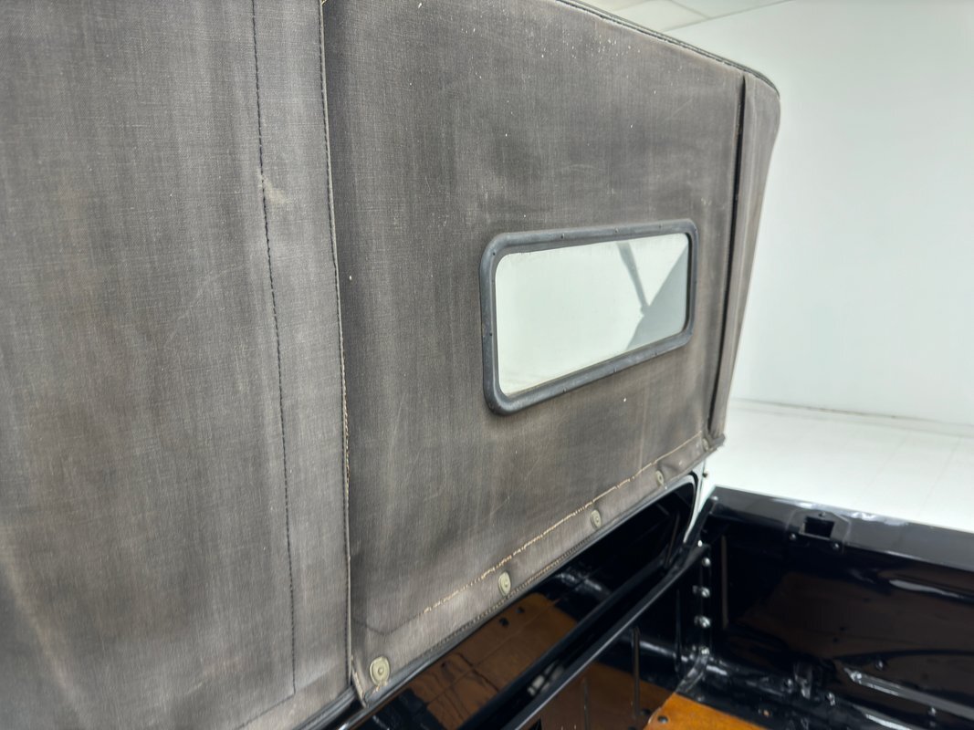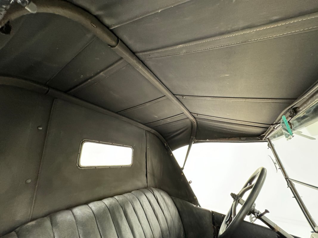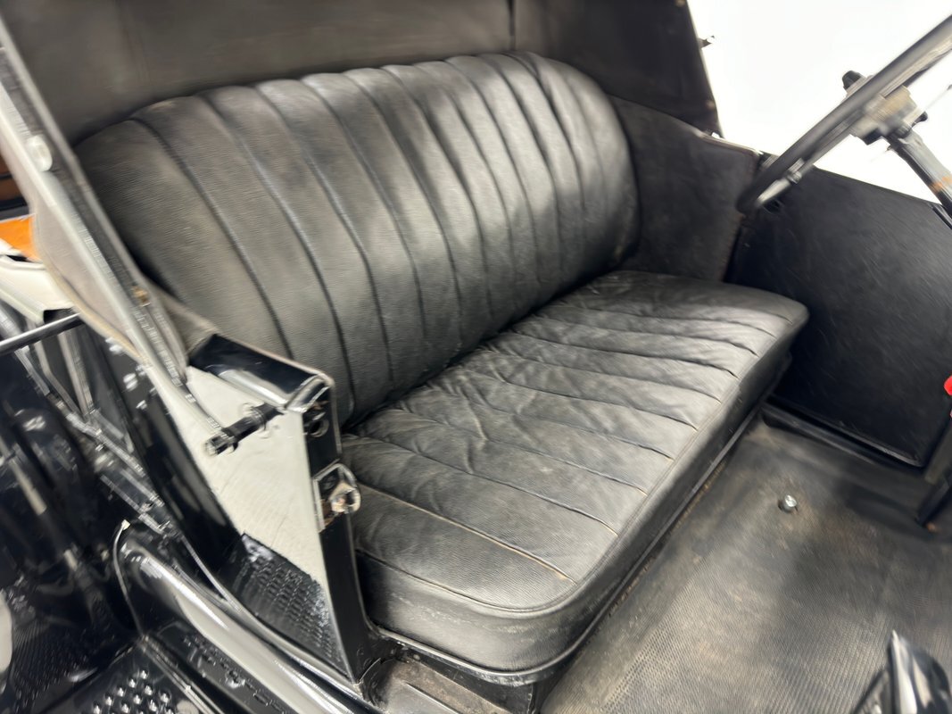 Model T's are the epitome of no frills interiors which start with flat vinyl door panels, both in very good condition, leading to a simple padded bench seat with vertical pleats, showing some compression but otherwise in great shape. The steering wheel features four spokes, convex in their position to the rim, and the narrow steering column with aged hardware, leads to a simple black dash, steel of course, with two simple gauges and knobs. A texture Ford branded rubberized mat covers the floor and the underside of the canvas top presents in nice shape.
