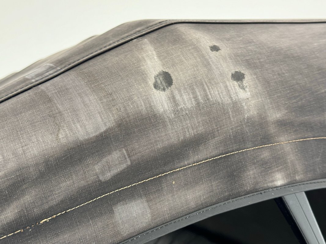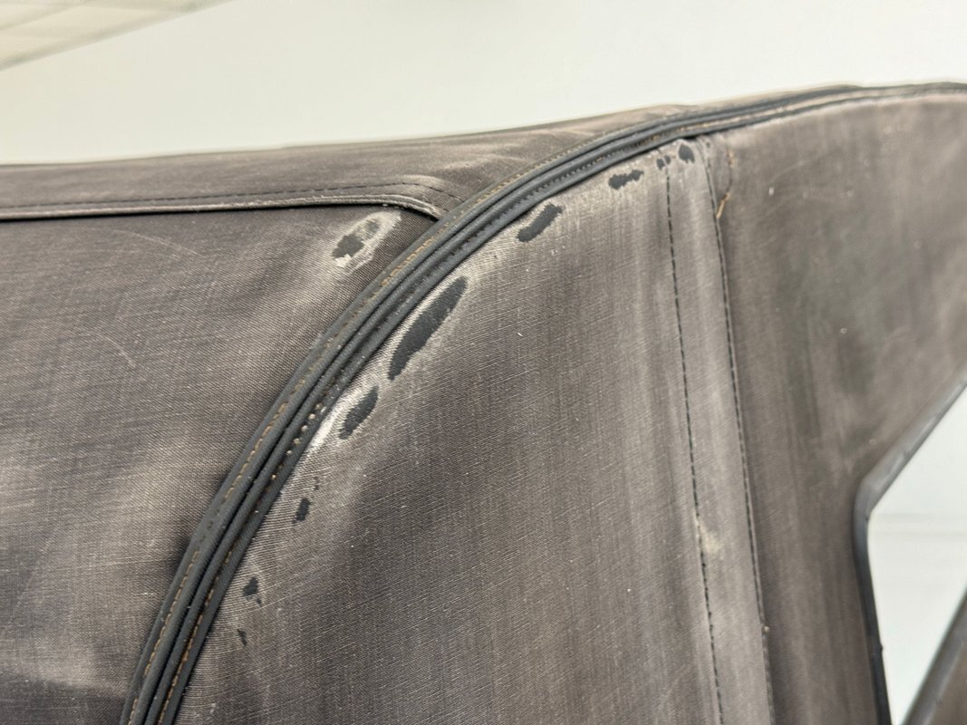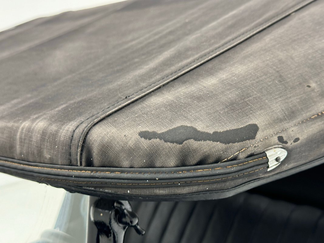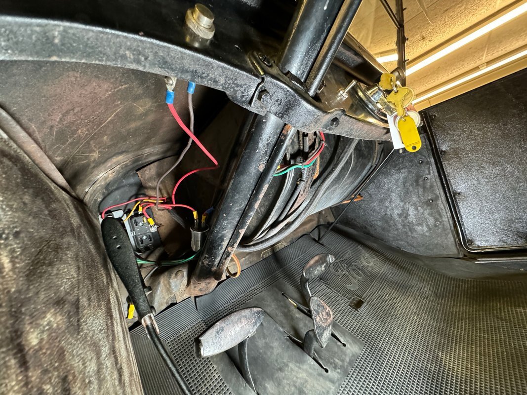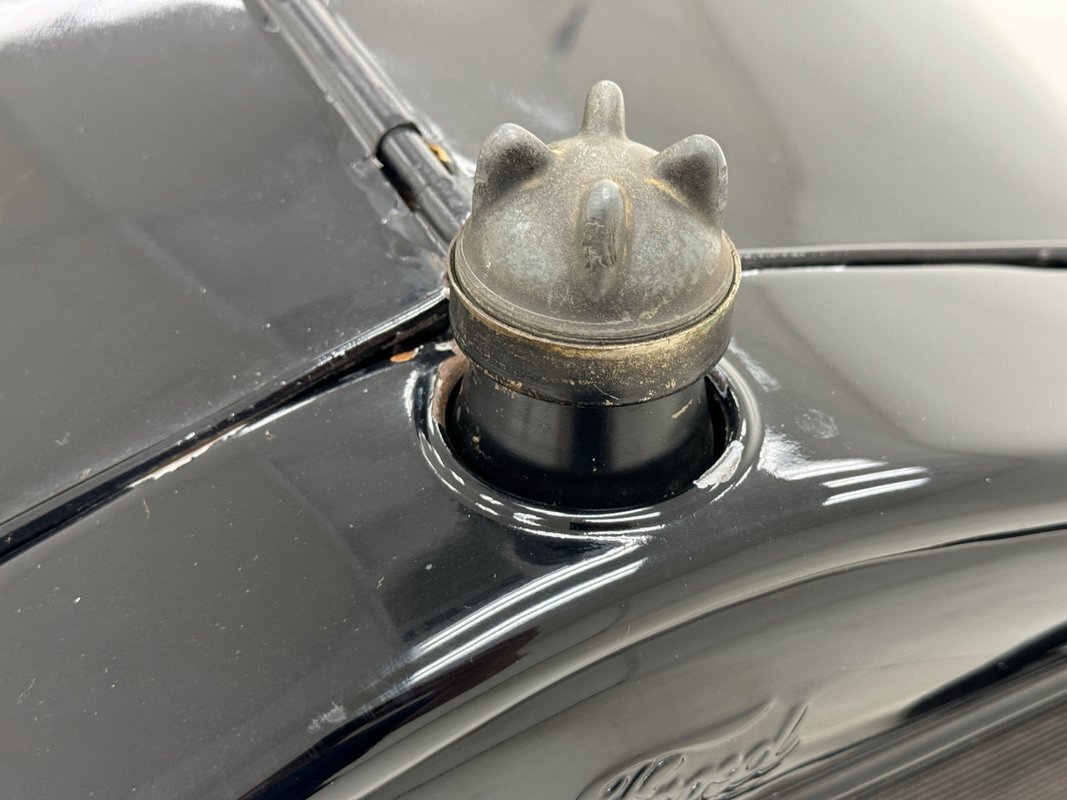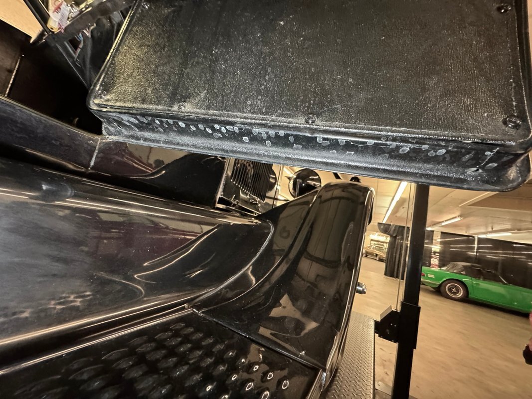 Model T's are the epitome of no frills interiors which start with flat vinyl door panels, both in very good condition, leading to a simple padded bench seat with vertical pleats, showing some compression but otherwise in great shape. The steering wheel features four spokes, convex in their position to the rim, and the narrow steering column with aged hardware, leads to a simple black dash, steel of course, with two simple gauges and knobs. A texture Ford branded rubberized mat covers the floor and the underside of the canvas top presents in nice shape.