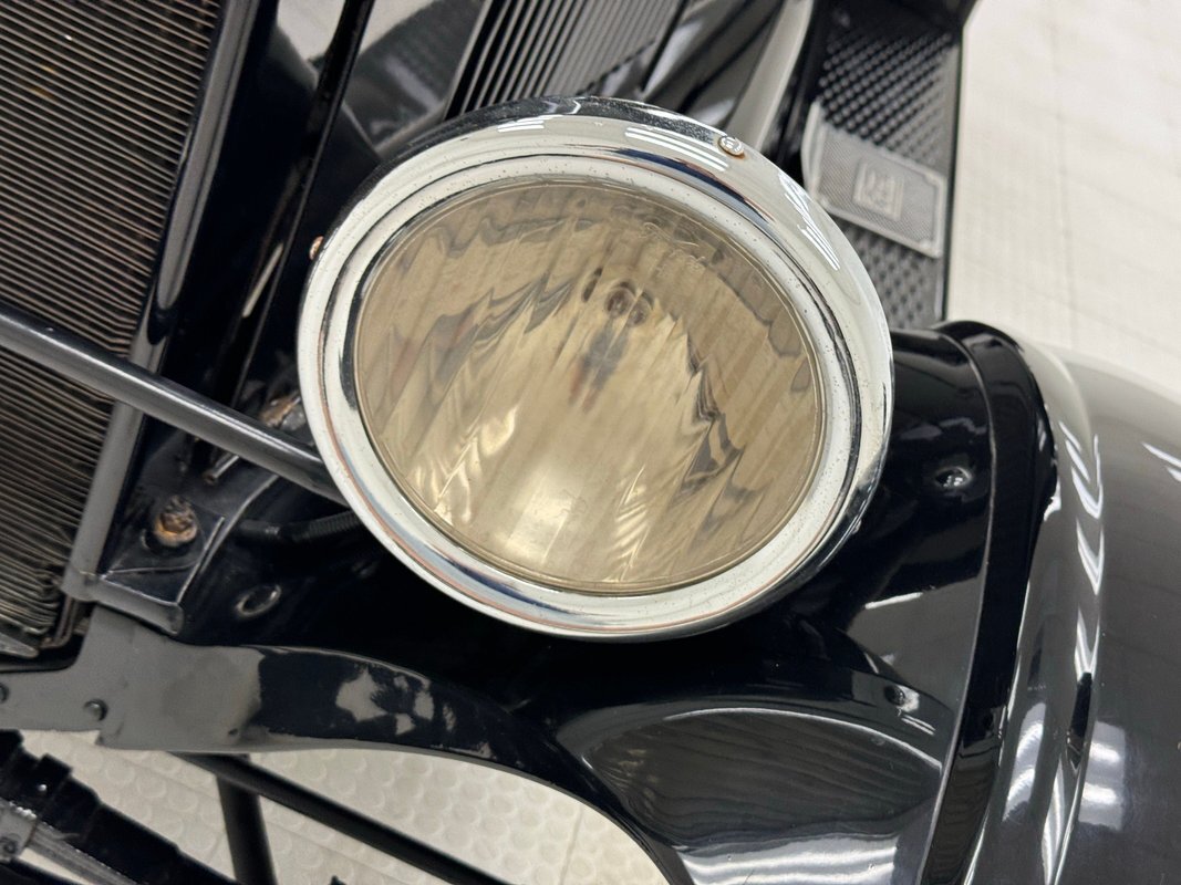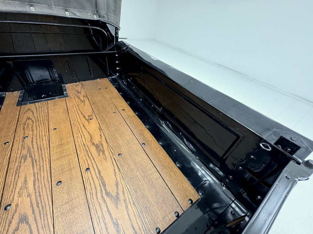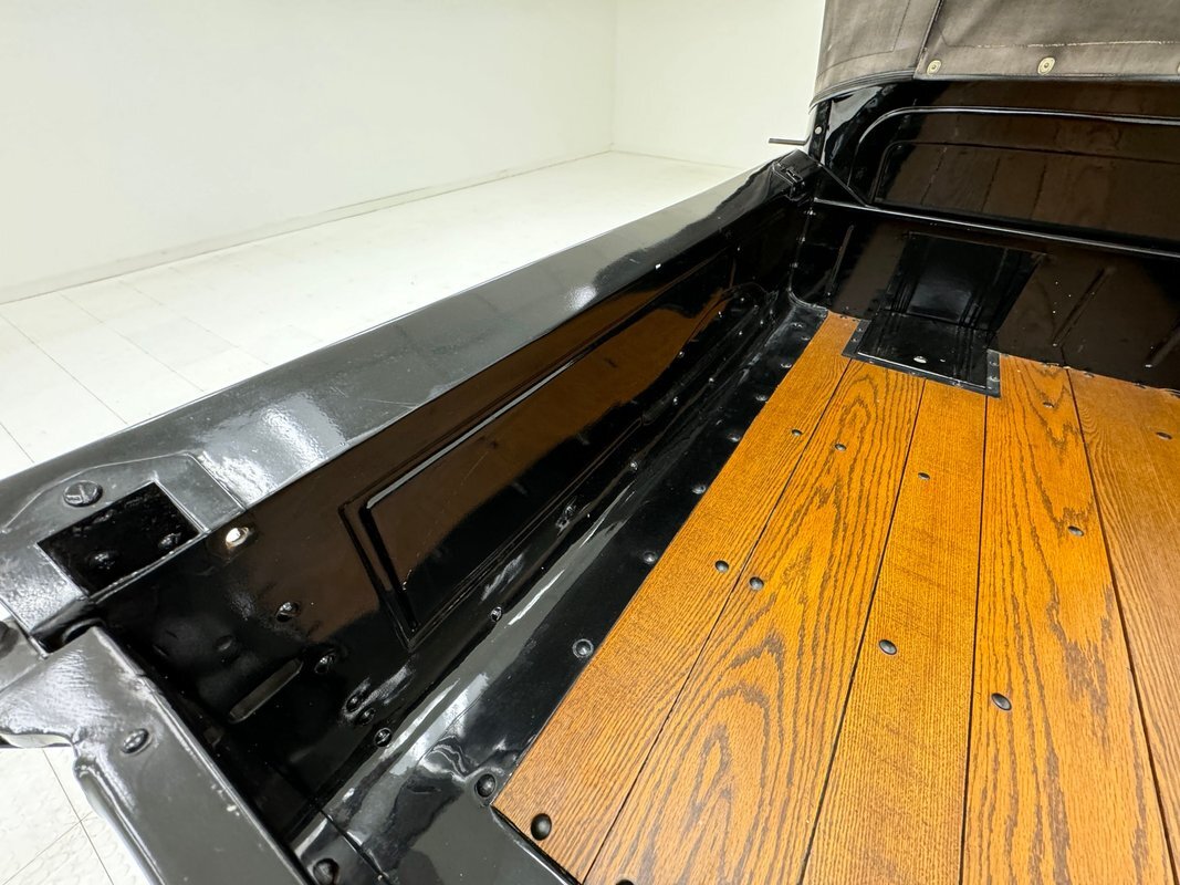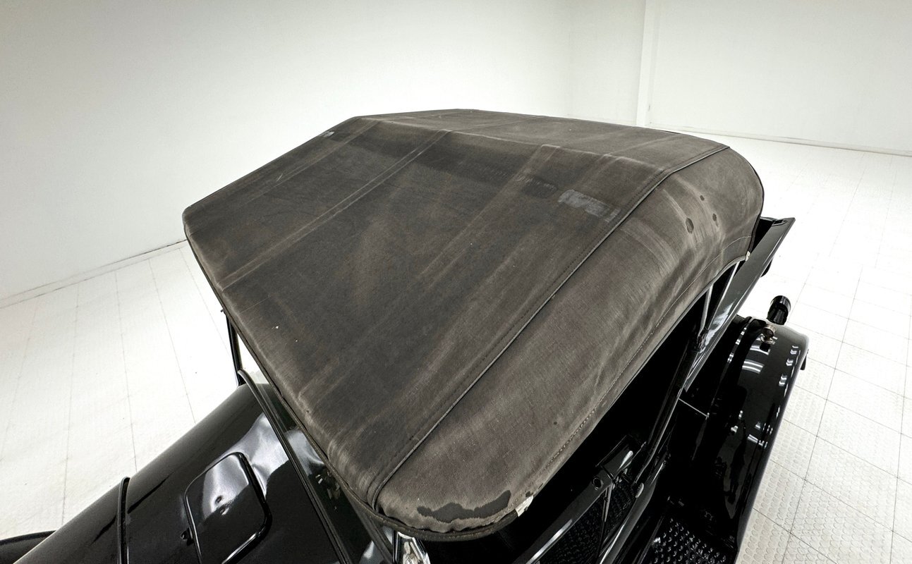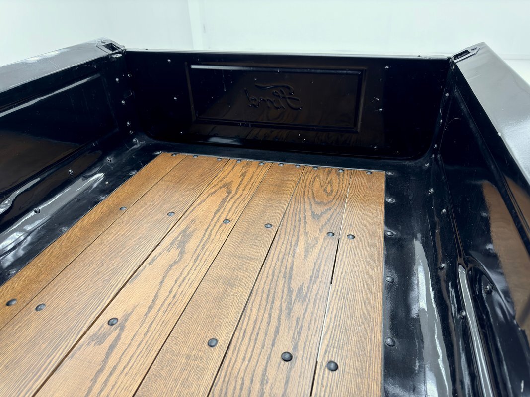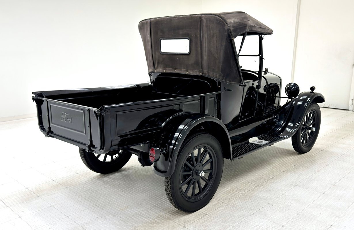 In mid 1926, closed cars were available in 3 colors from Ford for the first time. Open cars were all black until late in 1926 when Gunmetal Blue and Phoenix Brown replaced black, (deep knowledge can be found at ). Our car is all black and that includes the radiator shell, light housings, 21-inch wooden spoke wheels, window frame, and bed walls. The wood planks inside the bed are in fantastic shape and their black stained grain is the perfect complement to the car's exterior. The black canvas roof shows some again with fading but is in otherwise good condition and houses a glass rear window. Bright metal is found on the light trim rings, a side mirror and the step plates on the running boards. The paint and body are in great shape and no major imperfections were noted.