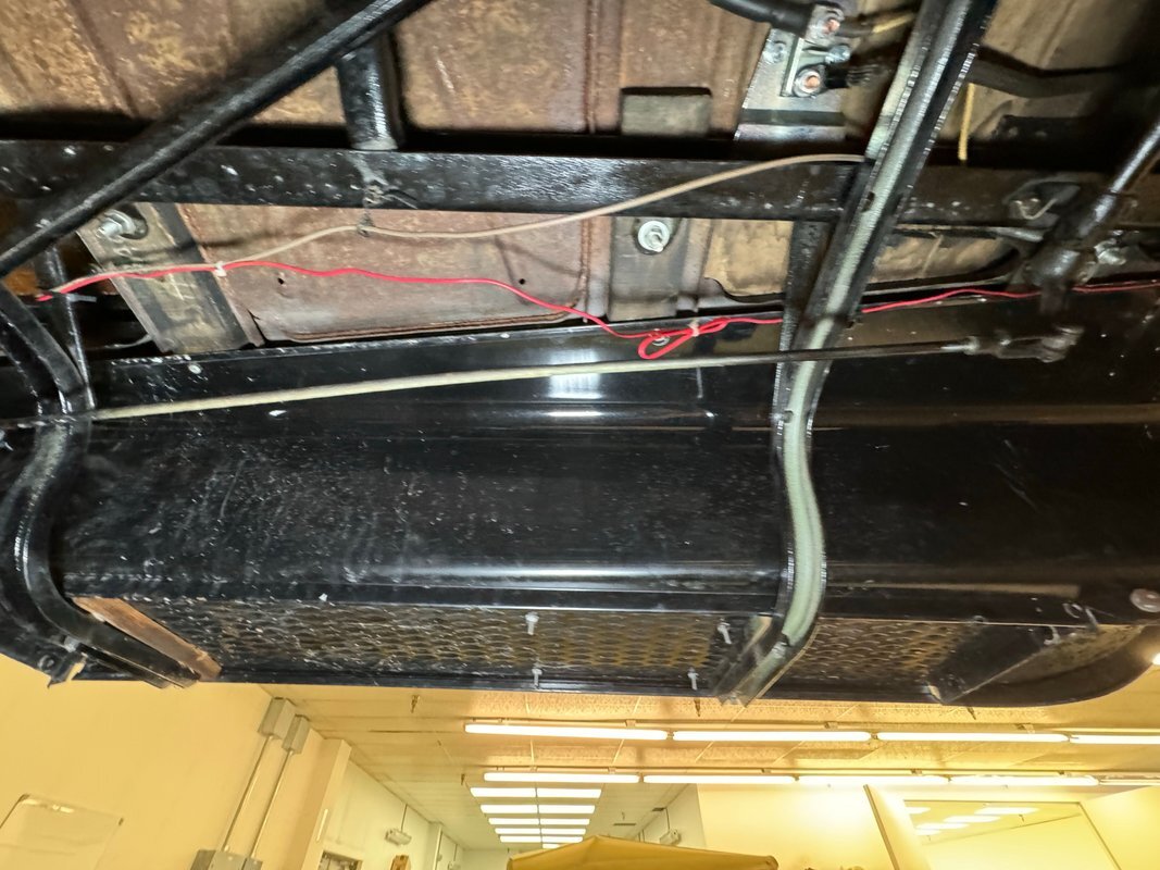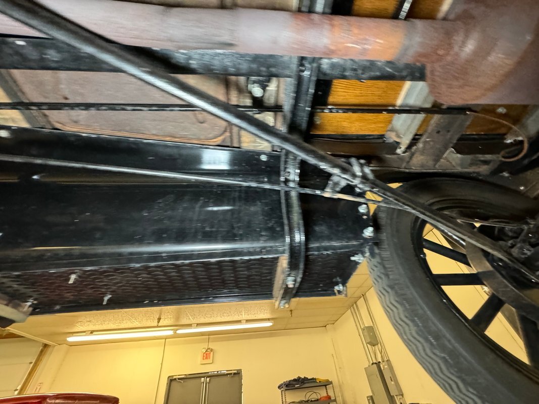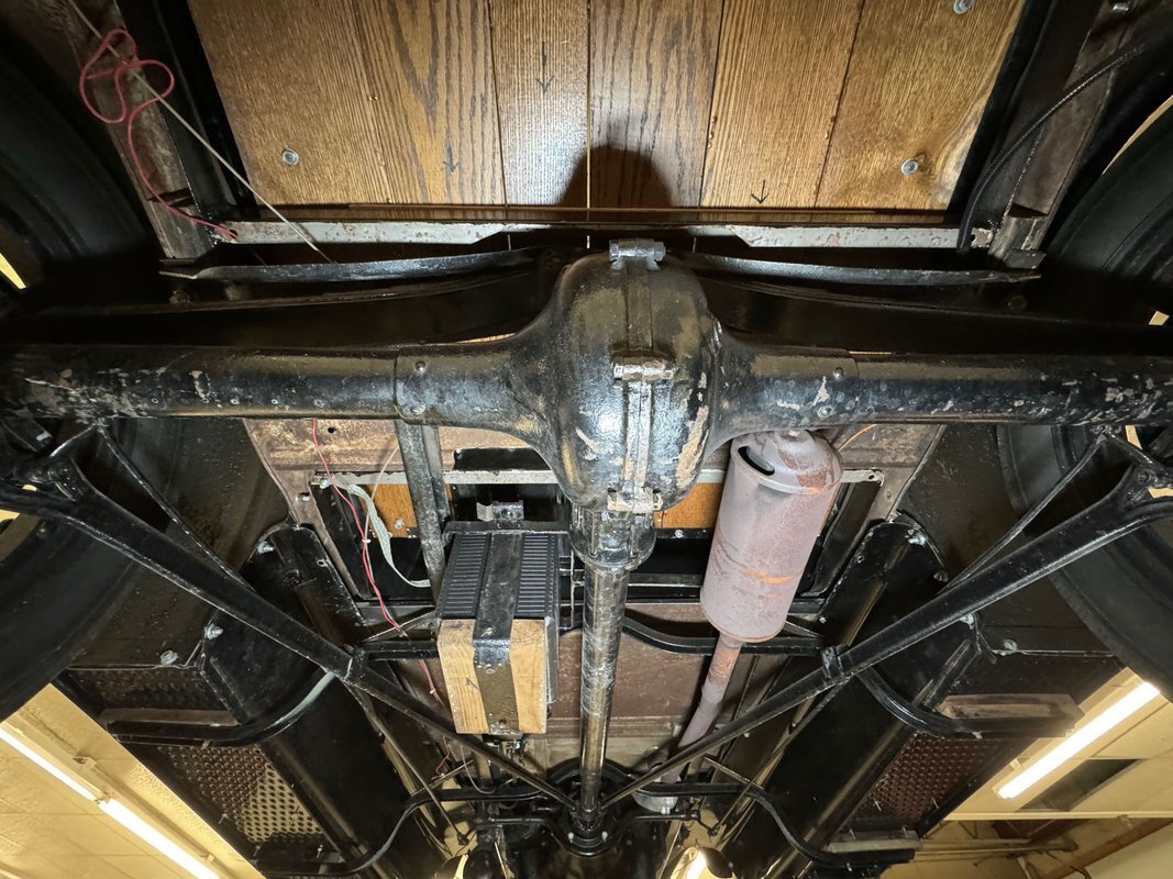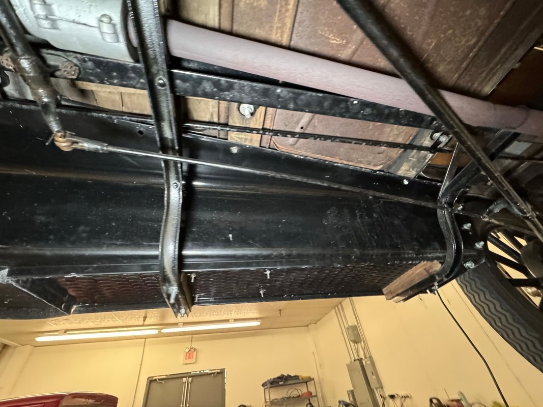 We first note the underside of the wood bed planks which is almost as nice as the top side. Beyond that, surface rust makes a few appearances on this very clean underside which consists mostly of black painted components. A single exhaust terminates at a stock style muffler that has an outlet and is located under the bed. Transverse leaf springs occupy the front and back for suspension.