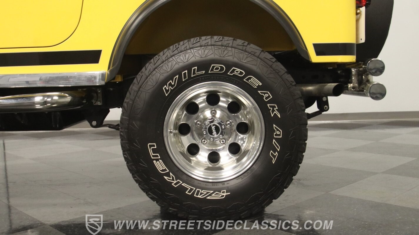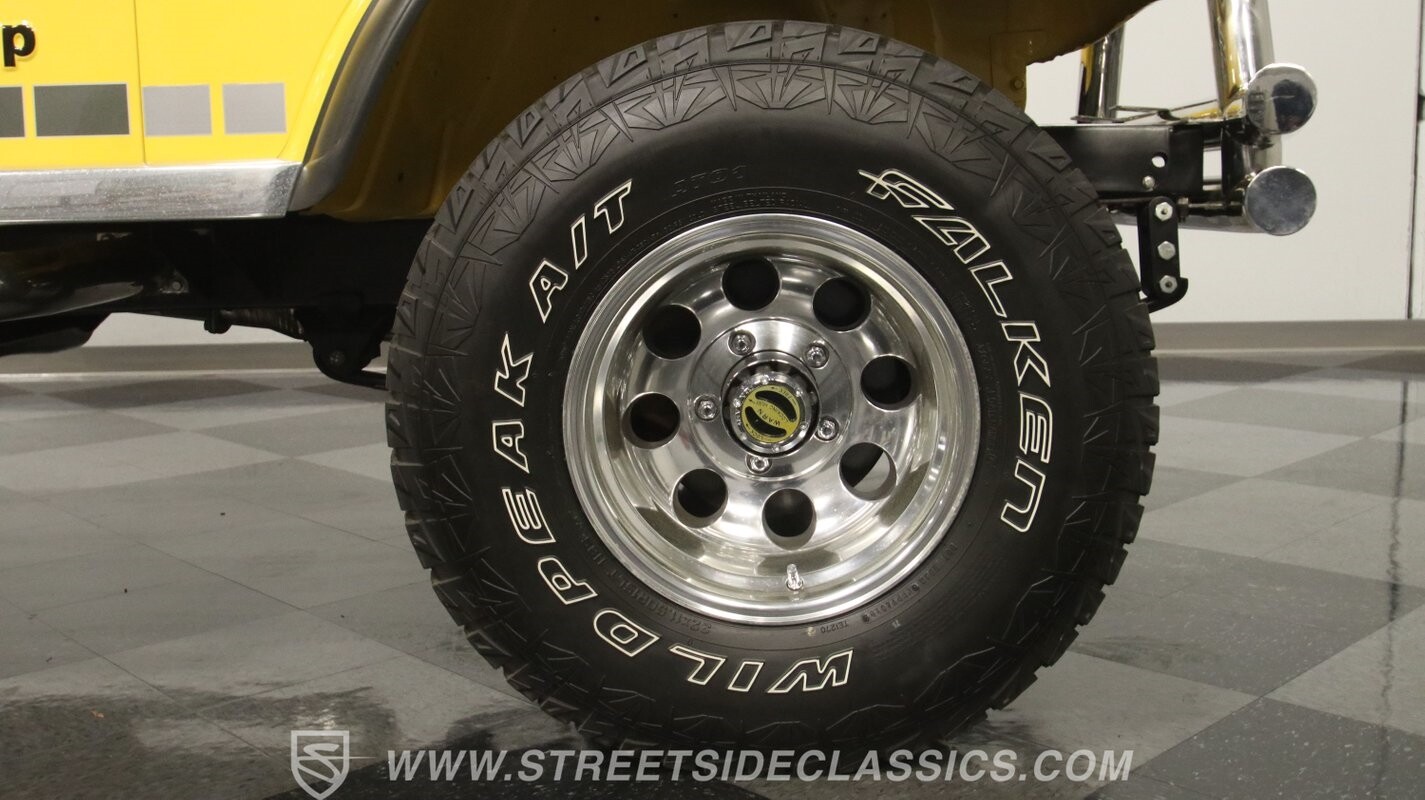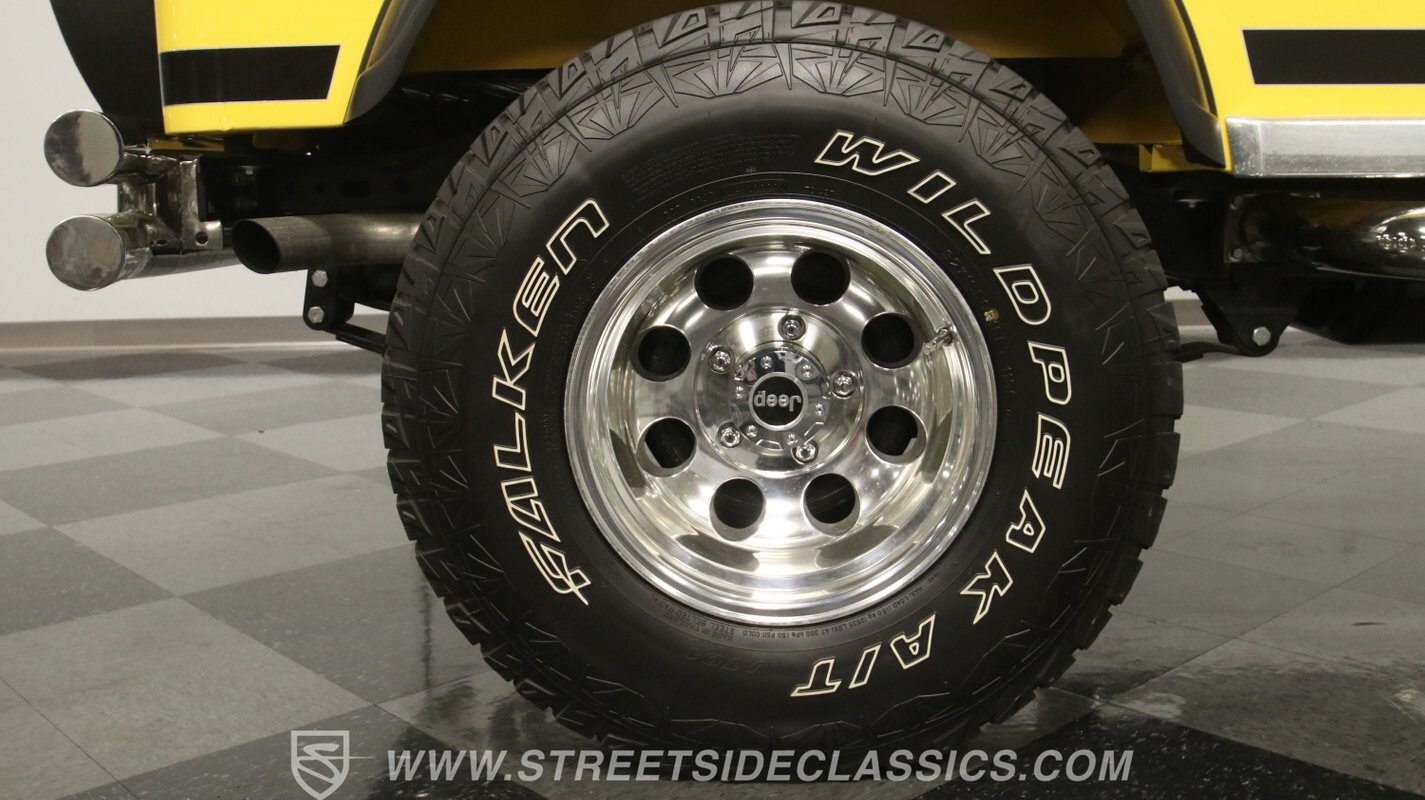 The 304 cubic-inch AMC motor is an ideal powerplant that combines Jeep-level robustness with V8 muscle. It has a particularly clean and tidy style we don't see on all Jeeps... and the same goes for the undercarriage. So it gives this one a well-respected and cared-for impression. Plus, there are the right extras, like an Optima battery and headers feeding the dual exhaust. As a proper off-roader, you have a two-speed 4x4 transfer case. And that ability is enhanced with Rough Country shocks, a suspension stabilizer, and meaty Falken Wild Peak tires. And when it's time to just enjoy an in-town trip, this has the right anytime driving features, like the power steering, power brakes, front discs, and the rarely-seen three-speed automatic transmission.