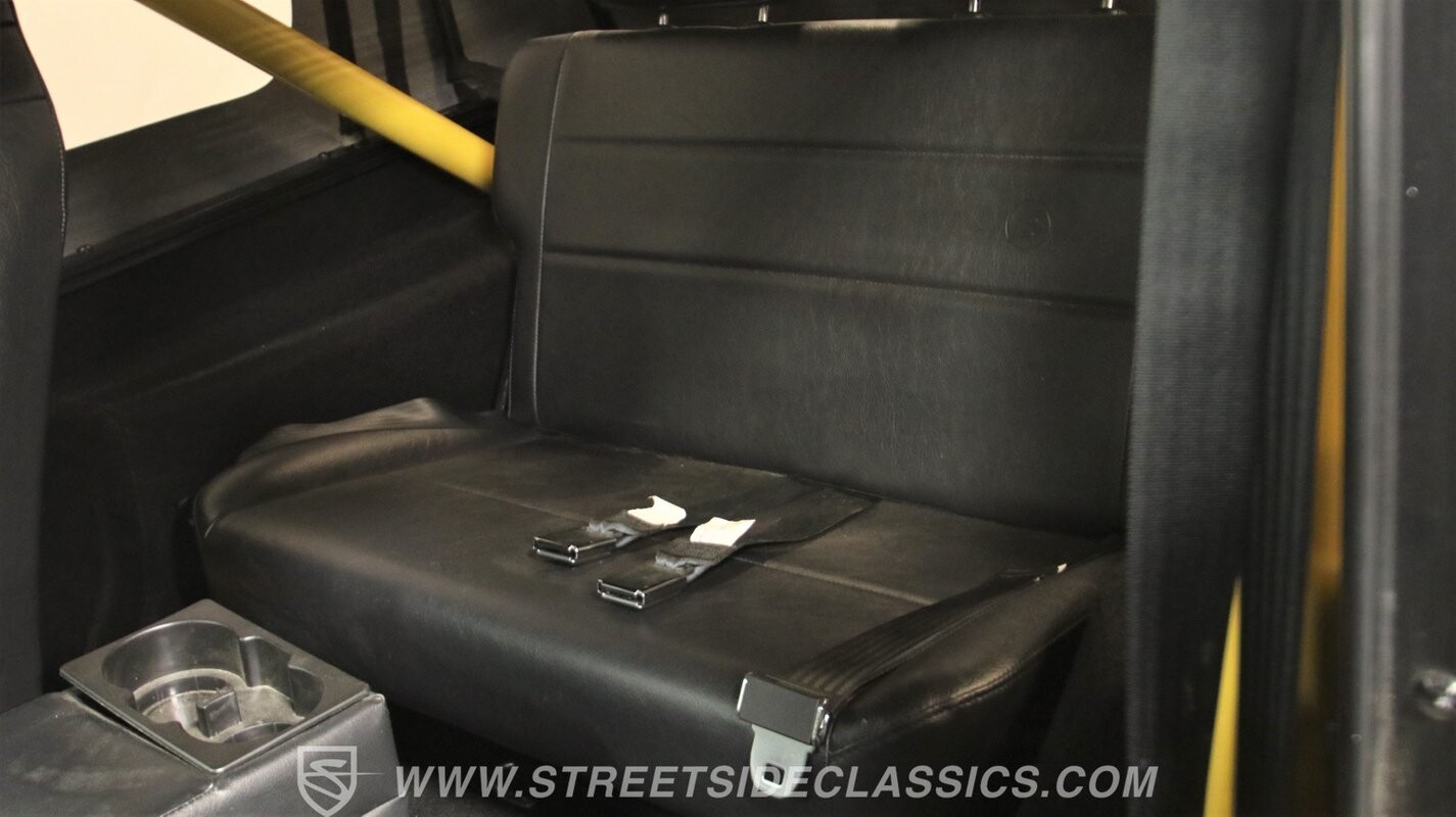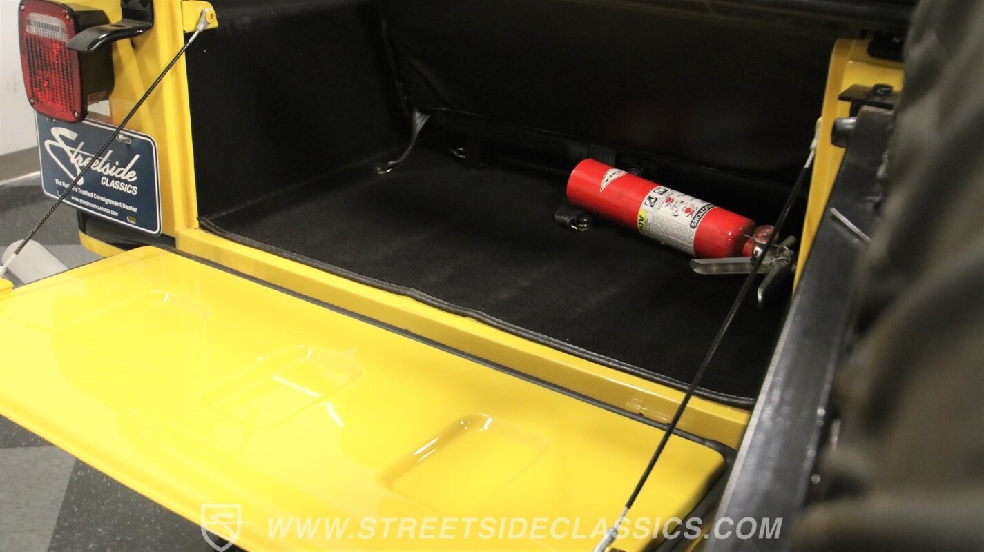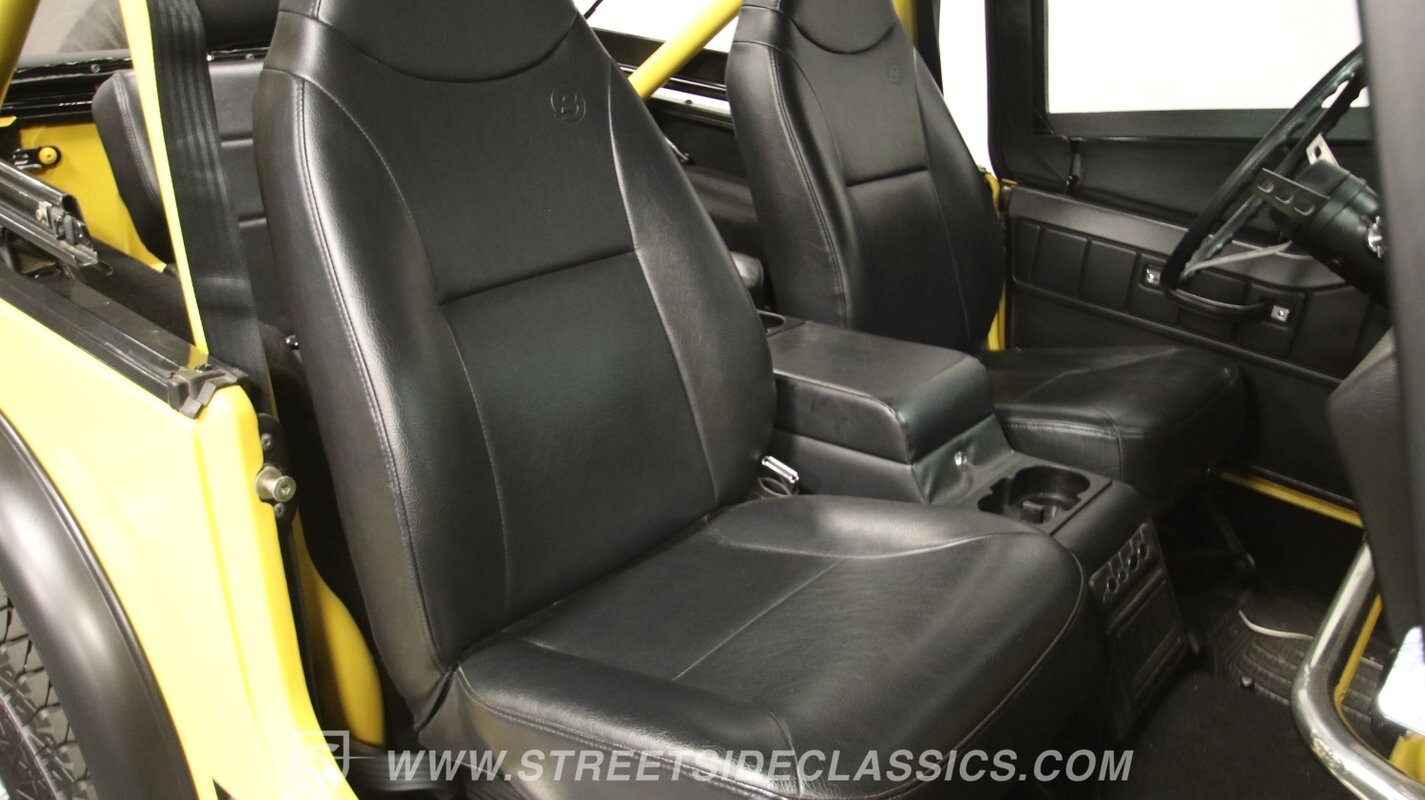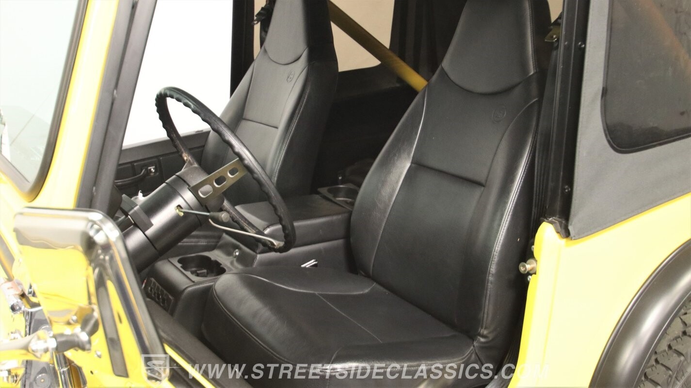 The full black interior looks great against the exterior, too. And the carpeting, door panels, and dash have a pristine dark look of quality that you'll love showing off. You can really tell there was a solid investment in keeping this one comfy. That means updated Bestop bucket seats, an armrest center console, cup holders, and an AM/FM stereo with Bluetooth and USB. This even R134a air conditioning... oh yes, you have an A/C Jeep for those summer days when you're open to the world!