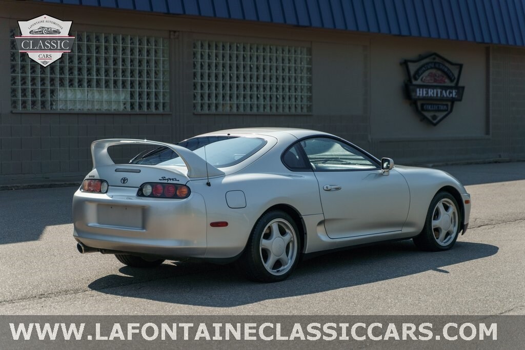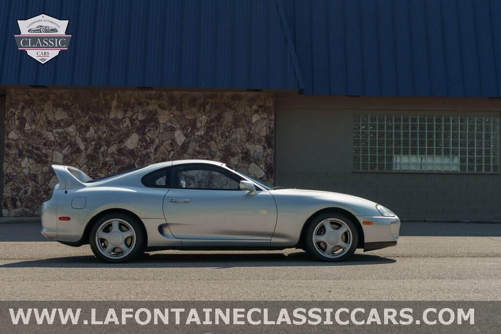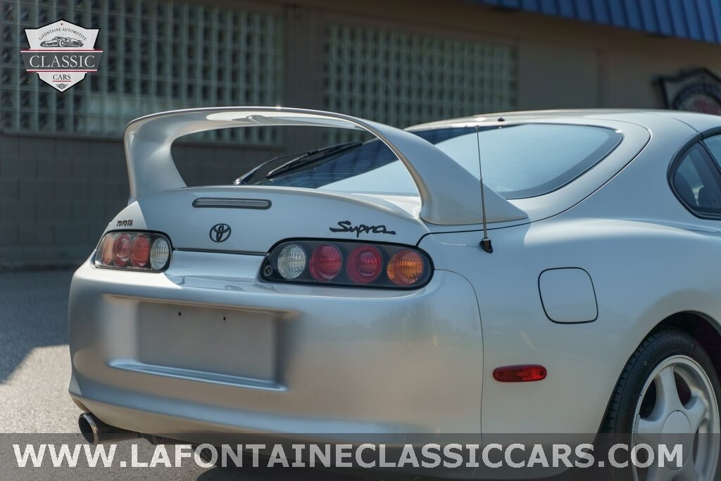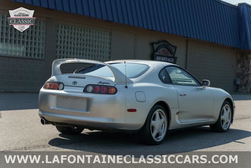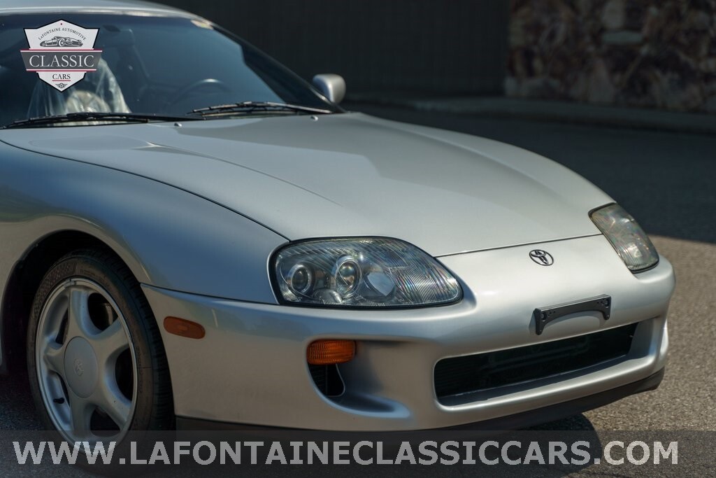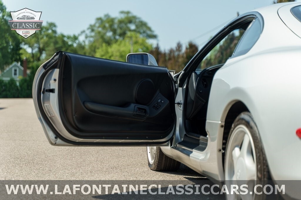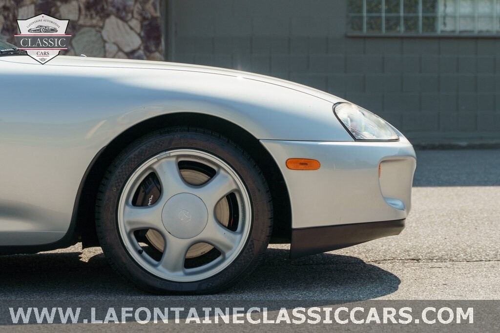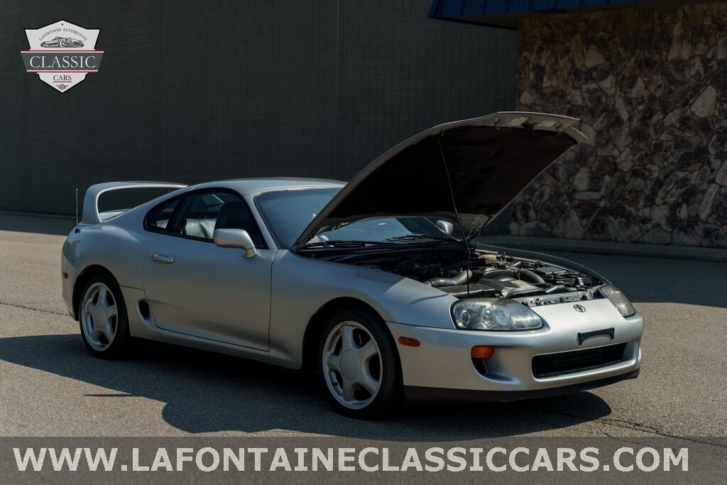 This 1994 Toyota Supra Turbo is powered by a twin-turbocharged 3.0L inline-six paired with a four-speed automatic transmission, and it is finished in Alpine Silver Metallic over black leather. Features include a limited-slip differential, a rear wing, a removable roof panel, heated side mirrors, automatic climate control, and a factory CD/cassette stereo system.