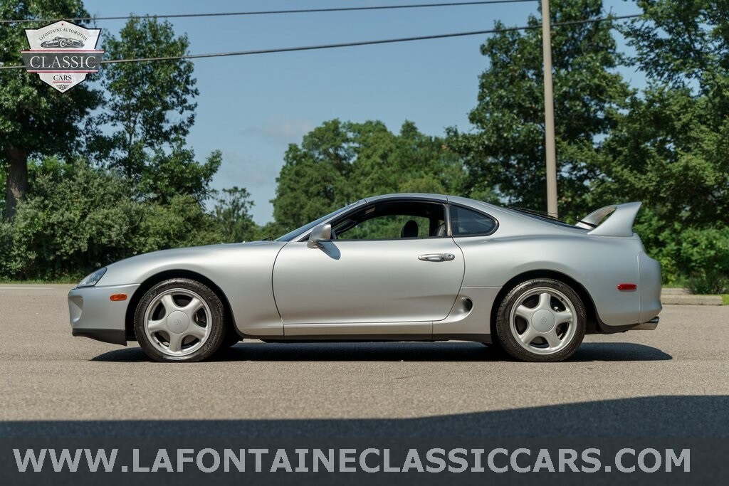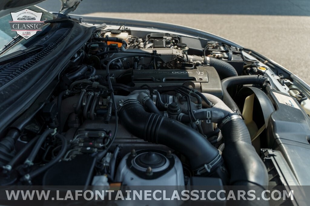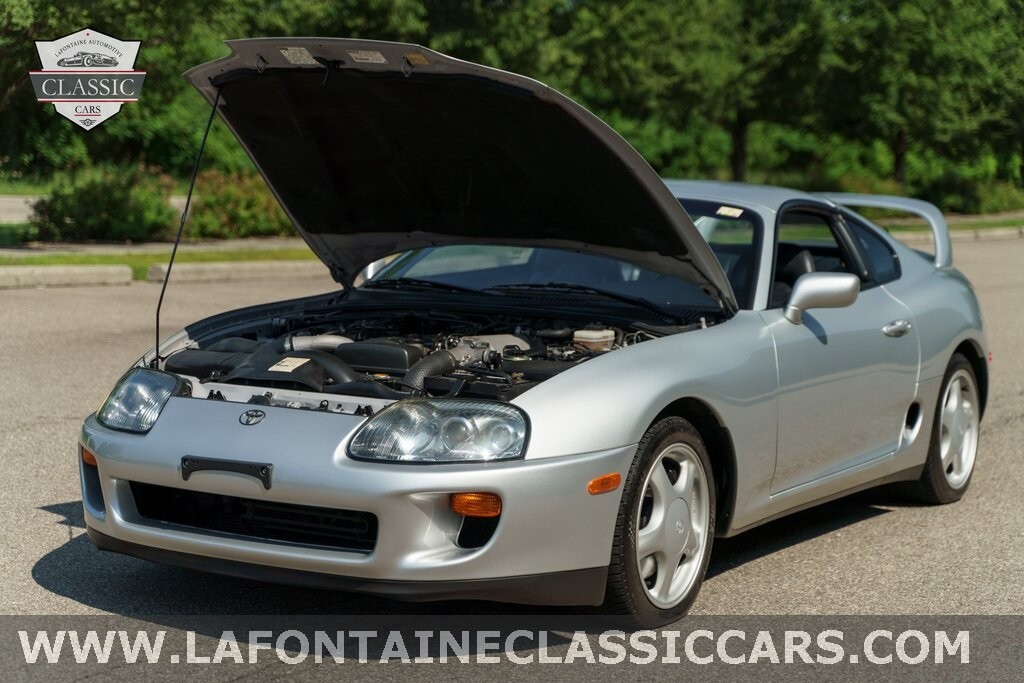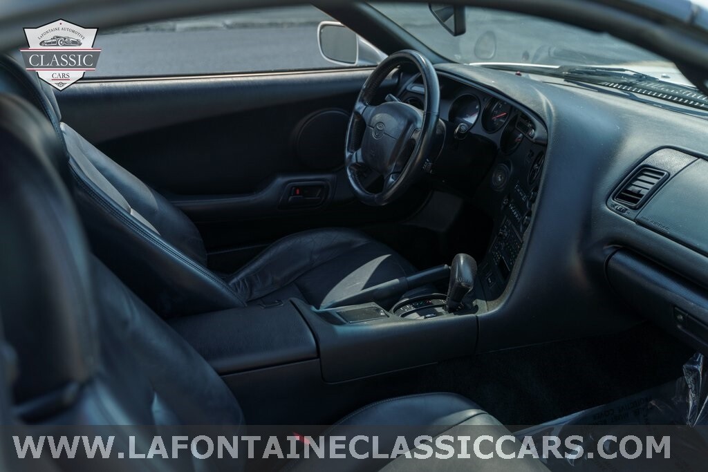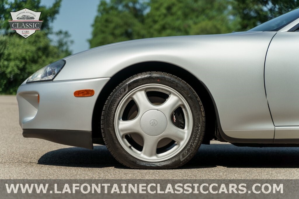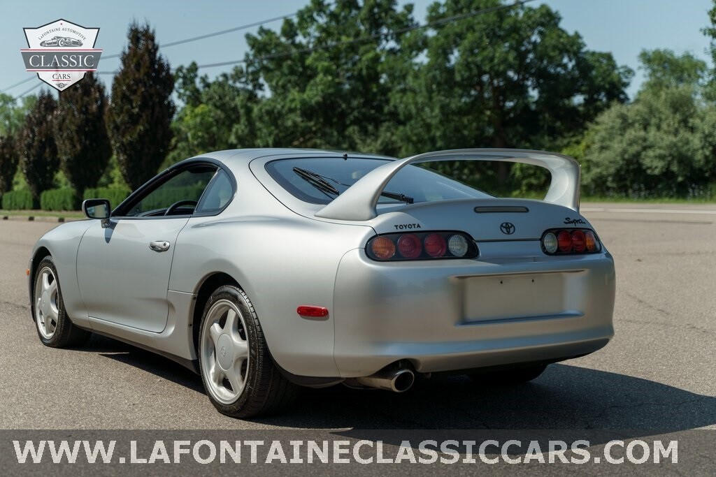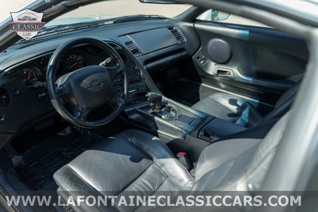 This 1994 Toyota Supra Turbo is powered by a twin-turbocharged 3.0L inline-six paired with a four-speed automatic transmission, and it is finished in Alpine Silver Metallic over black leather. Features include a limited-slip differential, a rear wing, a removable roof panel, heated side mirrors, automatic climate control, and a factory CD/cassette stereo system.