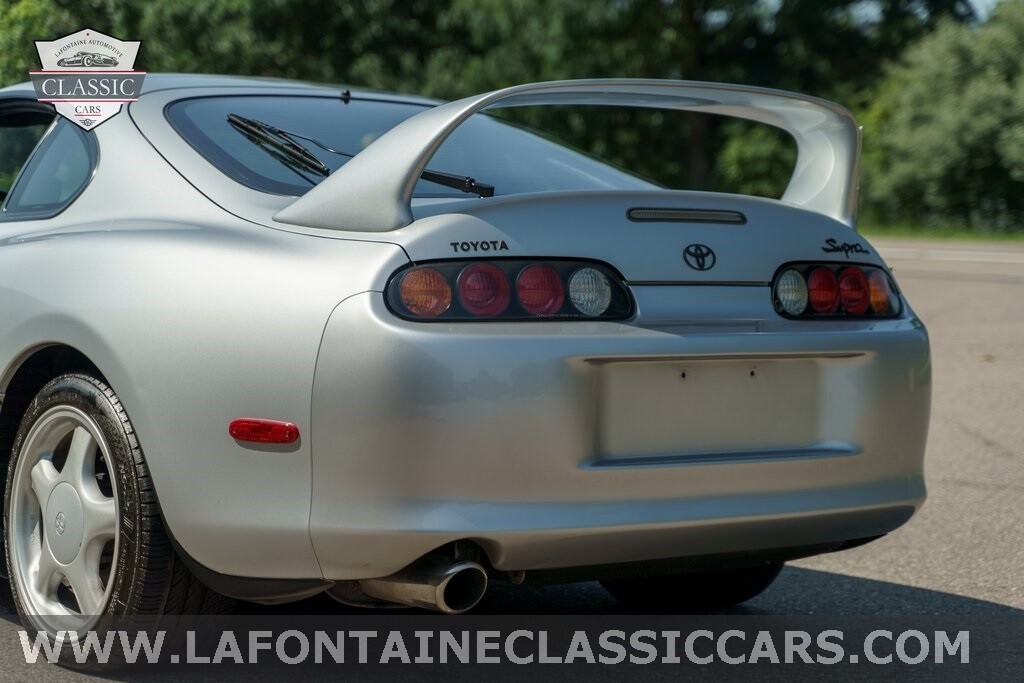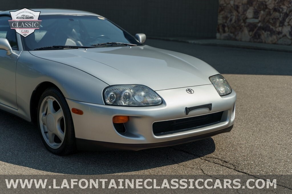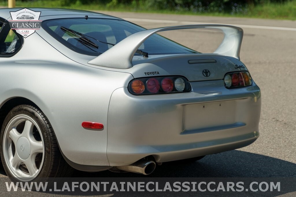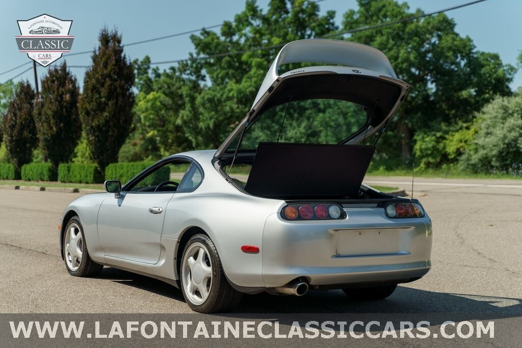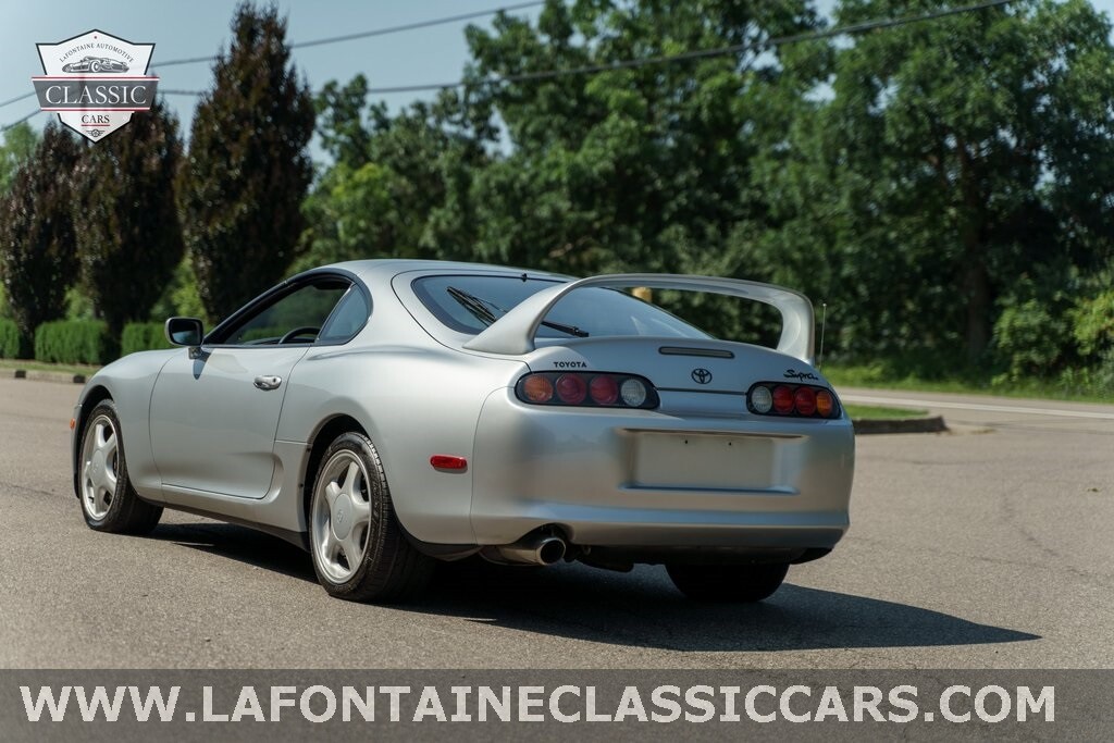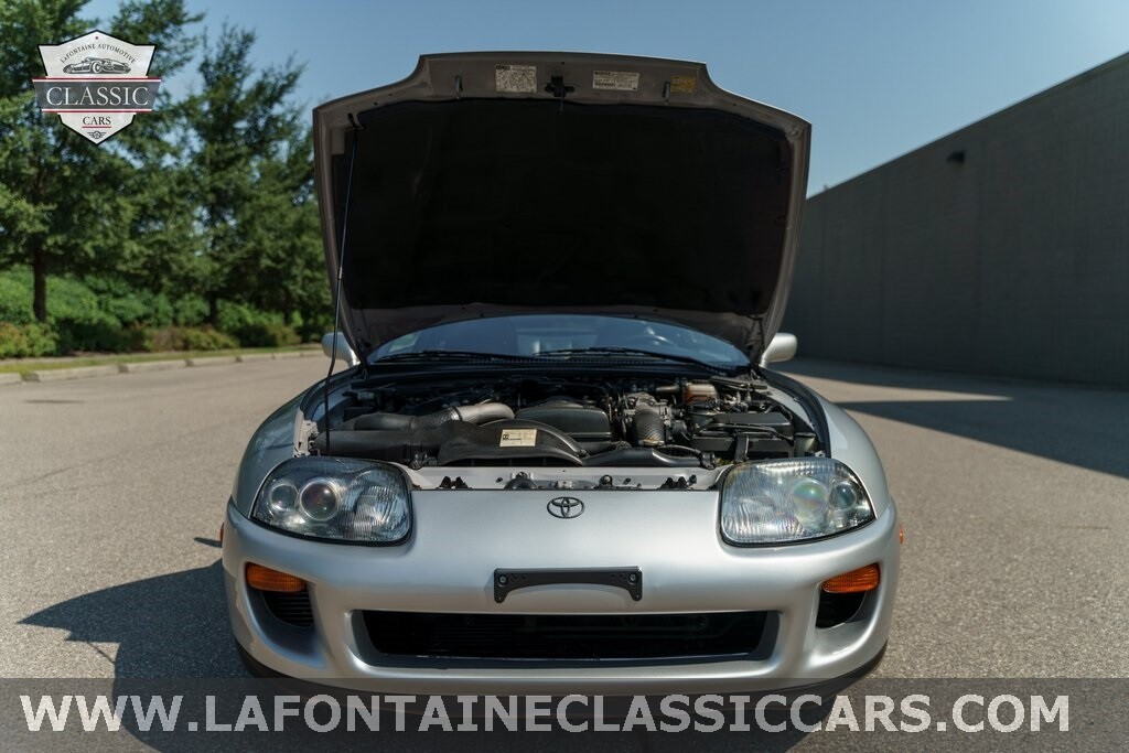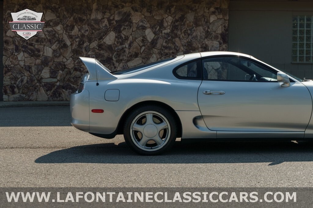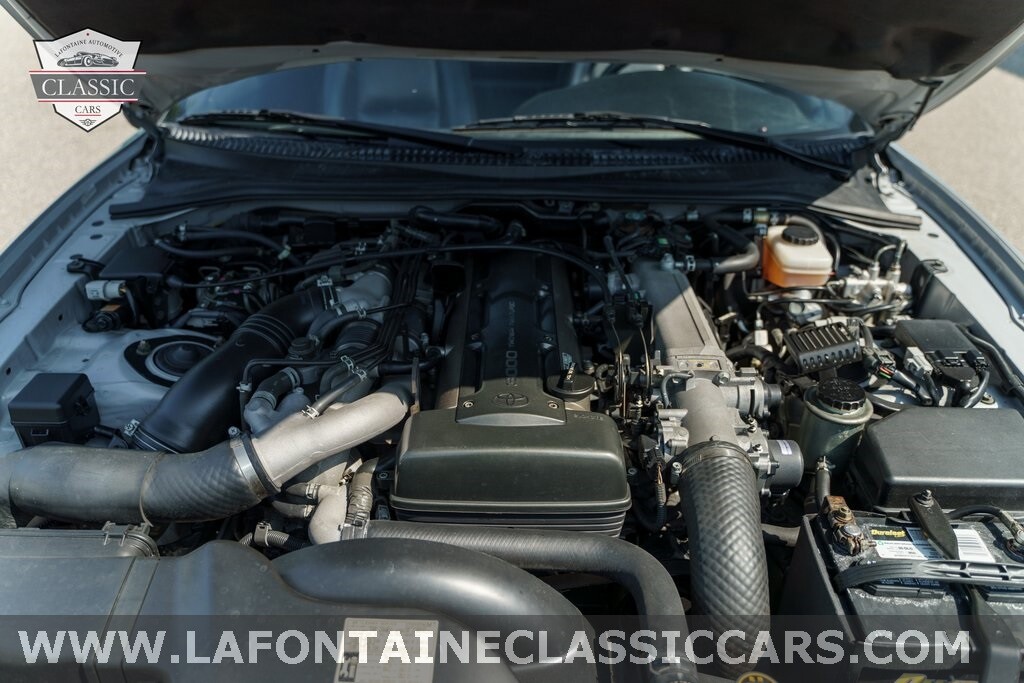This 1994 Toyota Supra Turbo is powered by a twin-turbocharged 3.0L inline-six paired with a four-speed automatic transmission, and it is finished in Alpine Silver Metallic over black leather. Features include a limited-slip differential, a rear wing, a removable roof panel, heated side mirrors, automatic climate control, and a factory CD/cassette stereo system.