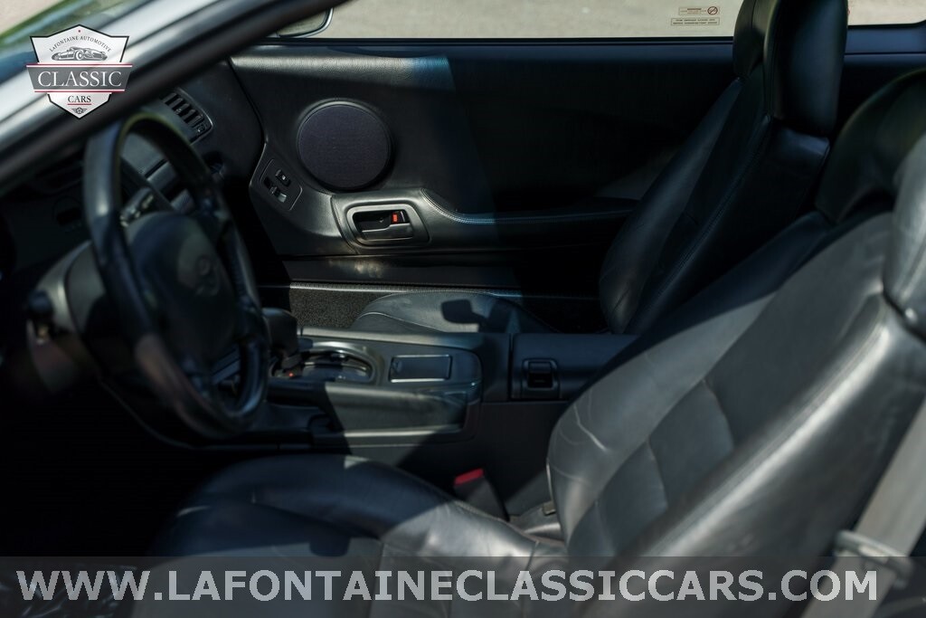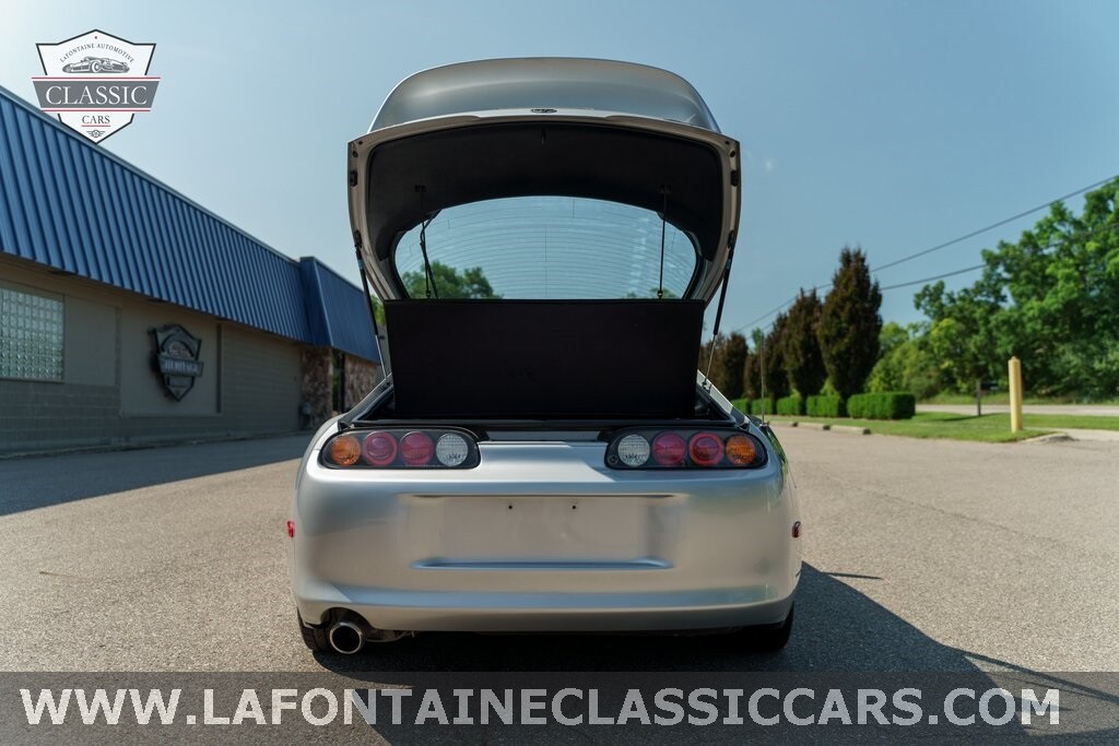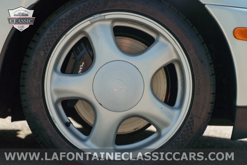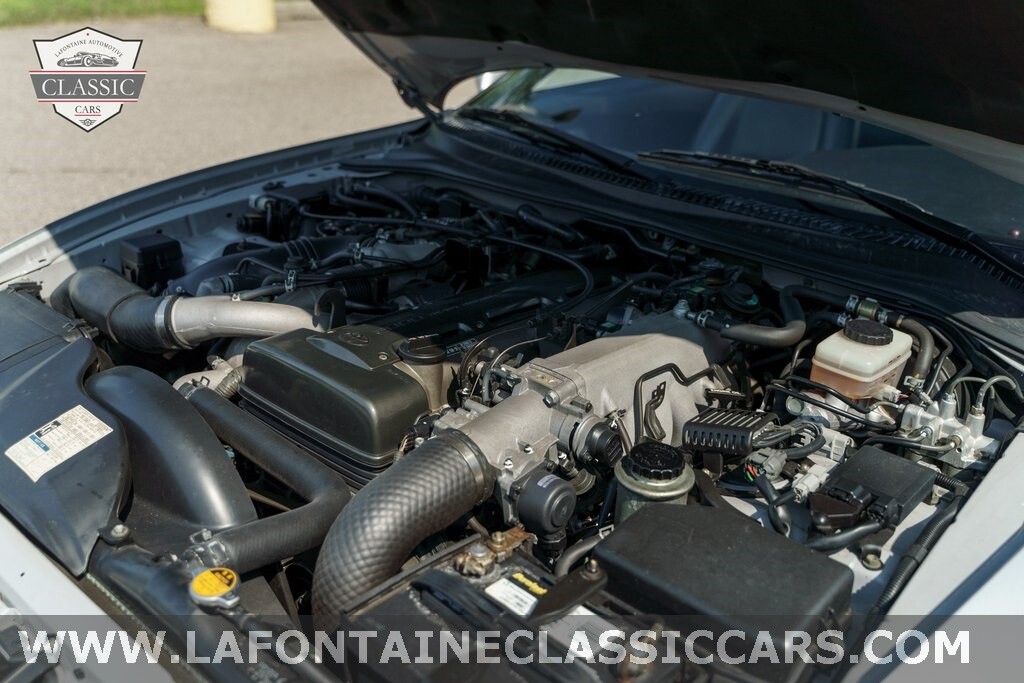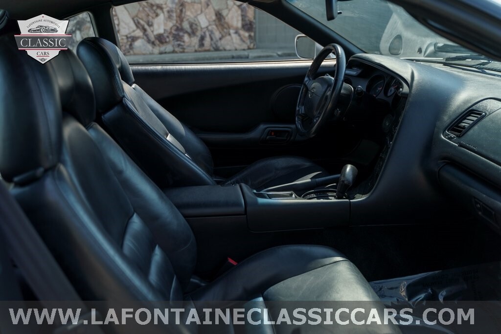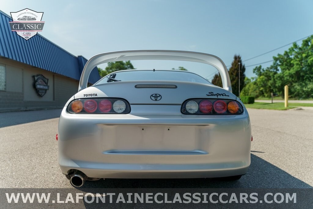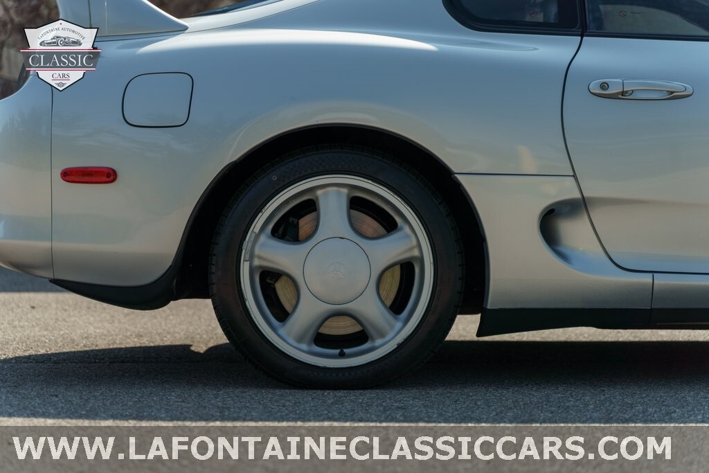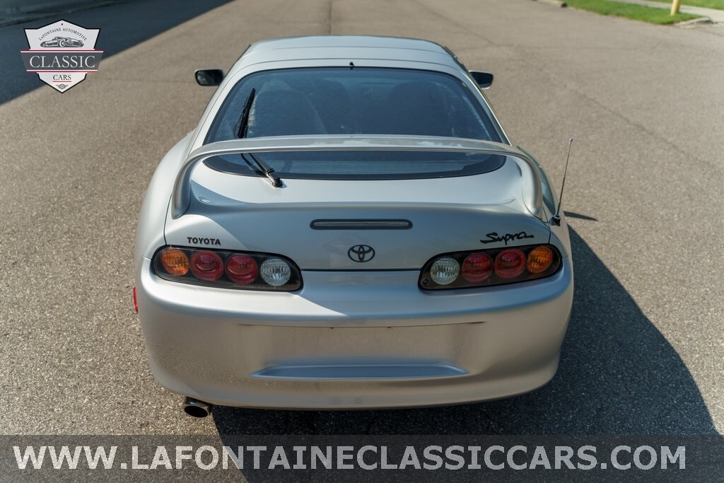 This 1994 Toyota Supra Turbo is powered by a twin-turbocharged 3.0L inline-six paired with a four-speed automatic transmission, and it is finished in Alpine Silver Metallic over black leather. Features include a limited-slip differential, a rear wing, a removable roof panel, heated side mirrors, automatic climate control, and a factory CD/cassette stereo system.