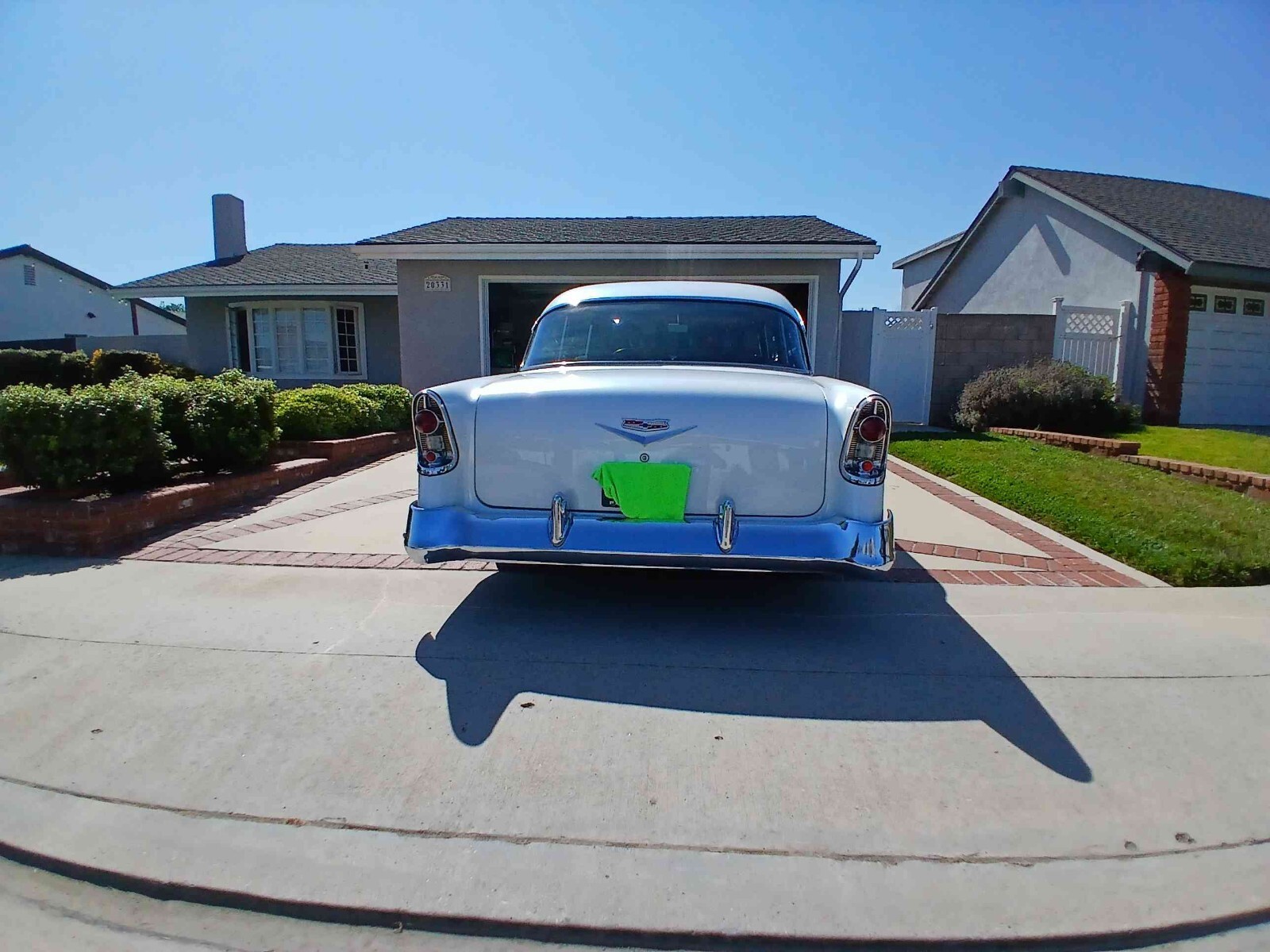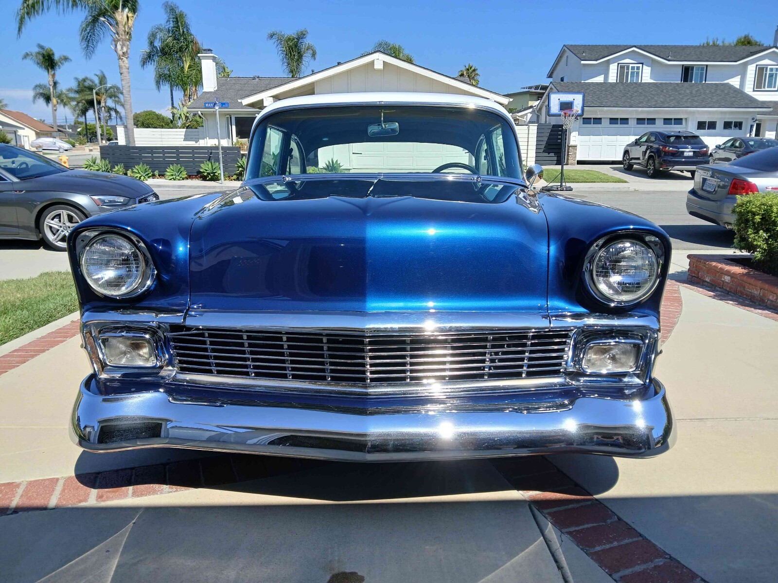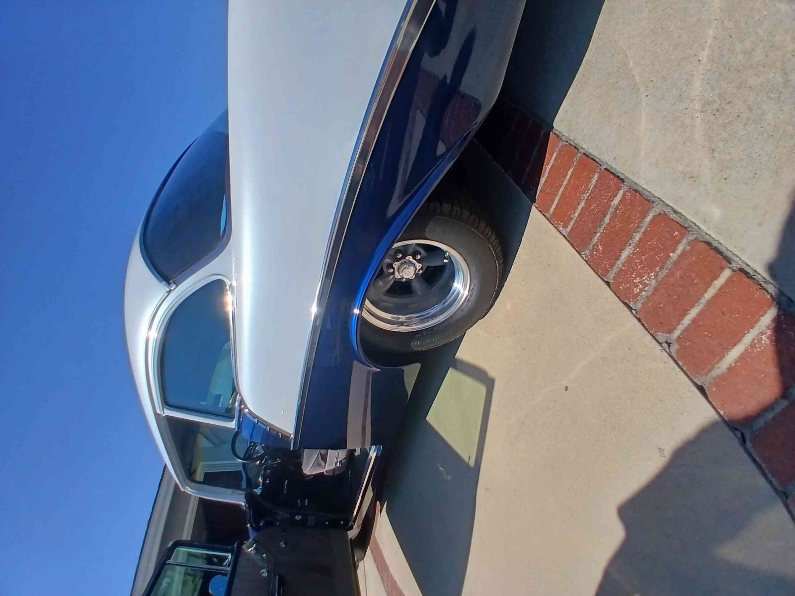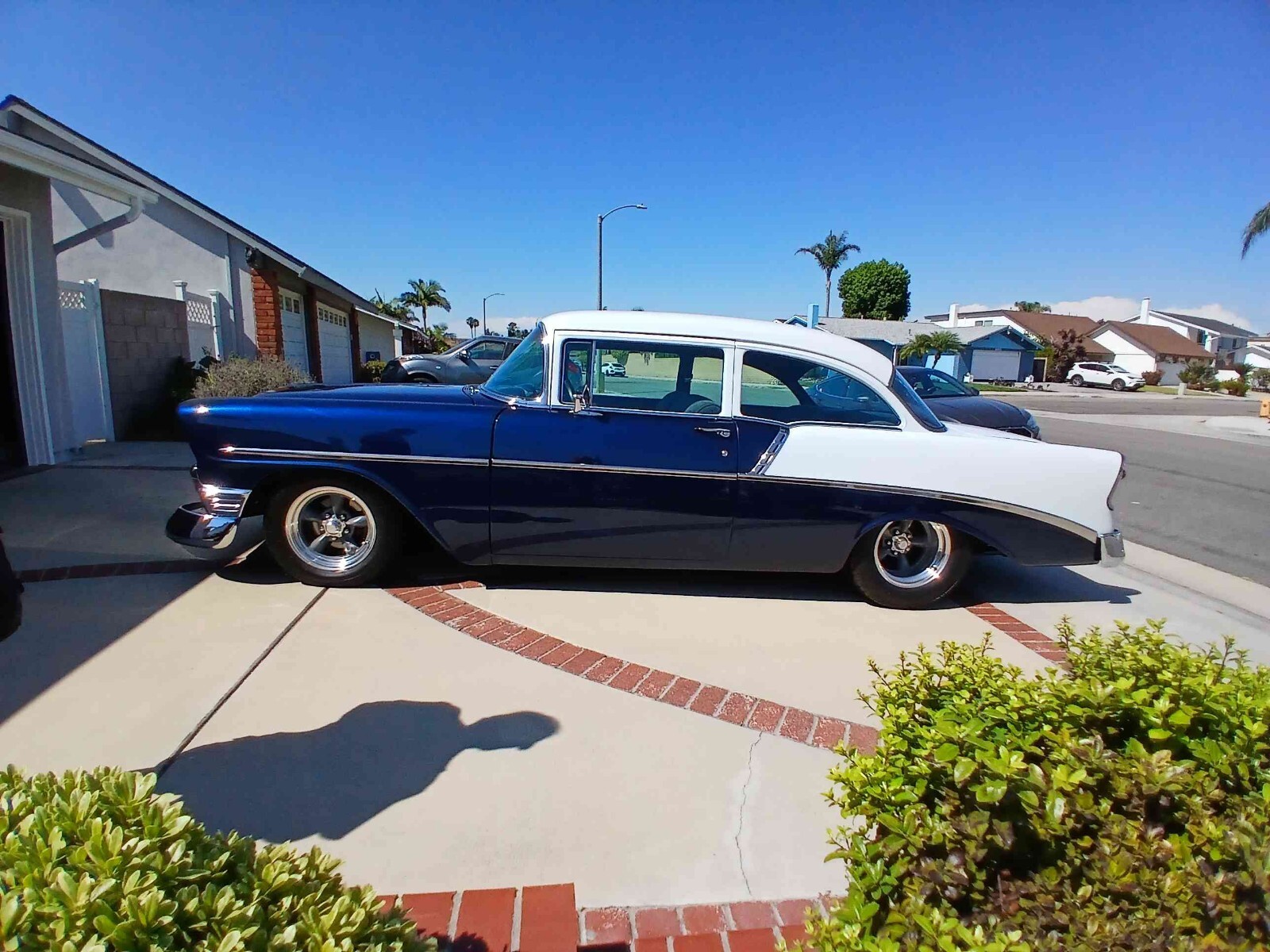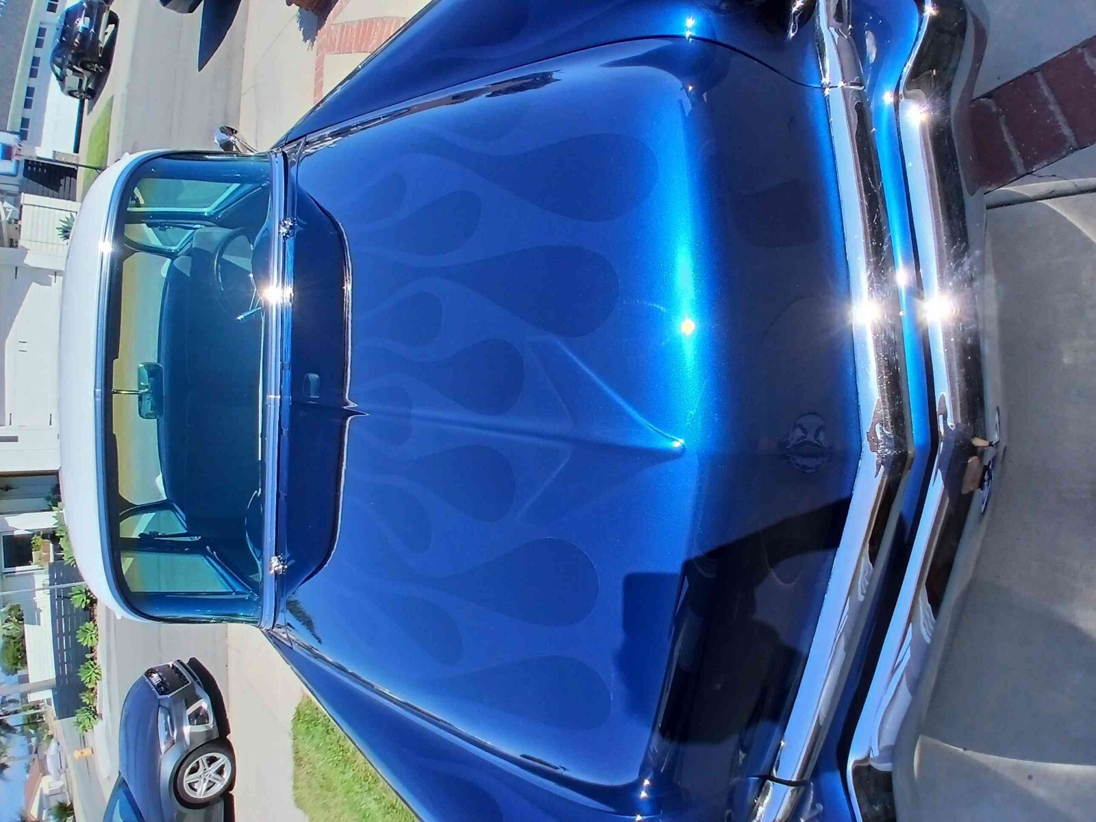 Hello. Selling my 1956 chevy bel air 210. It has a white top and blue body. With shadow flames in the hood.Vehicle Details