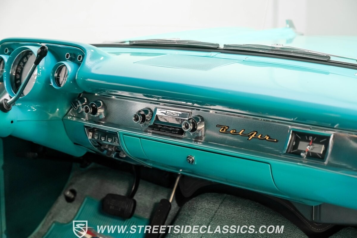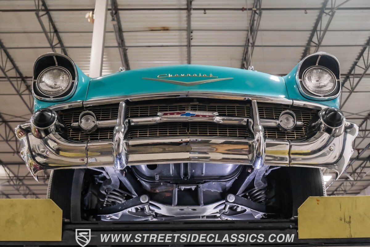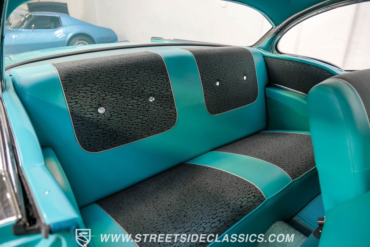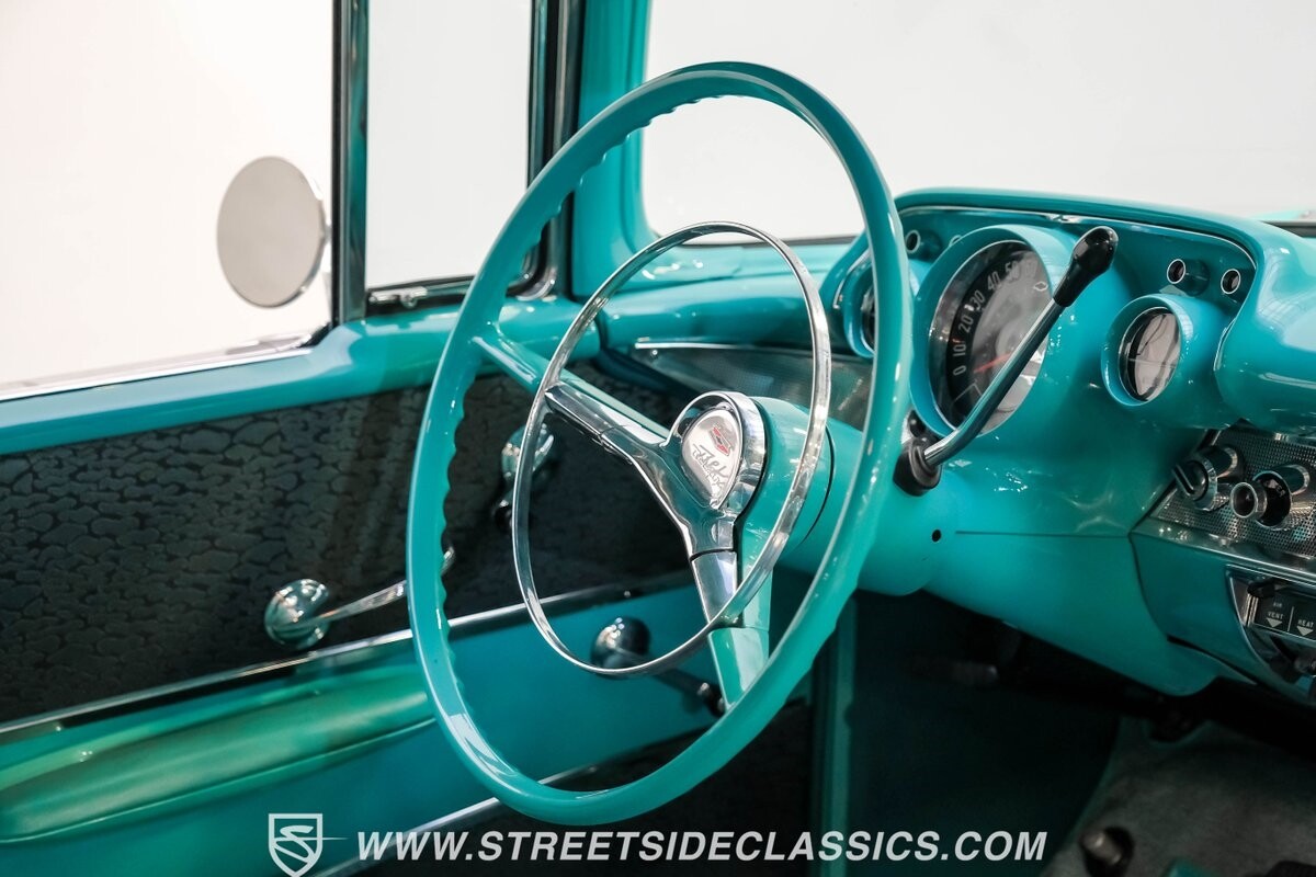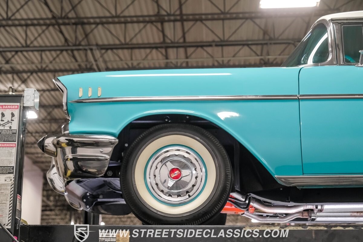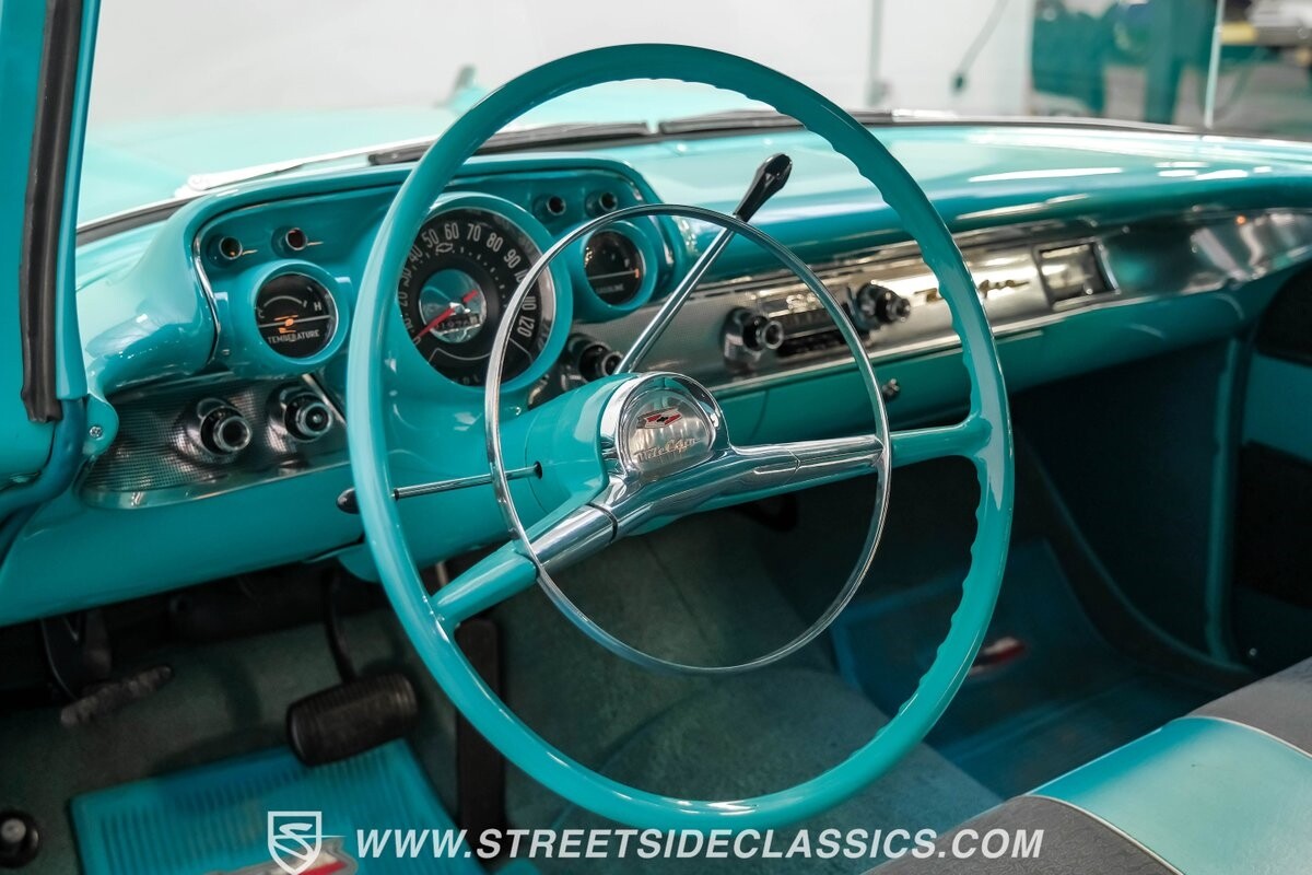 The interior blends turquoise and black in a quintessential 50s style. Bench seats, upholstered in a mix of vinyl and cloth, offer authentic comfort. A color-matched dash houses the original-style gauges and controls and every detail, from the door panels to the headliner, has been carefully recreated to capture the essence of a fresh-off-the-line '57 Bel Air. The craftsmanship evident throughout the cabin speaks to the nature of this car's restoration.