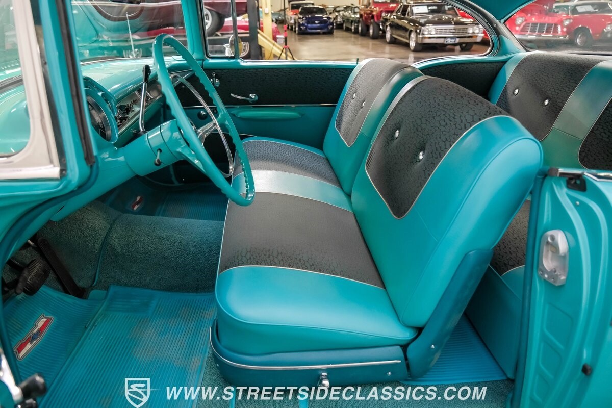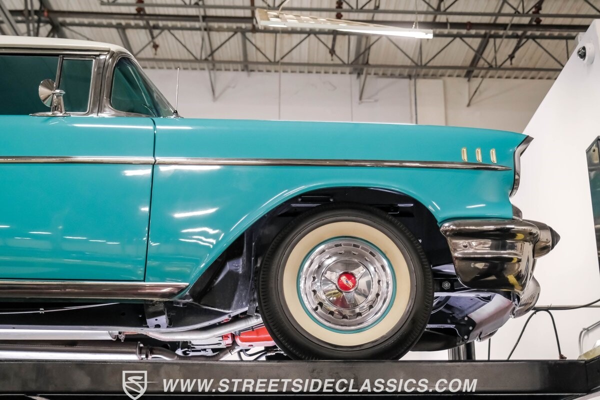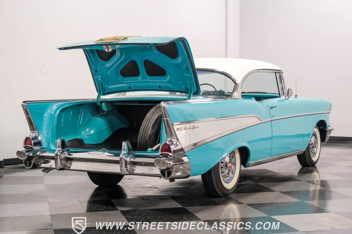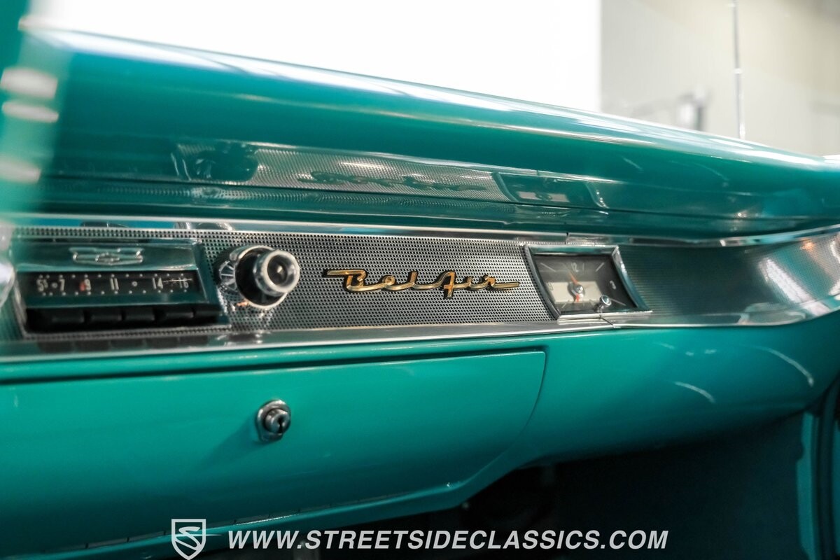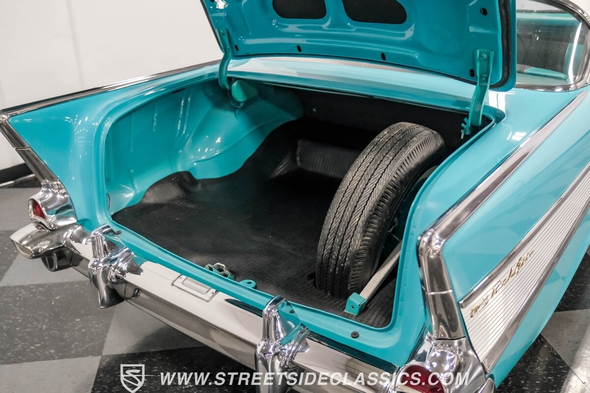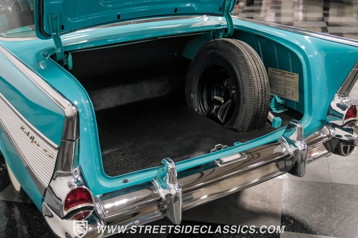 The interior blends turquoise and black in a quintessential 50s style. Bench seats, upholstered in a mix of vinyl and cloth, offer authentic comfort. A color-matched dash houses the original-style gauges and controls and every detail, from the door panels to the headliner, has been carefully recreated to capture the essence of a fresh-off-the-line '57 Bel Air. The craftsmanship evident throughout the cabin speaks to the nature of this car's restoration.