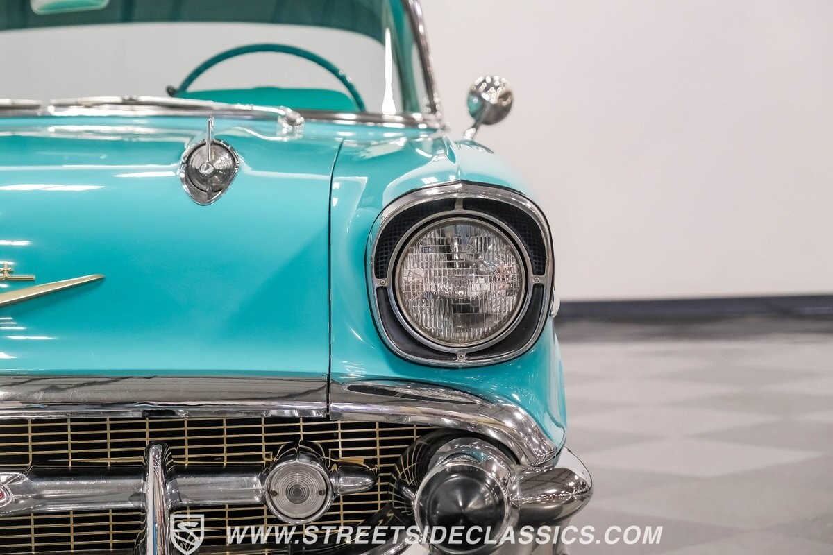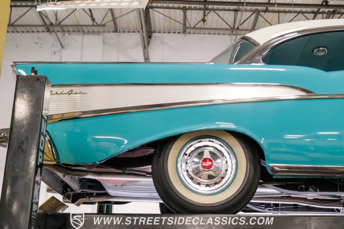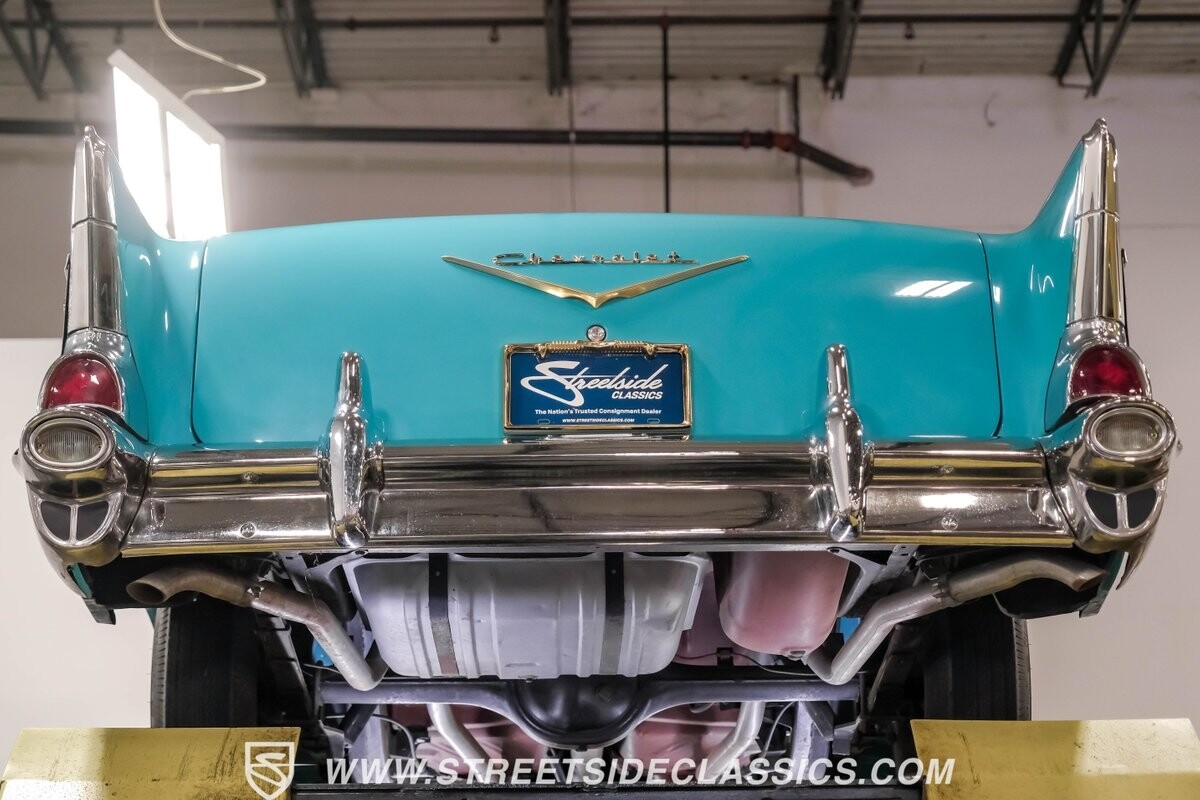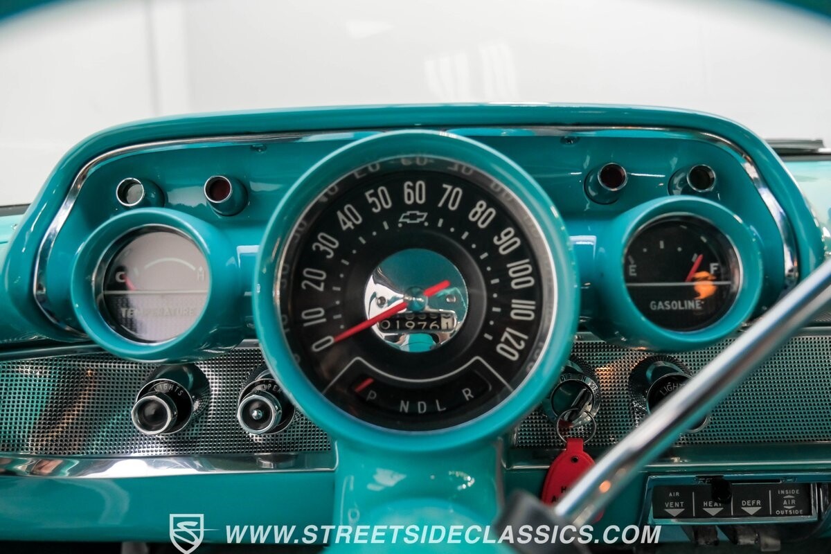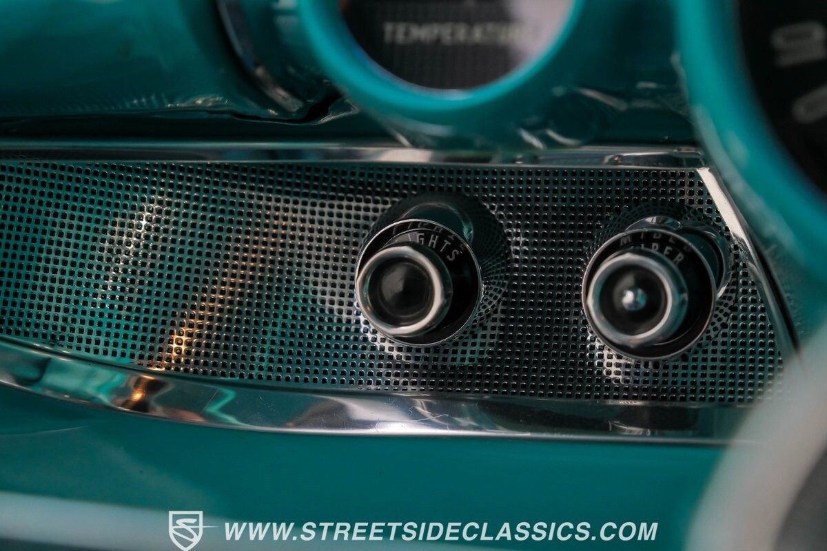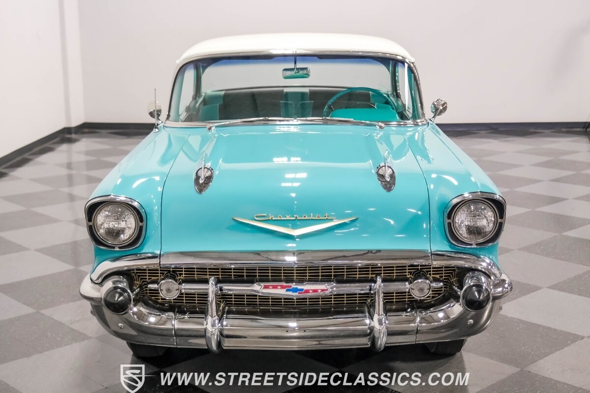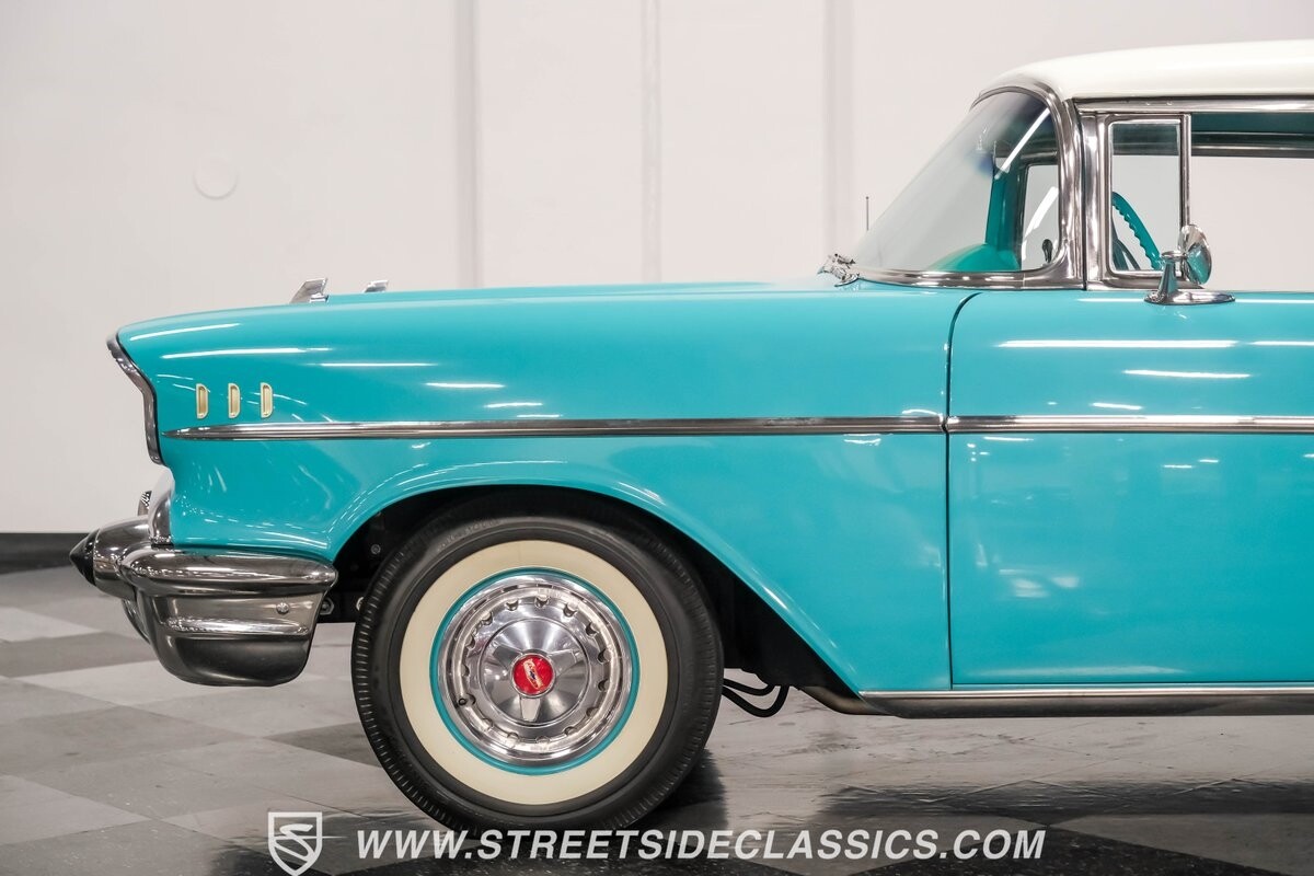 The interior blends turquoise and black in a quintessential 50s style. Bench seats, upholstered in a mix of vinyl and cloth, offer authentic comfort. A color-matched dash houses the original-style gauges and controls and every detail, from the door panels to the headliner, has been carefully recreated to capture the essence of a fresh-off-the-line '57 Bel Air. The craftsmanship evident throughout the cabin speaks to the nature of this car's restoration.