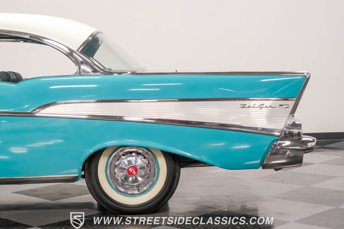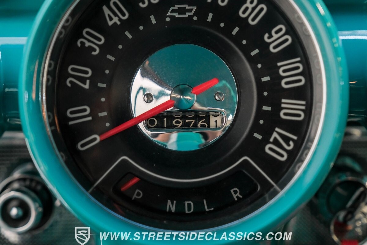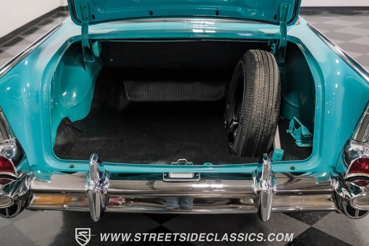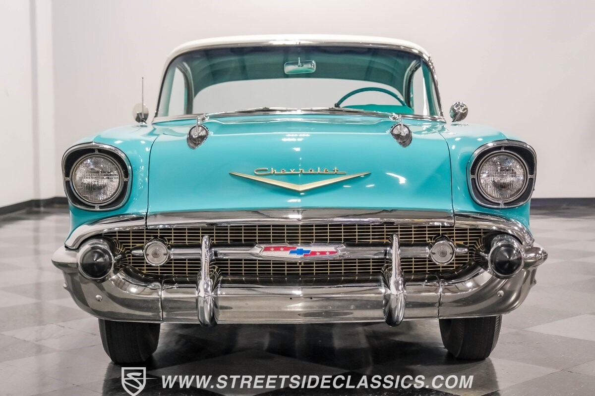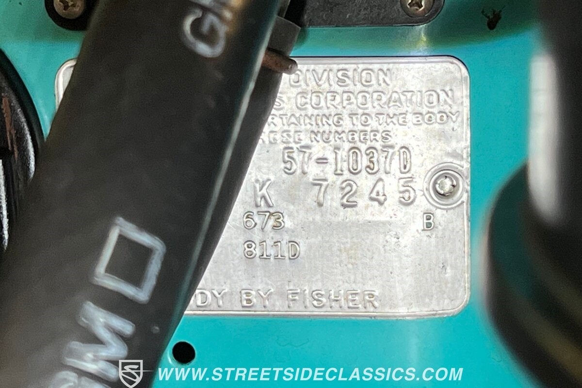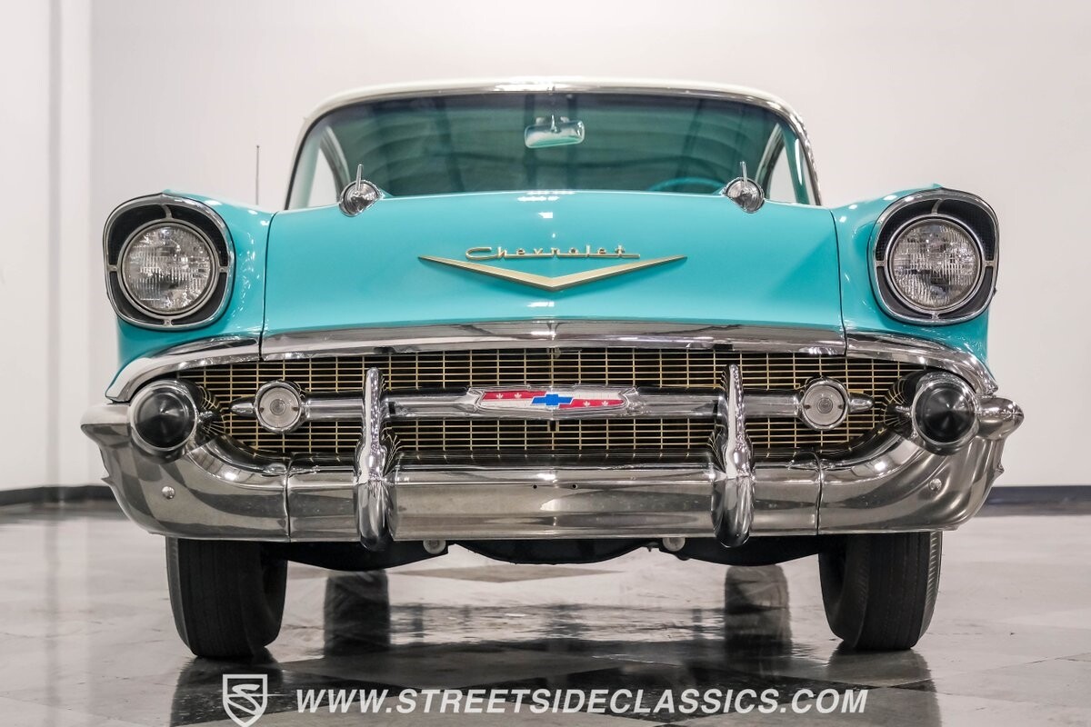 The interior blends turquoise and black in a quintessential 50s style. Bench seats, upholstered in a mix of vinyl and cloth, offer authentic comfort. A color-matched dash houses the original-style gauges and controls and every detail, from the door panels to the headliner, has been carefully recreated to capture the essence of a fresh-off-the-line '57 Bel Air. The craftsmanship evident throughout the cabin speaks to the nature of this car's restoration.