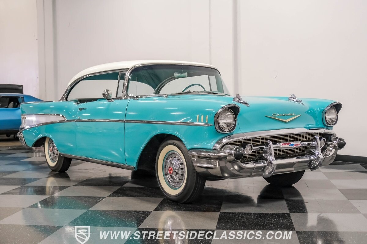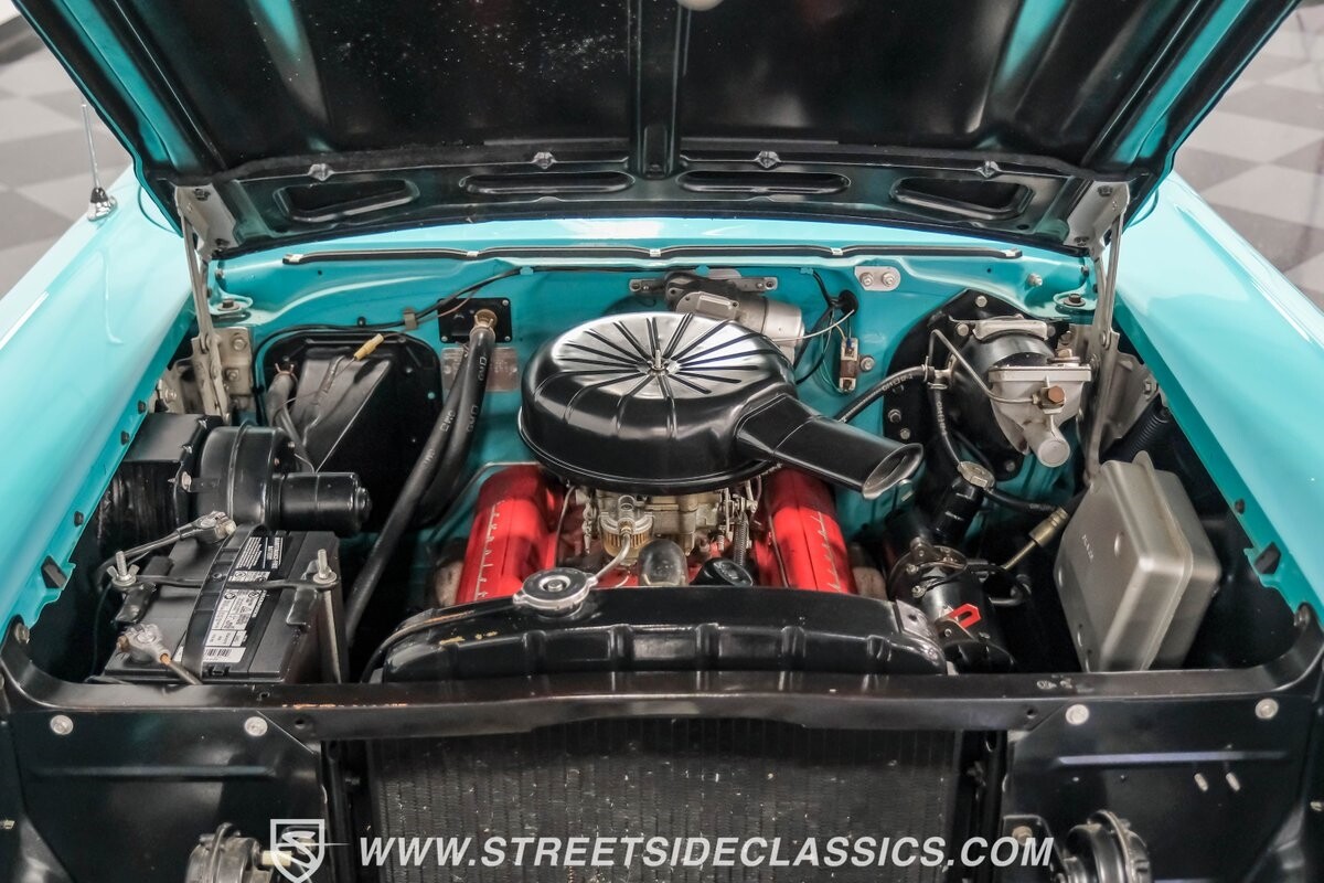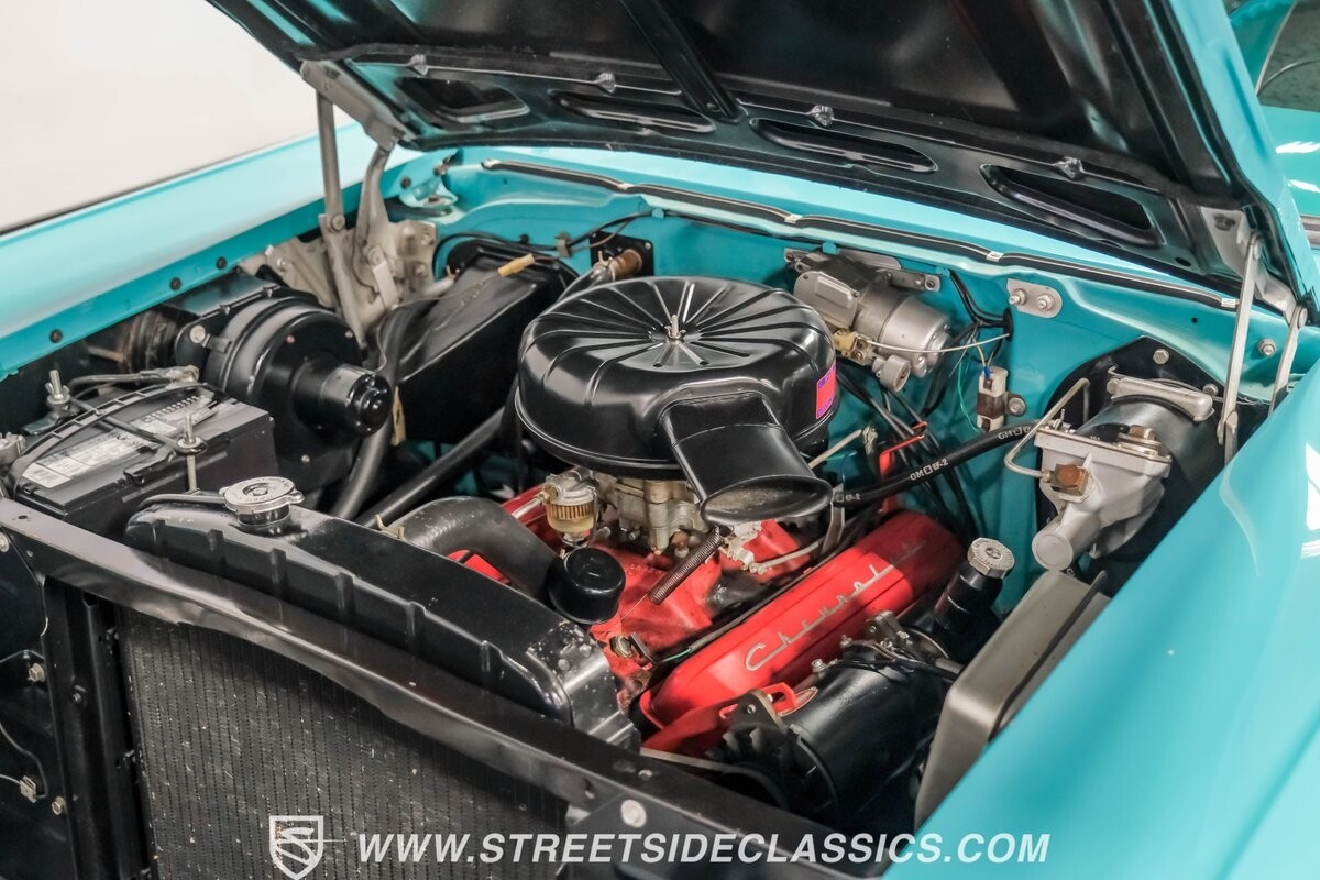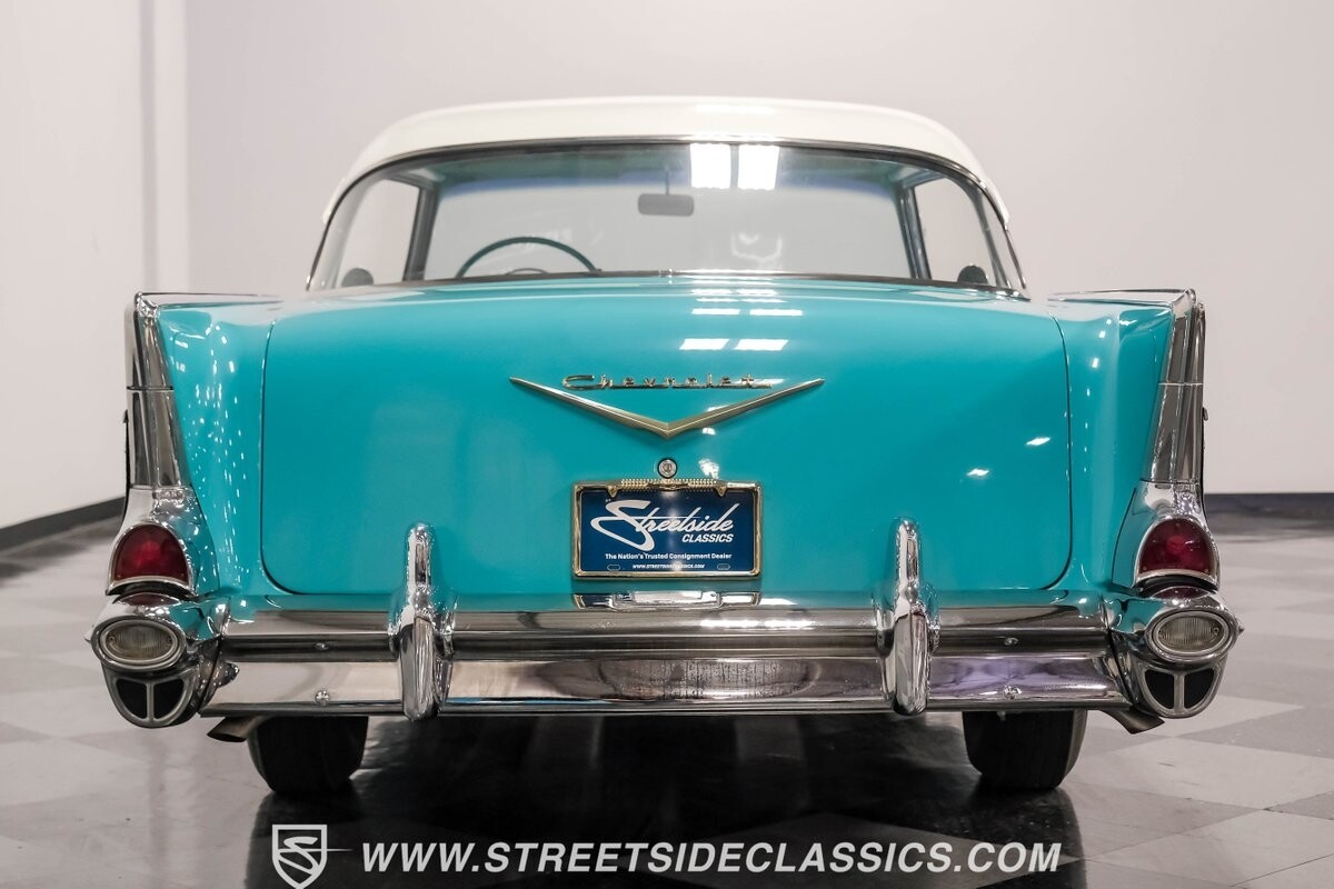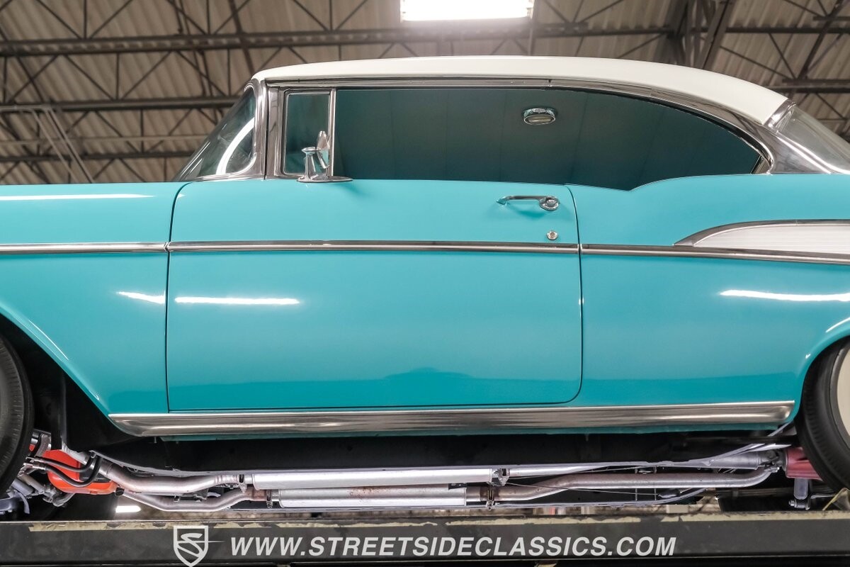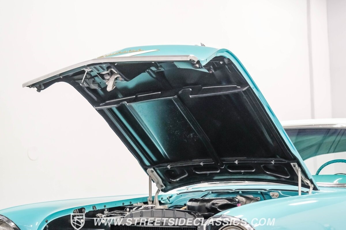 The interior blends turquoise and black in a quintessential 50s style. Bench seats, upholstered in a mix of vinyl and cloth, offer authentic comfort. A color-matched dash houses the original-style gauges and controls and every detail, from the door panels to the headliner, has been carefully recreated to capture the essence of a fresh-off-the-line '57 Bel Air. The craftsmanship evident throughout the cabin speaks to the nature of this car's restoration.