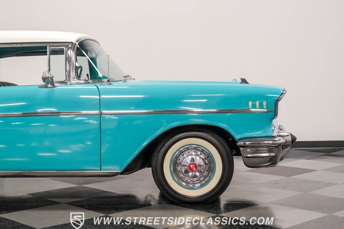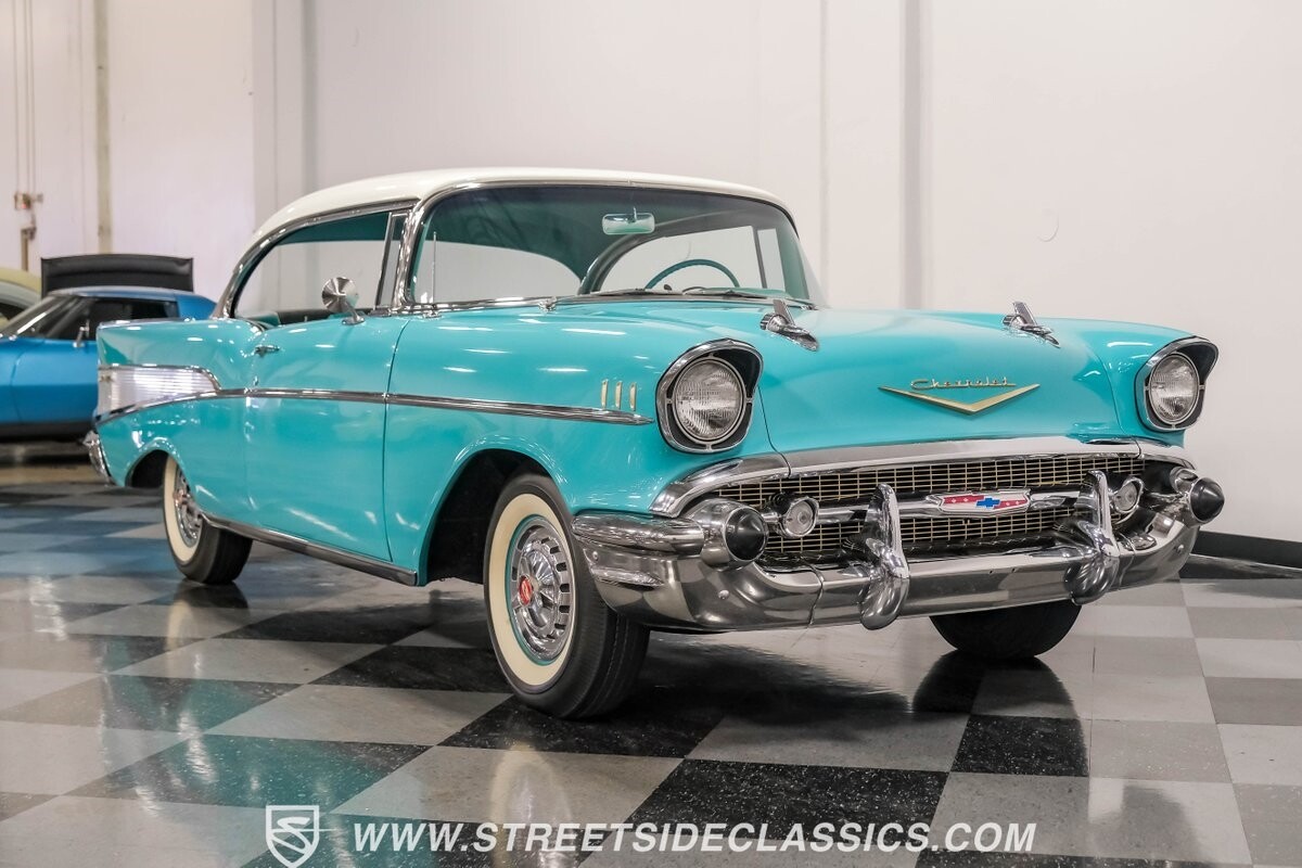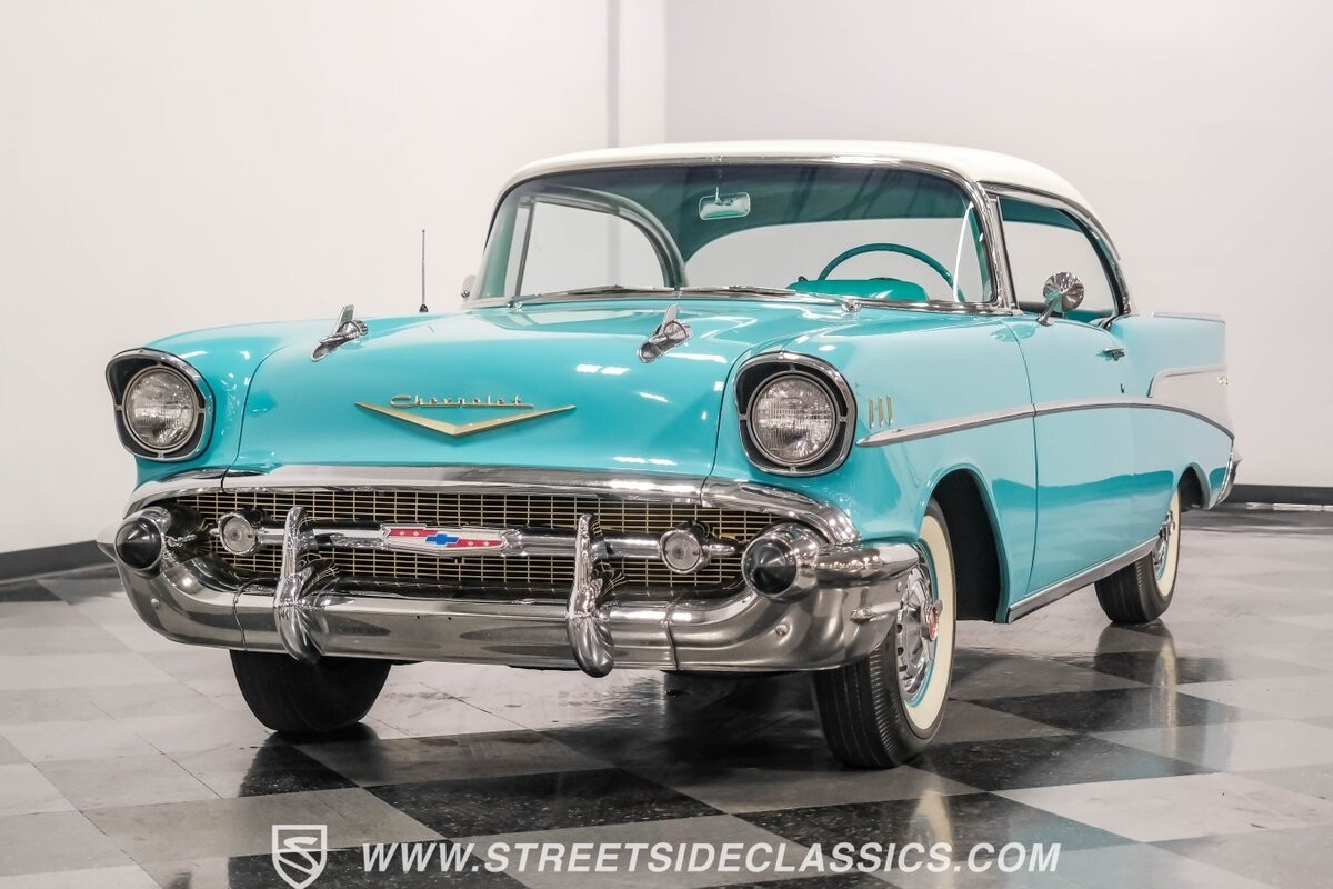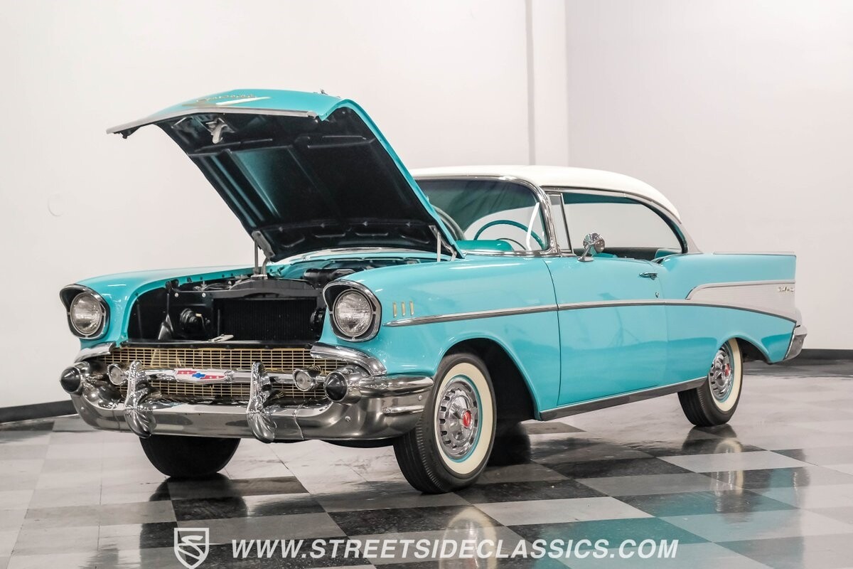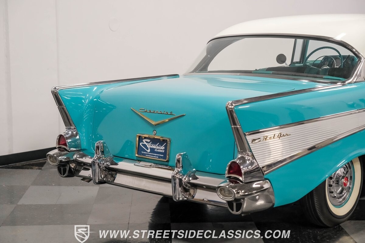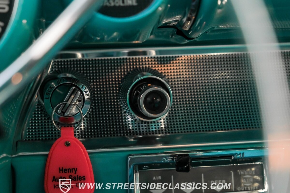 The interior blends turquoise and black in a quintessential 50s style. Bench seats, upholstered in a mix of vinyl and cloth, offer authentic comfort. A color-matched dash houses the original-style gauges and controls and every detail, from the door panels to the headliner, has been carefully recreated to capture the essence of a fresh-off-the-line '57 Bel Air. The craftsmanship evident throughout the cabin speaks to the nature of this car's restoration.