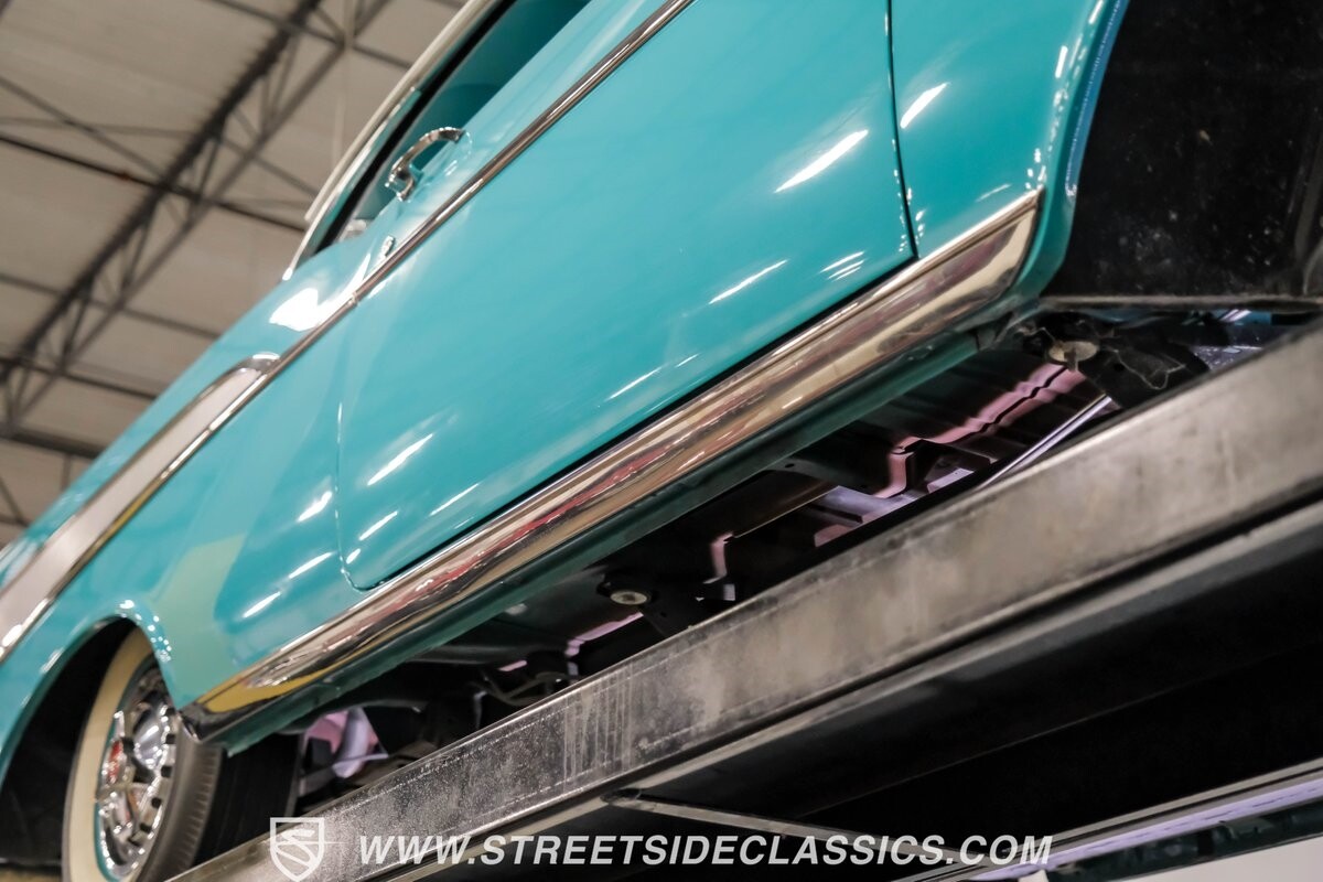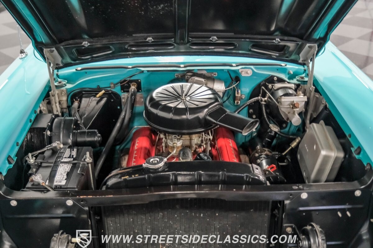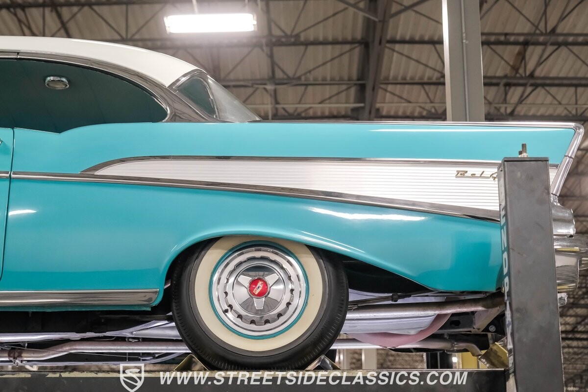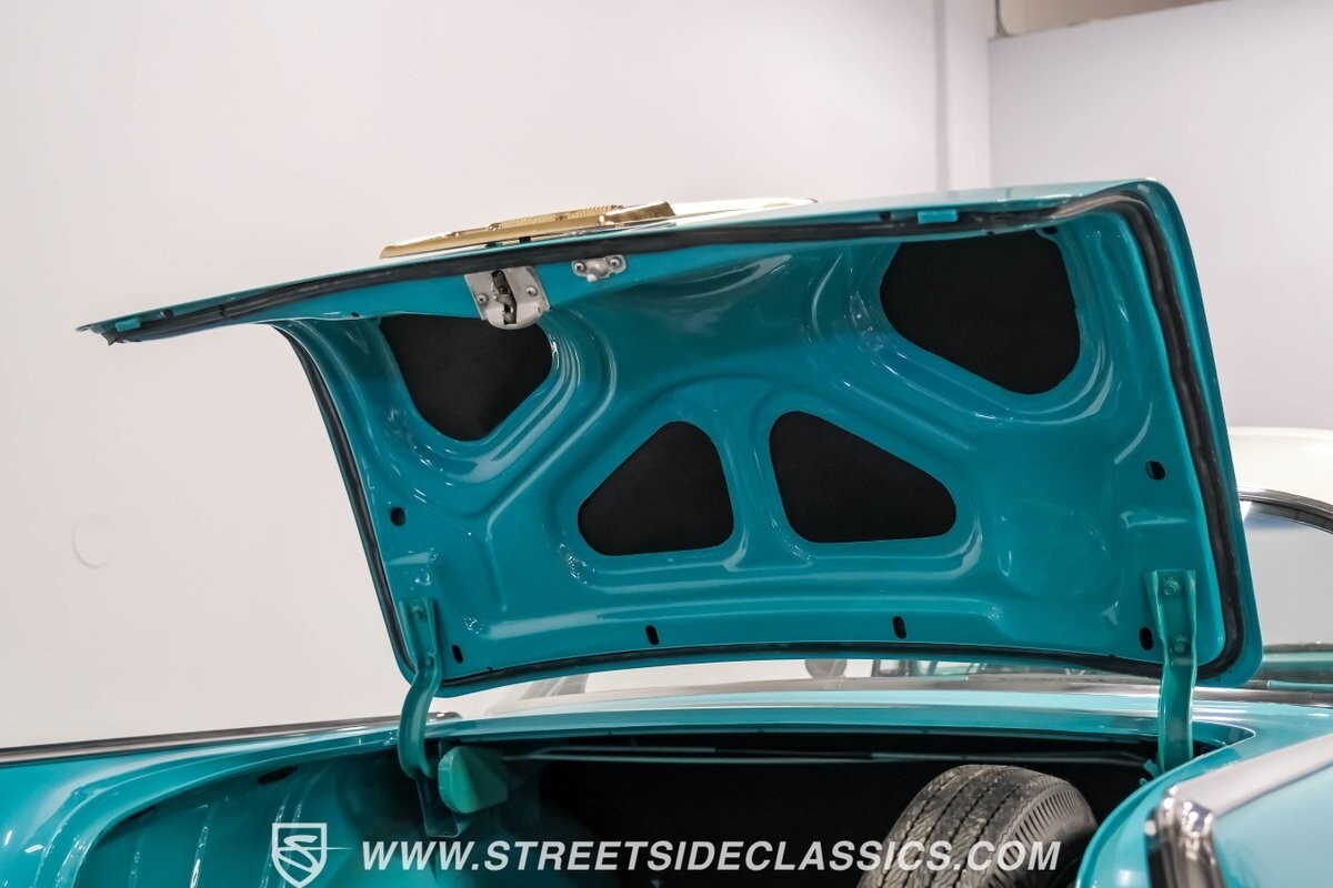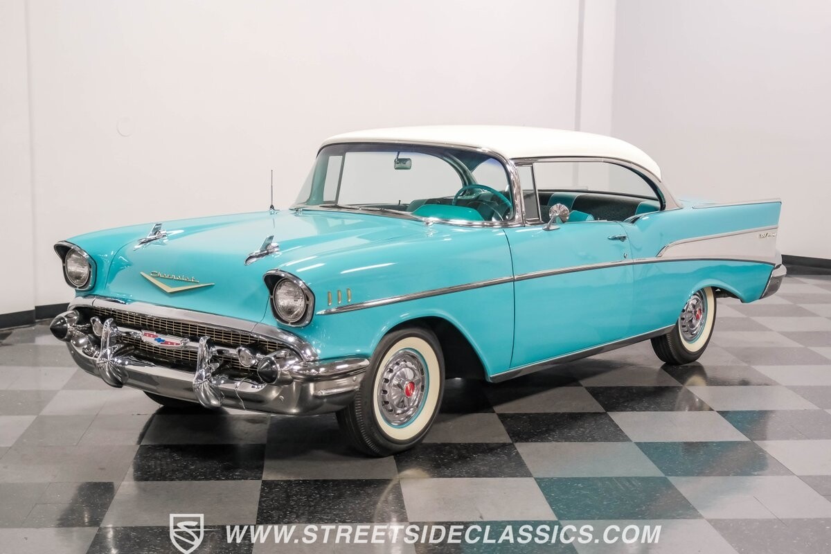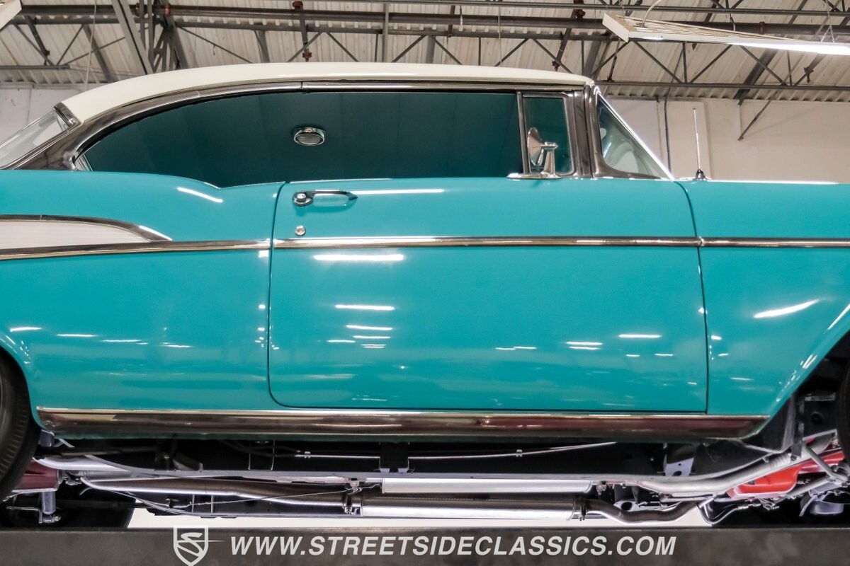 The interior blends turquoise and black in a quintessential 50s style. Bench seats, upholstered in a mix of vinyl and cloth, offer authentic comfort. A color-matched dash houses the original-style gauges and controls and every detail, from the door panels to the headliner, has been carefully recreated to capture the essence of a fresh-off-the-line '57 Bel Air. The craftsmanship evident throughout the cabin speaks to the nature of this car's restoration.
