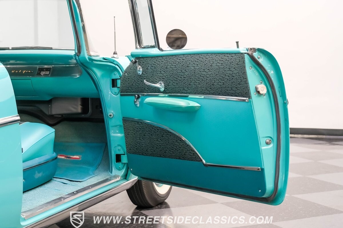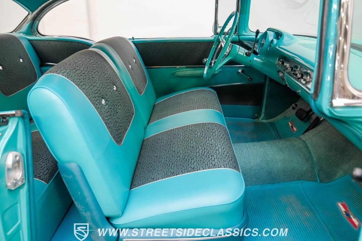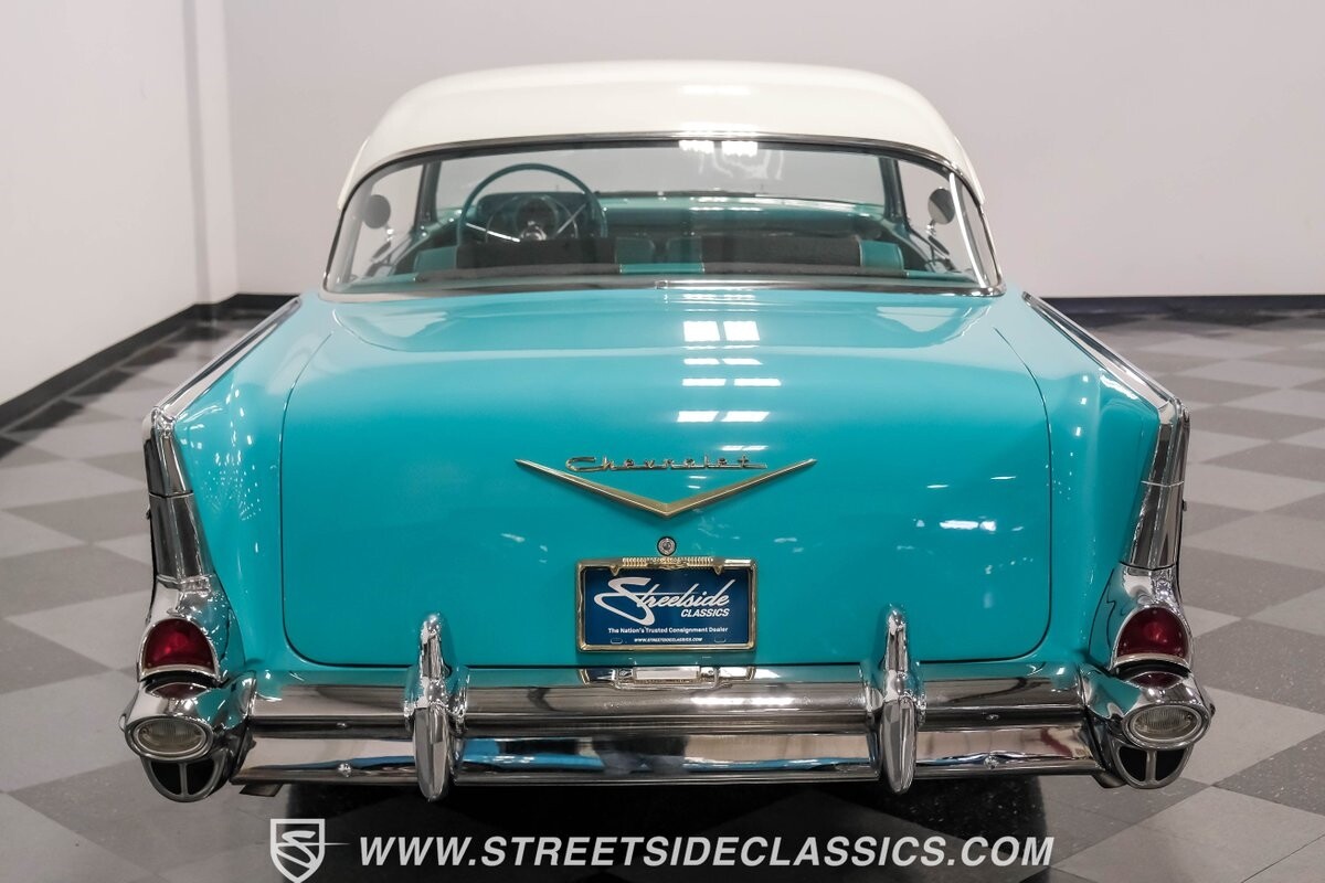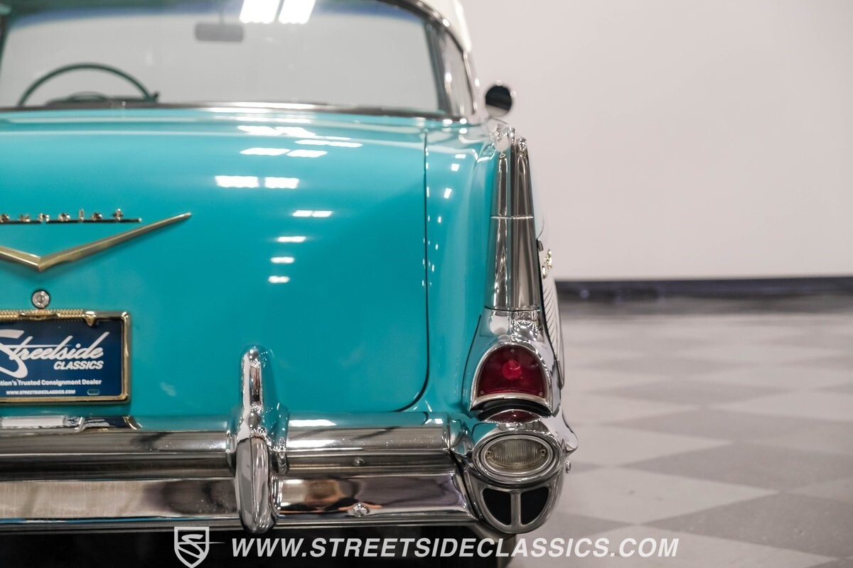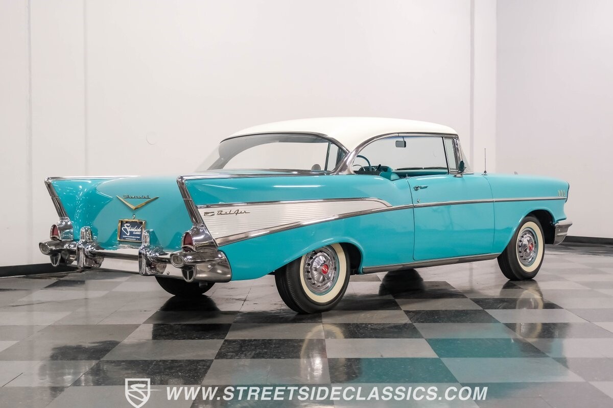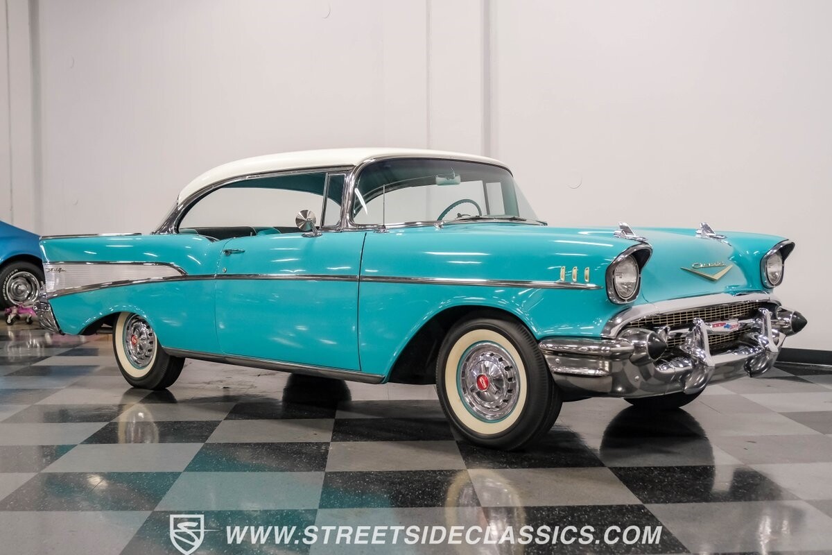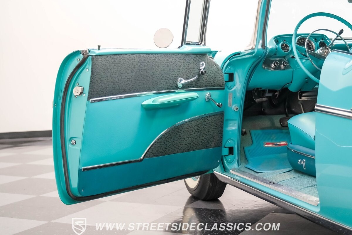 The interior blends turquoise and black in a quintessential 50s style. Bench seats, upholstered in a mix of vinyl and cloth, offer authentic comfort. A color-matched dash houses the original-style gauges and controls and every detail, from the door panels to the headliner, has been carefully recreated to capture the essence of a fresh-off-the-line '57 Bel Air. The craftsmanship evident throughout the cabin speaks to the nature of this car's restoration.