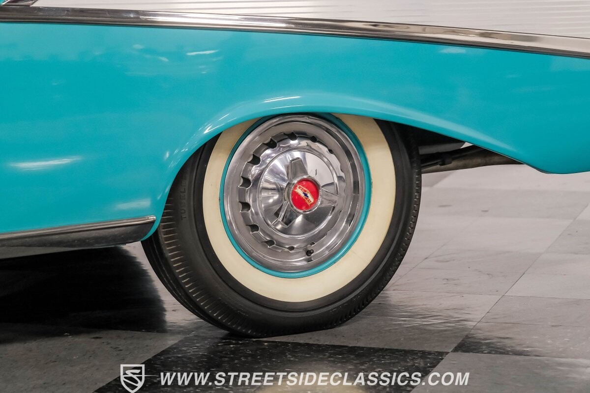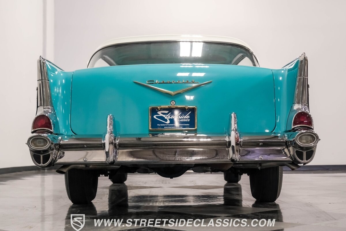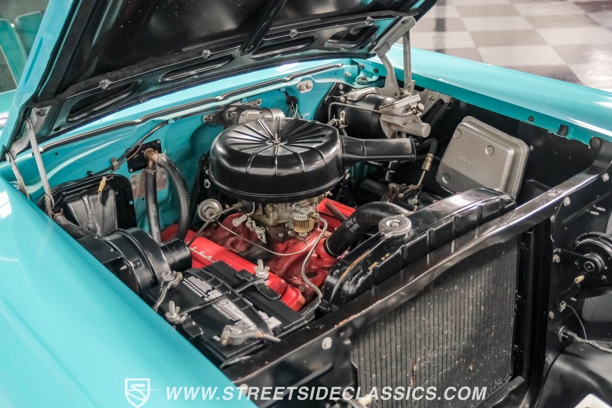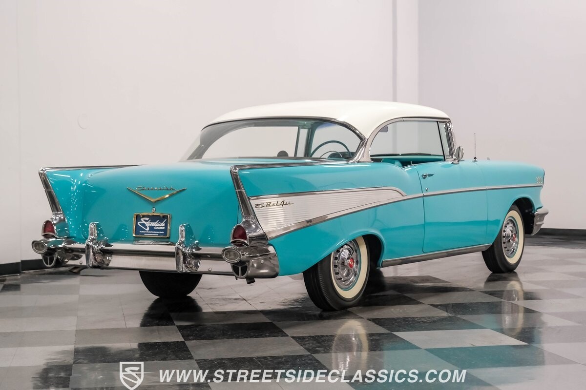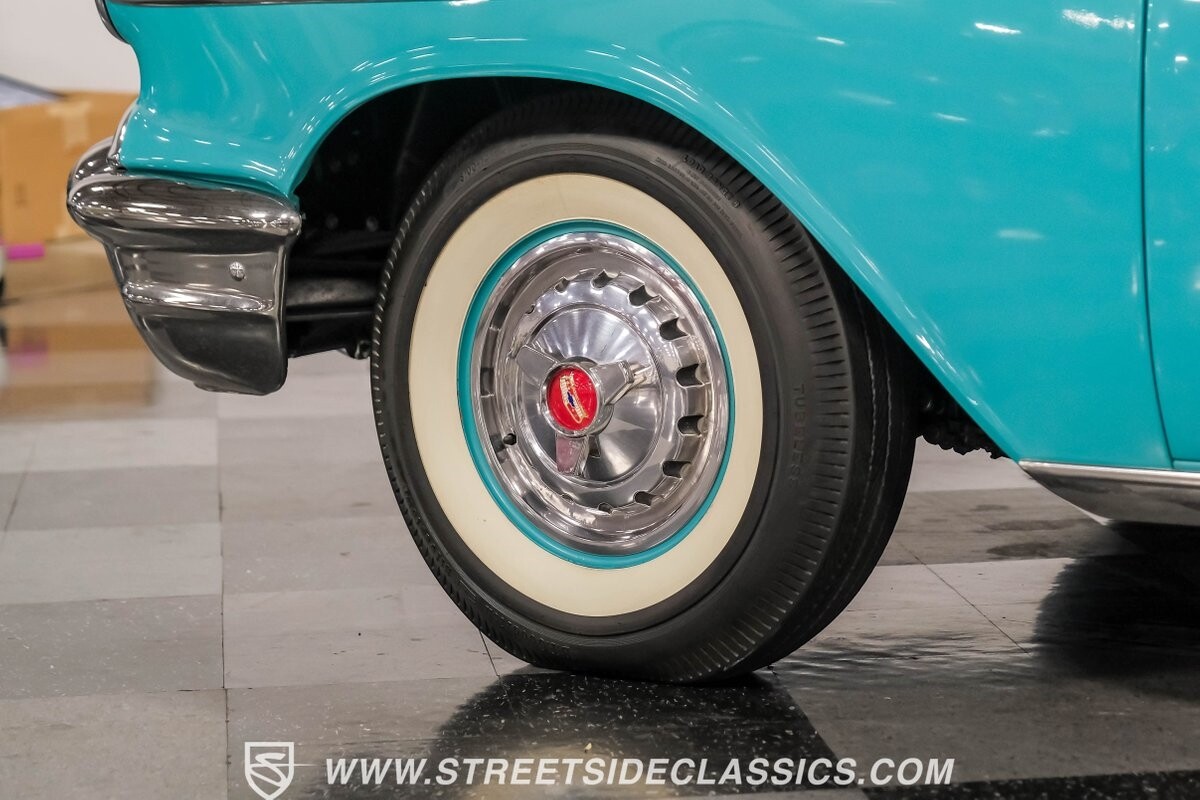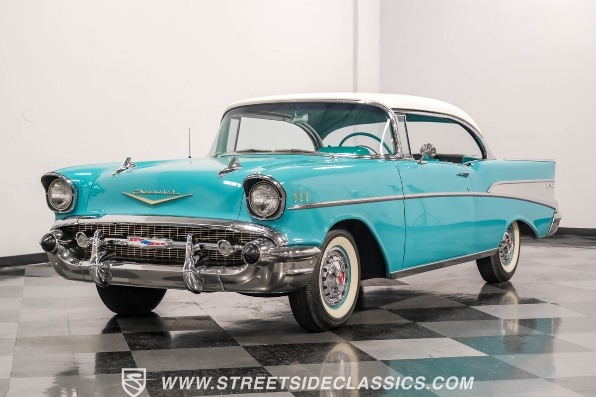 The interior blends turquoise and black in a quintessential 50s style. Bench seats, upholstered in a mix of vinyl and cloth, offer authentic comfort. A color-matched dash houses the original-style gauges and controls and every detail, from the door panels to the headliner, has been carefully recreated to capture the essence of a fresh-off-the-line '57 Bel Air. The craftsmanship evident throughout the cabin speaks to the nature of this car's restoration.