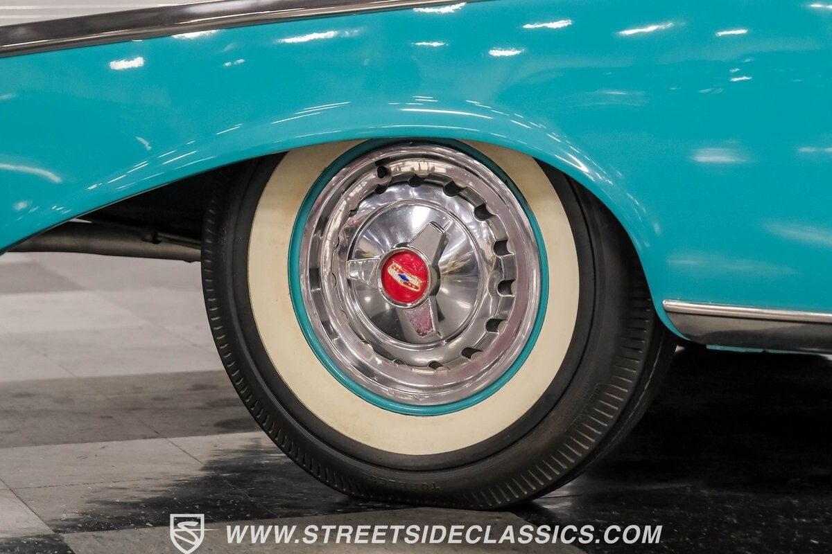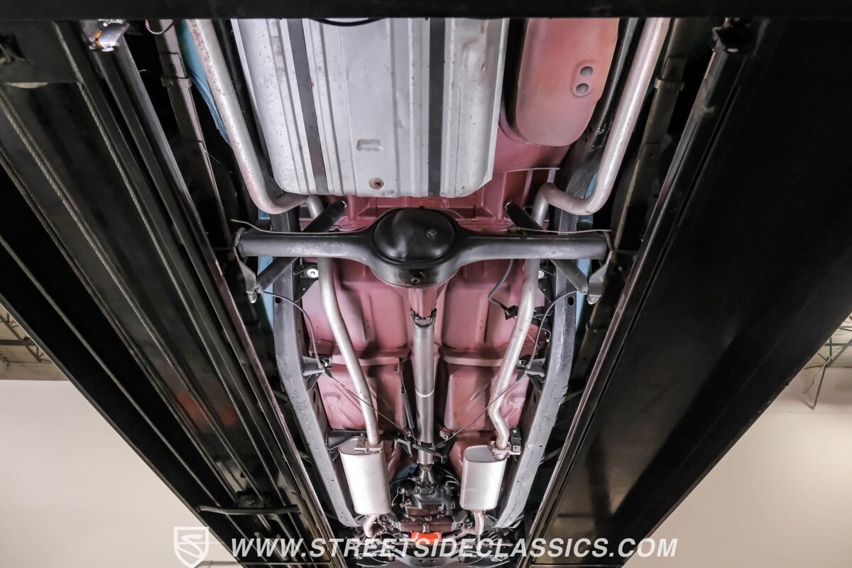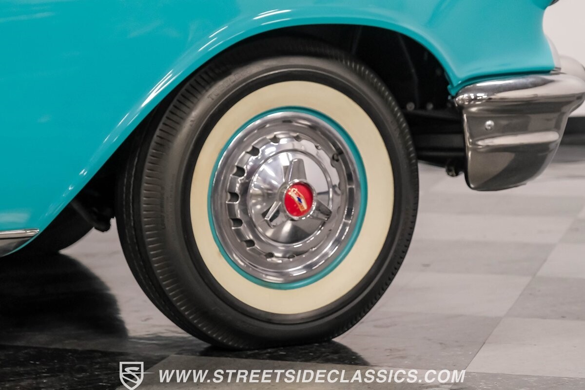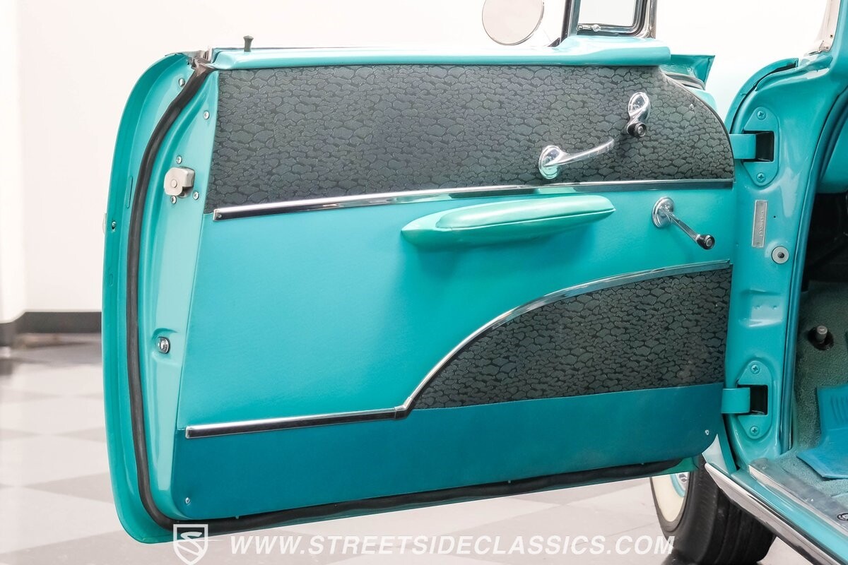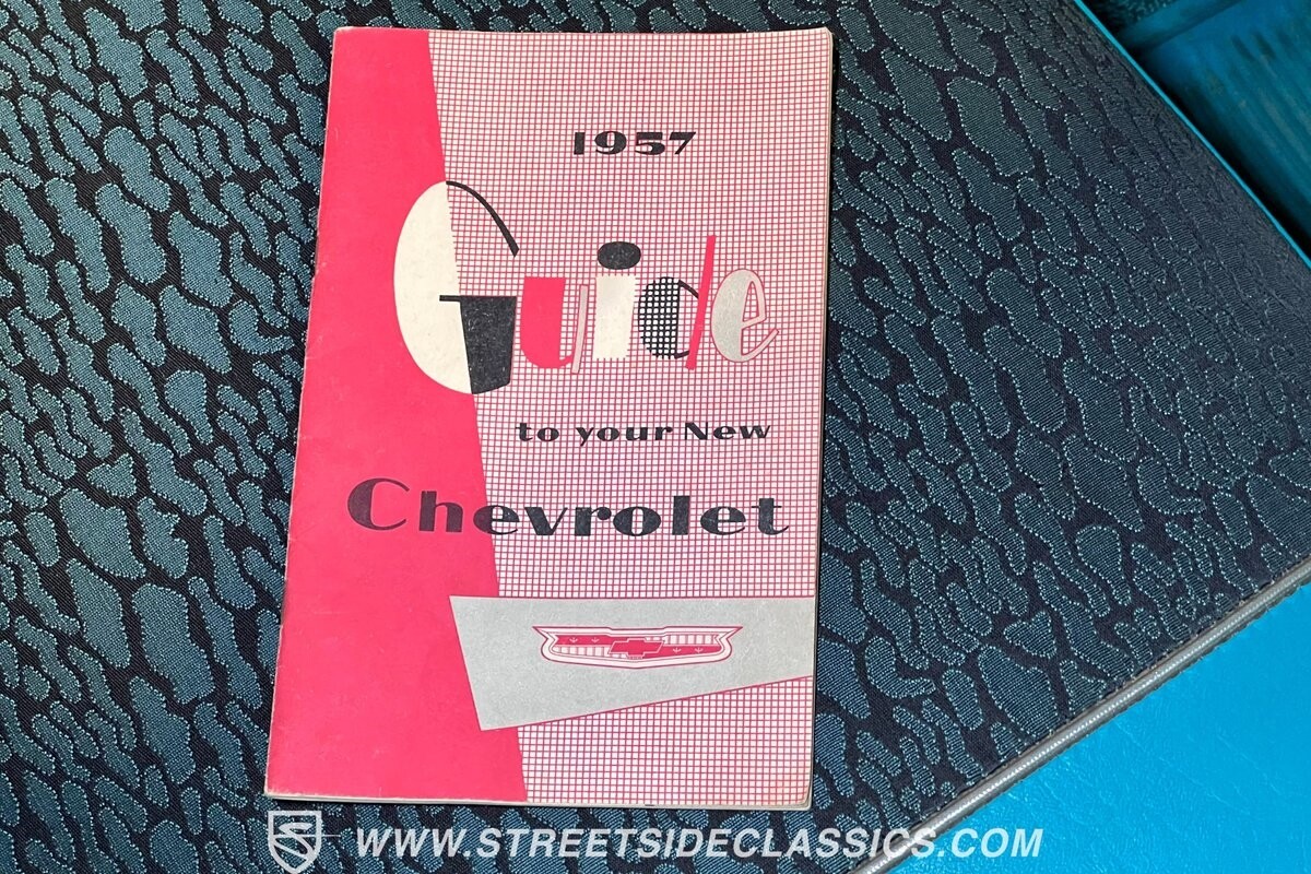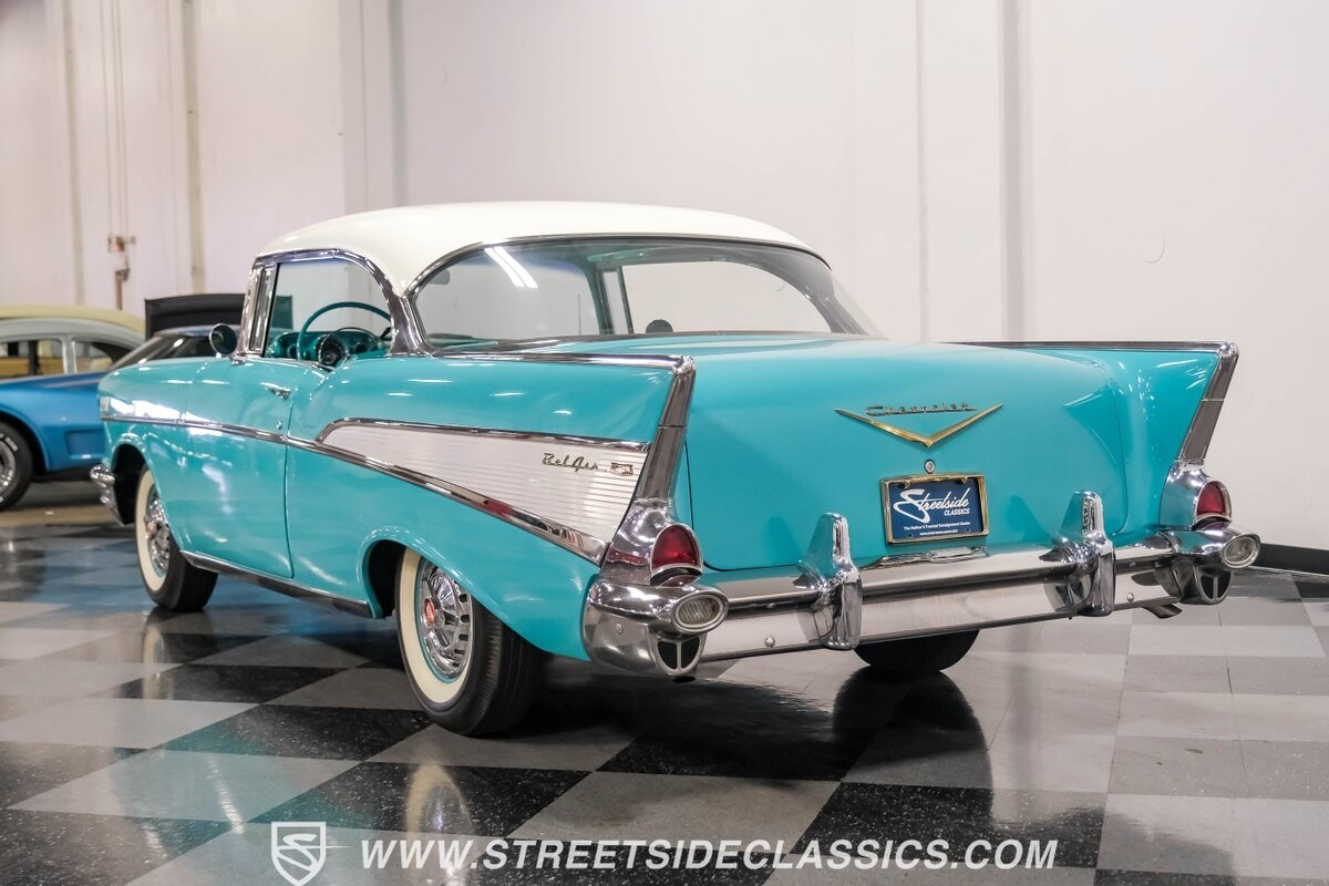 The interior blends turquoise and black in a quintessential 50s style. Bench seats, upholstered in a mix of vinyl and cloth, offer authentic comfort. A color-matched dash houses the original-style gauges and controls and every detail, from the door panels to the headliner, has been carefully recreated to capture the essence of a fresh-off-the-line '57 Bel Air. The craftsmanship evident throughout the cabin speaks to the nature of this car's restoration.