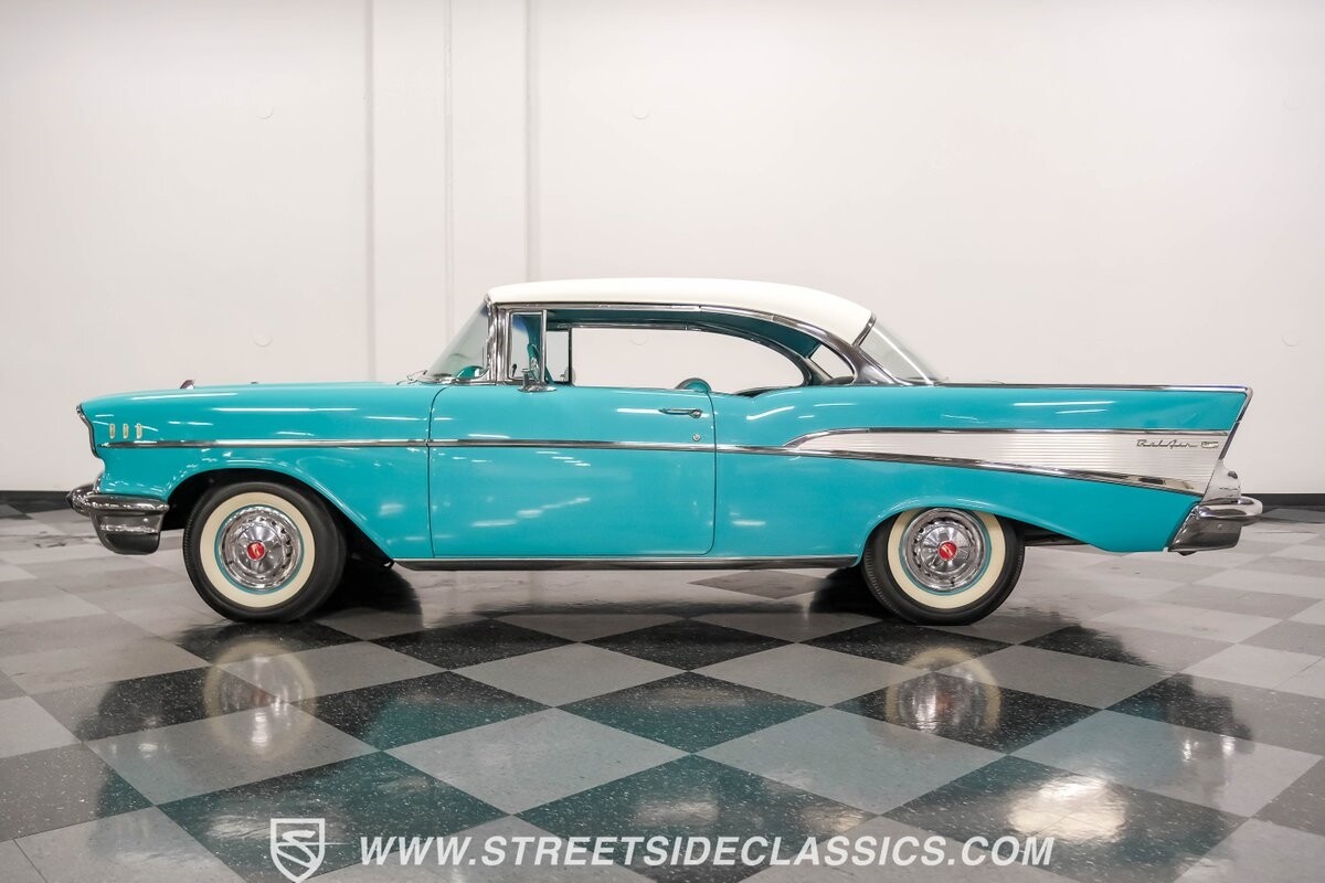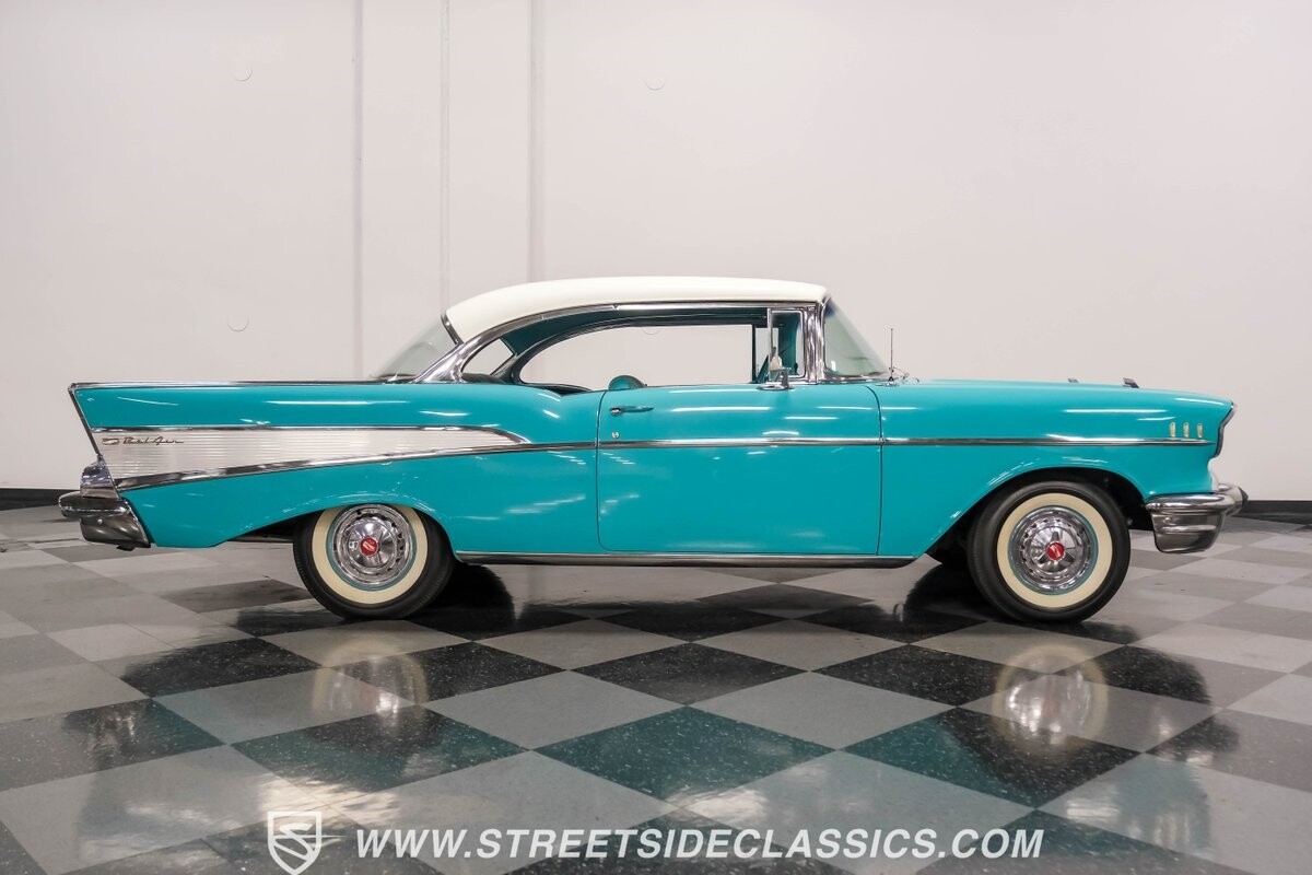 This 1957 Chevrolet Bel Air flaunts a striking factory correct Tropical Turquoise and India Ivory two-tone finish. The iconic '57 design shines through, from its bold front grille to those unmistakable tailfins. Chrome accents gleam against the vibrant paint, emphasizing the Bel Air's flowing lines. It rolls on 14-inch wheels wrapped in period-correct 8.00-14 Silvertown whitewall tires, completing its classic profile. Glass, light housings, and trim all present beautifully, showcasing the quality of this car's restoration. With just 1,976 miles since its rebuild, this Bel Air stands ready to impress at shows or on the street.