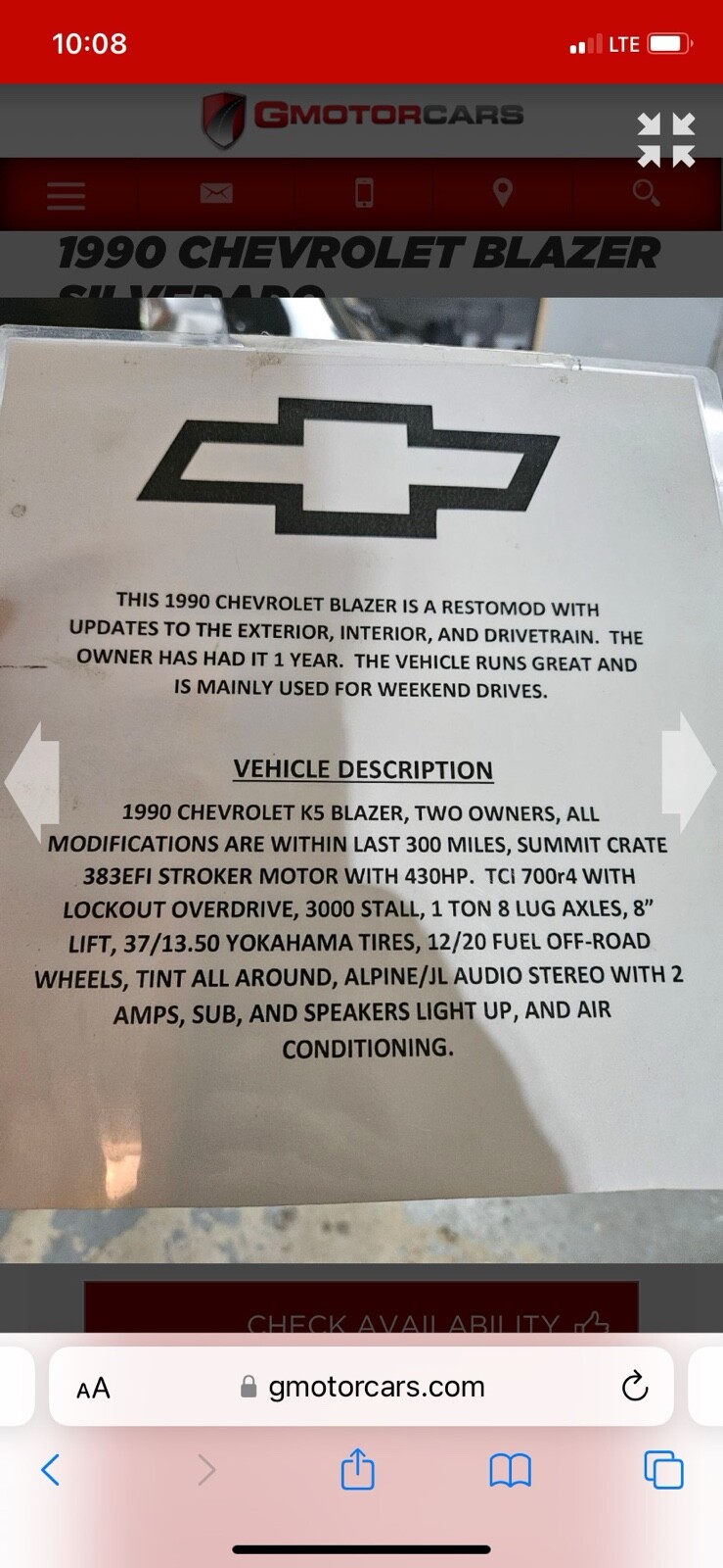 THIS 1990 CHEVROLET BLAZER IS A RESTOMOD WITH UPDATES TO THE EXTERIOR, INTERIOR, AND DRIVETRAIN. THE OWNER HAS HAD IT 1 YEAR. THE VEHICLE RUNS GREAT AND IS MAINLY USED FOR WEEKEND DRIVES.VEHICLE DESCRIPTION1990 CHEVROLET K5 BLAZER, TWO OWNERS, ALL MODIFICATIONS ARE WITHIN LAST 300 MILES, SUMMIT CRATE 383EFI STROKER MOTOR WITH 430HP. TCI 700r4 WITH LOCKOUT OVERDRIVE, 3000 STALL, 1 TON 8 LUG AXLES, 8" LIFT, 37/13.50 YOKAHAMA TIRES, 12/20 FUEL OFF-ROAD WHEELS, TINT ALL AROUND, ALPINE/JL AUDIO STEREO WITH 2 AMPS, SUB, AND SPEAKERS LIGHT UP, AND AIR CONDITIONING. NEW BUILD