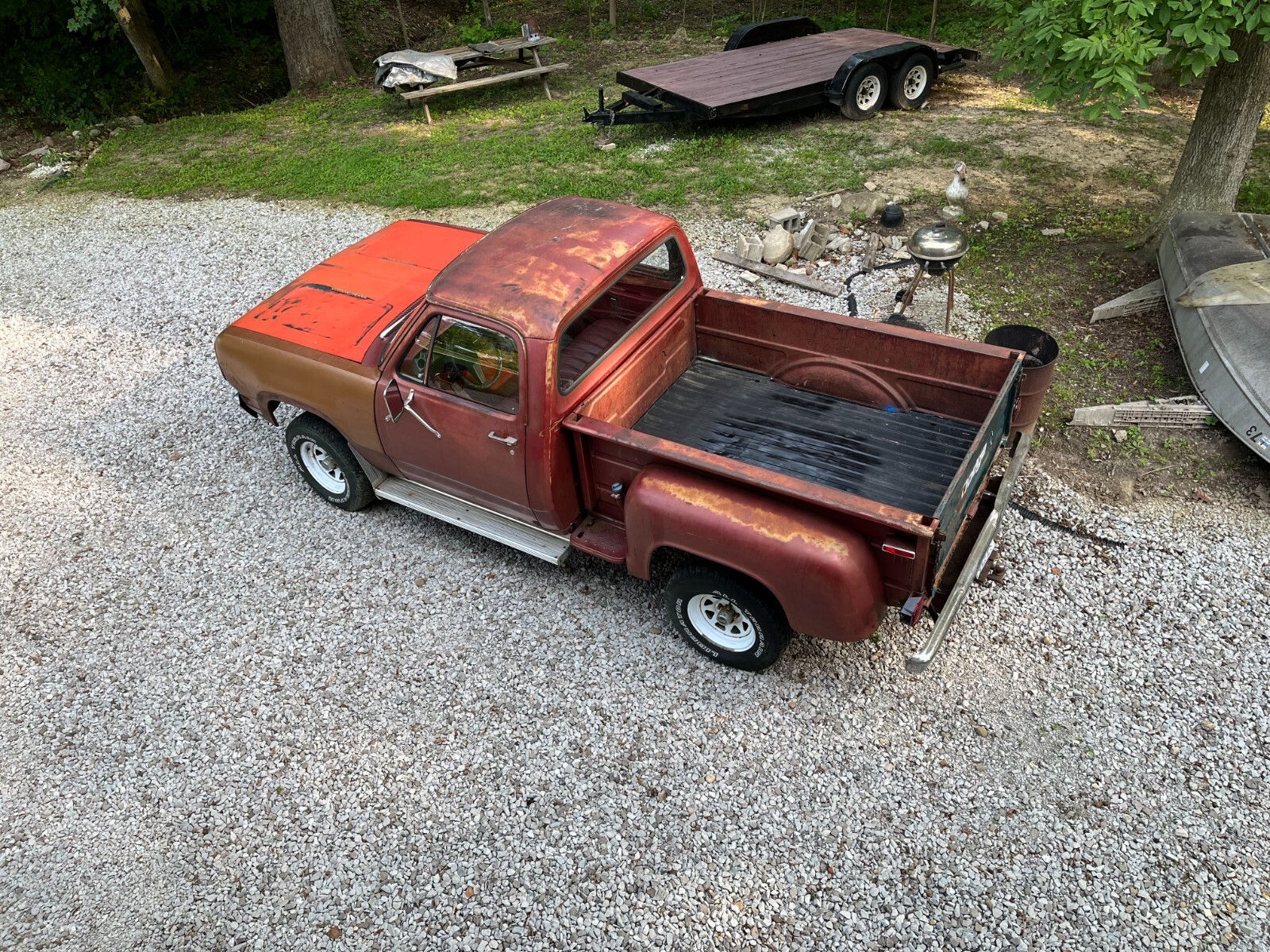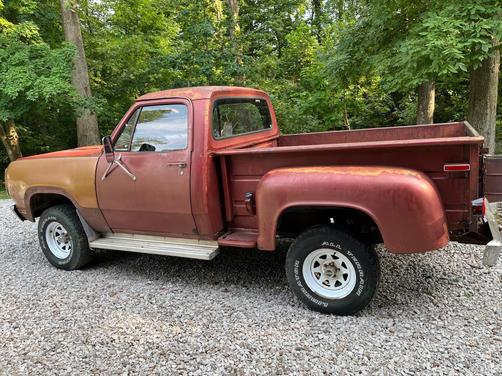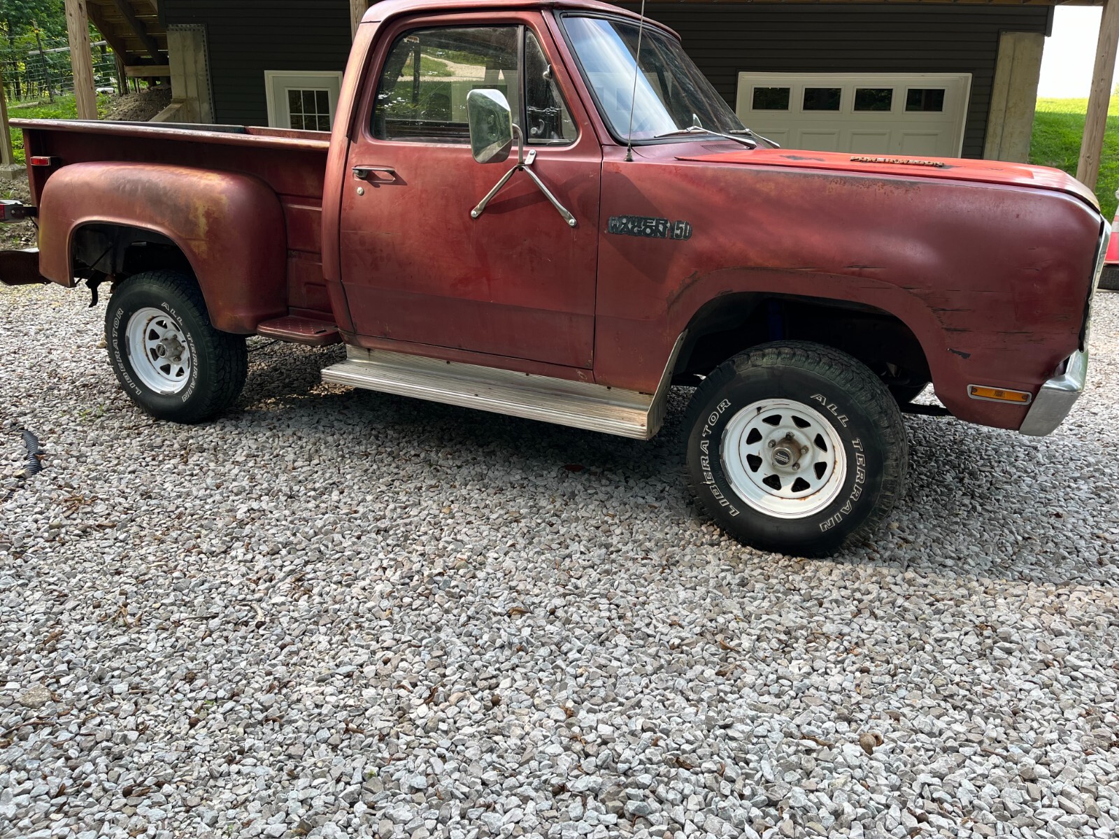 1978 Dodge W-13 Shortbed Stepside 4x4 Powerwagon 360 2bbl. Runs but has no brakes, removed the bed to put a metal floor on and clean fuel tank ( not worth cleaning so have another one to put in) so the bed is just sitting on frame. Has rust on floor pans, bed rails,steps on bed and tailgate. But over all this is a very solid truck for a 46 year old truck. Pictures give you a good idea of condition, but if you have any question feel free to contact me or make arrangement to come inspect it be fore bidding.