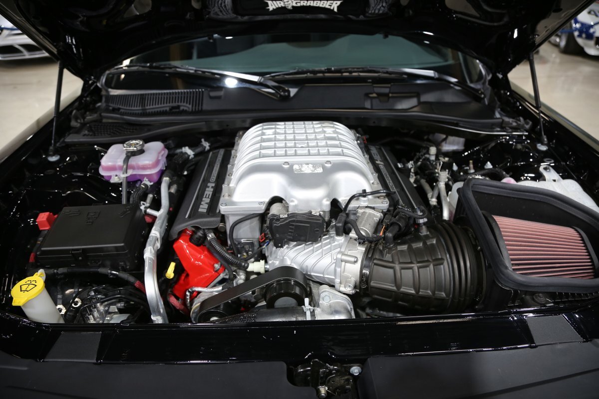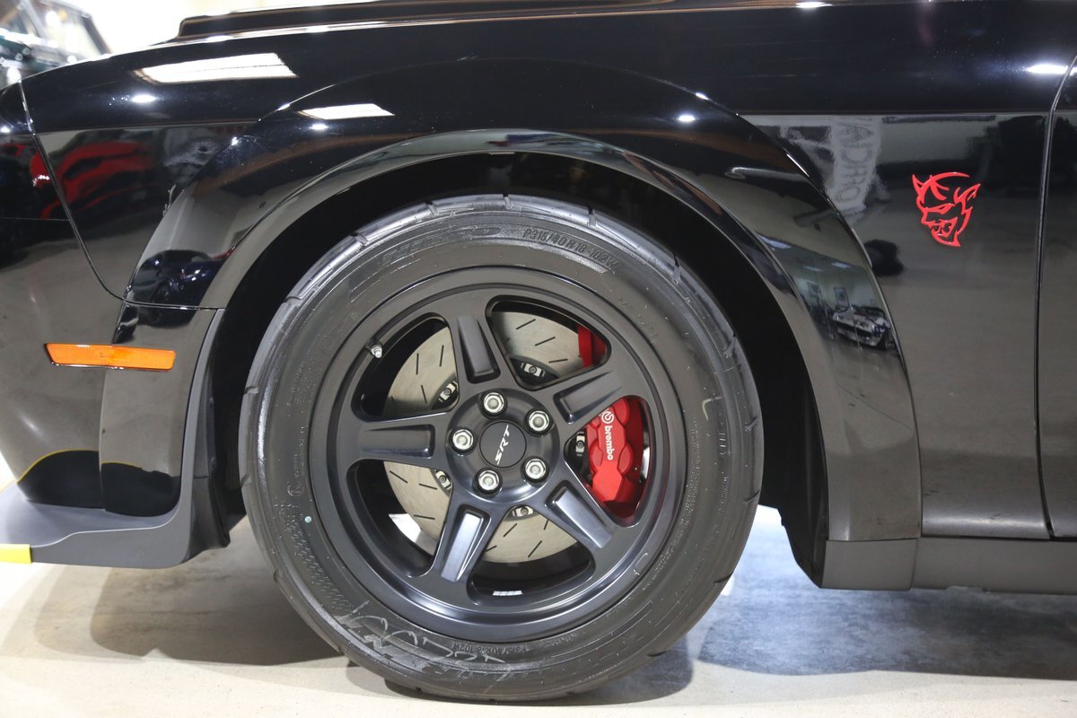 The Demon uses an all-new 6.2-liter V8 engine equipped with a 2.7-liter supercharger, which puts out 808HP with 91 octane gasoline and 840HP with 100 octane fuel or higher. Torque stands at 770 lb·ft on 100 octane fuel. The car weighs 215 lbs less than the Hellcat at 4,254 lbs. The car will be using a set of road tires by Nitto Tire, called the NT05R. This makes the Challenger SRT Demon the first production car to contain a set of drag radial road tires.