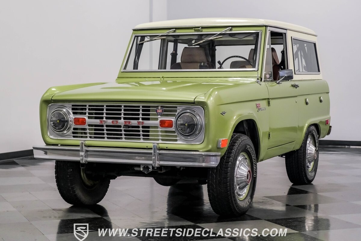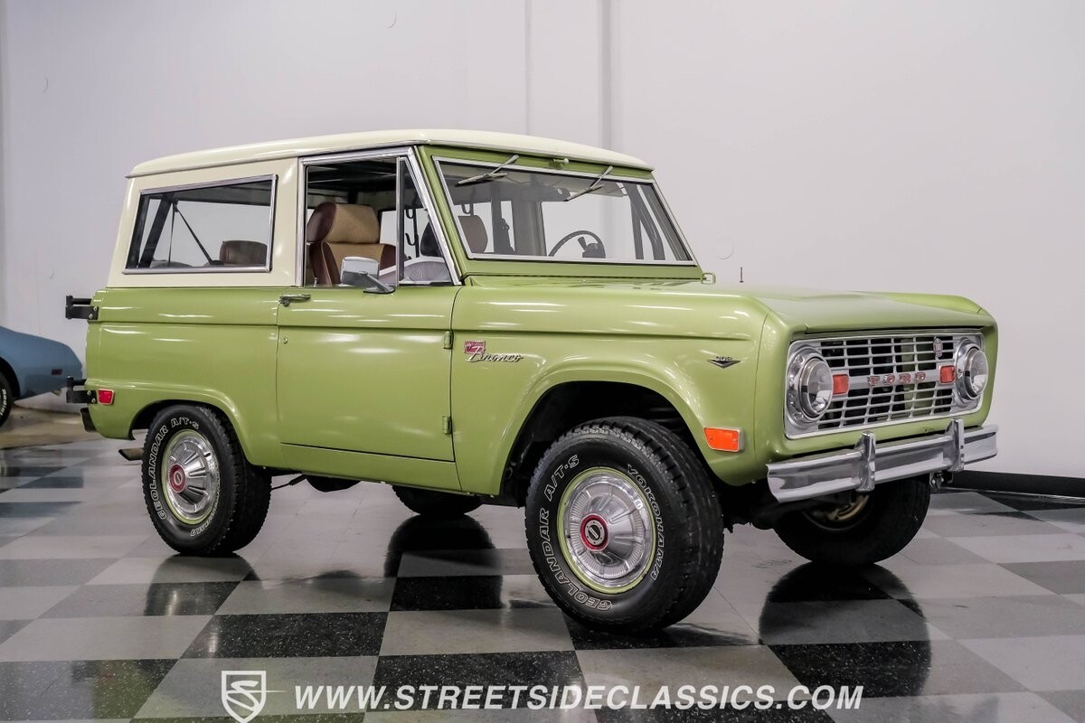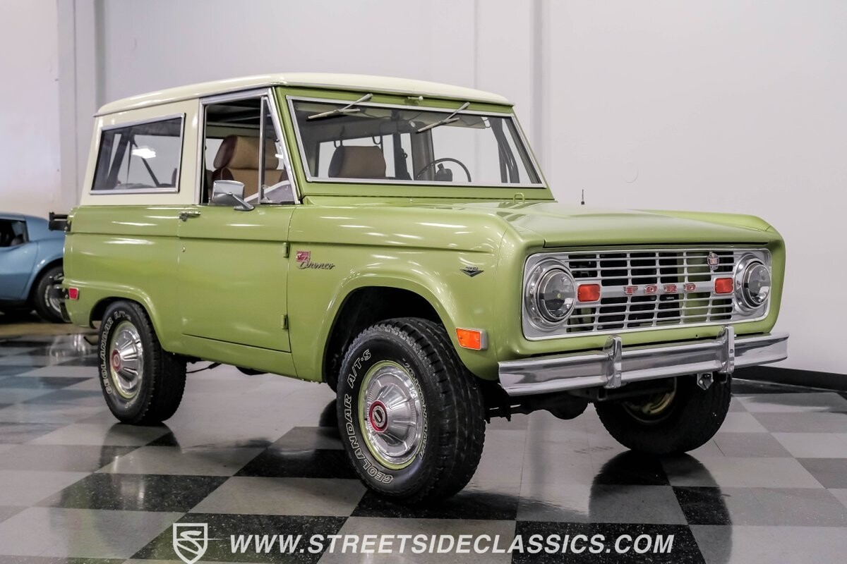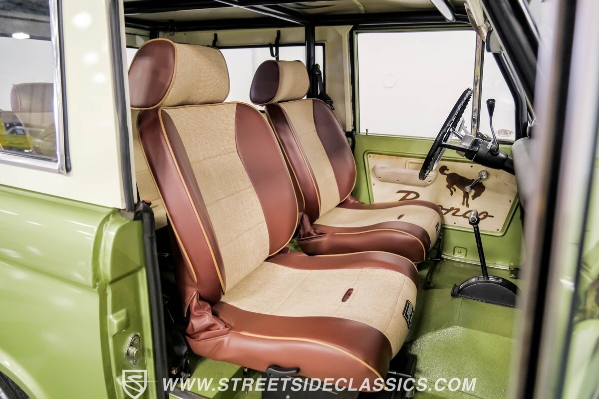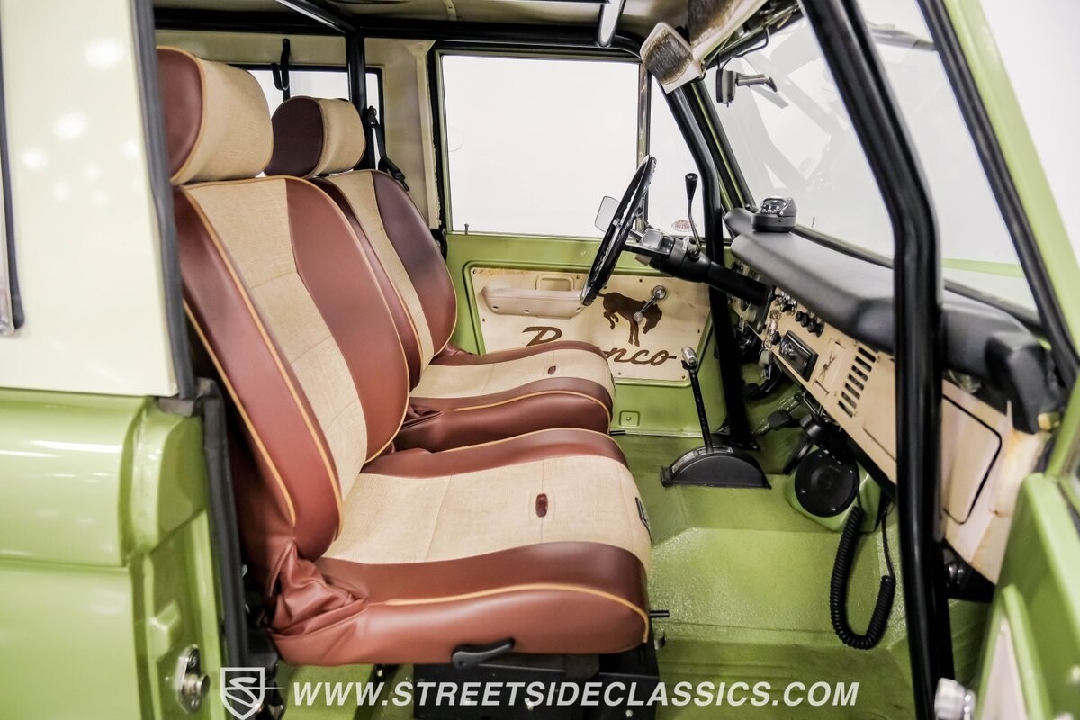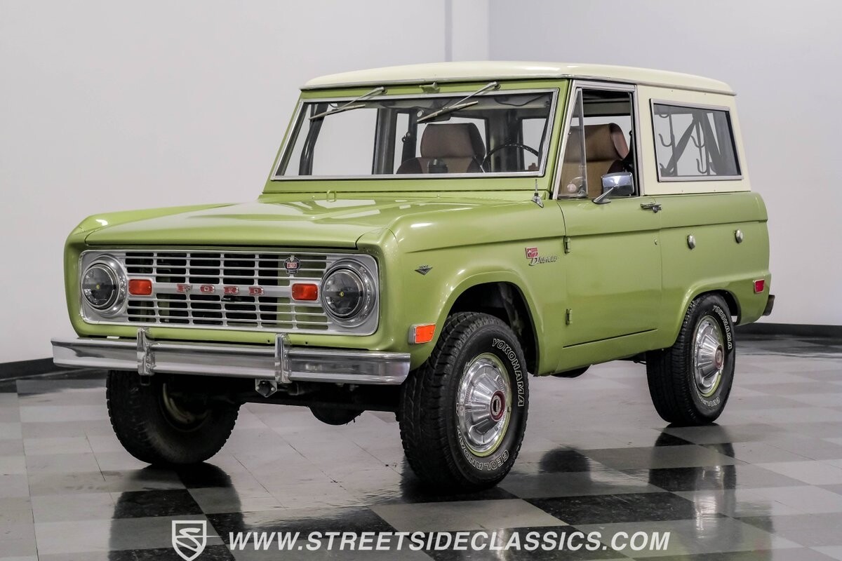 More popular than ever, the Ford Bronco is an American 4x4 icon. This handsome 1968 Bronco Sport has had its body stripped and refinished in a very appealing shade of Lime Gold Metallic, with a removable hardtop painted in white. Exterior details include uncut fenders, stock hubcaps, KC "HiLiTES" LED headlights, LED taillights, dual side mirrors, a receiver hitch and a 50th anniversary grille emblem. The spare is covered with a Bronco logoed cover and affixed to a swing-away rear tire carrier, allowing more interior space. The 15" steel wheels are painted to match the body and wear stock polished covers and 235/75 Yokohama Geolandar A/T-S tires adding to the original classic look of this early Bronco retains.