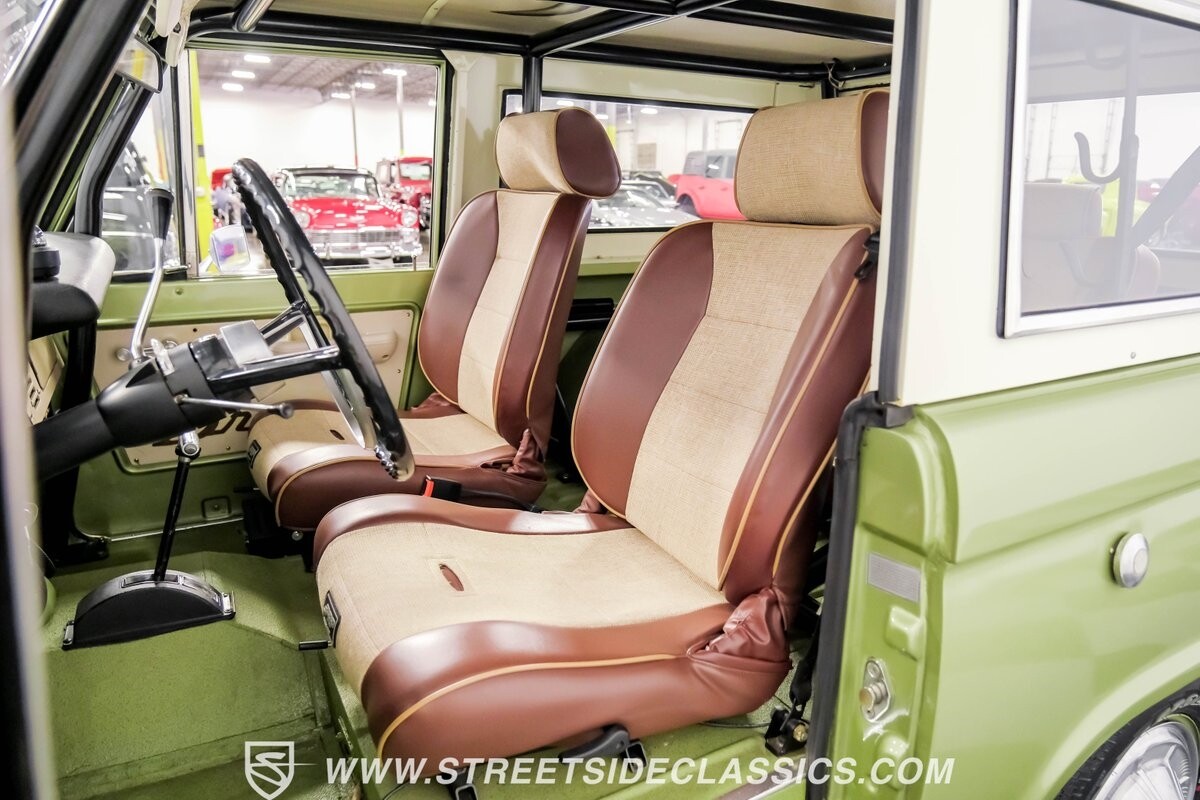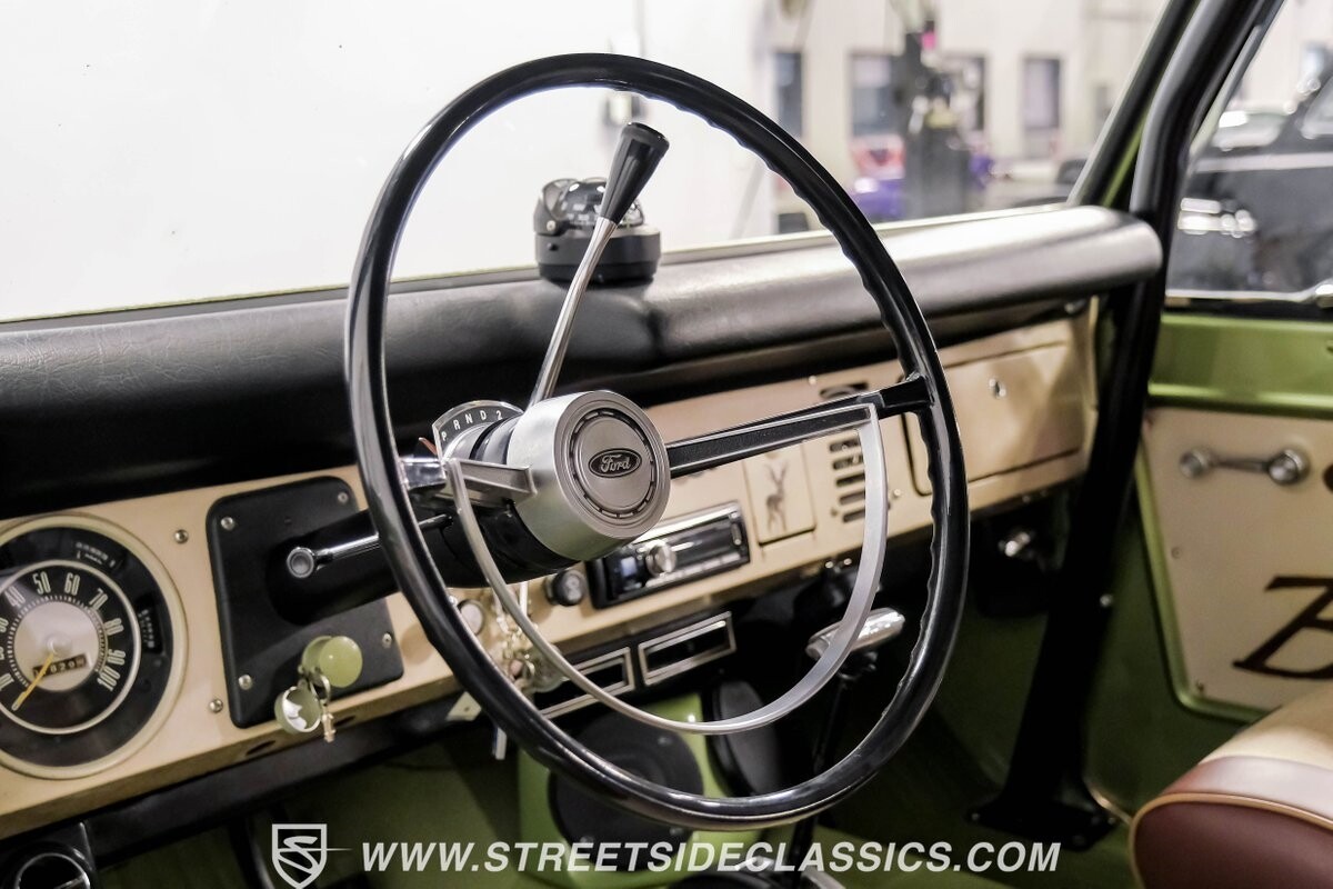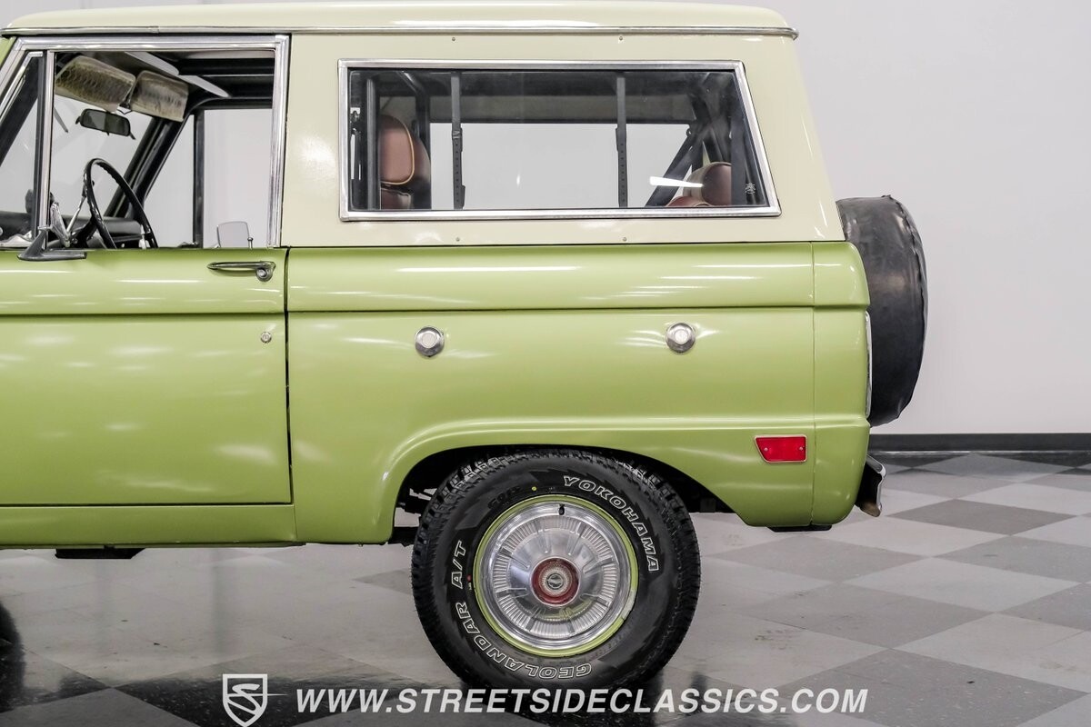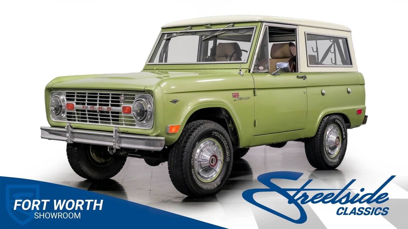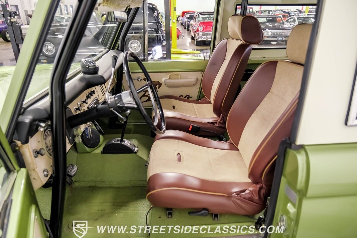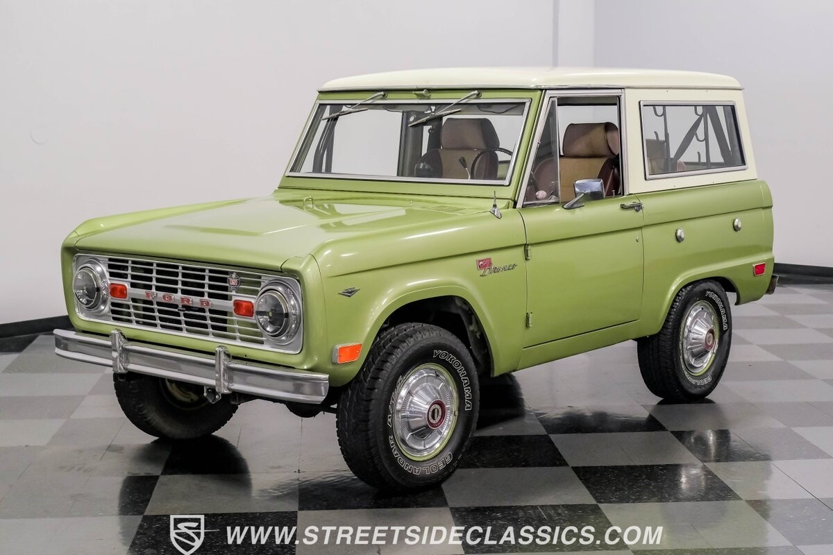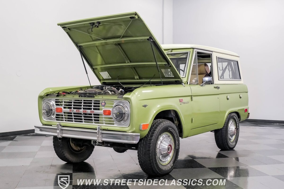 More popular than ever, the Ford Bronco is an American 4x4 icon. This handsome 1968 Bronco Sport has had its body stripped and refinished in a very appealing shade of Lime Gold Metallic, with a removable hardtop painted in white. Exterior details include uncut fenders, stock hubcaps, KC "HiLiTES" LED headlights, LED taillights, dual side mirrors, a receiver hitch and a 50th anniversary grille emblem. The spare is covered with a Bronco logoed cover and affixed to a swing-away rear tire carrier, allowing more interior space. The 15" steel wheels are painted to match the body and wear stock polished covers and 235/75 Yokohama Geolandar A/T-S tires adding to the original classic look of this early Bronco retains.