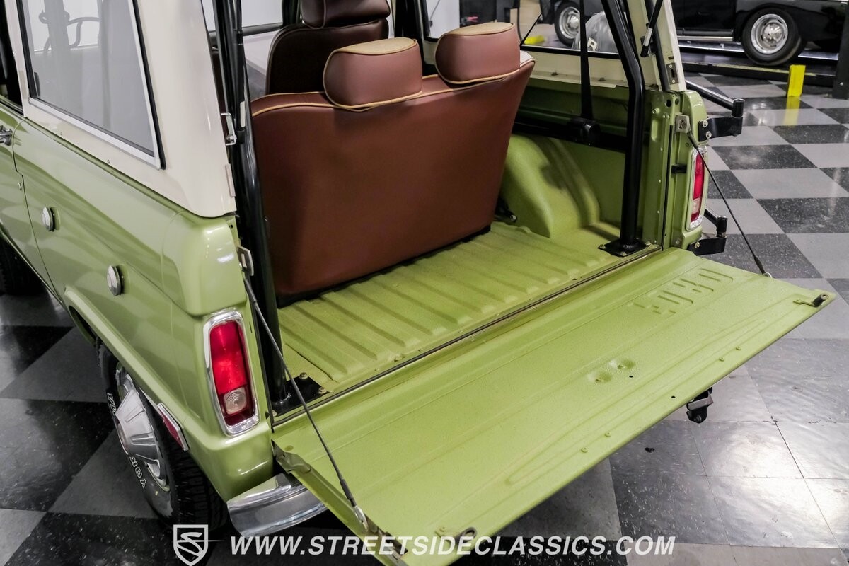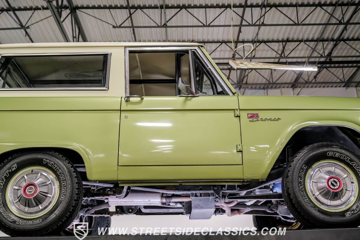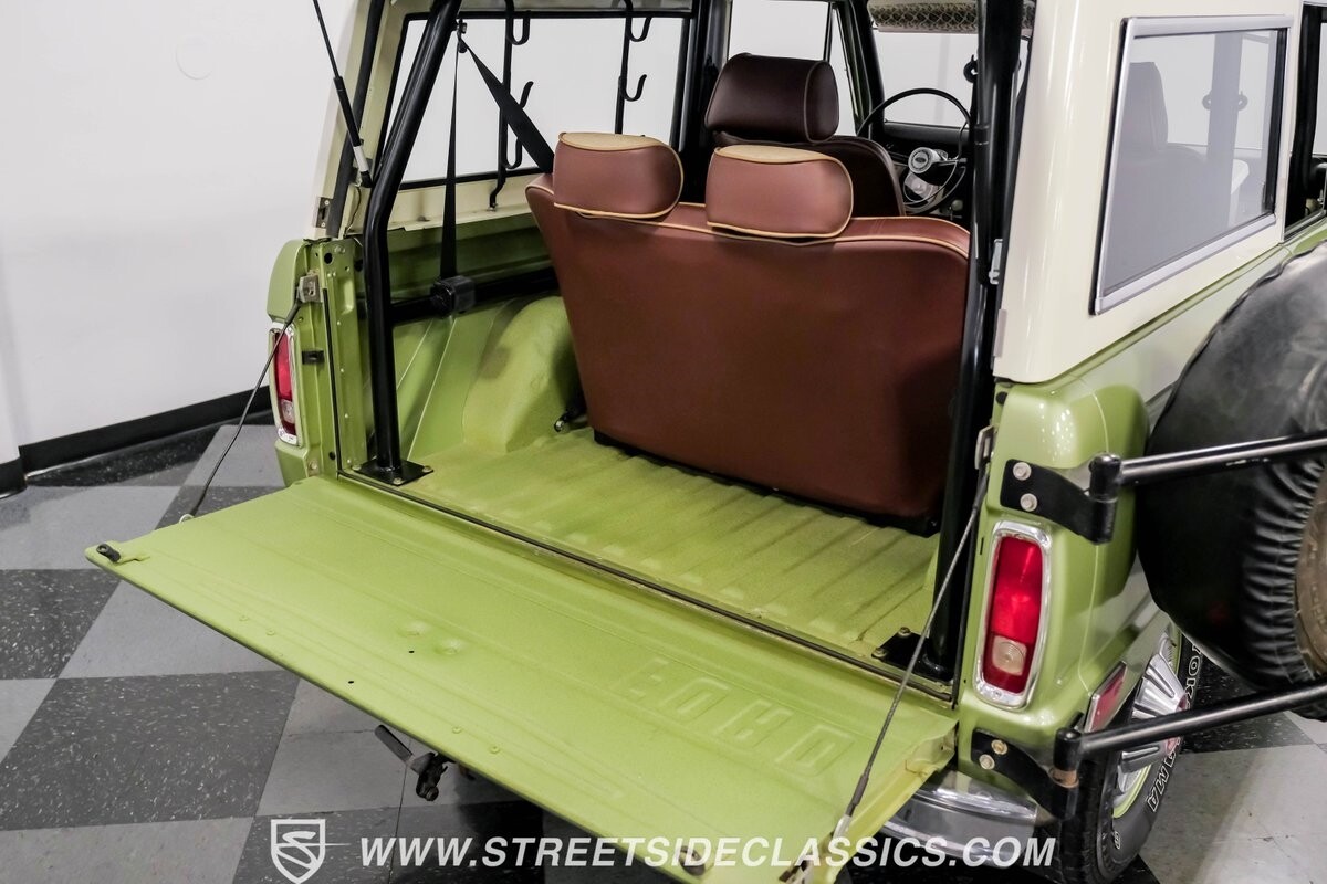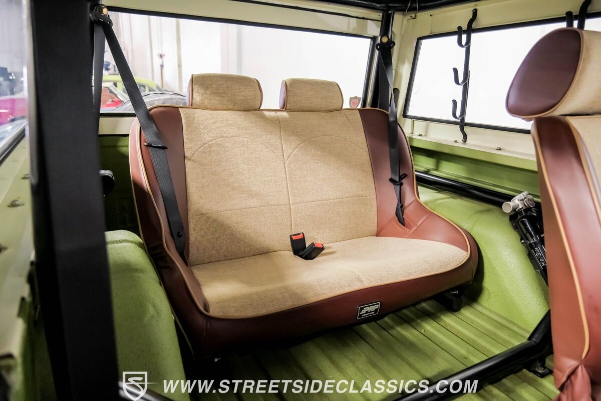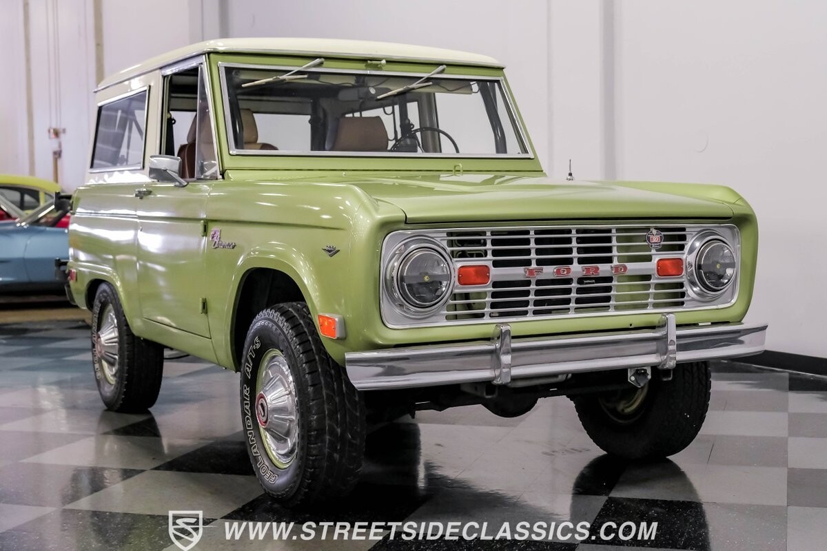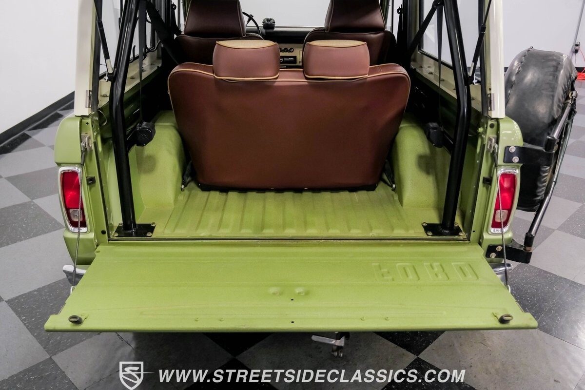 More popular than ever, the Ford Bronco is an American 4x4 icon. This handsome 1968 Bronco Sport has had its body stripped and refinished in a very appealing shade of Lime Gold Metallic, with a removable hardtop painted in white. Exterior details include uncut fenders, stock hubcaps, KC "HiLiTES" LED headlights, LED taillights, dual side mirrors, a receiver hitch and a 50th anniversary grille emblem. The spare is covered with a Bronco logoed cover and affixed to a swing-away rear tire carrier, allowing more interior space. The 15" steel wheels are painted to match the body and wear stock polished covers and 235/75 Yokohama Geolandar A/T-S tires adding to the original classic look of this early Bronco retains.