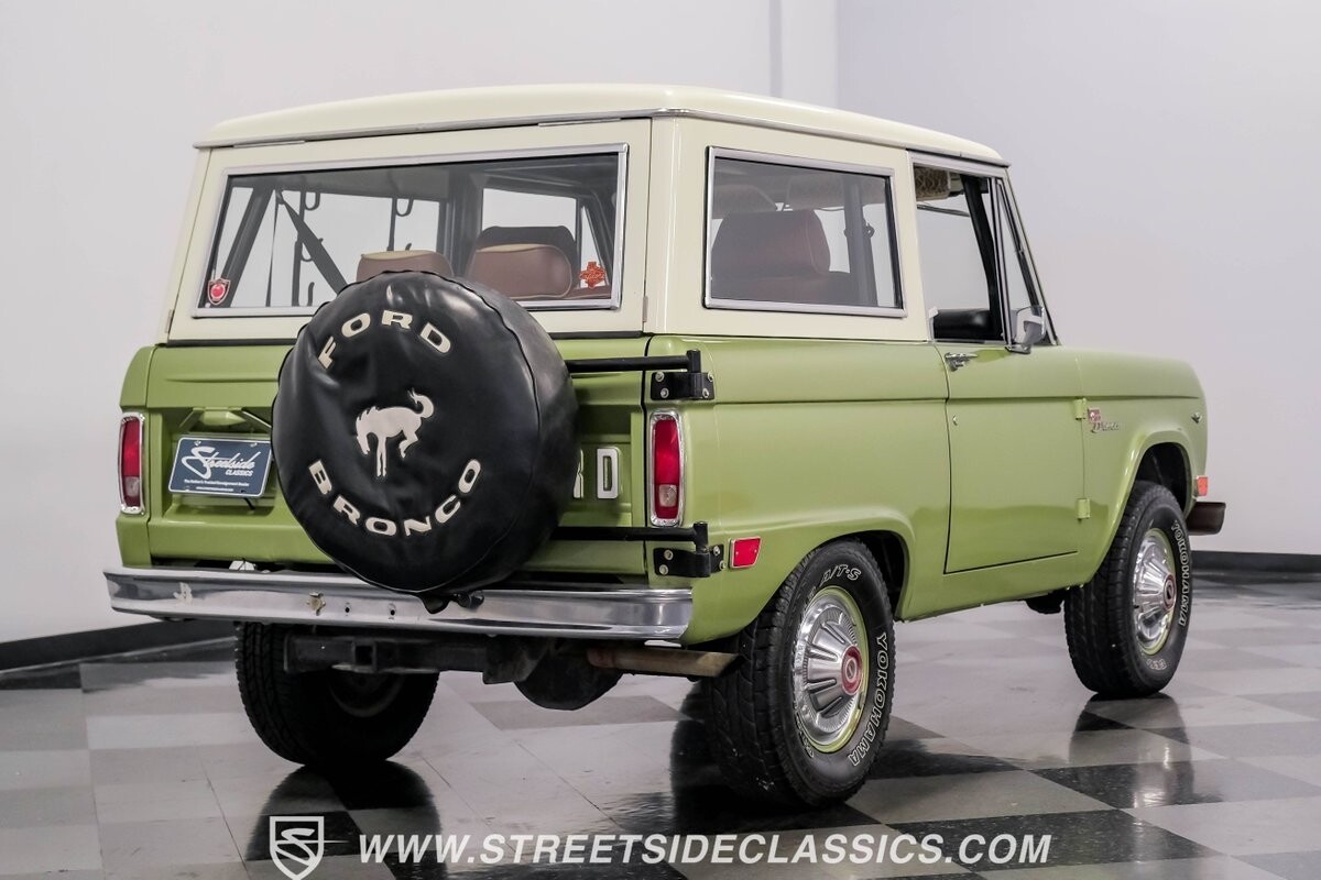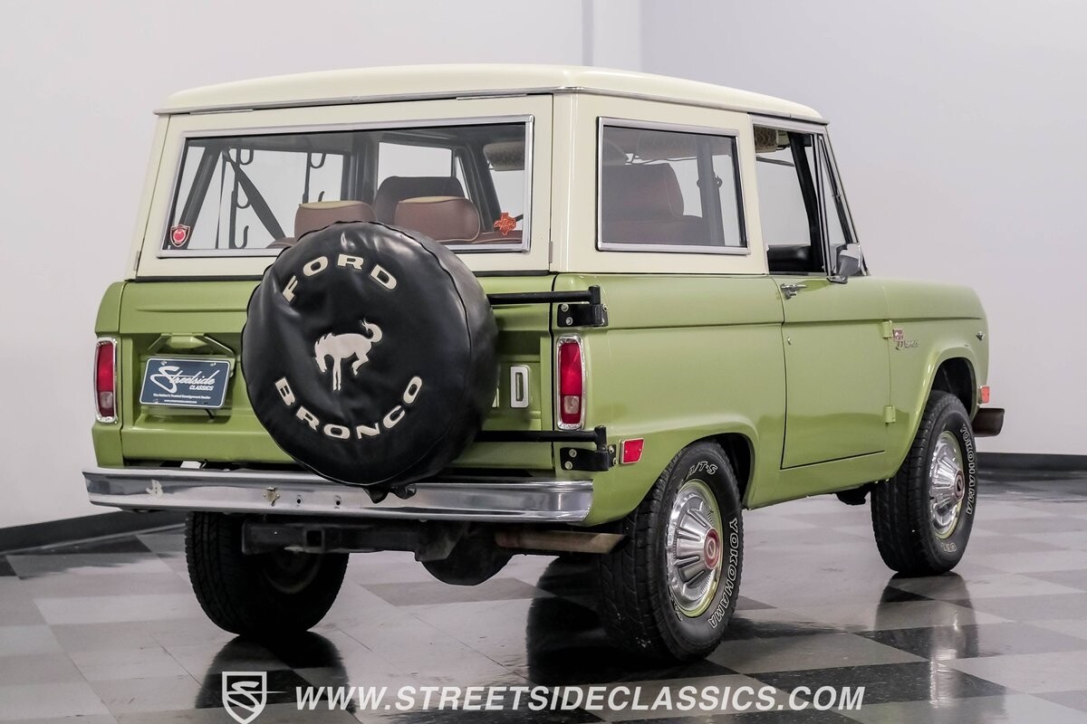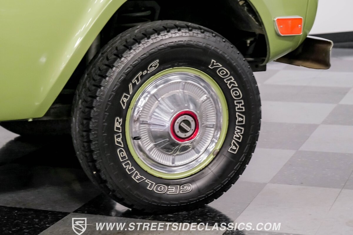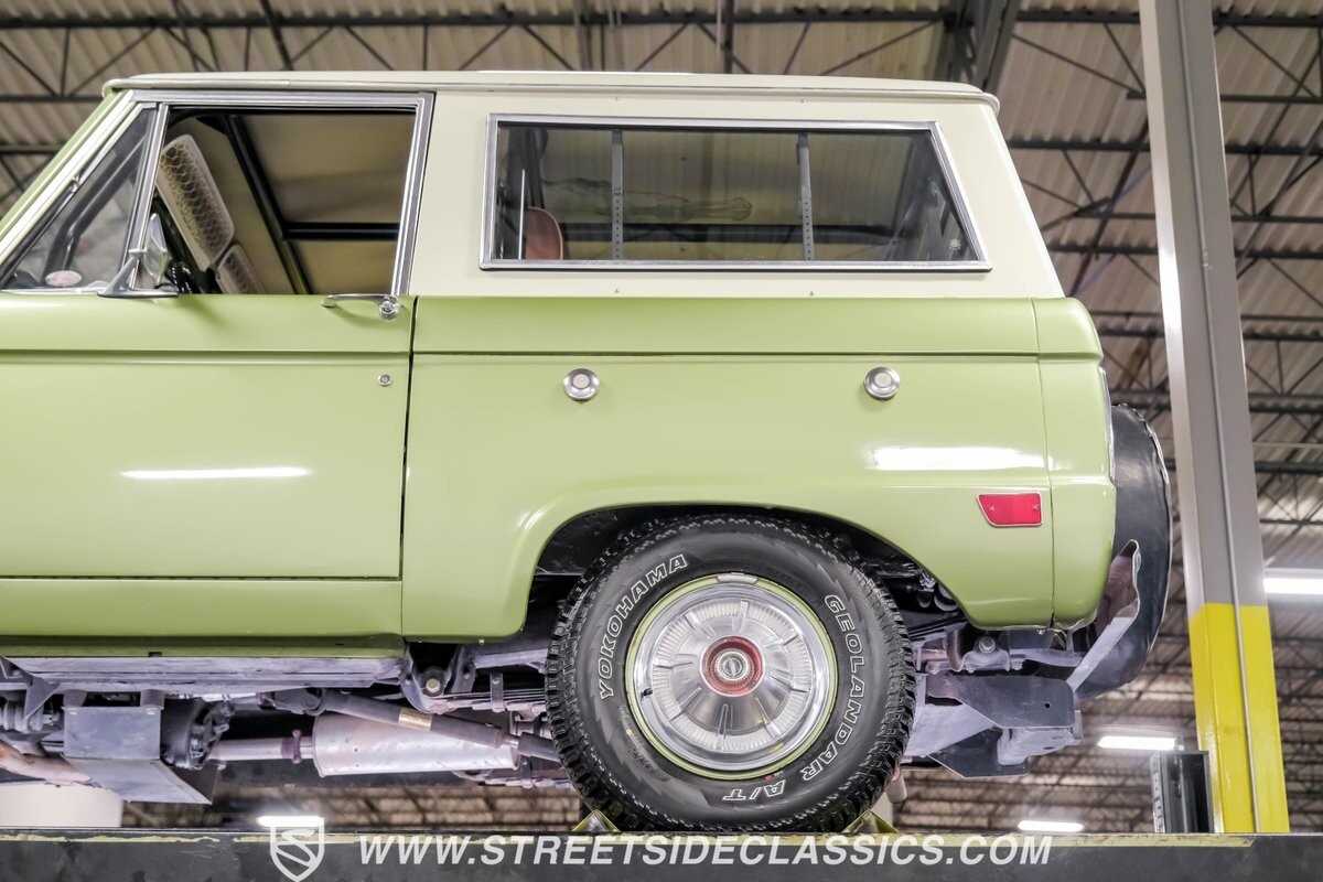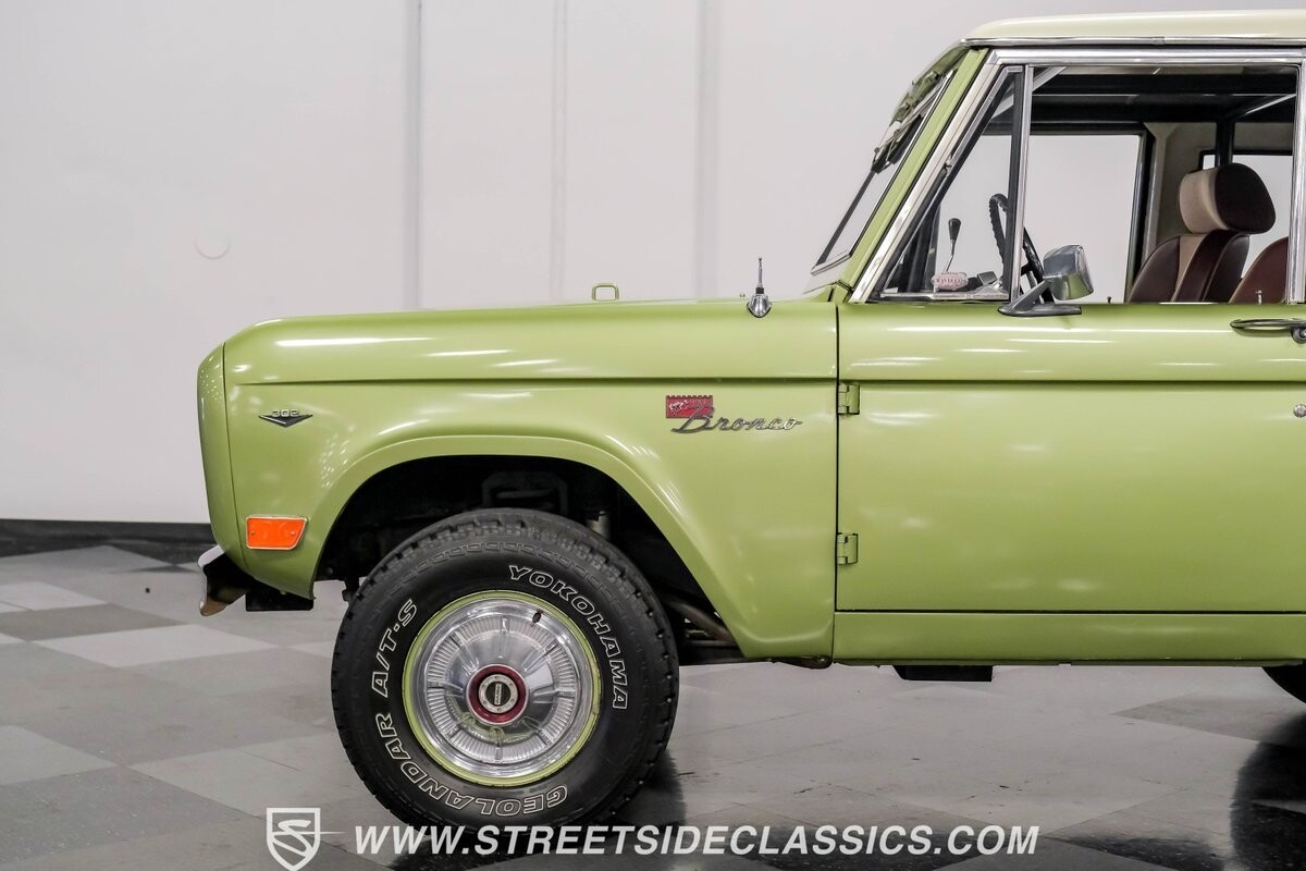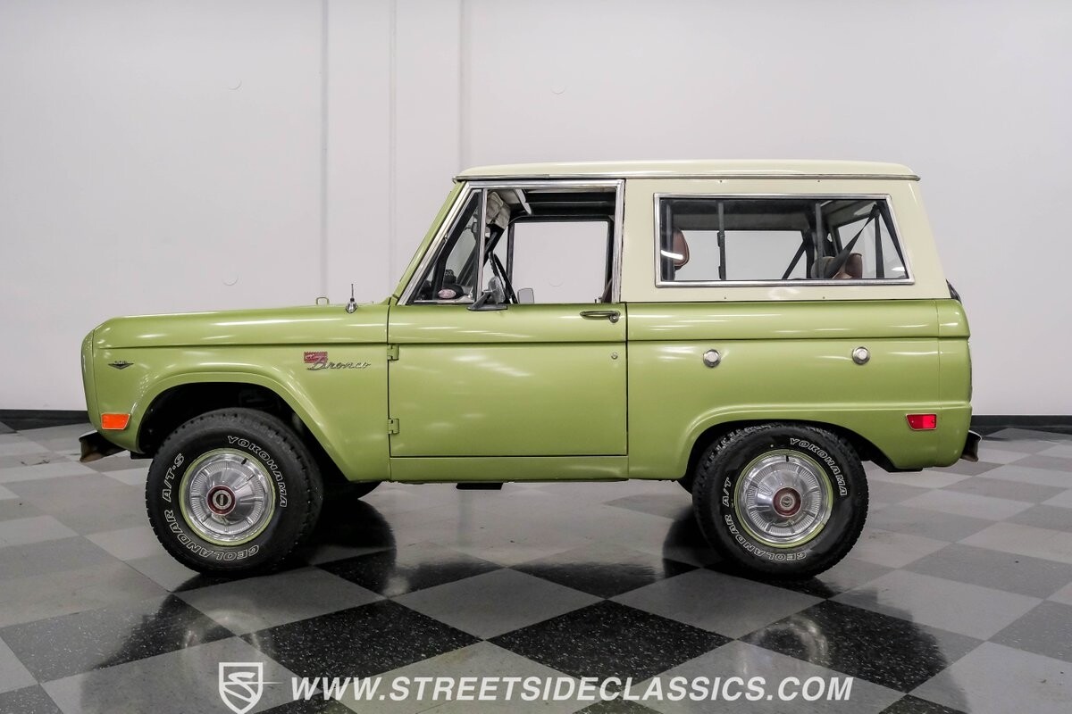 More popular than ever, the Ford Bronco is an American 4x4 icon. This handsome 1968 Bronco Sport has had its body stripped and refinished in a very appealing shade of Lime Gold Metallic, with a removable hardtop painted in white. Exterior details include uncut fenders, stock hubcaps, KC "HiLiTES" LED headlights, LED taillights, dual side mirrors, a receiver hitch and a 50th anniversary grille emblem. The spare is covered with a Bronco logoed cover and affixed to a swing-away rear tire carrier, allowing more interior space. The 15" steel wheels are painted to match the body and wear stock polished covers and 235/75 Yokohama Geolandar A/T-S tires adding to the original classic look of this early Bronco retains.