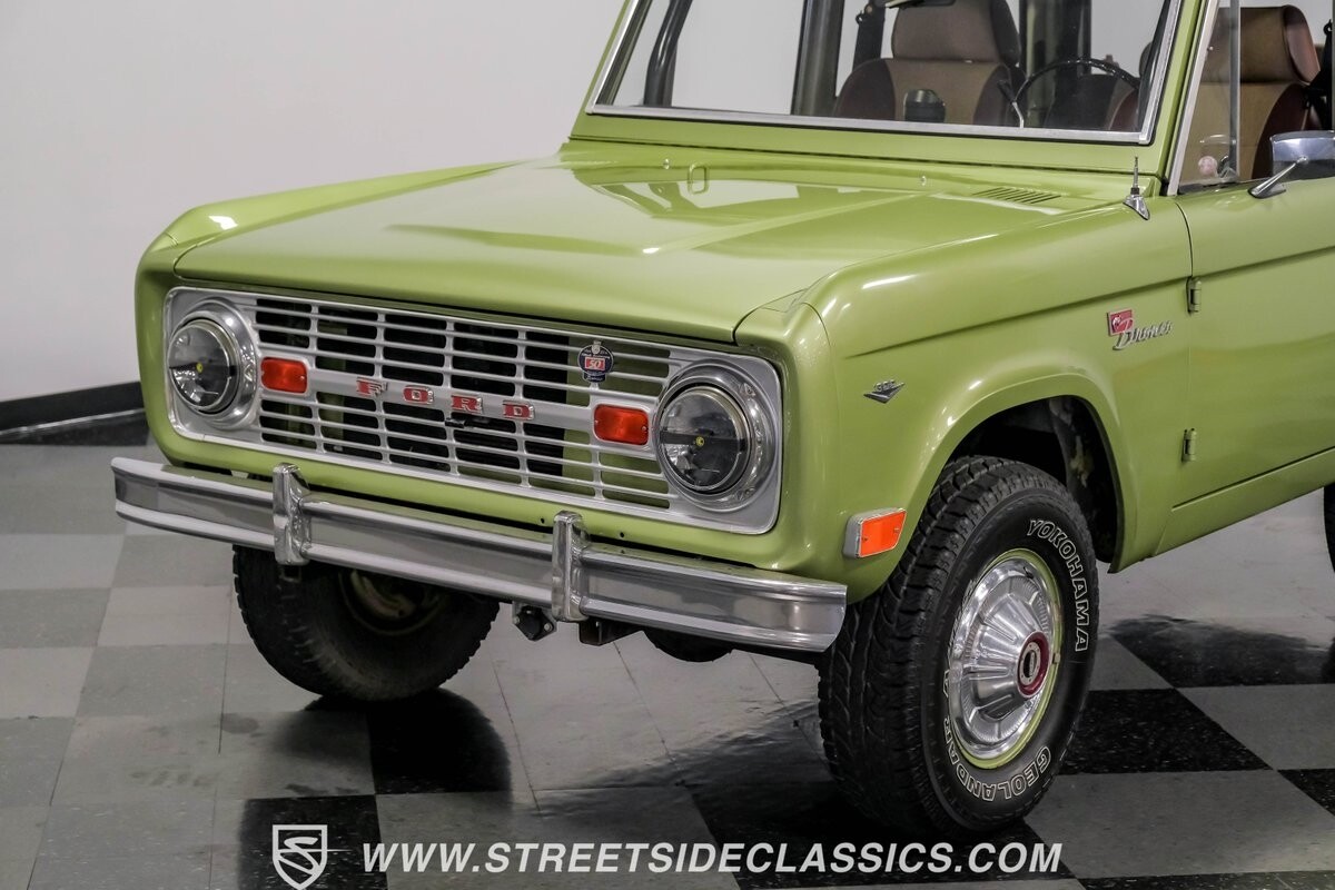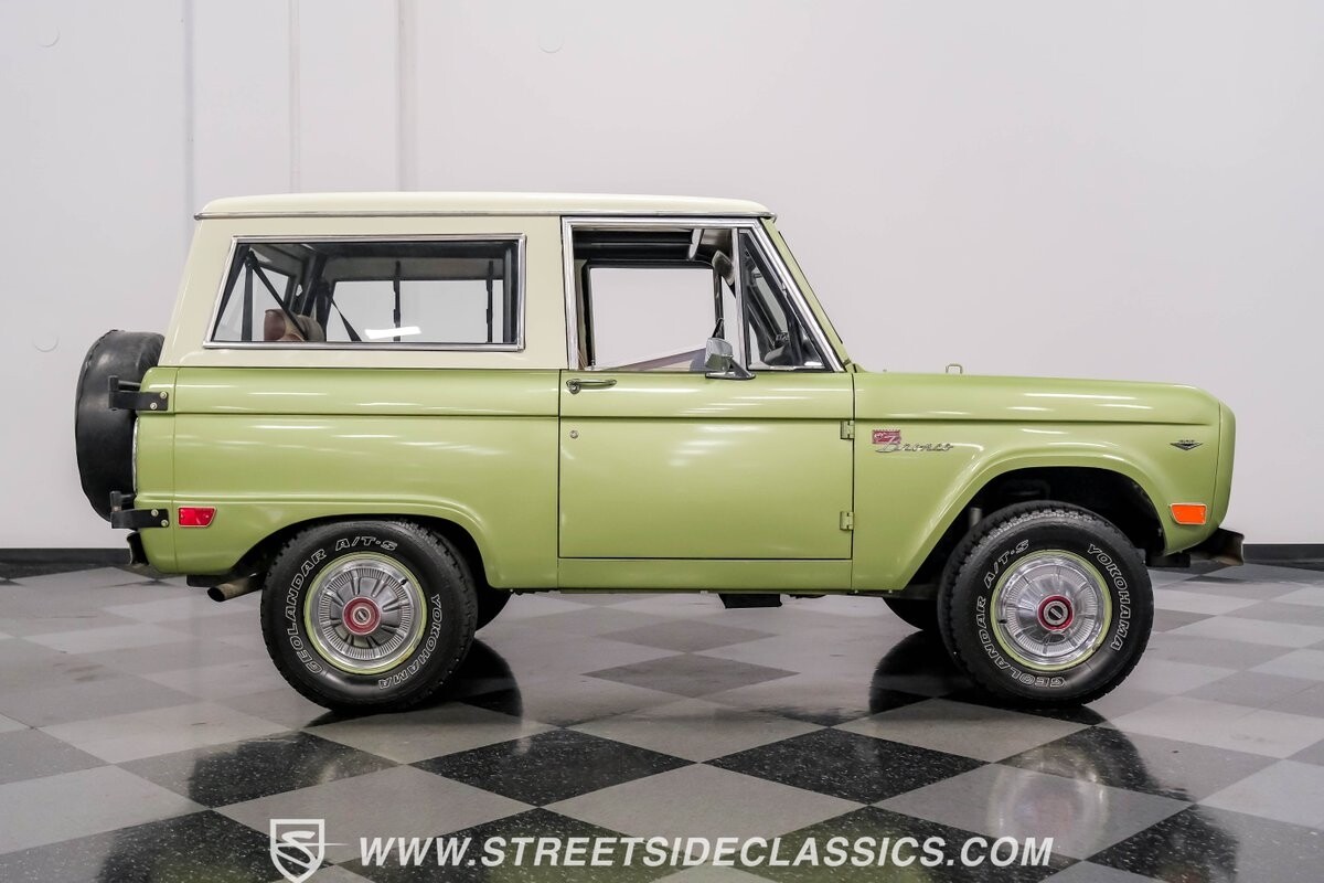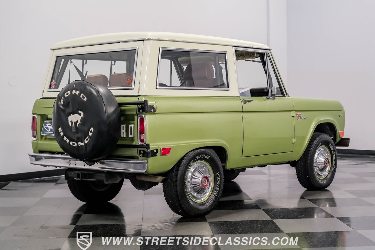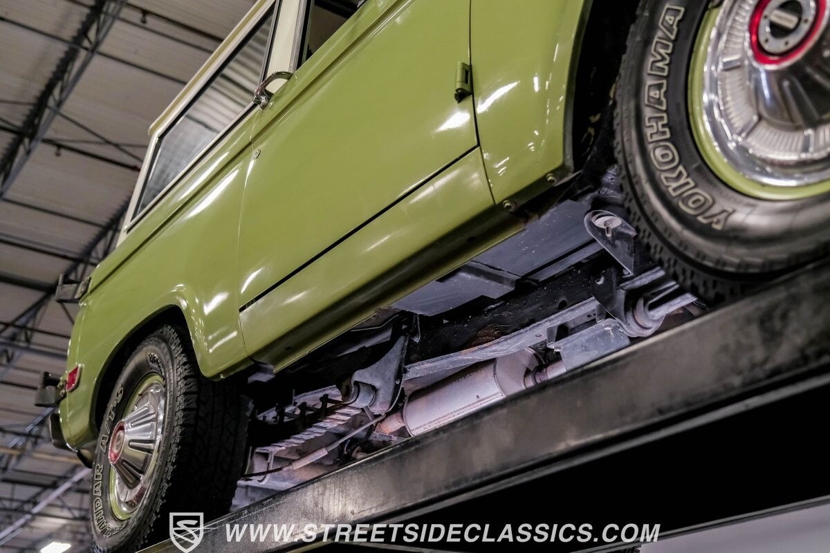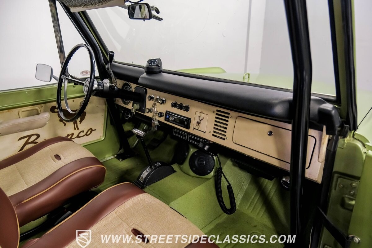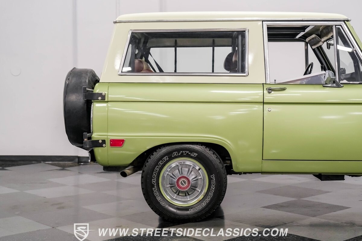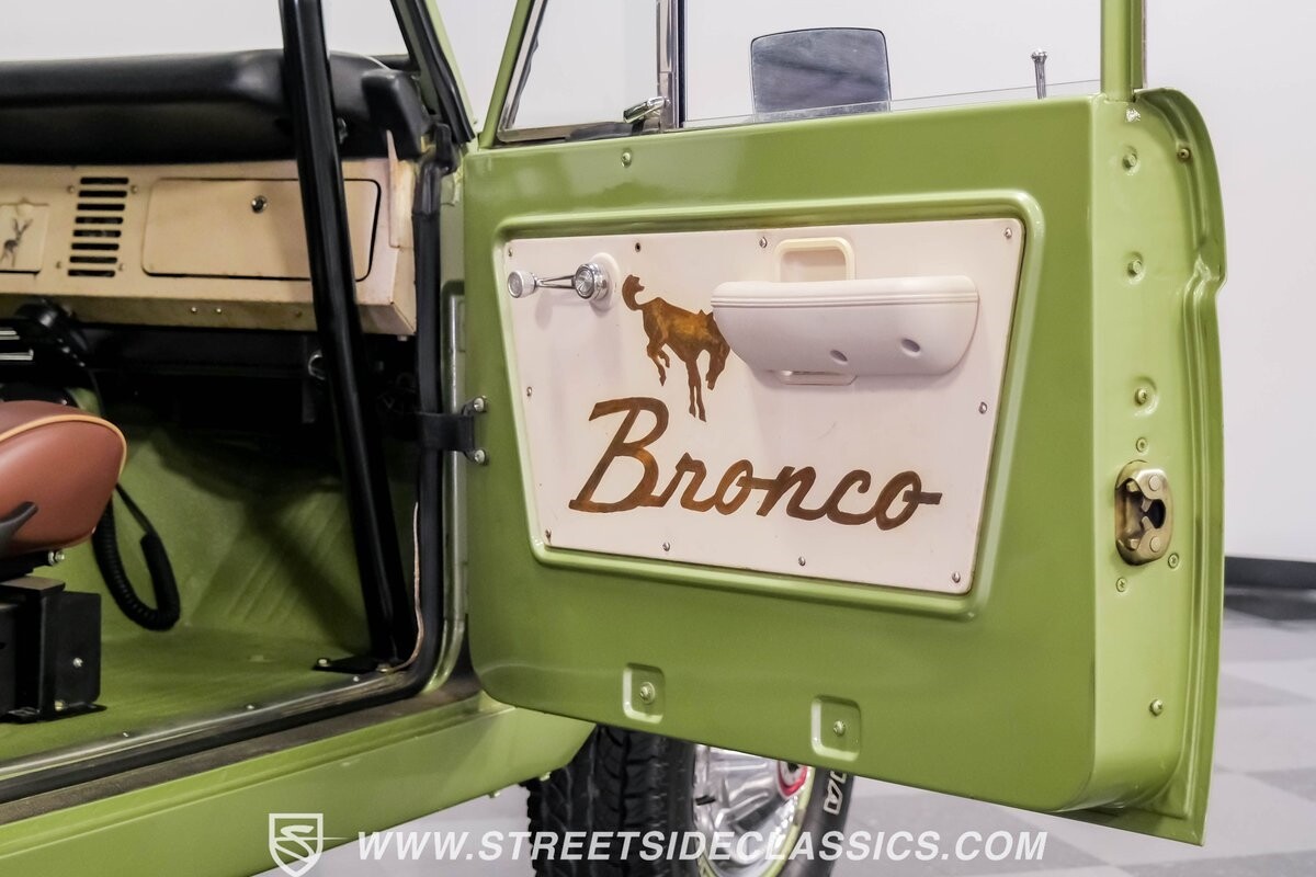 More popular than ever, the Ford Bronco is an American 4x4 icon. This handsome 1968 Bronco Sport has had its body stripped and refinished in a very appealing shade of Lime Gold Metallic, with a removable hardtop painted in white. Exterior details include uncut fenders, stock hubcaps, KC "HiLiTES" LED headlights, LED taillights, dual side mirrors, a receiver hitch and a 50th anniversary grille emblem. The spare is covered with a Bronco logoed cover and affixed to a swing-away rear tire carrier, allowing more interior space. The 15" steel wheels are painted to match the body and wear stock polished covers and 235/75 Yokohama Geolandar A/T-S tires adding to the original classic look of this early Bronco retains.